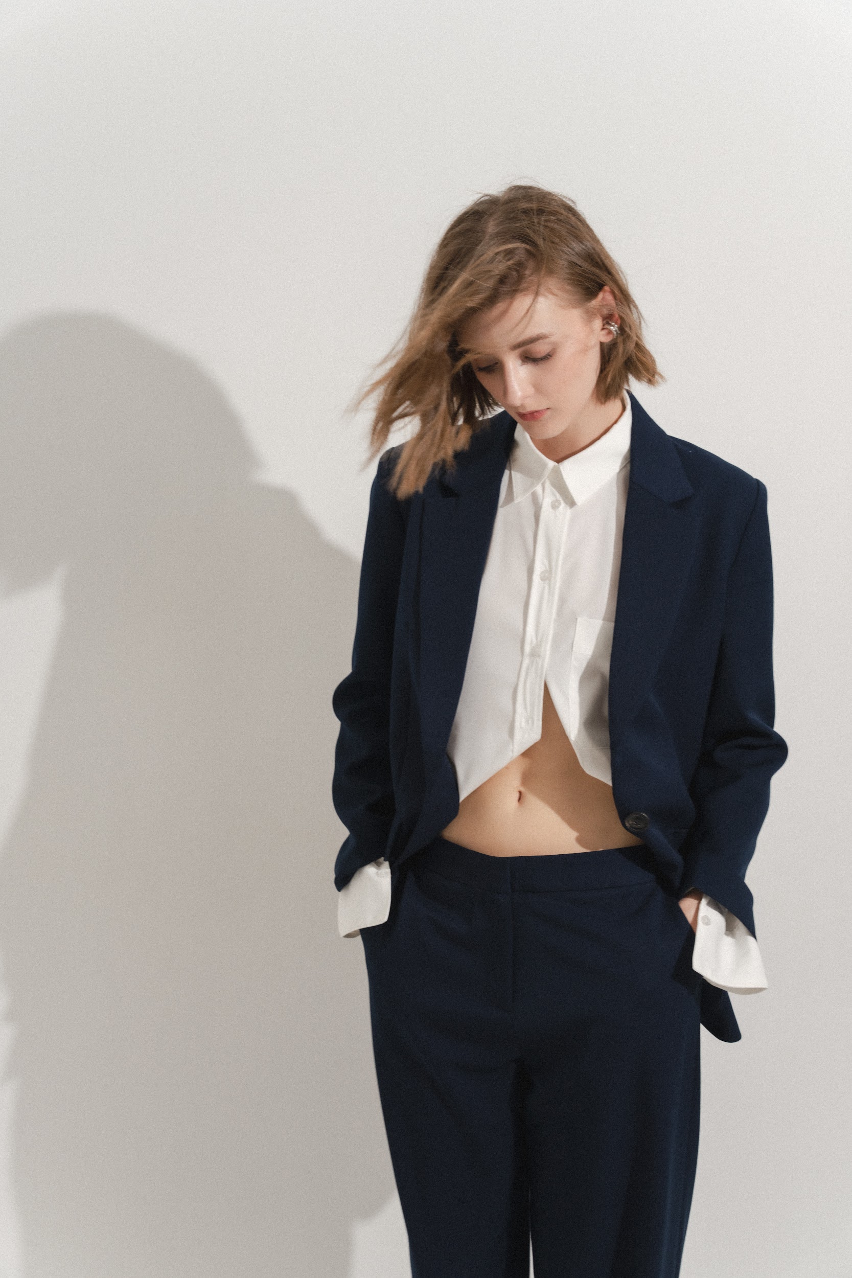 Брюки прямого кроя со стрелками. Боковые карманы. Застежка на молнию, внутреннюю пуговицу