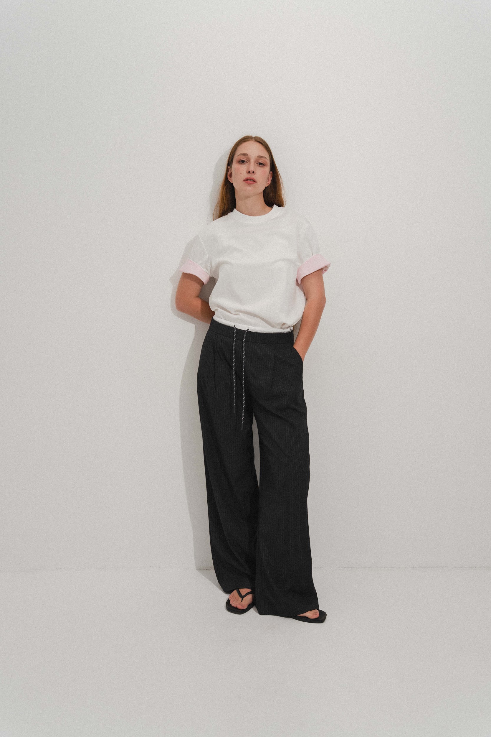 Брюки свободного кроя из костюмной ткани. Передние карманы. Декоративный пояс на завязках. Застежка на молнию.