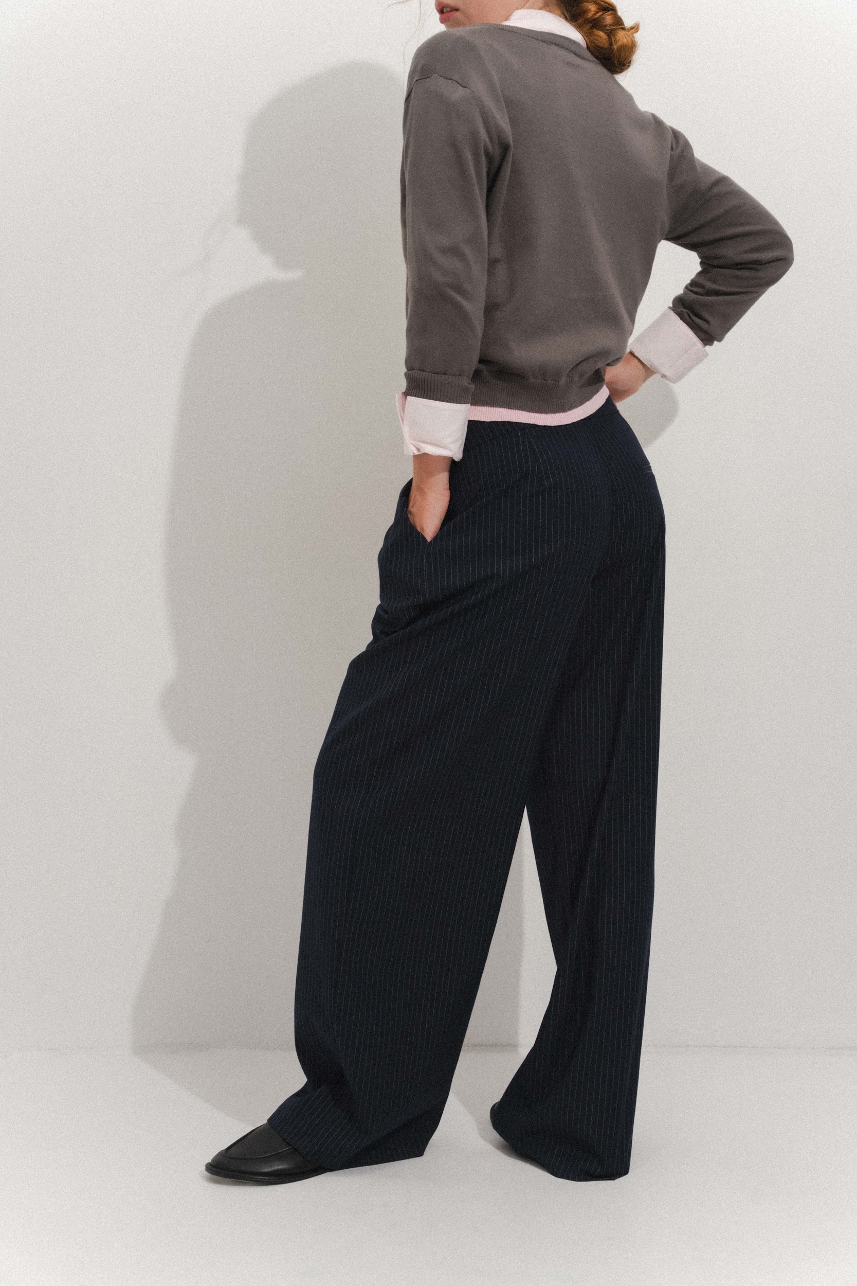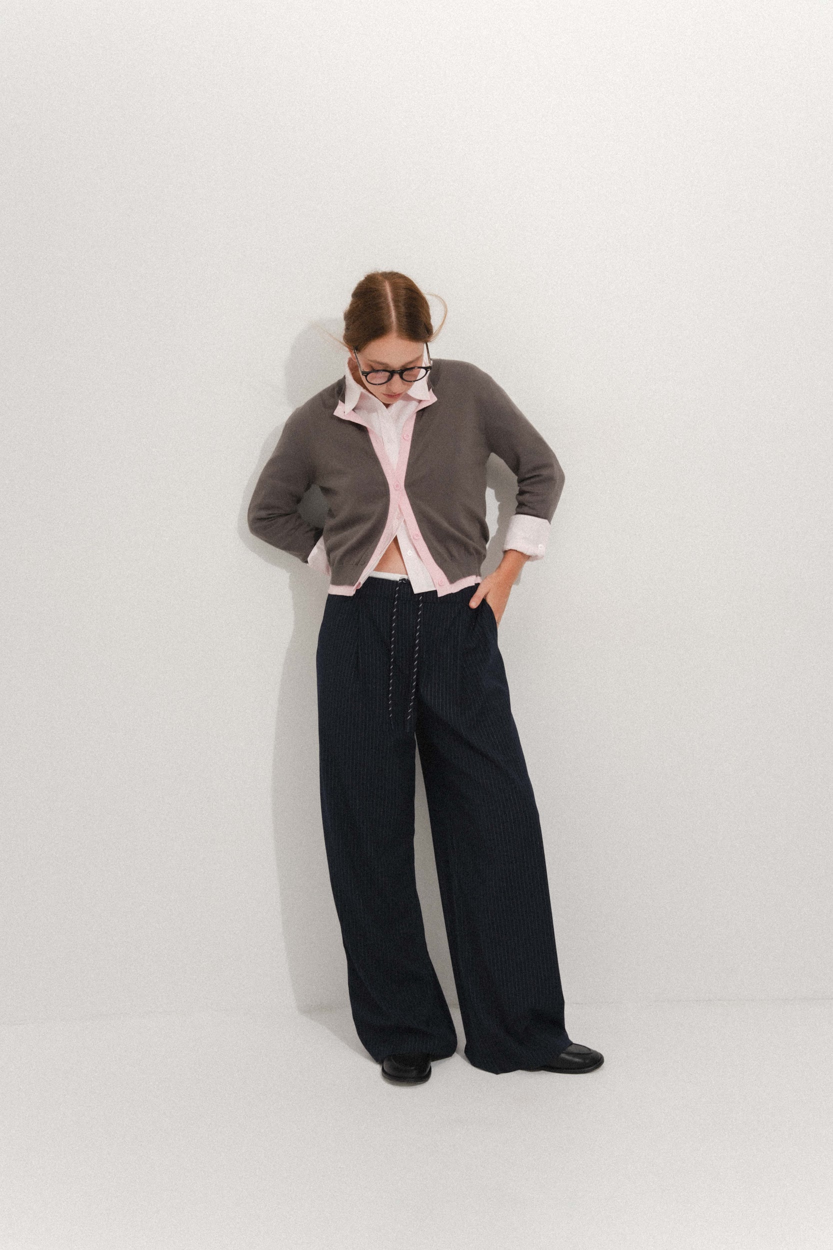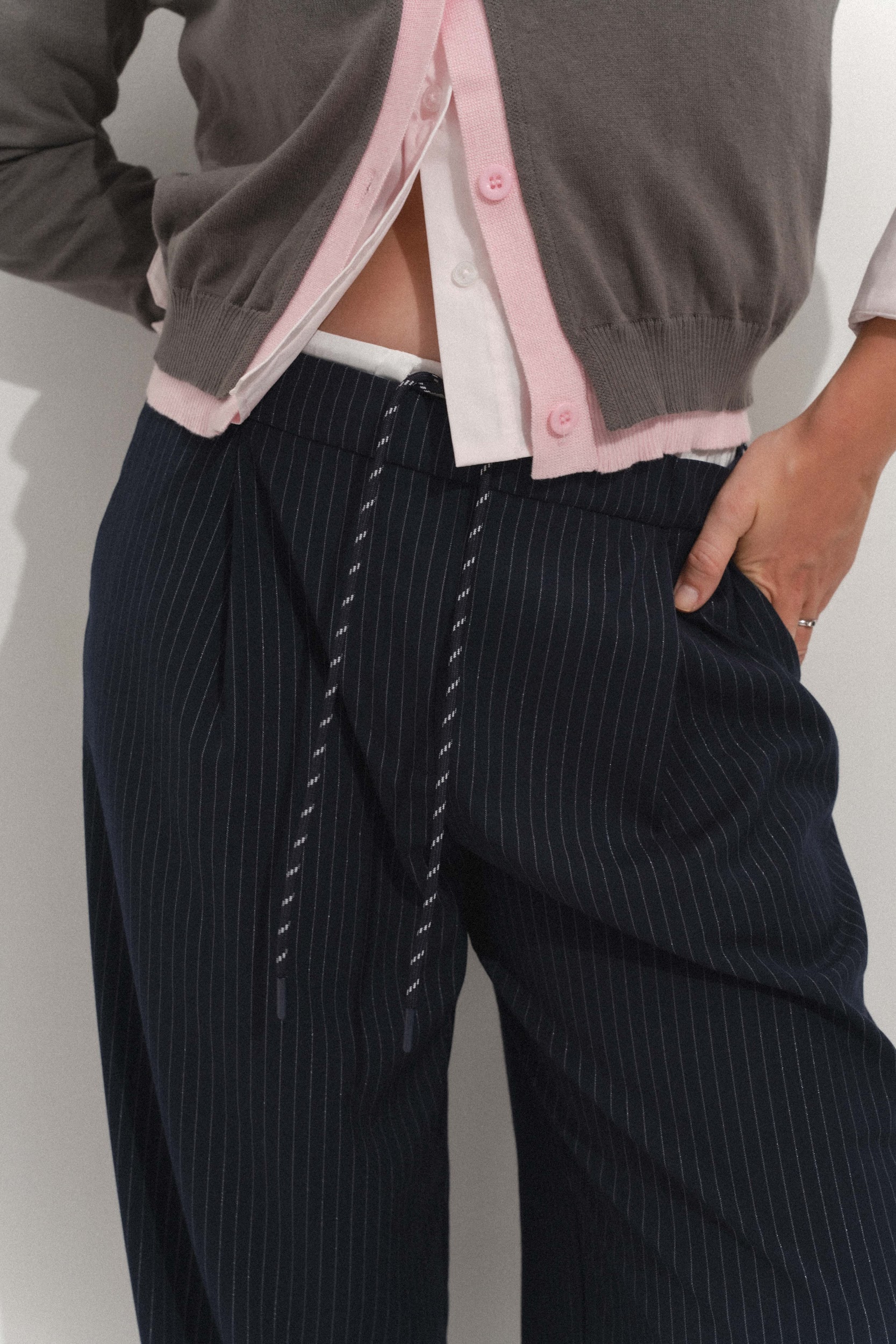Брюки свободного кроя из костюмной ткани. Передние карманы. Декоративный пояс на завязках. Застежка на молнию.