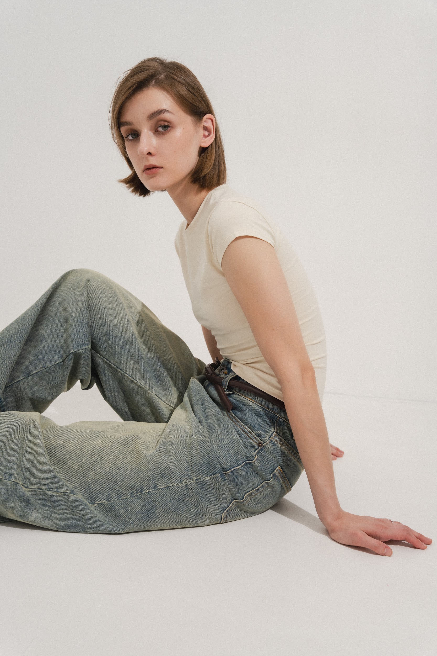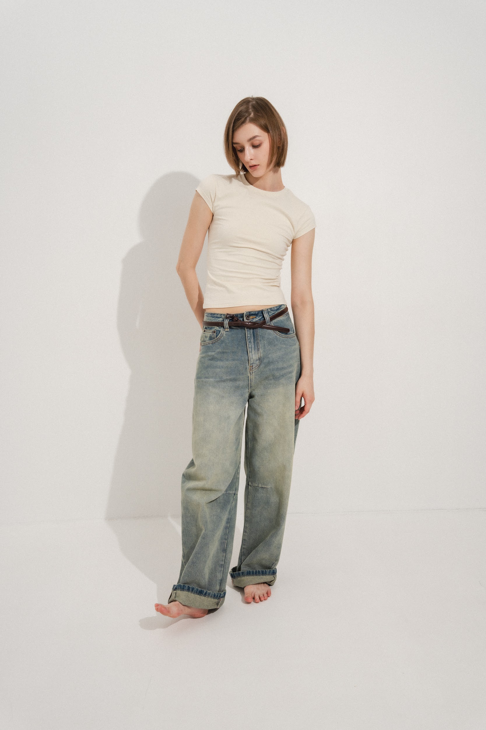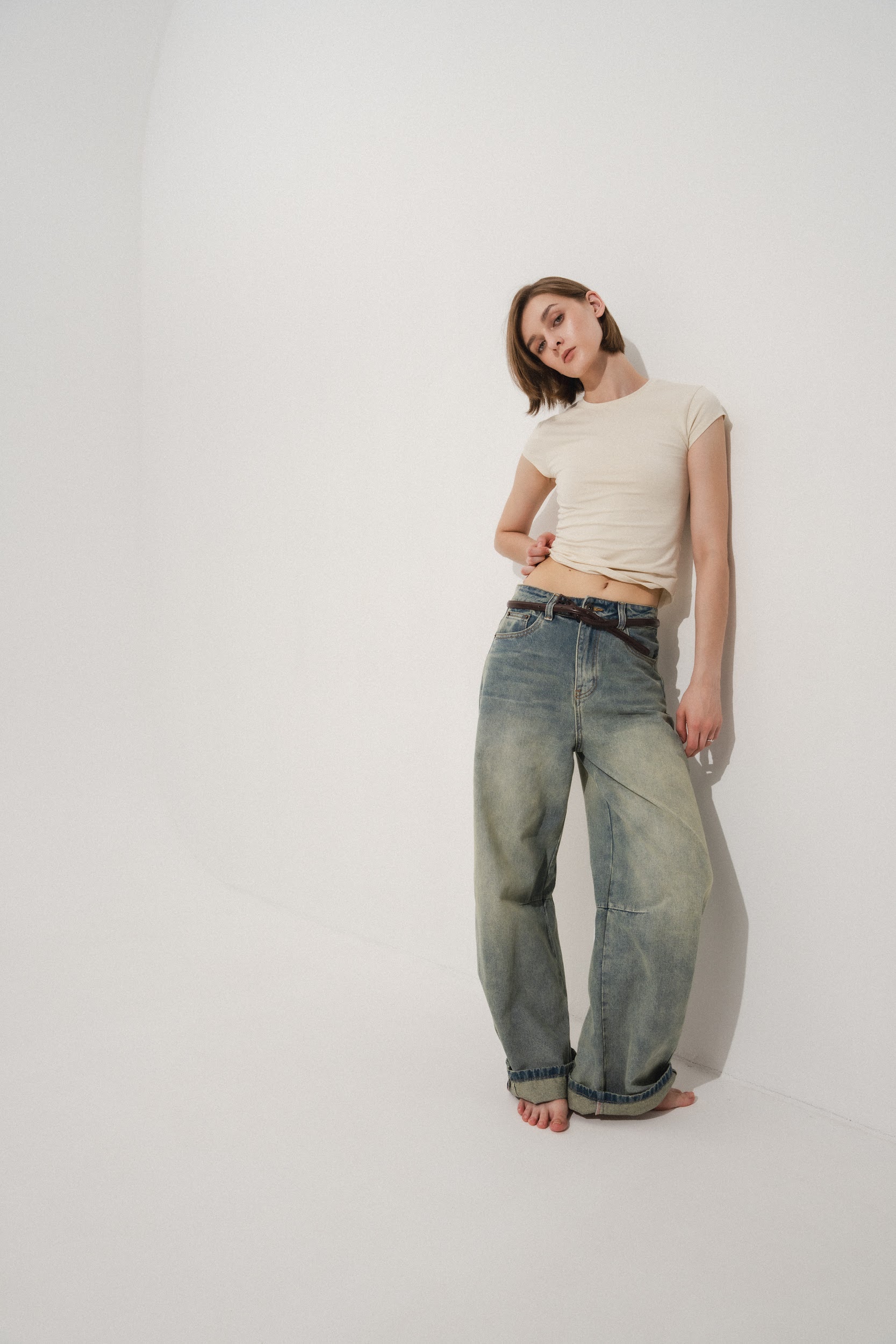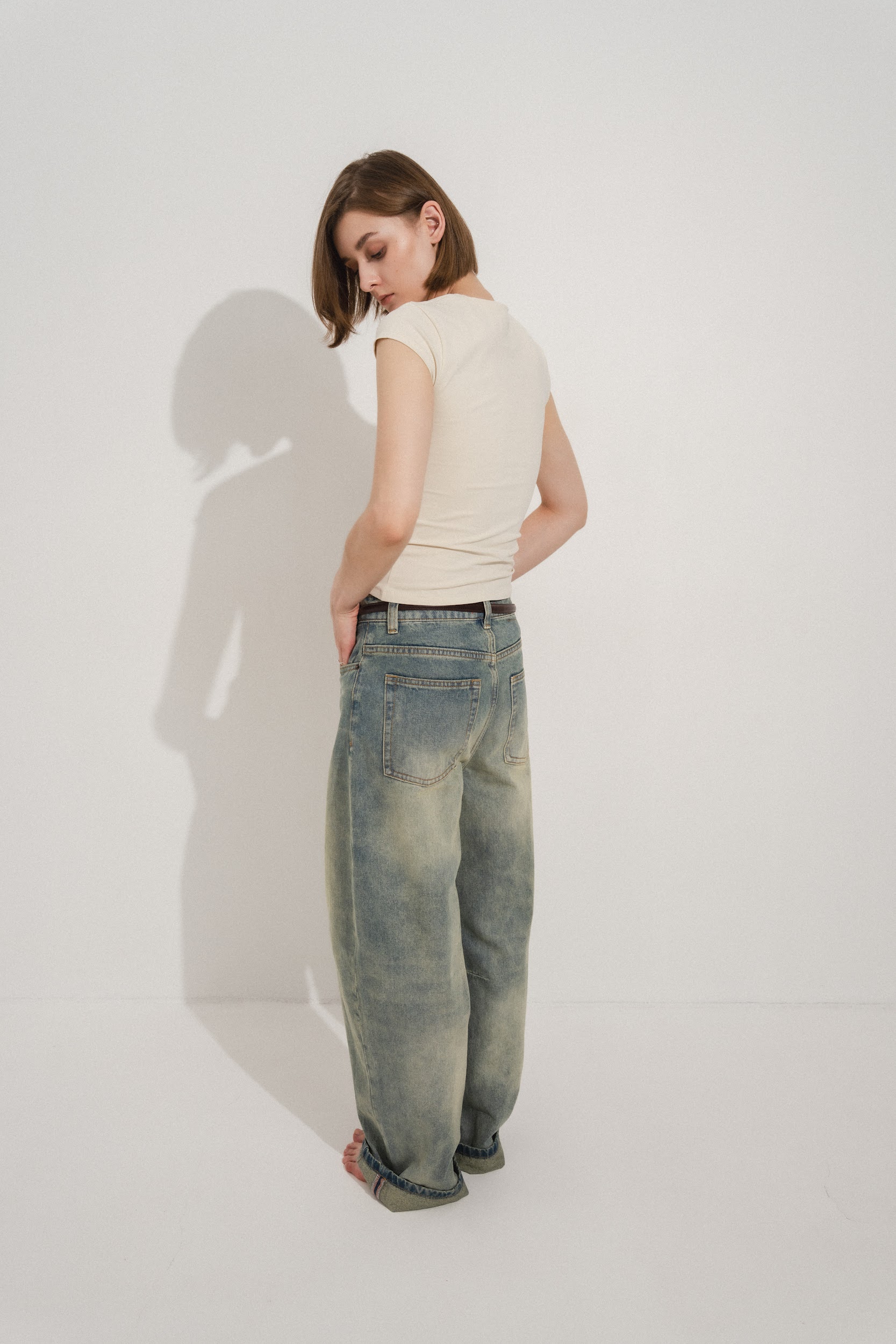 Джинсы свободного кроя со средней посадкой. Эффект потертости. Пять карманов. Застежка на молнию и металлическую пуговицу.