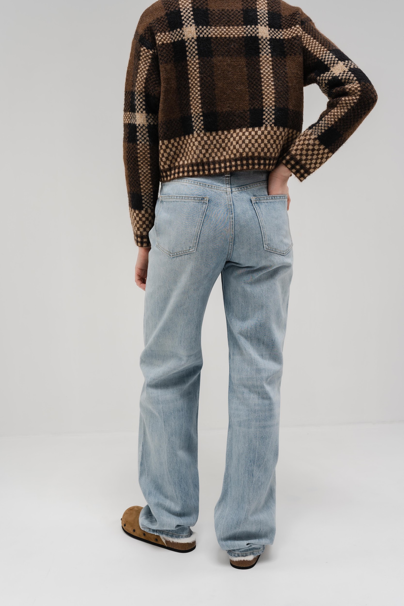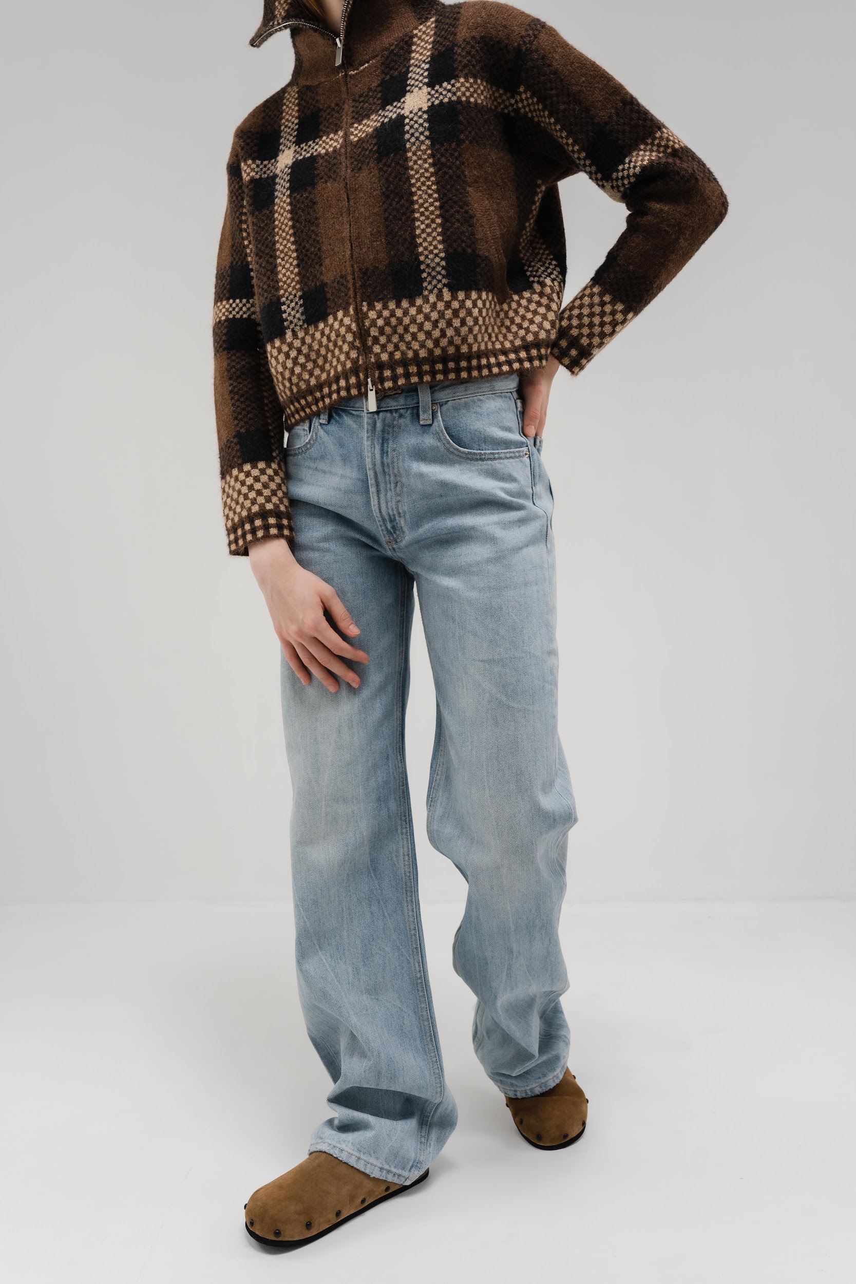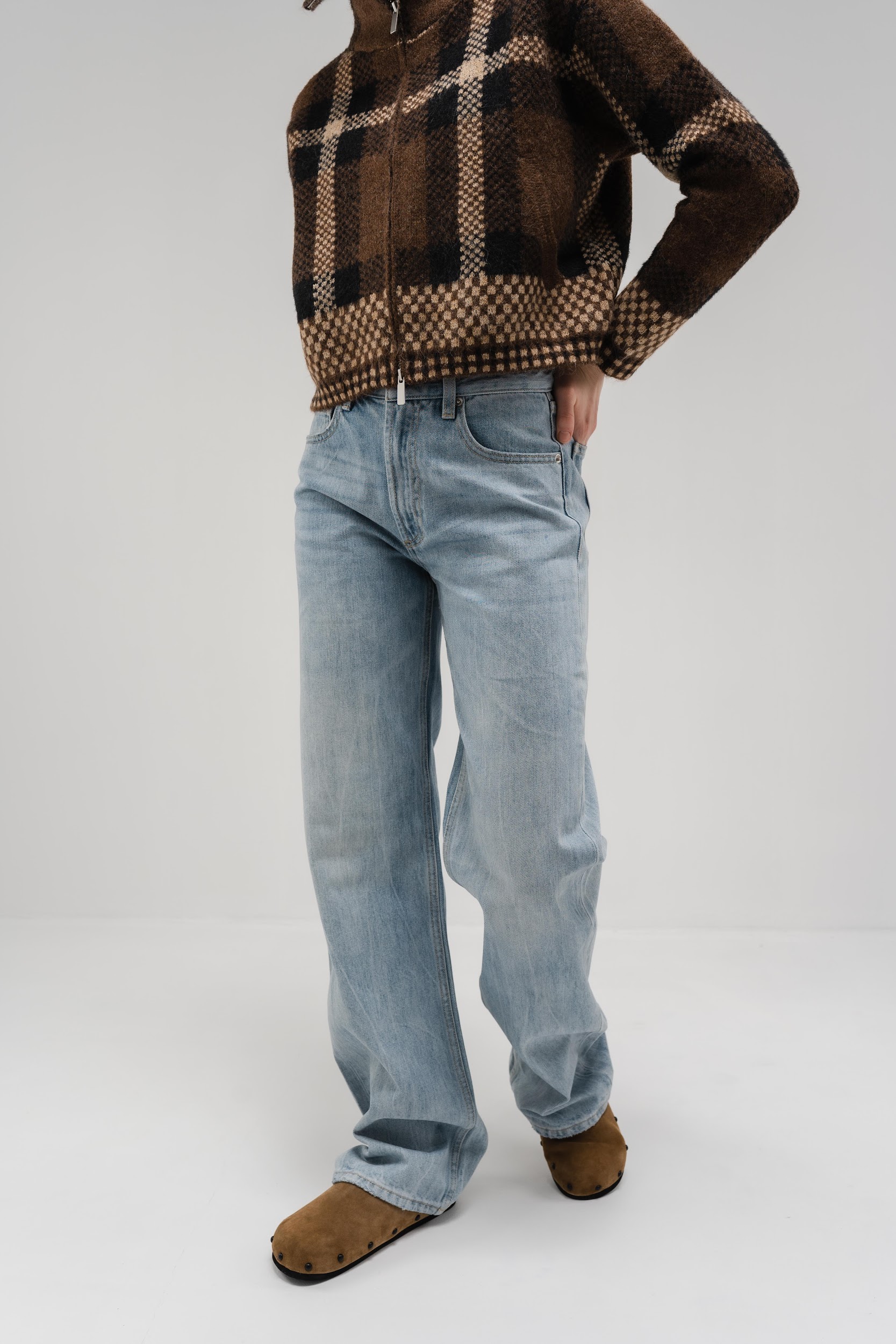 Джинсы длинные, свободного кроя со средней посадкой.  Пять карманов. Застежка на молнию и металлическую пуговицу.