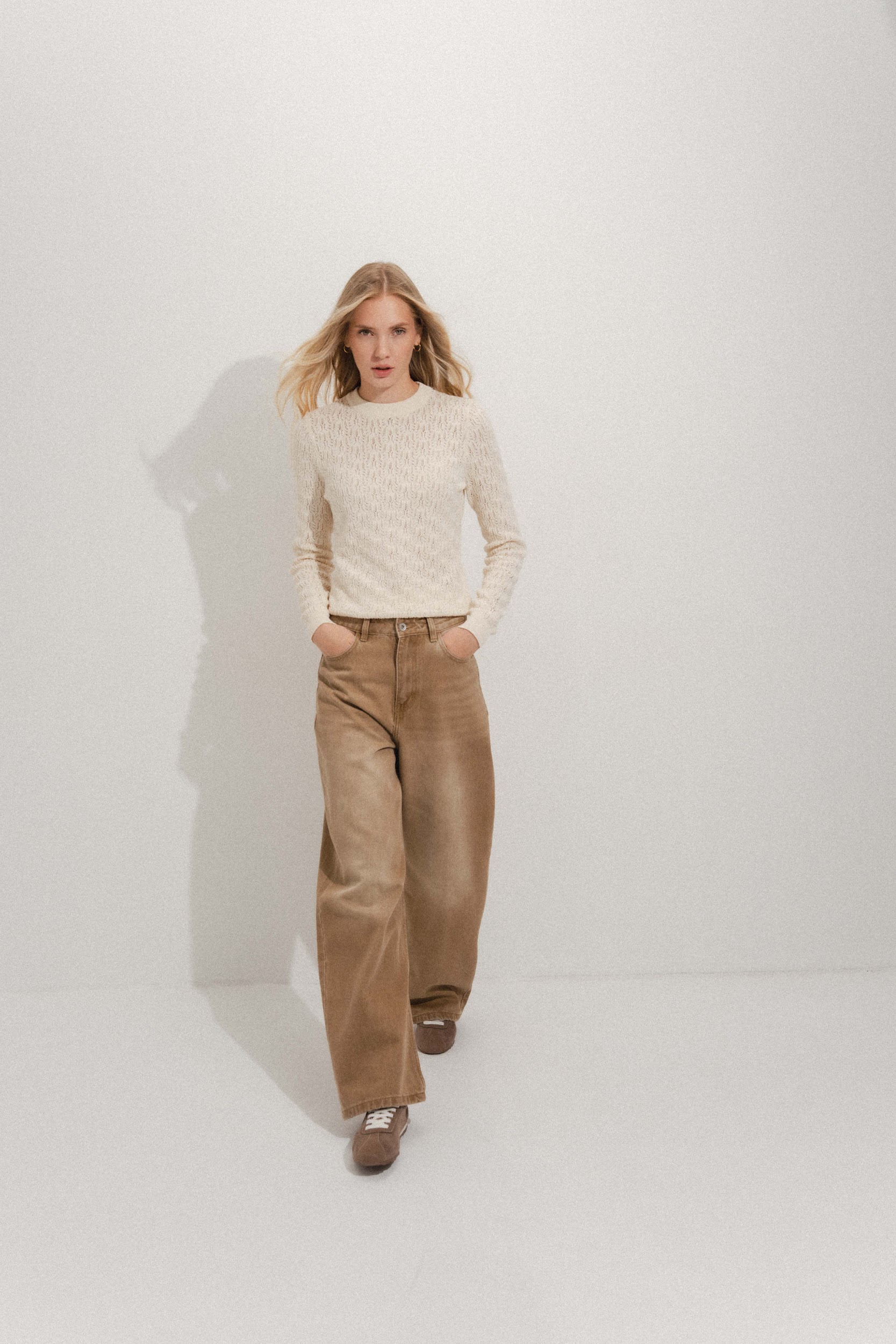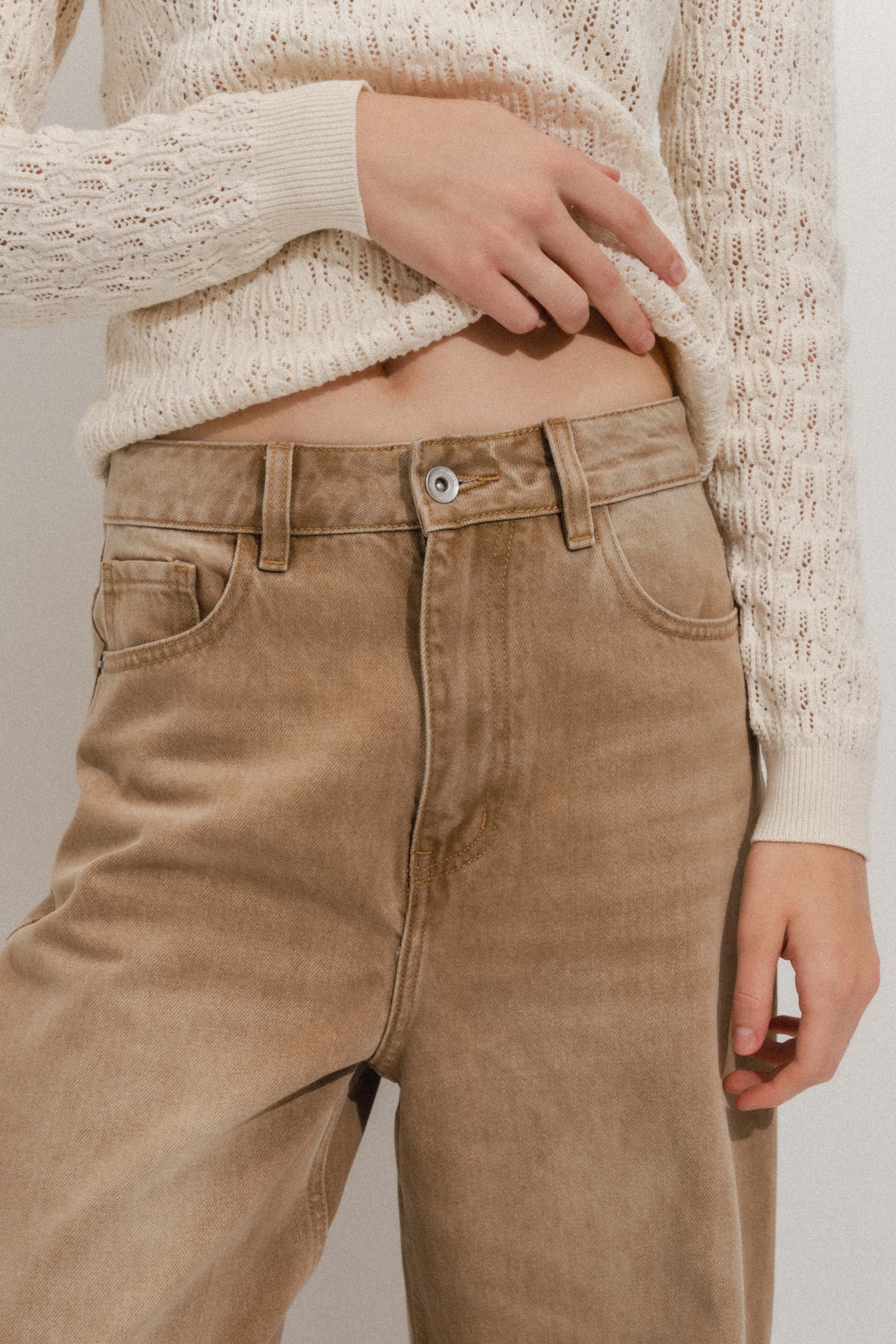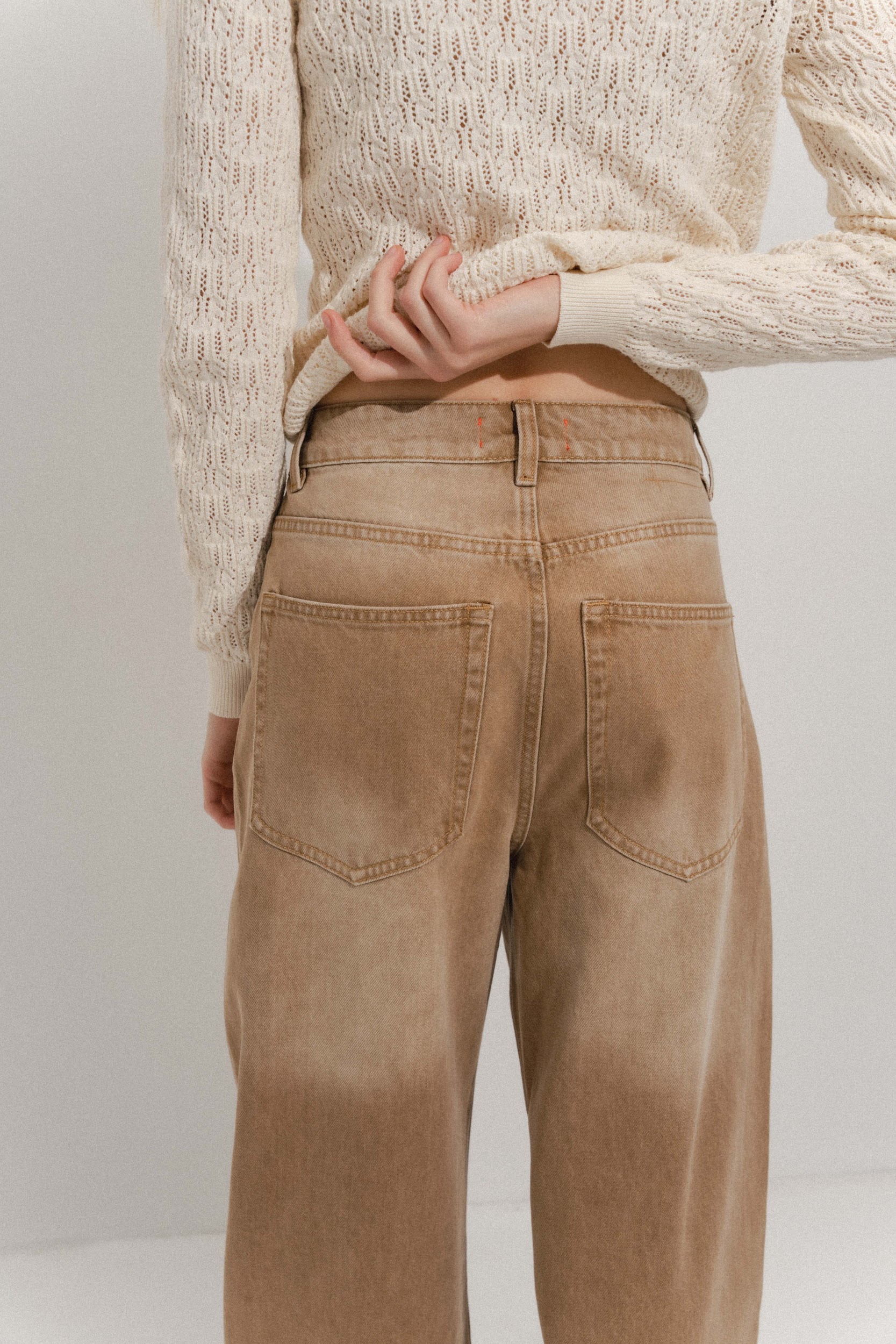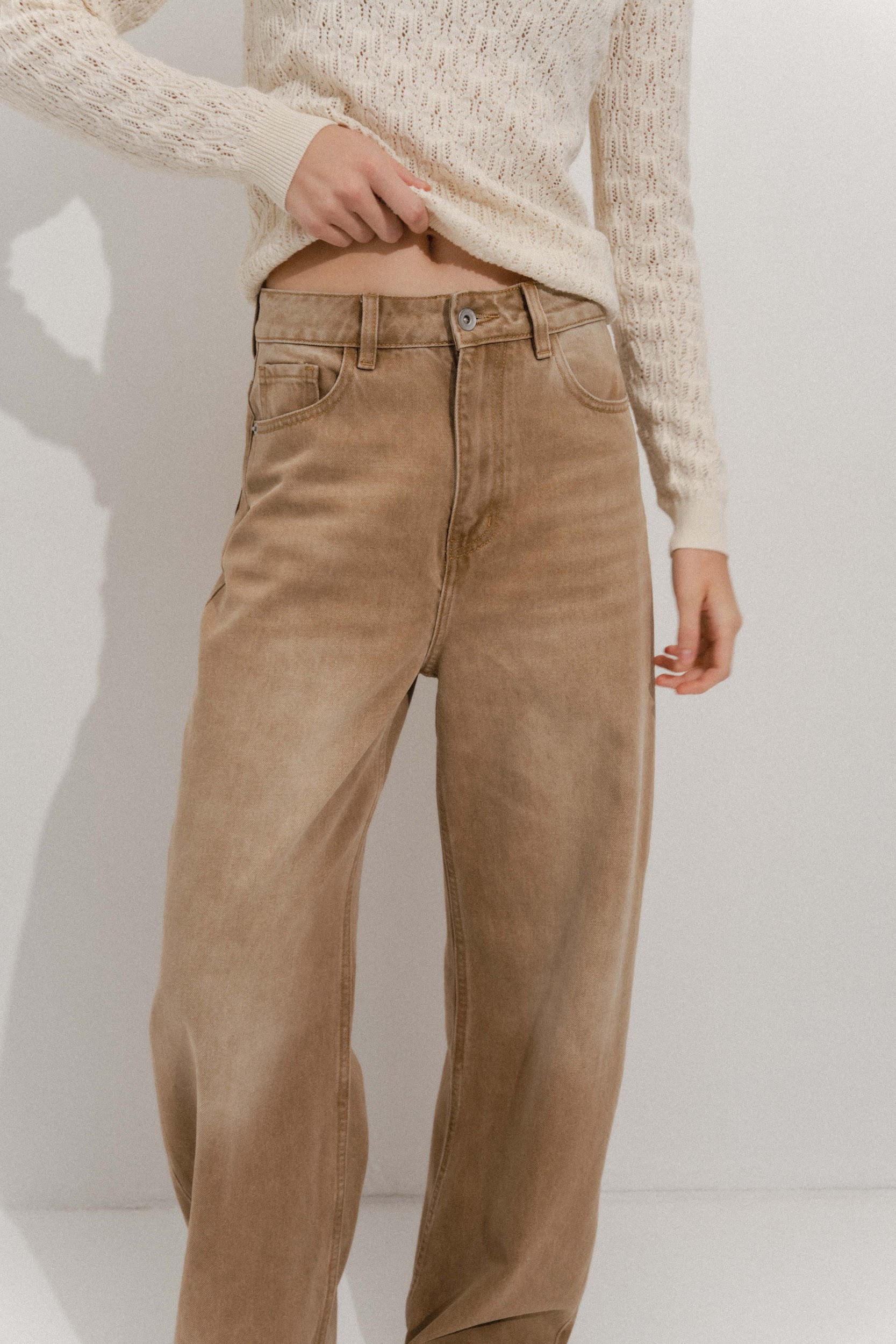 Джинсы свободного кроя со средней посадкой. Эффект потертости. Пять карманов. Застежка на молнию и металлическую пуговицу