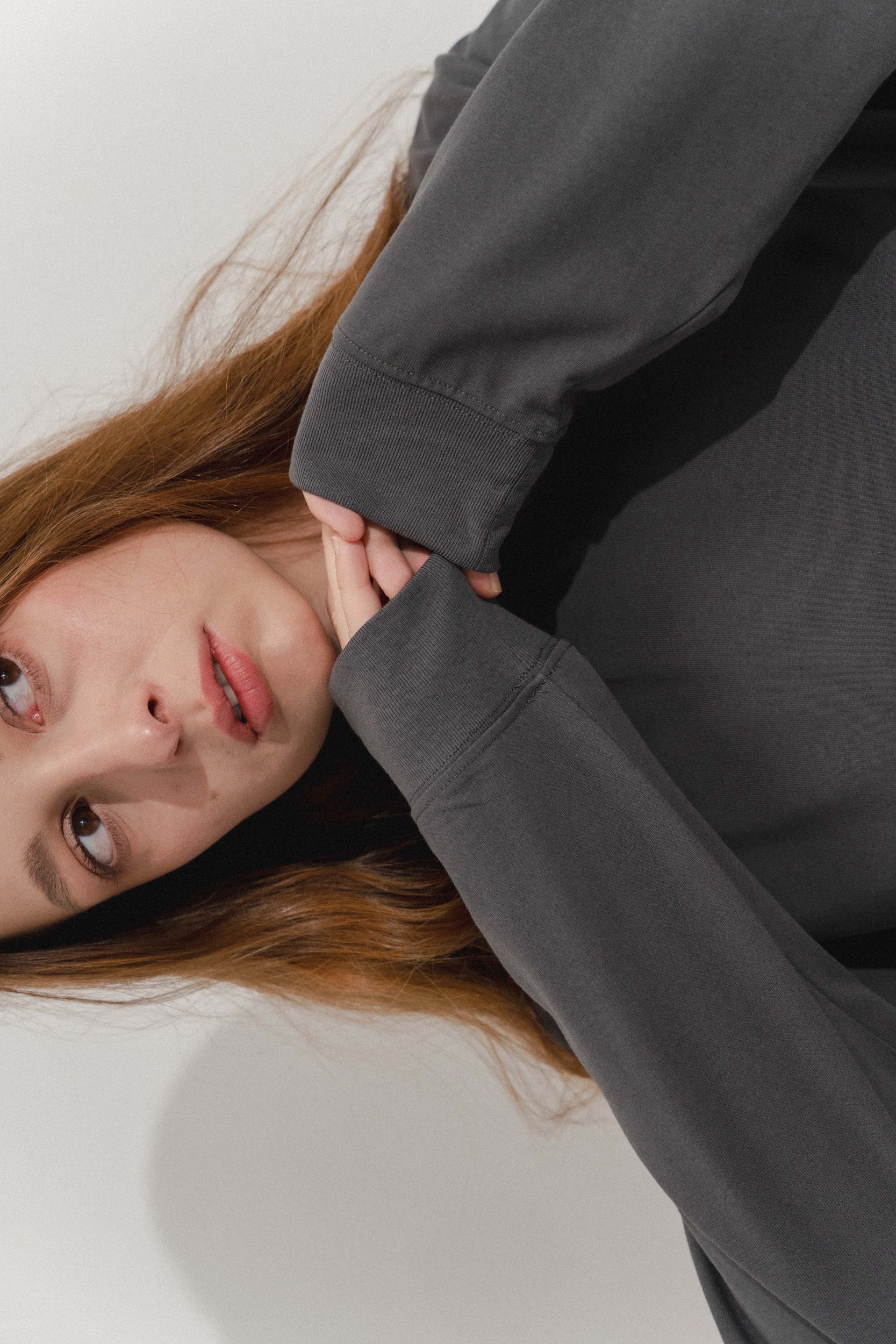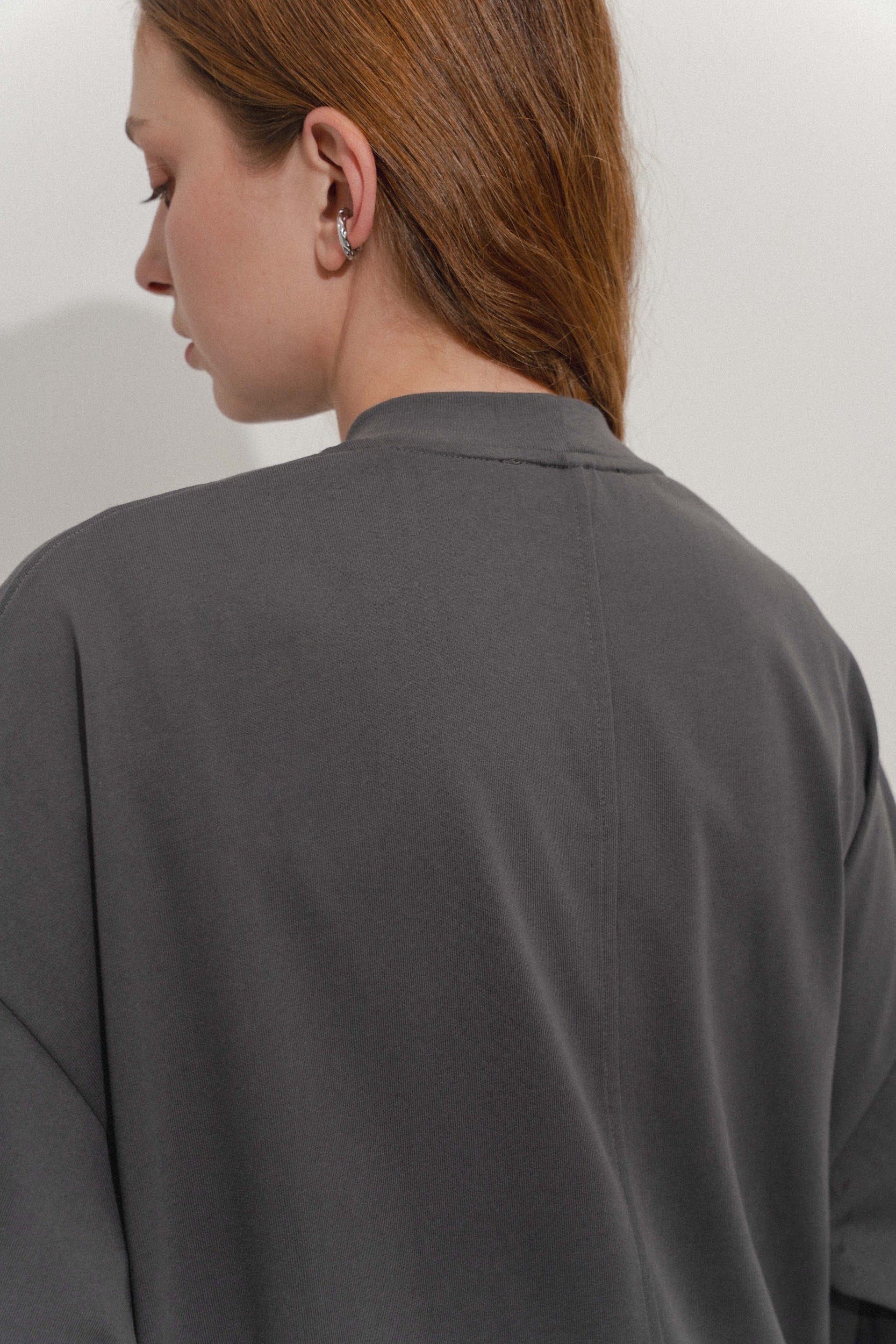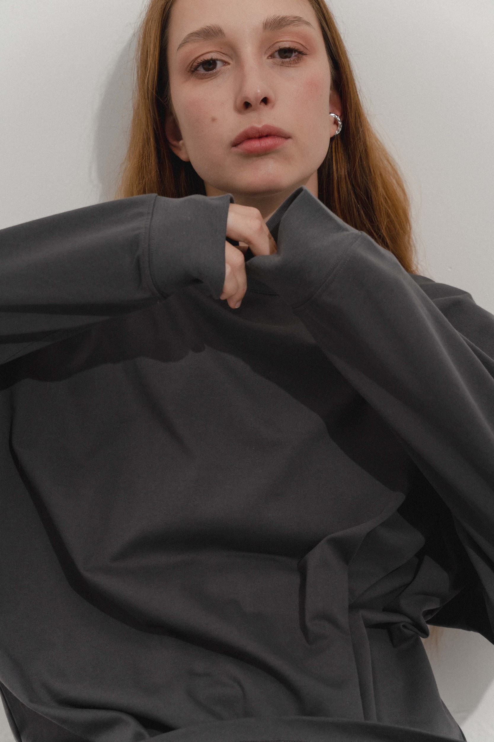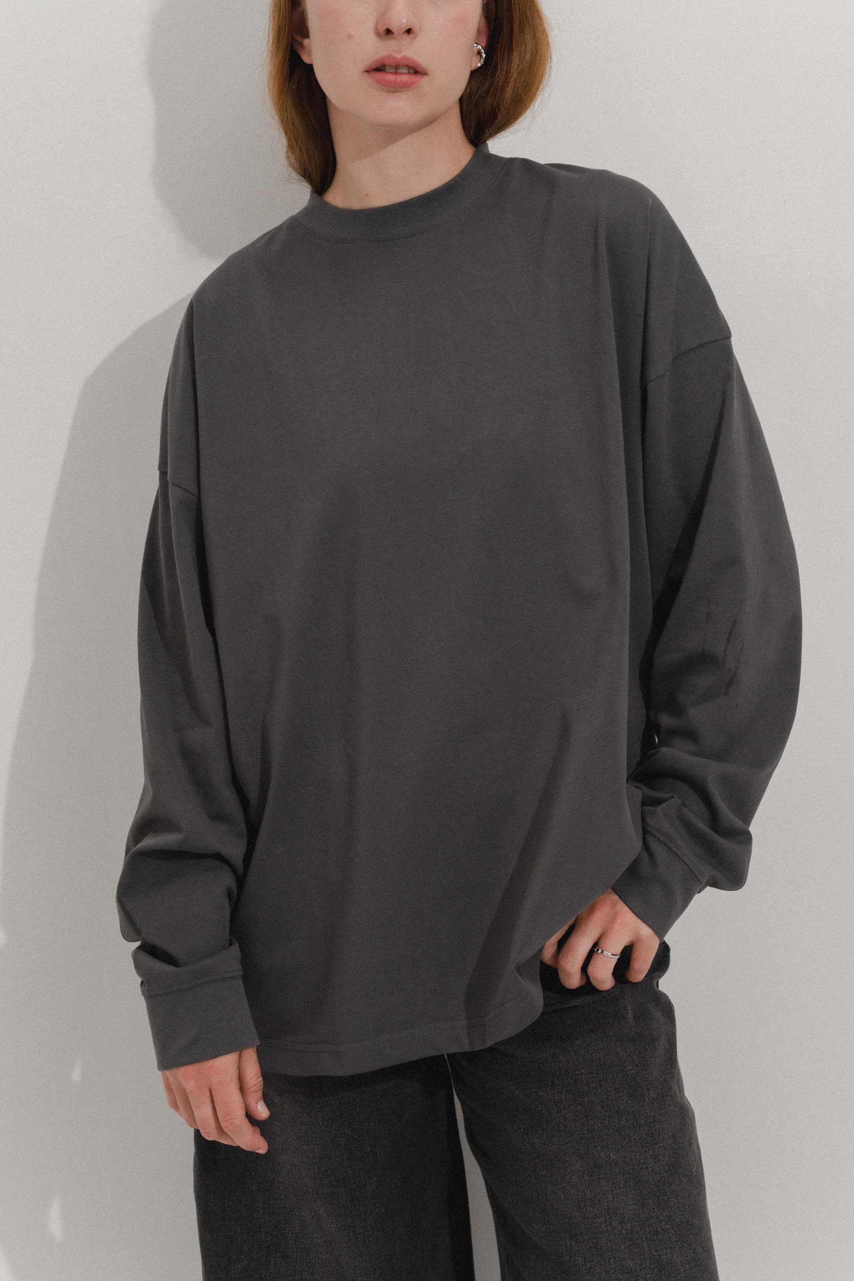 Лонгслив свободного кроя с манжетами на рукавах. Круглый вырез. Длинные рукава.