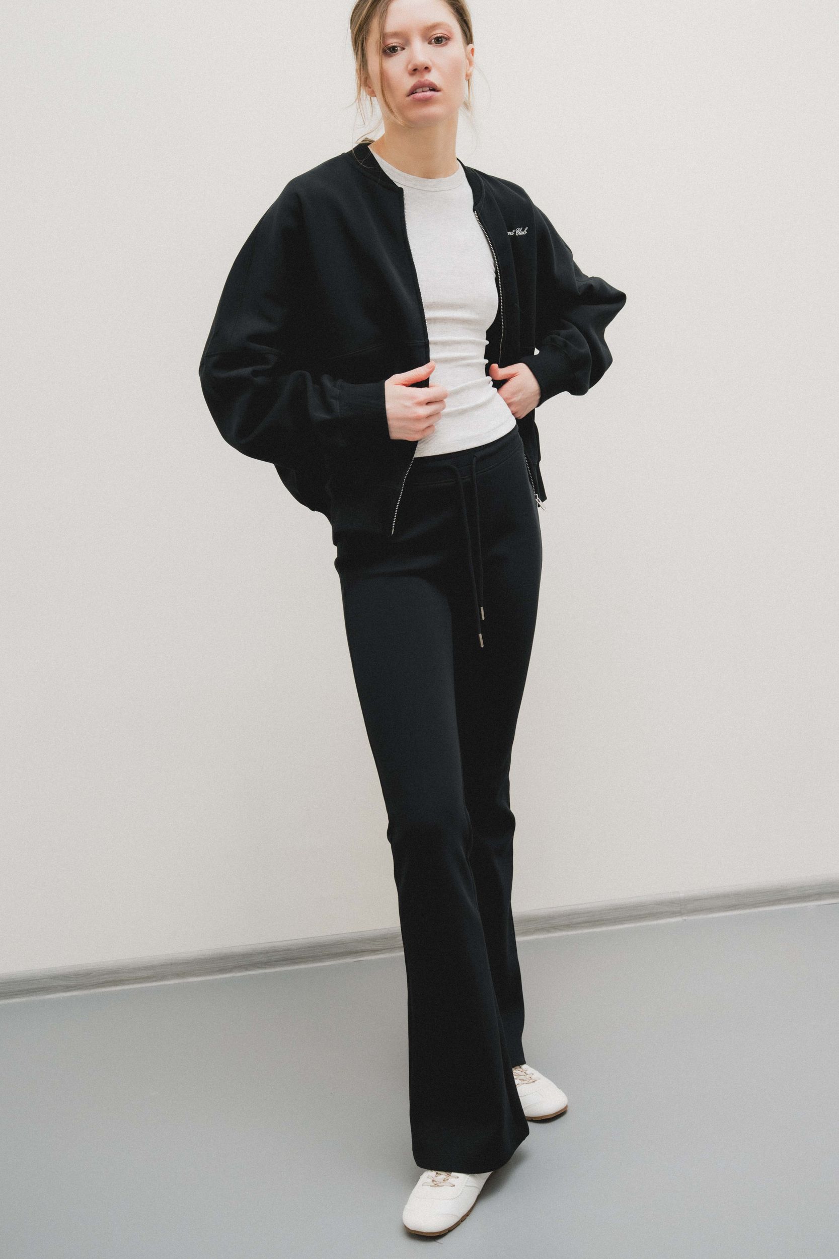 Брюки из эластичного трикотажа плотной, мягкой и непрозрачной ткани. Высокая посадка и регулируемый пояс на завязкахи вышивкой. Расклешенные штанины.
