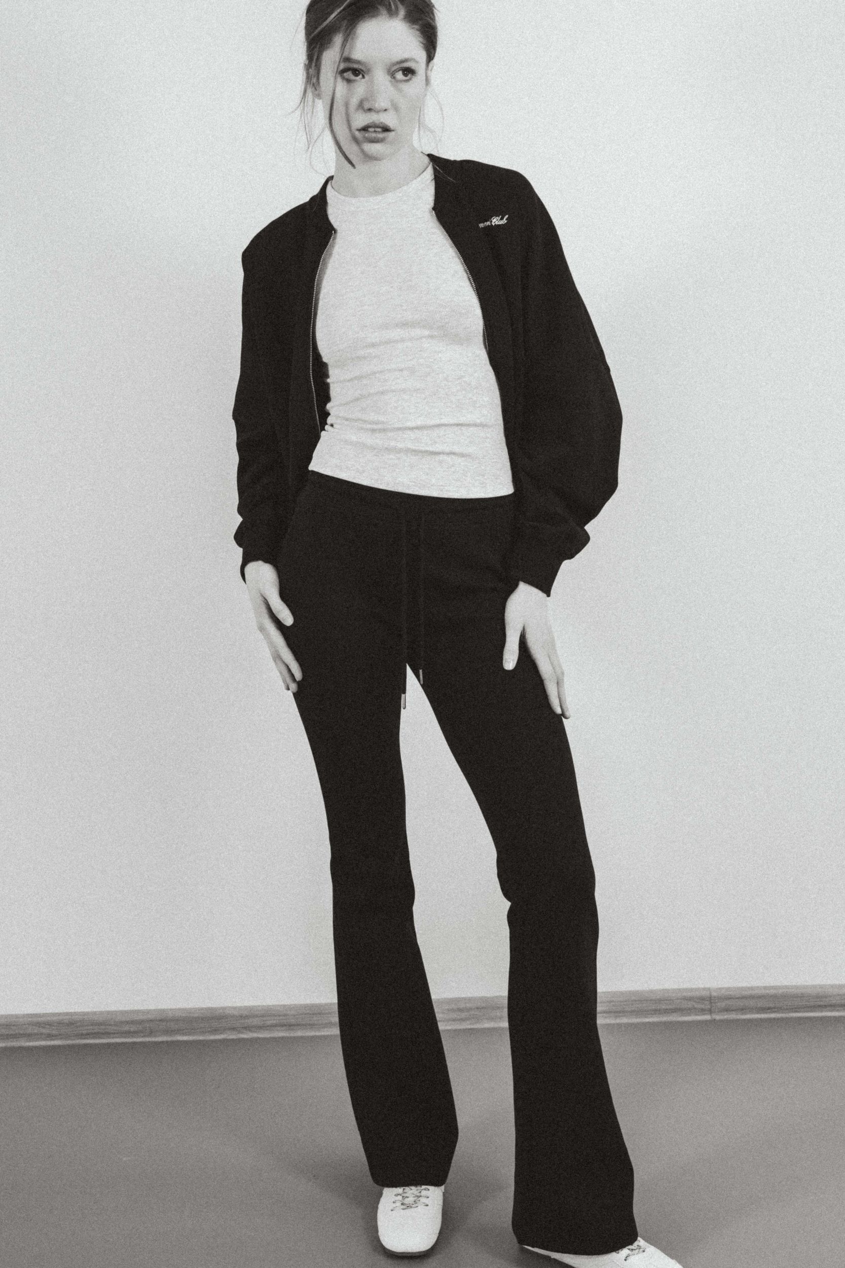 Брюки из эластичного трикотажа плотной, мягкой и непрозрачной ткани. Высокая посадка и регулируемый пояс на завязкахи вышивкой. Расклешенные штанины.