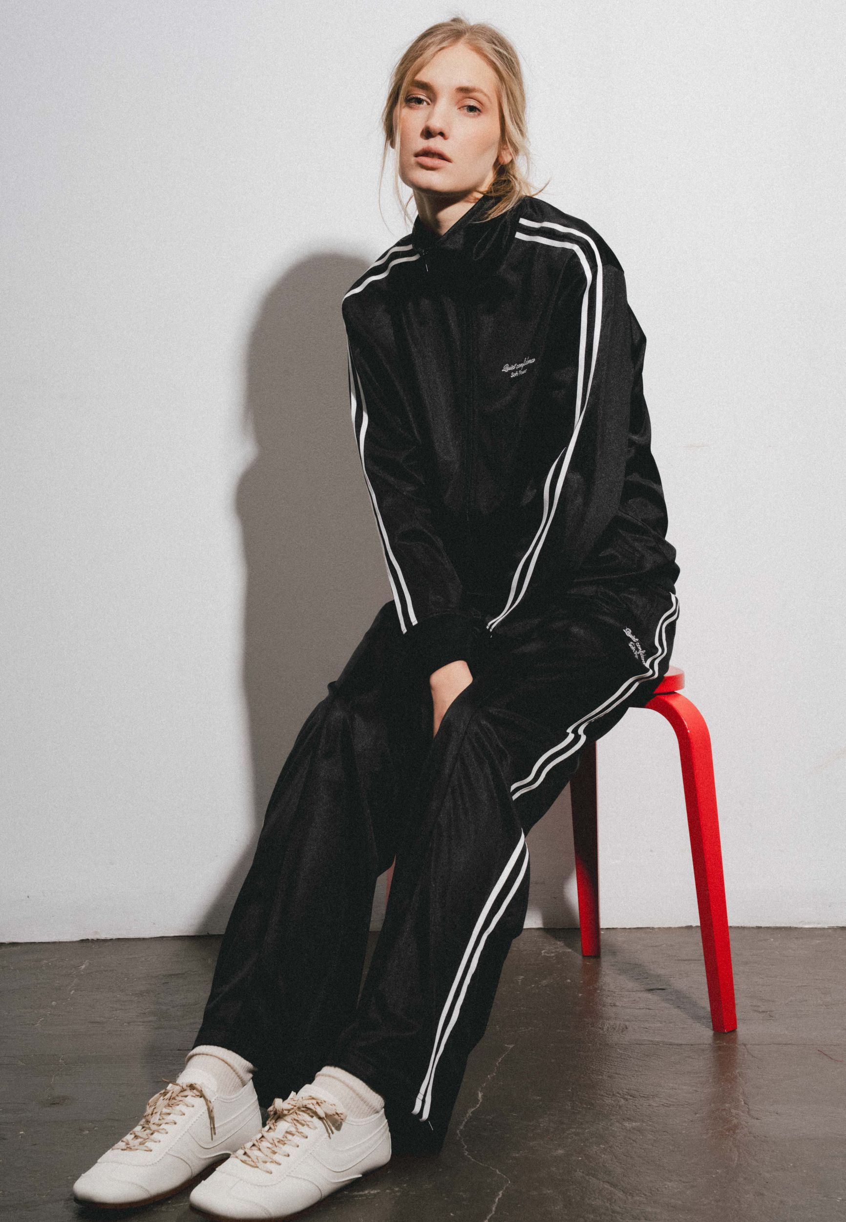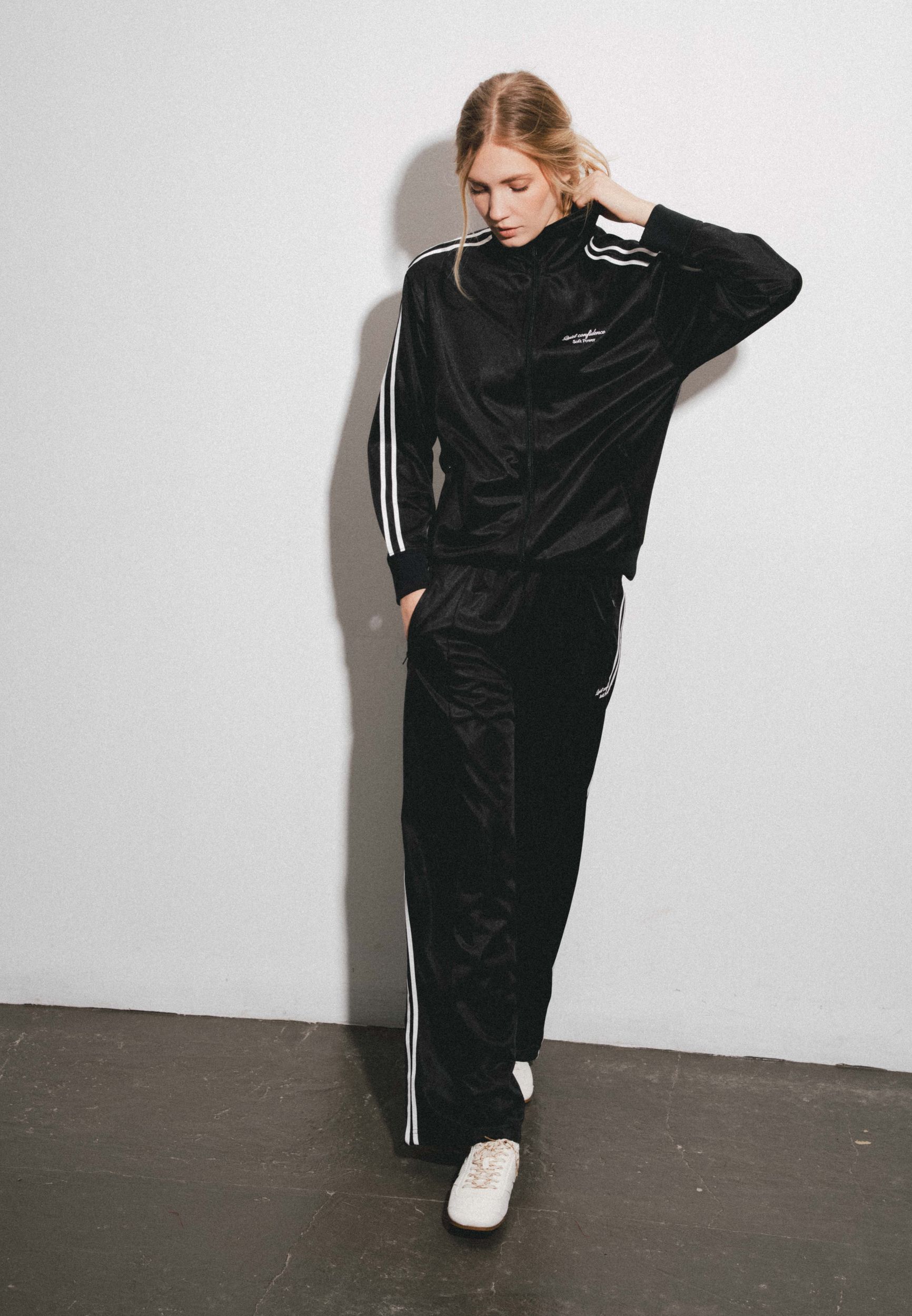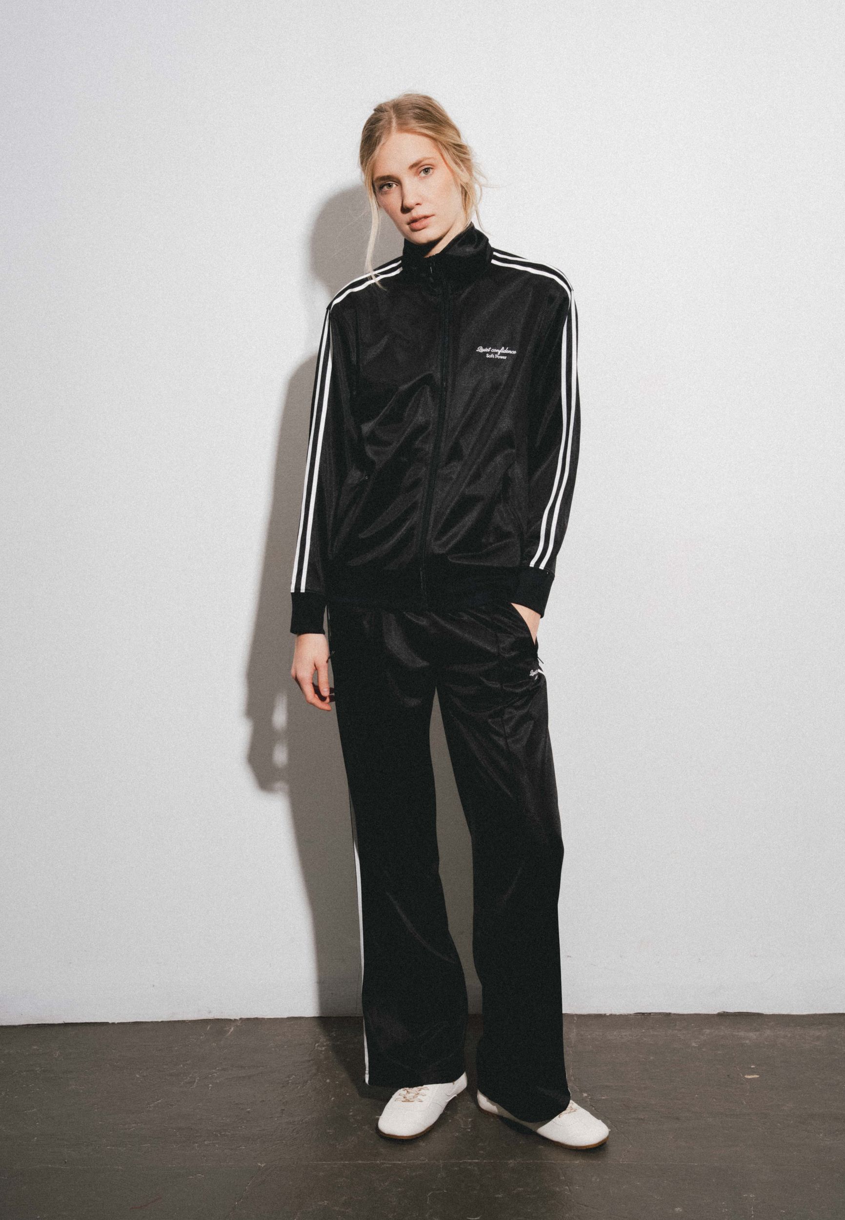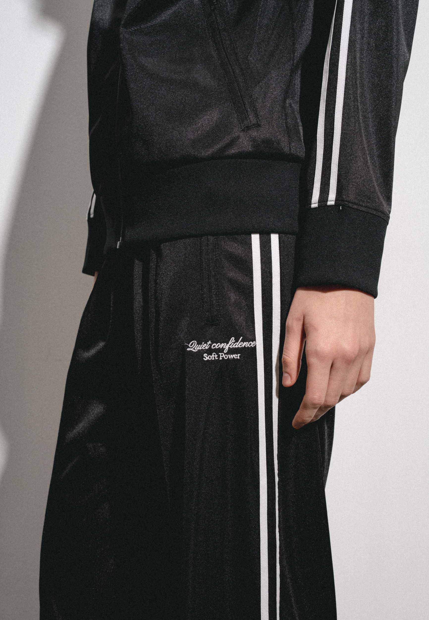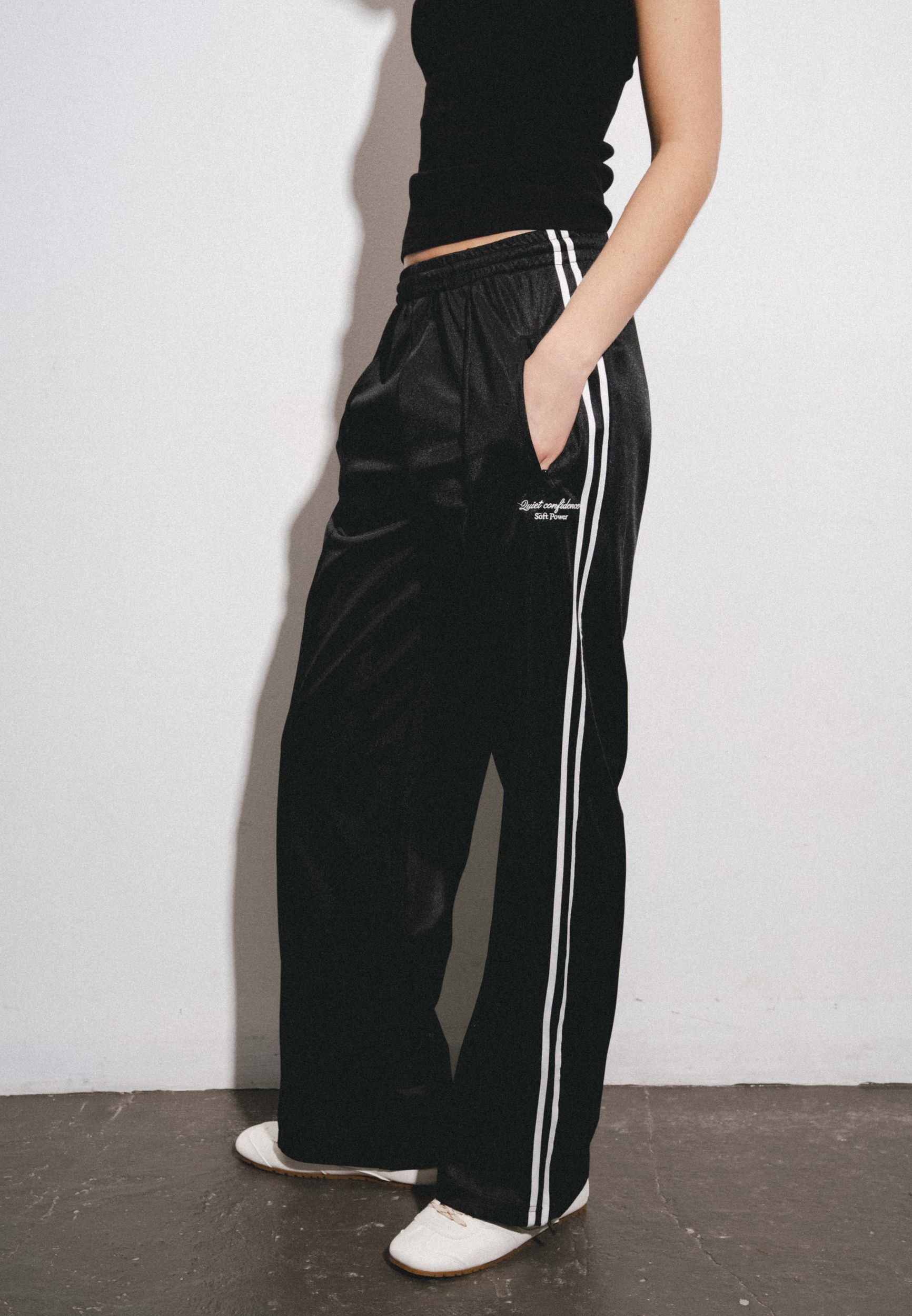 Спортивные брюки прямого силуэта на резинки с карманами. Контрастная отделка сбоку, вышивка.
