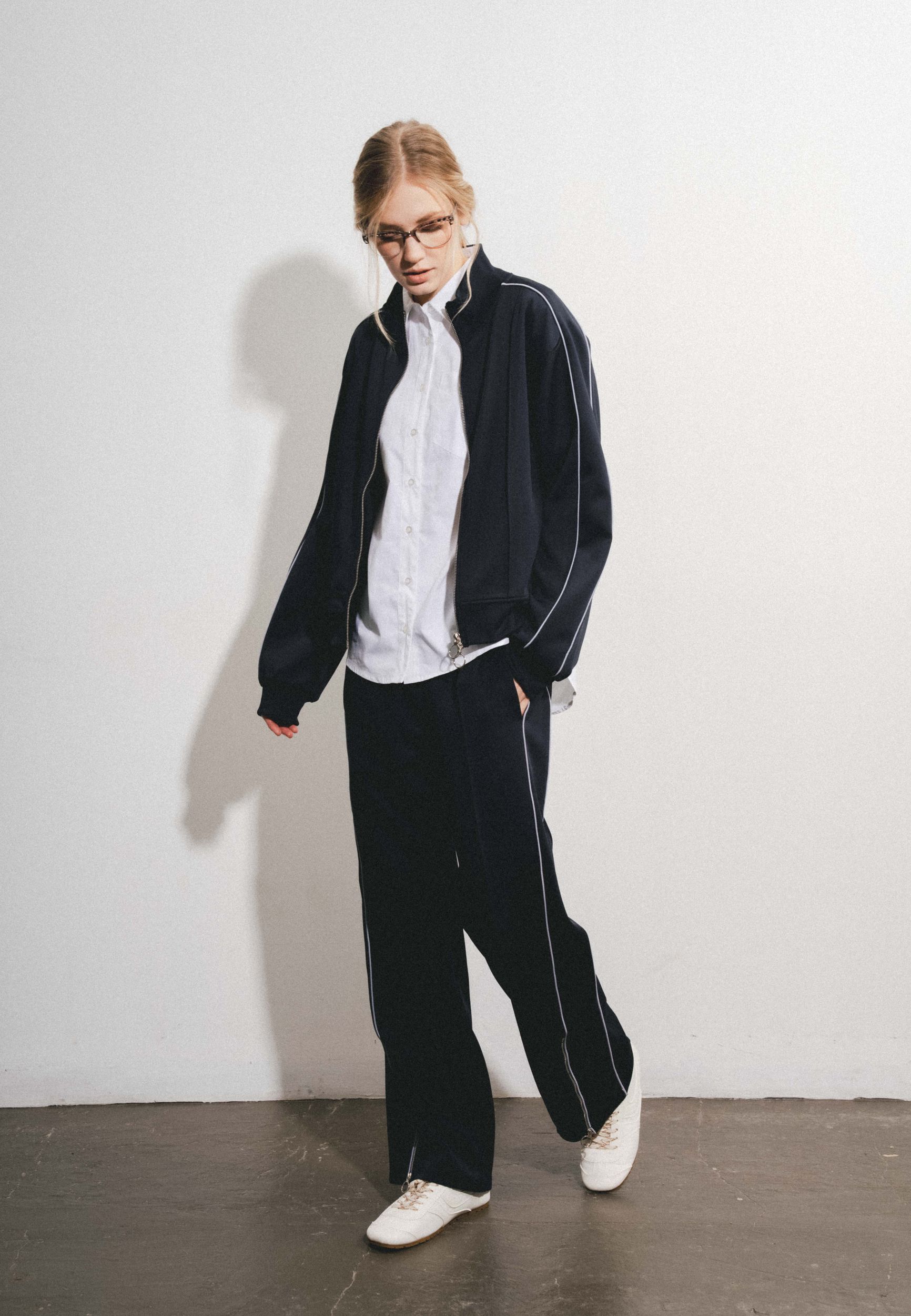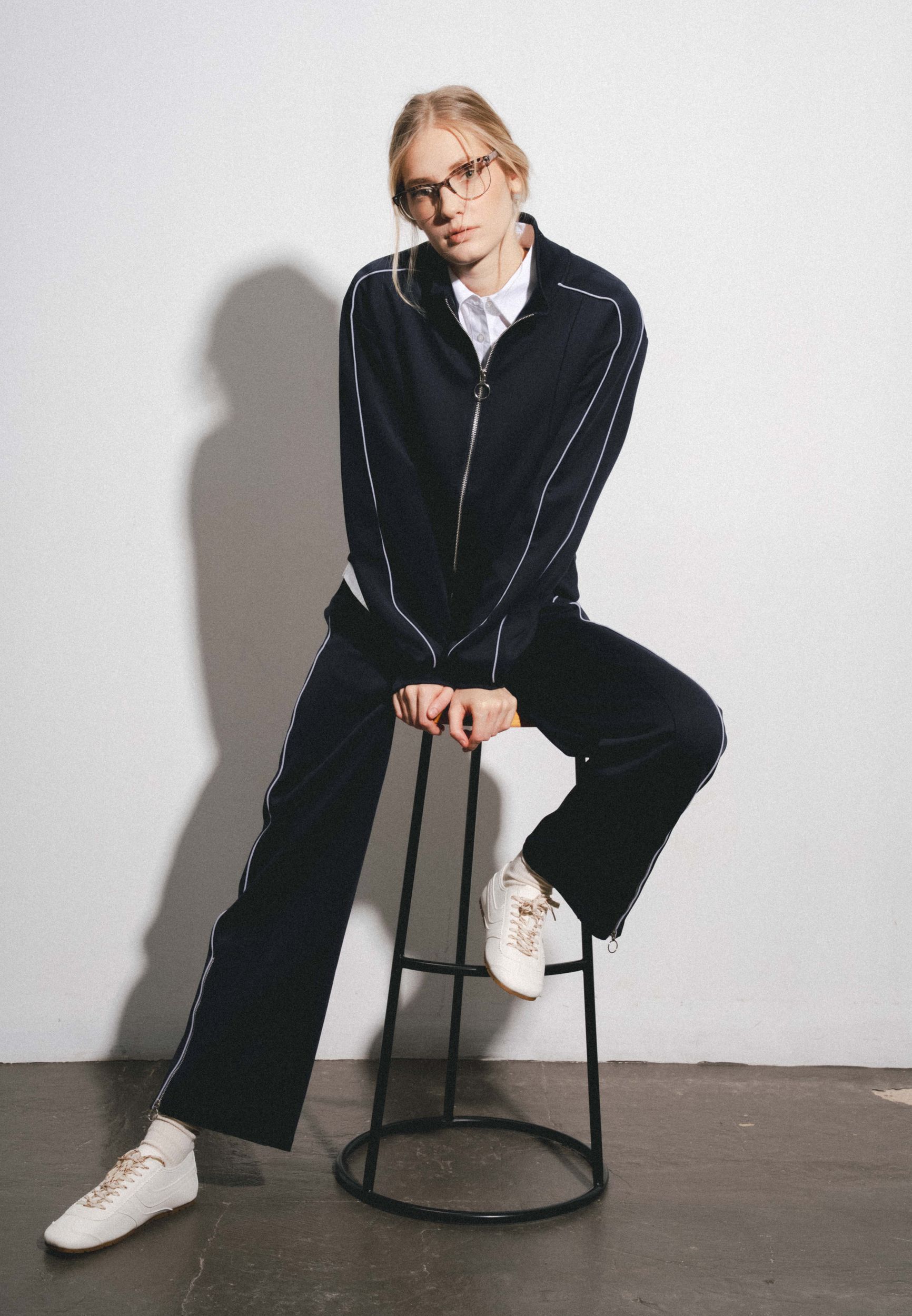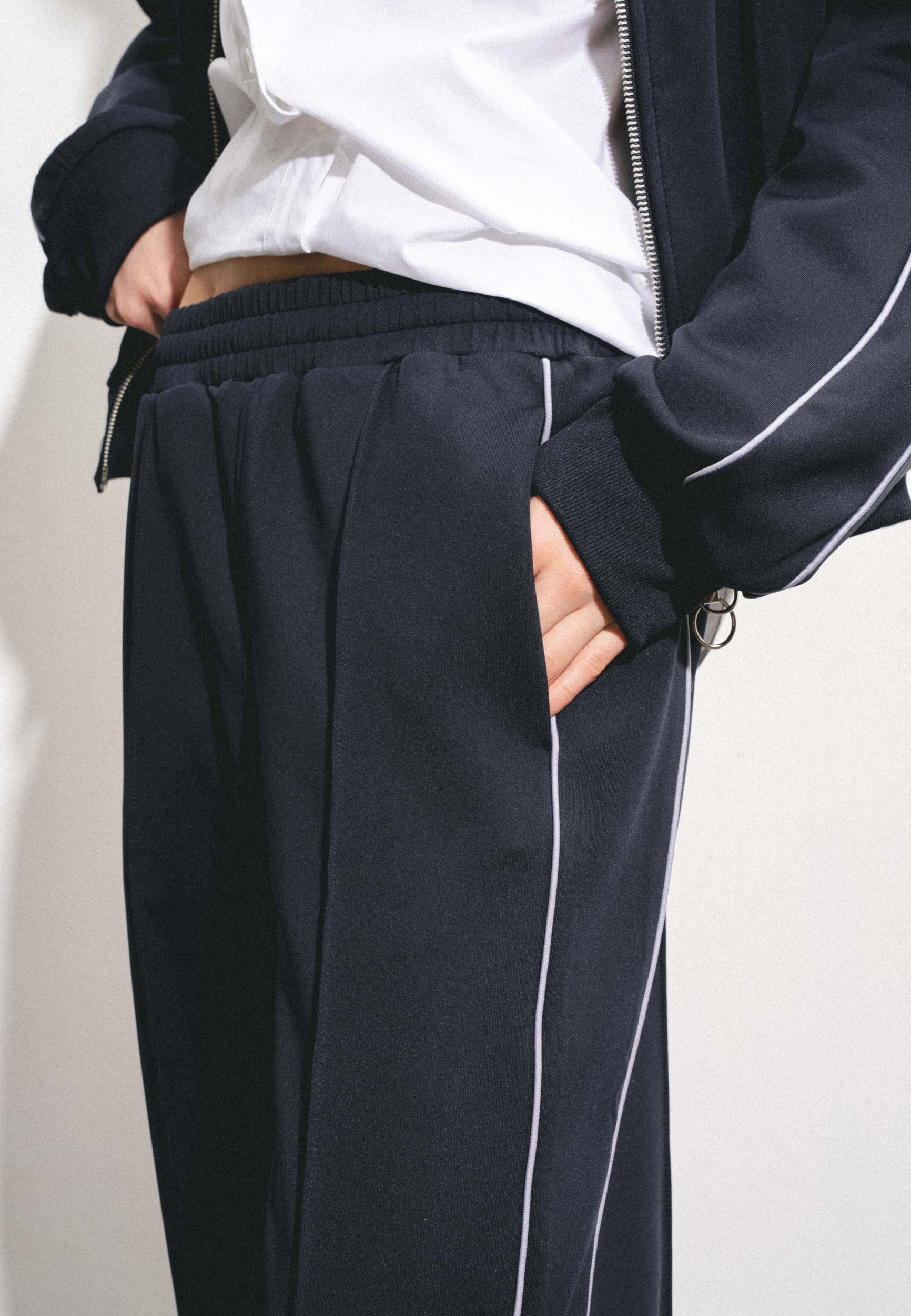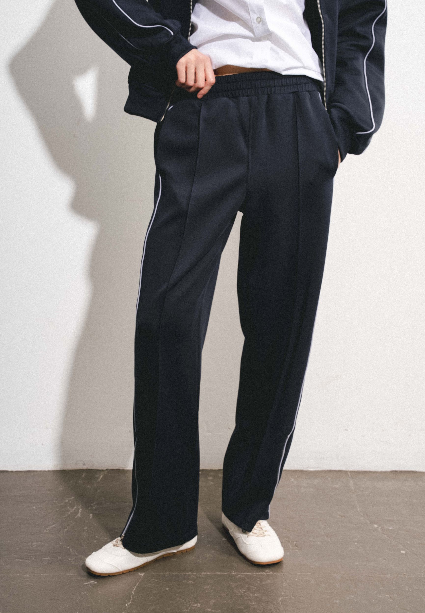 Спортивные брюки из мягкой ткани с завышенной талией с эластичным поясом и потайным шнурком. Прямые штанины с вшитыми складками спереди и сзади и акцентной окантовкой по бокам. Застежка-молния спереди по низу брюк.