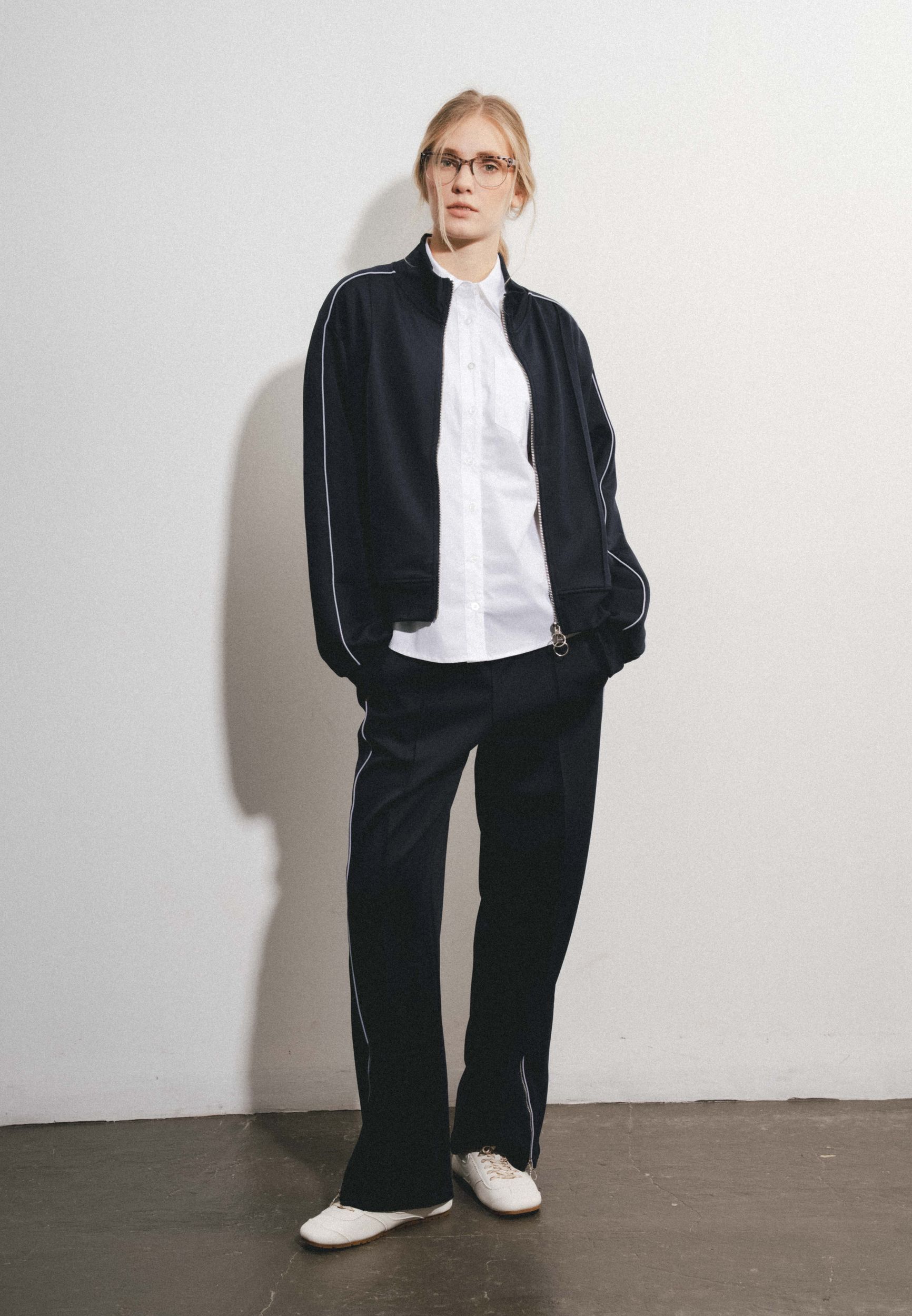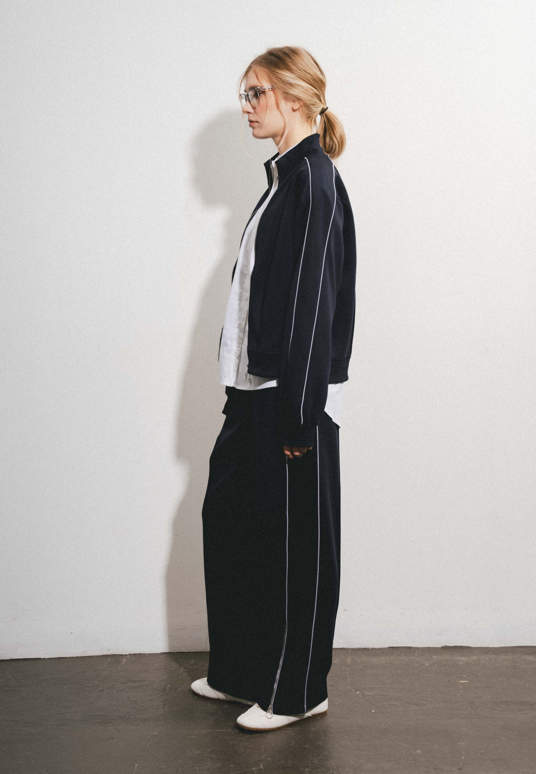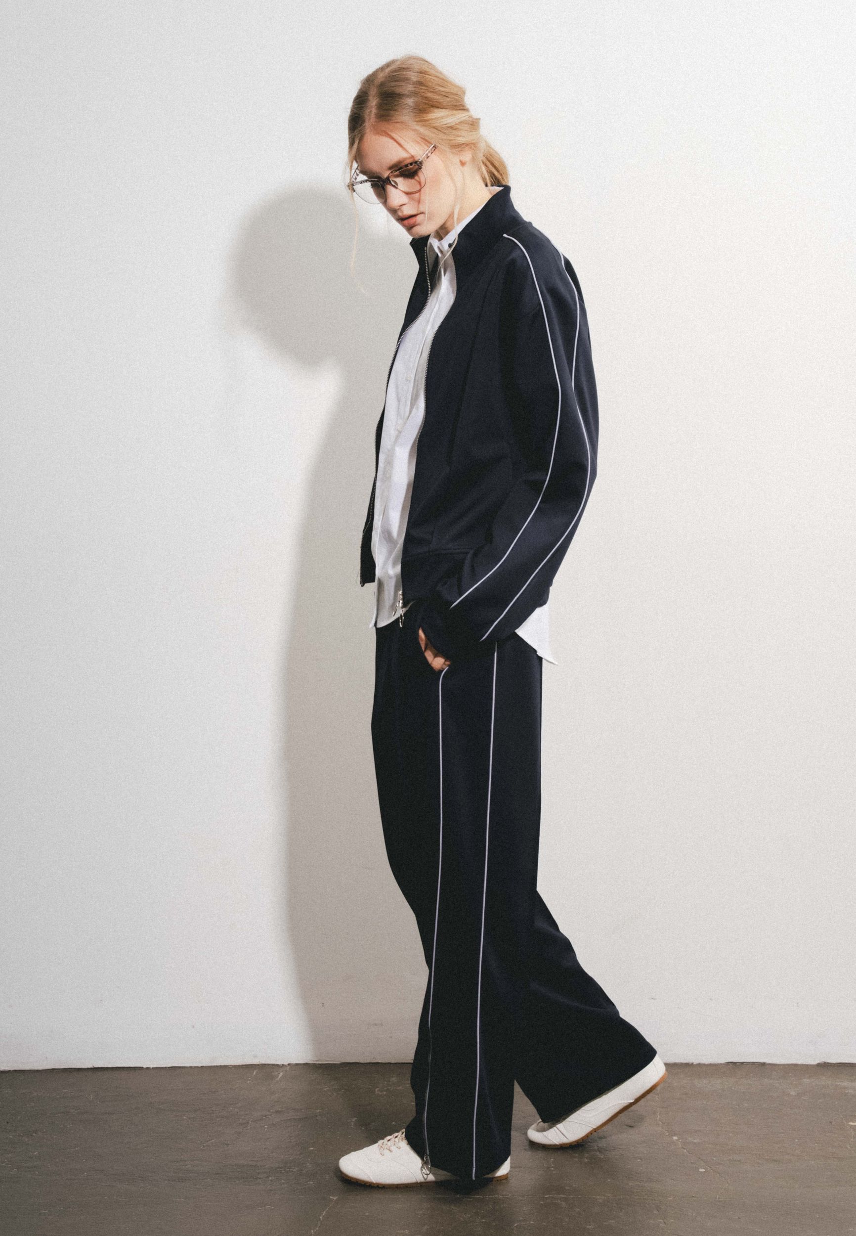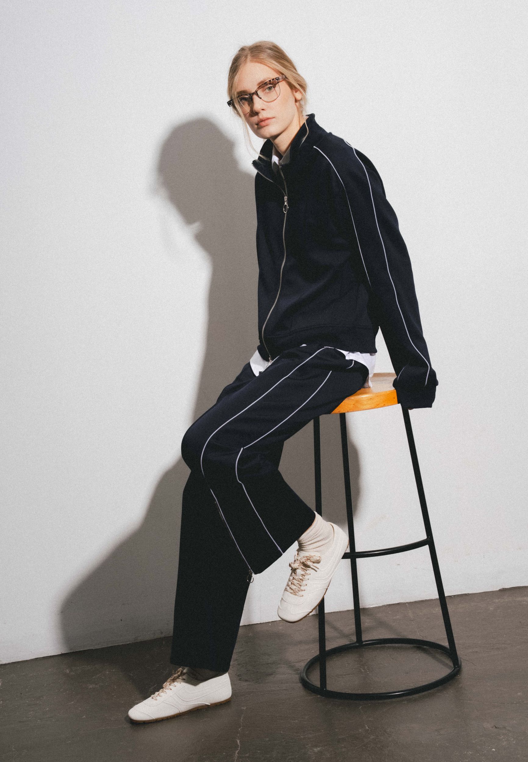 Спортивные брюки из мягкой ткани с завышенной талией с эластичным поясом и потайным шнурком. Прямые штанины с вшитыми складками спереди и сзади и акцентной окантовкой по бокам. Застежка-молния спереди по низу брюк.