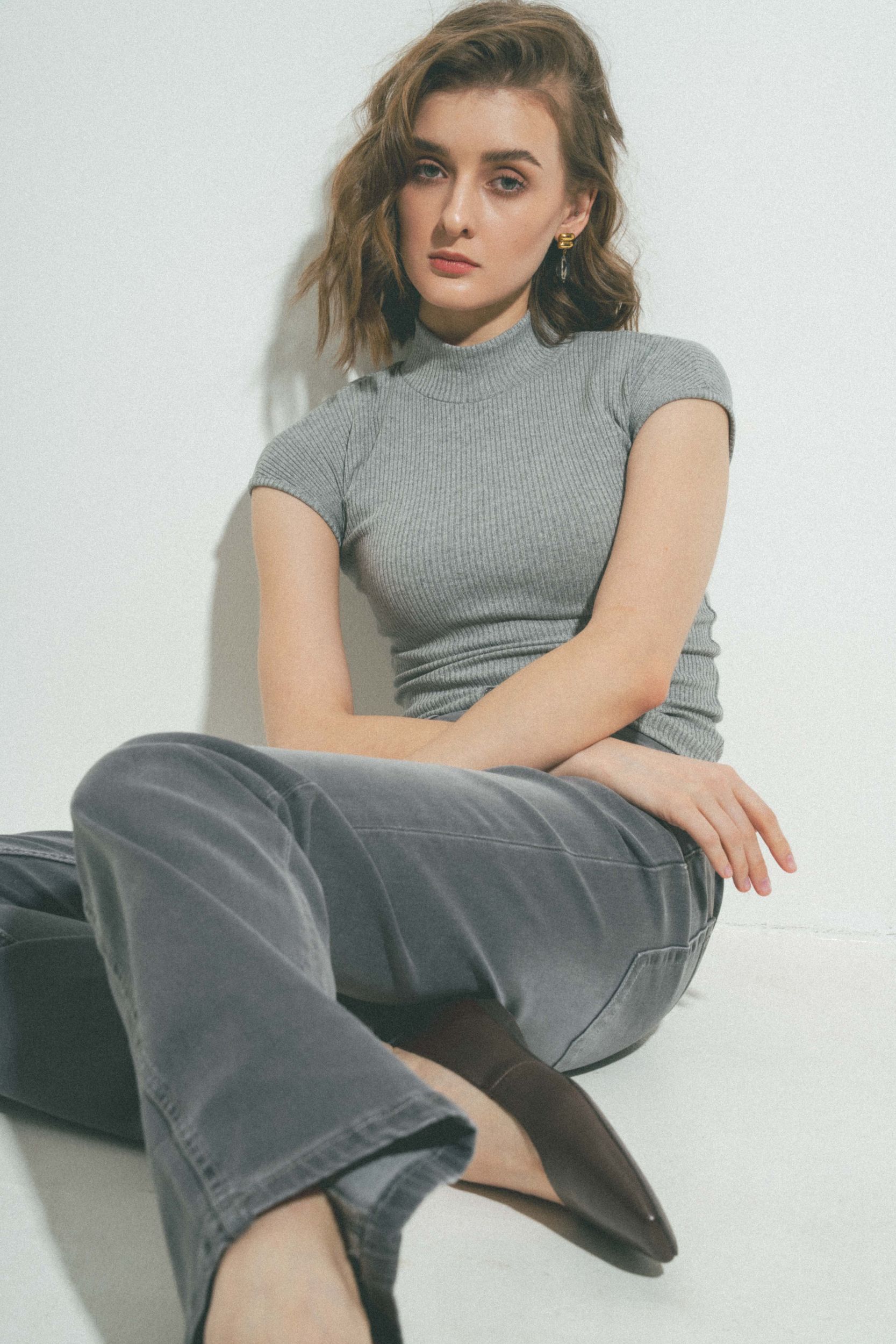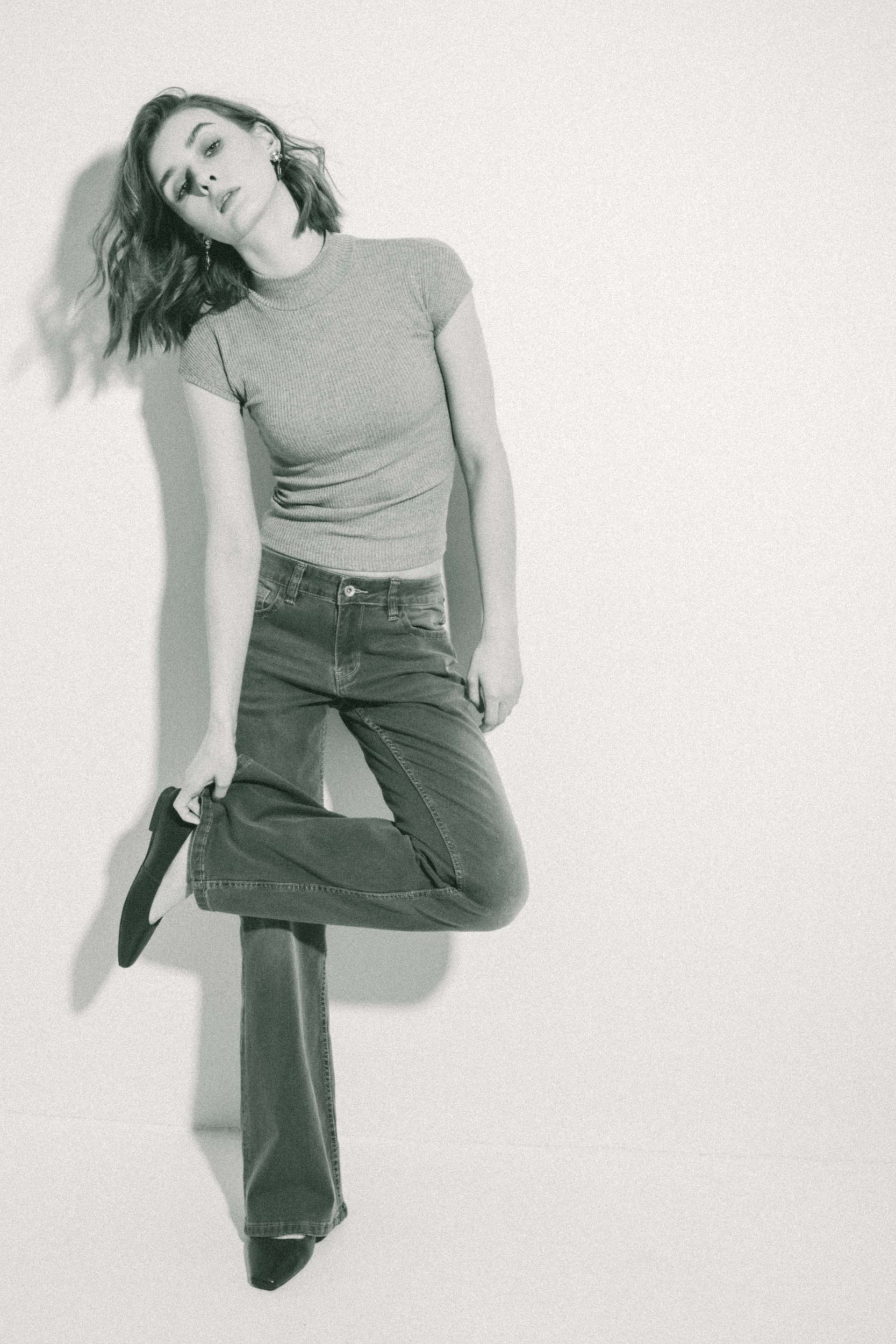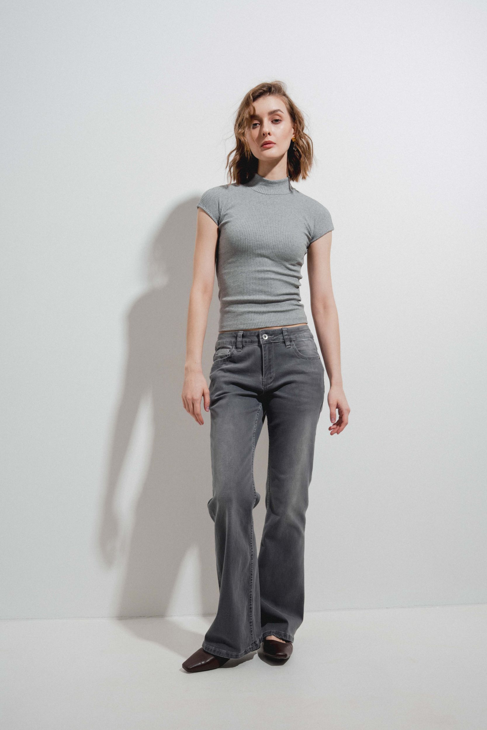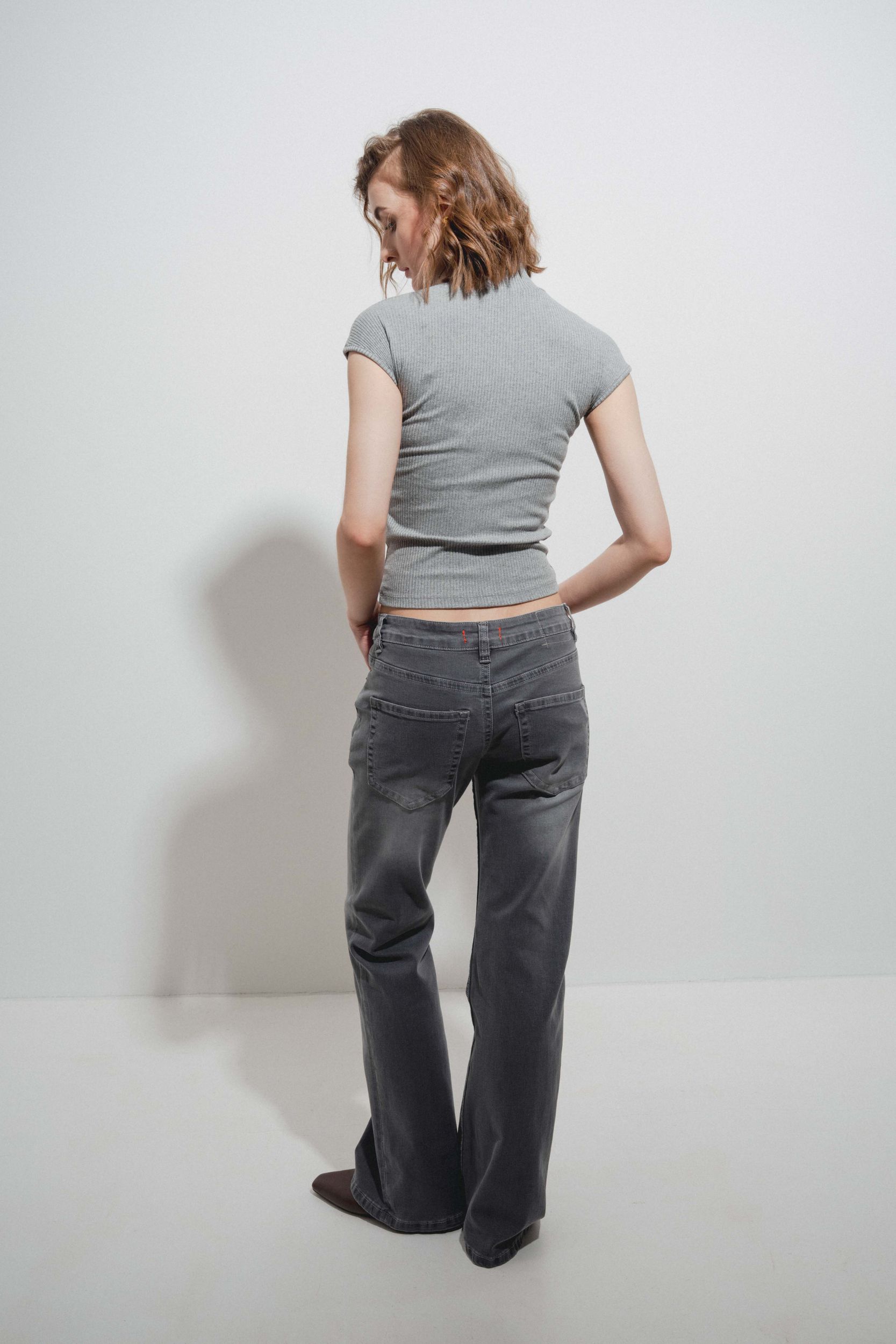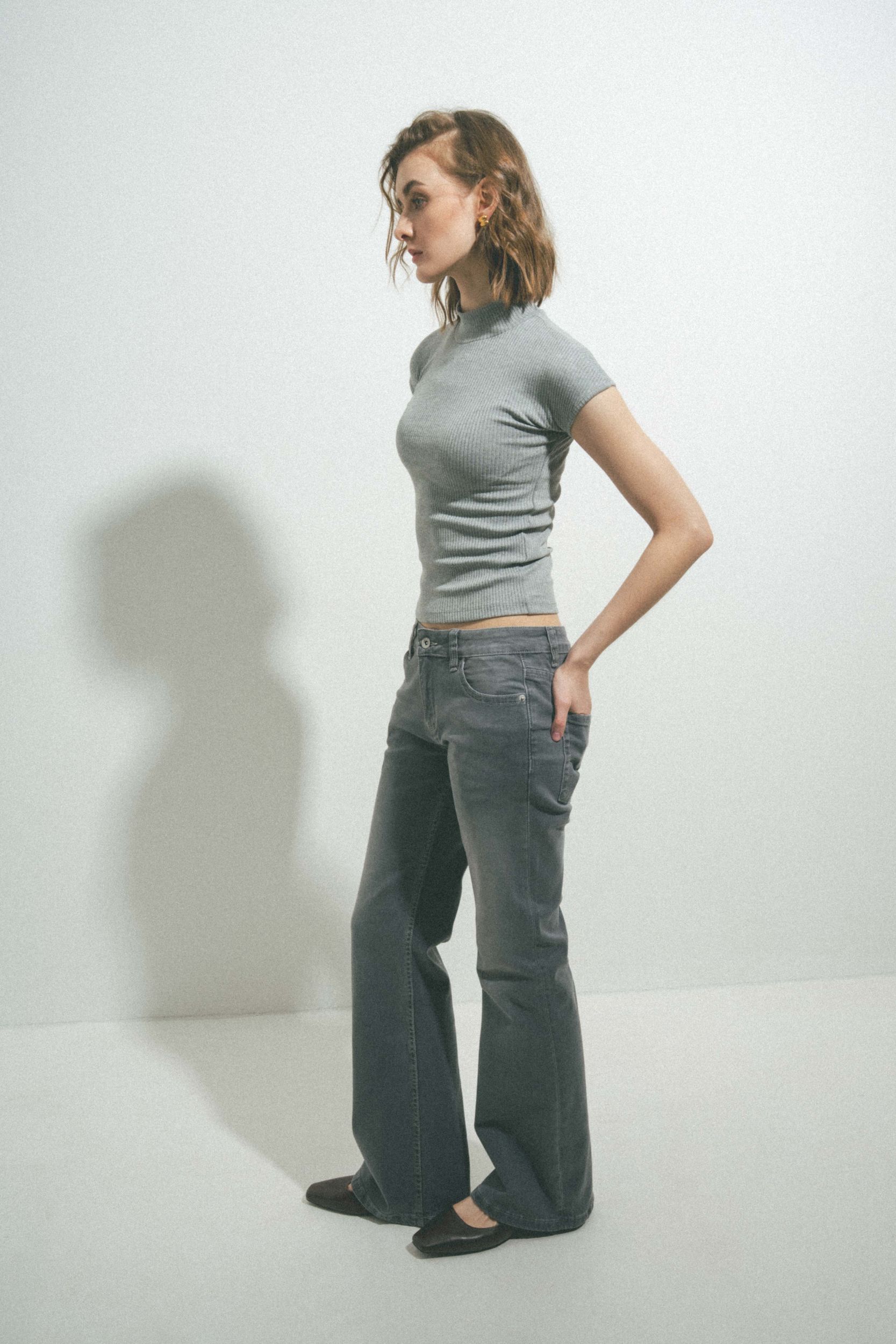 Джинсы клеш с высокой талией, шлевками для ремня и пятью карманами. Застёжка на молнию и металлическую пуговицу спереди.