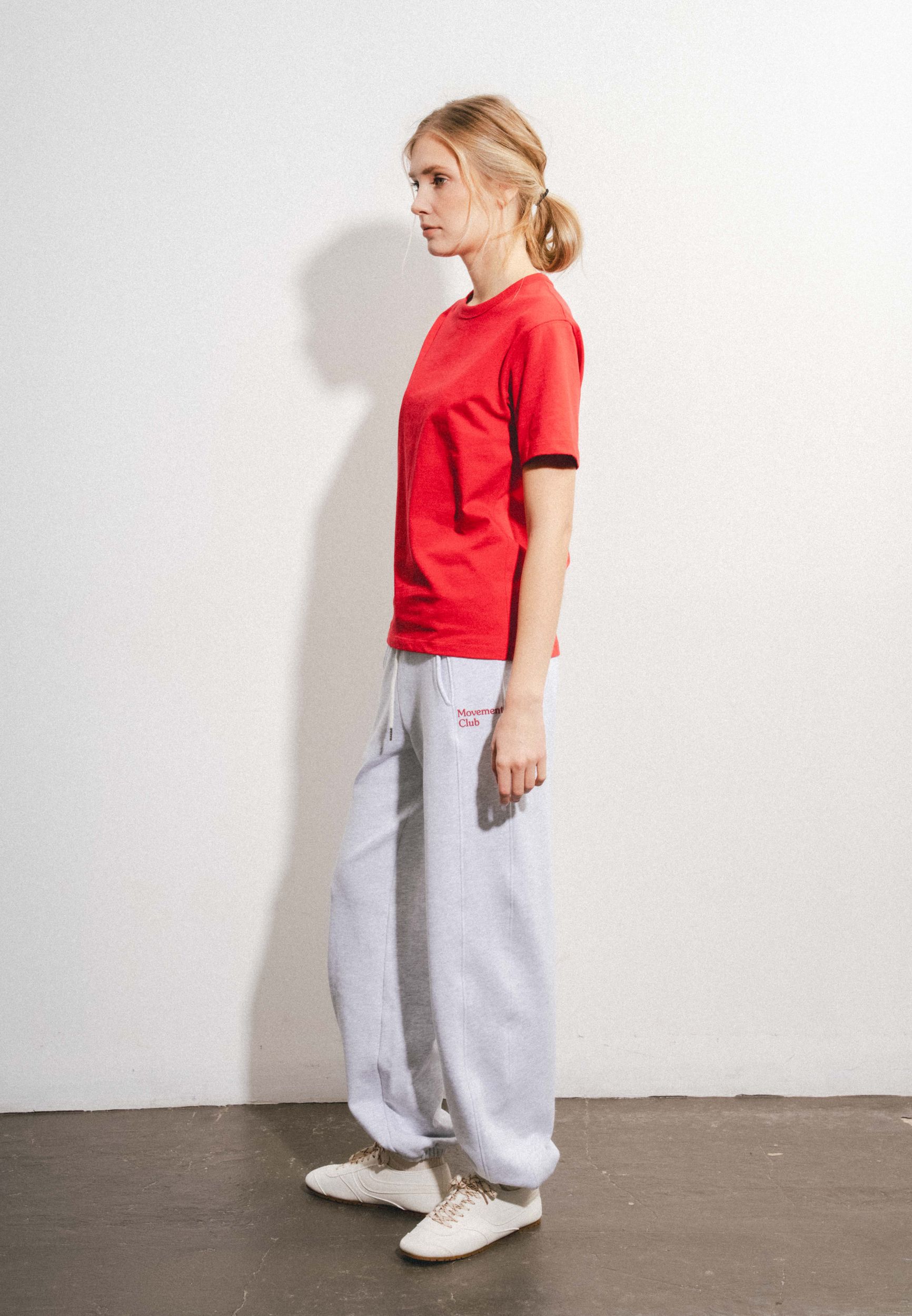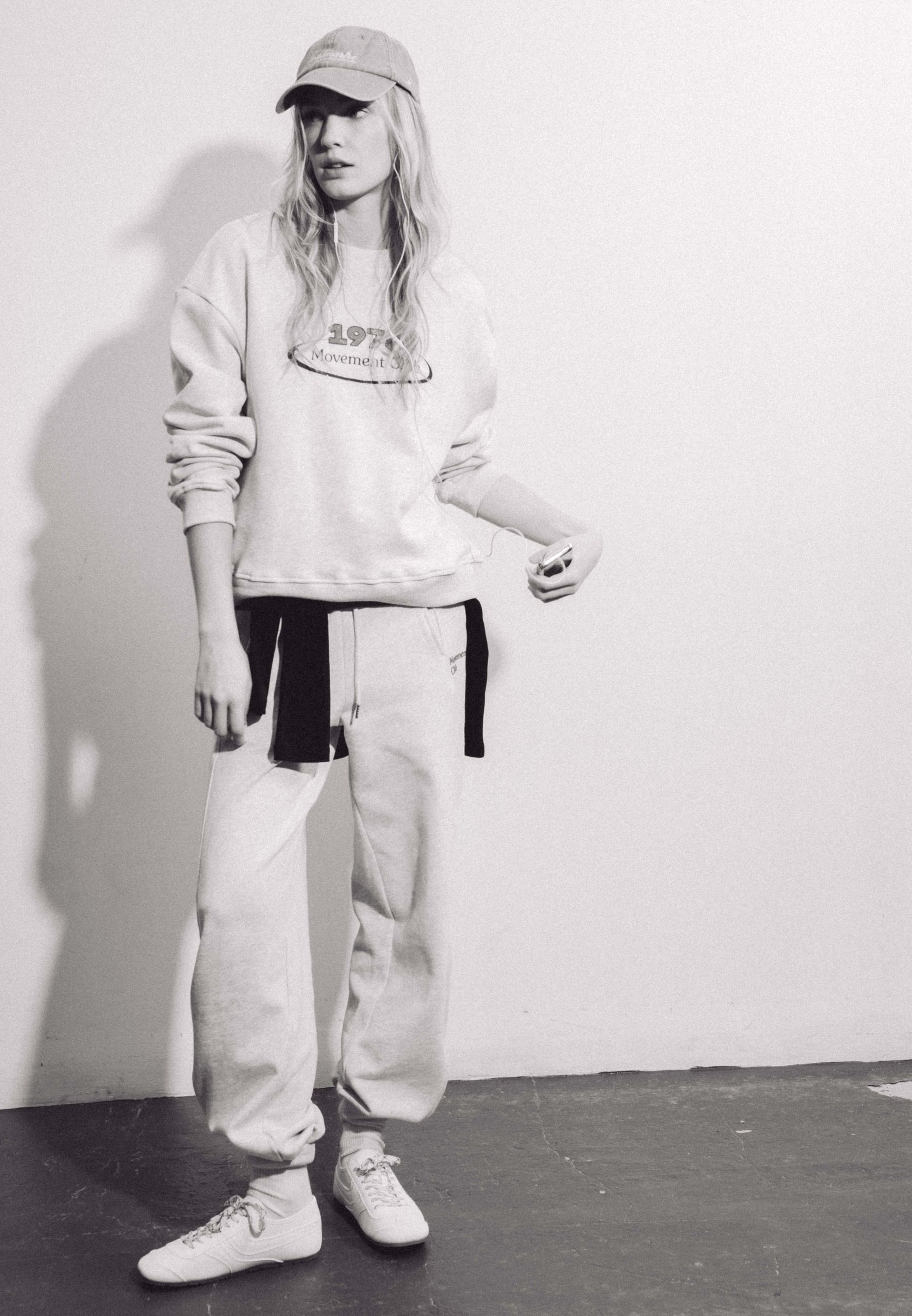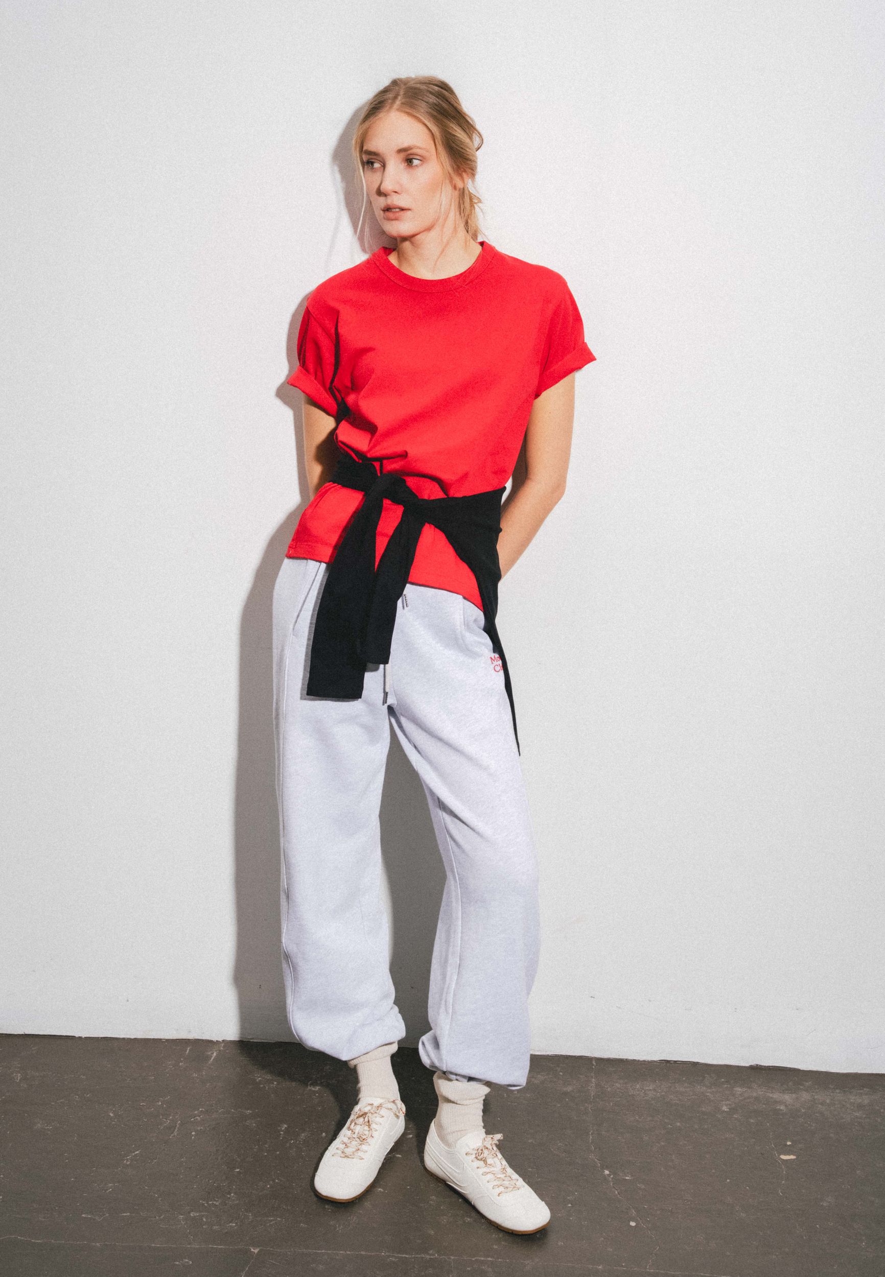 Спортивные брюки с завышенной талией и регулируемым эластичным поясом. Передние карманы. Контрастная текстовая деталь спереди. Эластичные манжеты.