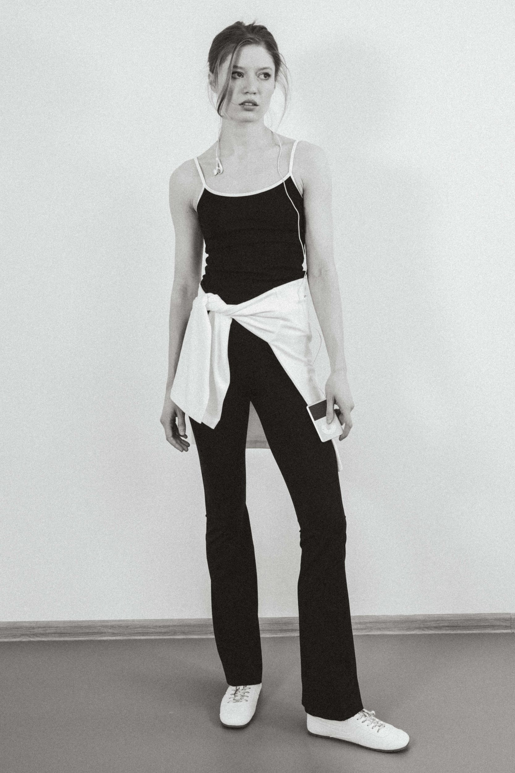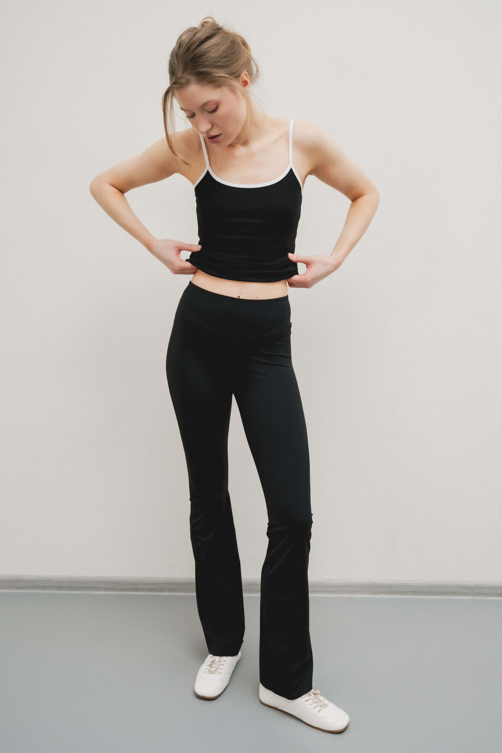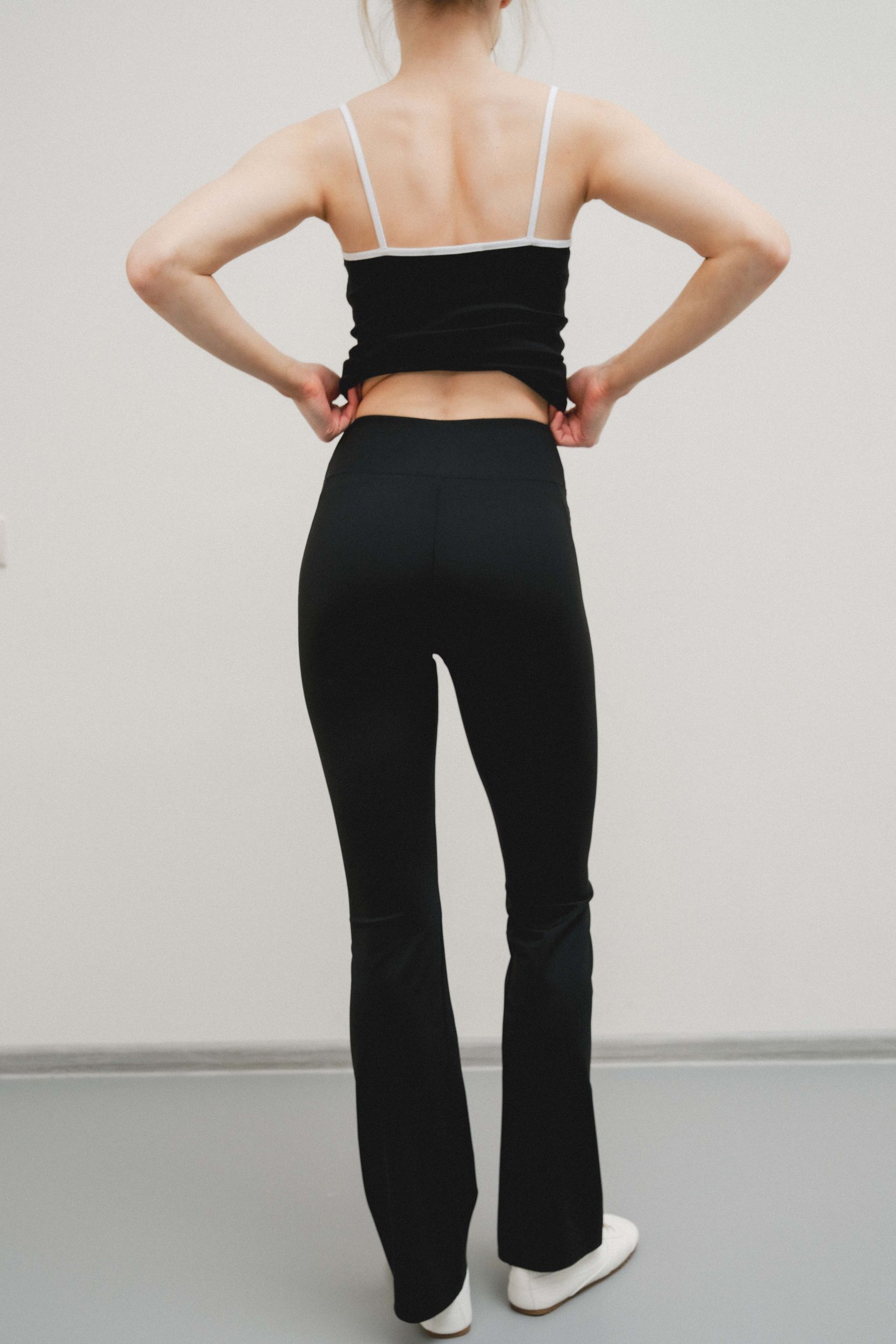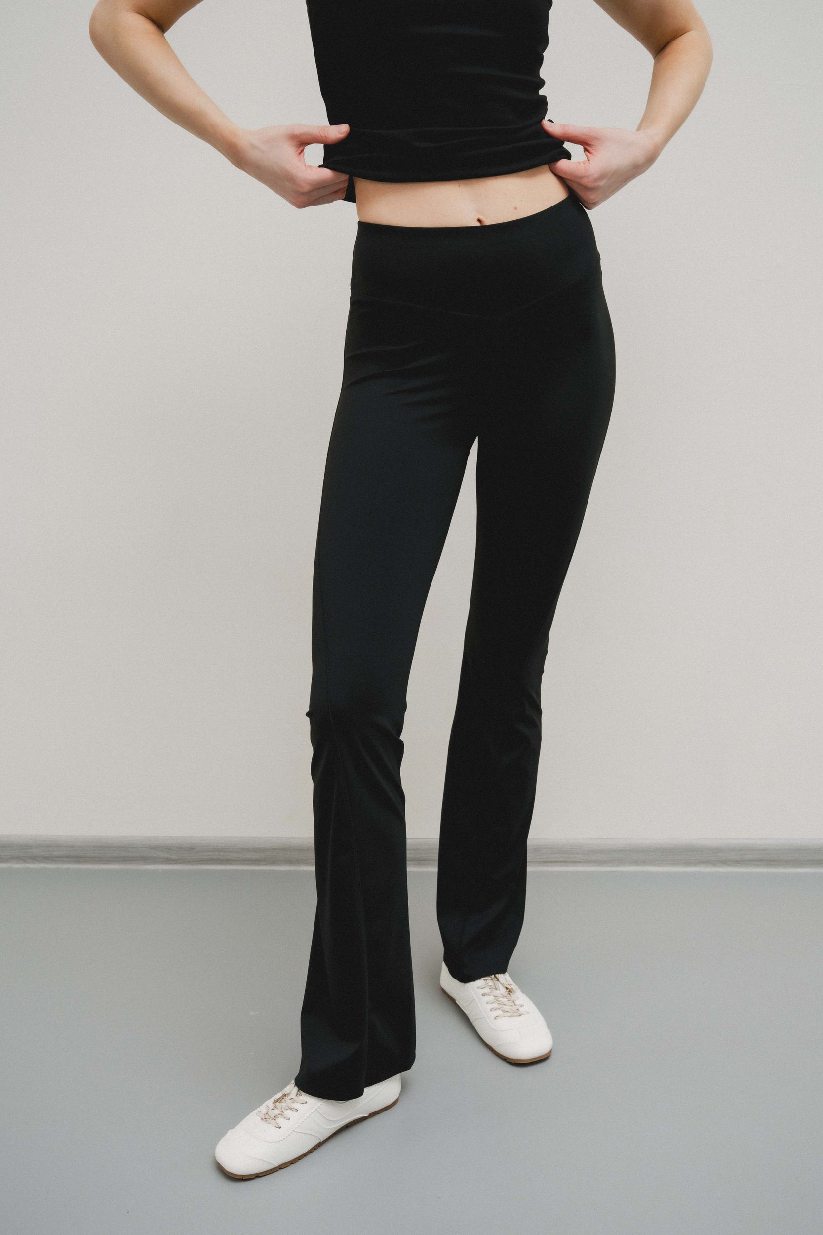 Брюки с высокой талией и эластичным поясом. Расклешенный низ