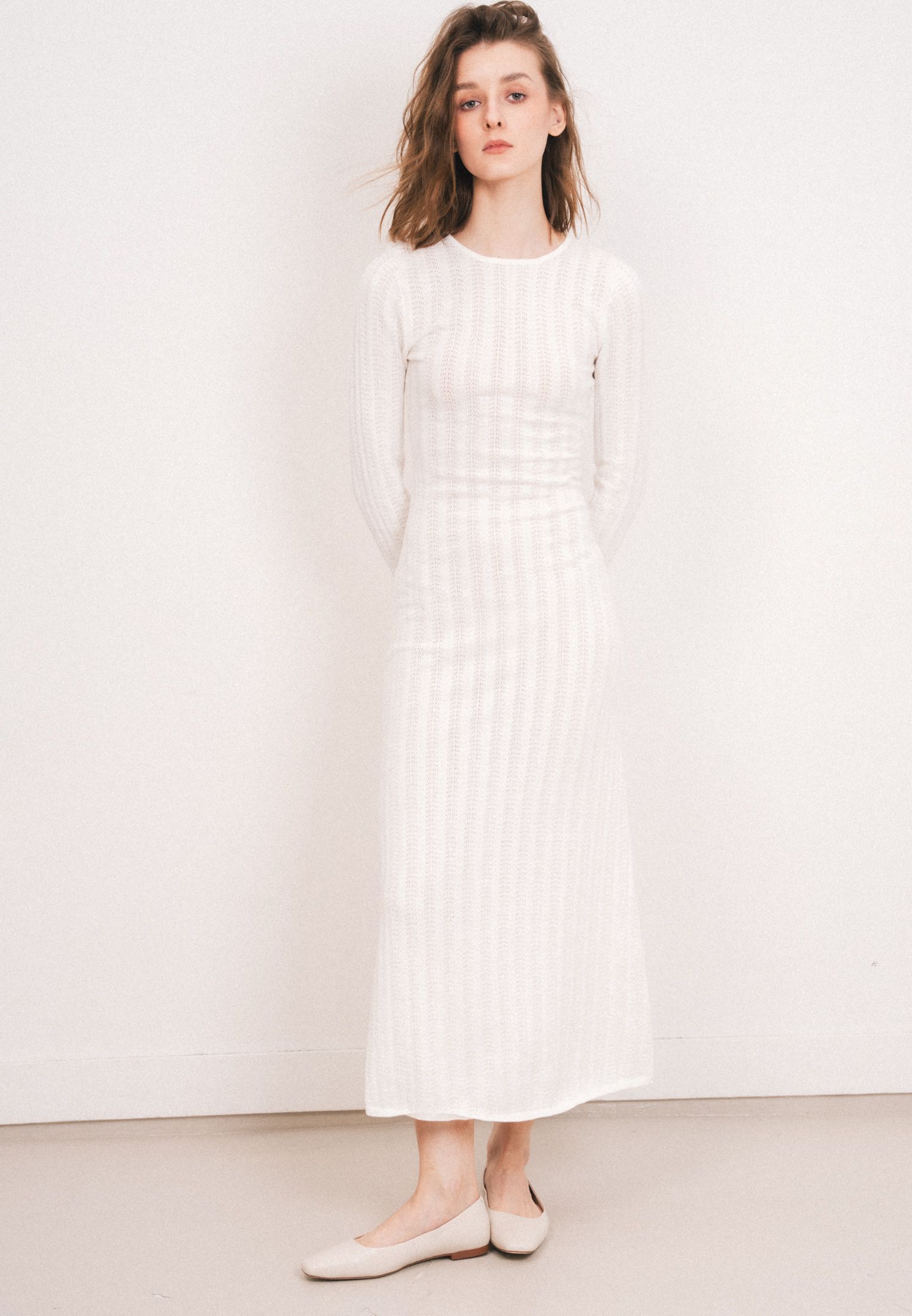 Мягкое, облегающее платье средней длины из мягкого хлопкового трикотажа сетчатой ​​структуры, с изящным вырезом, открывающим плечи, частично открытой спиной и застежкой на одну пуговицу сверху. Имеет длинные рукава со слегка расклешенными манжетами и подолом.