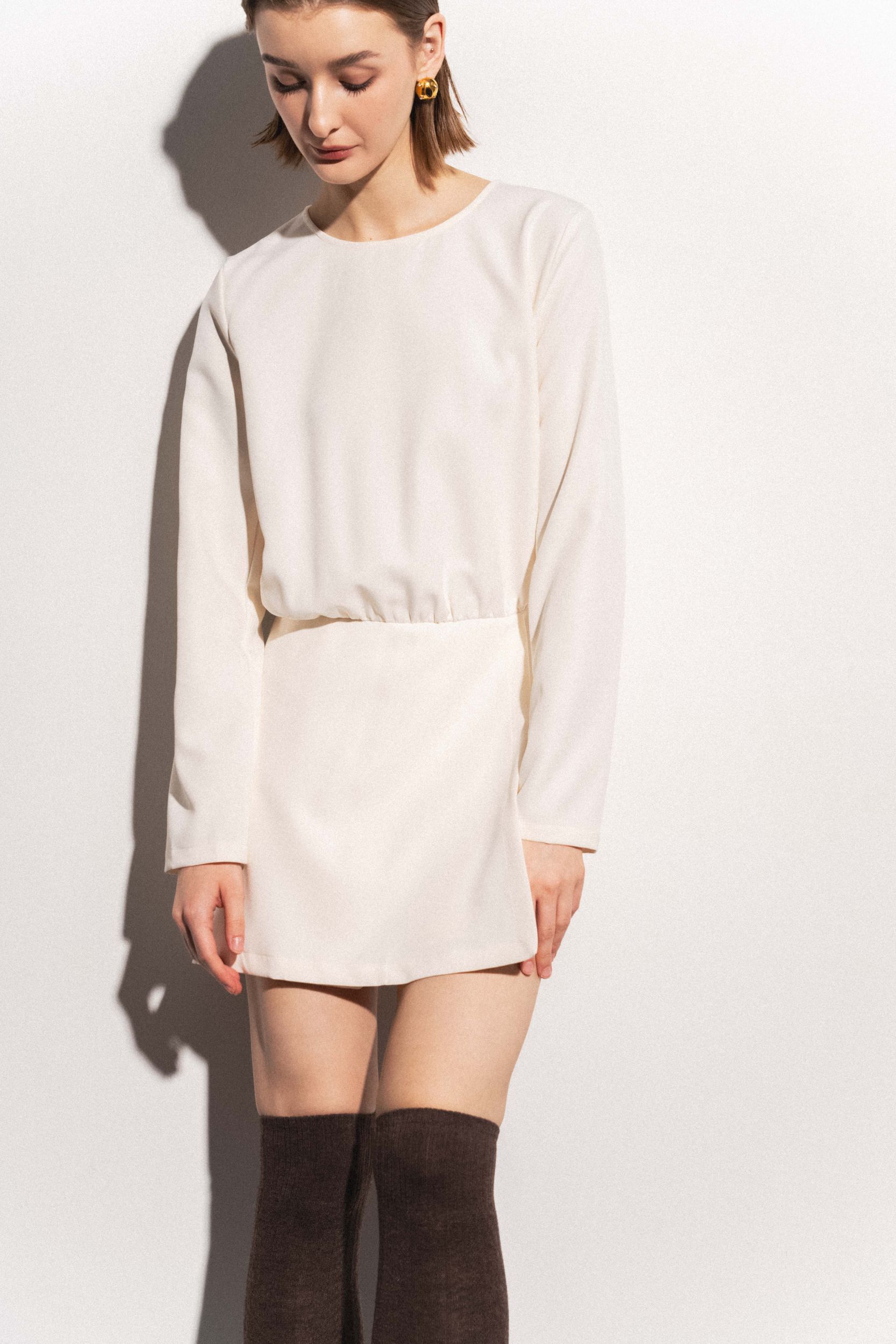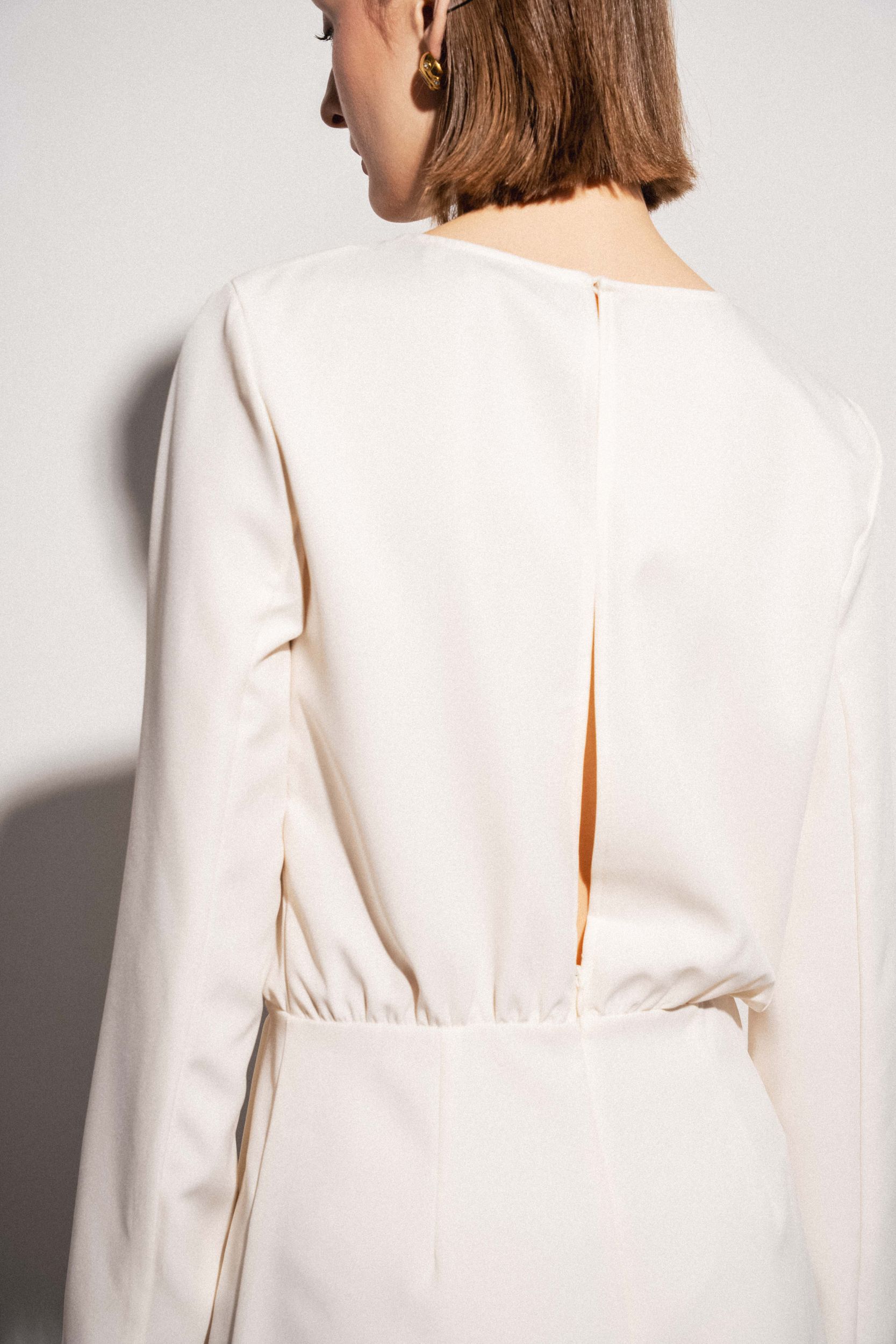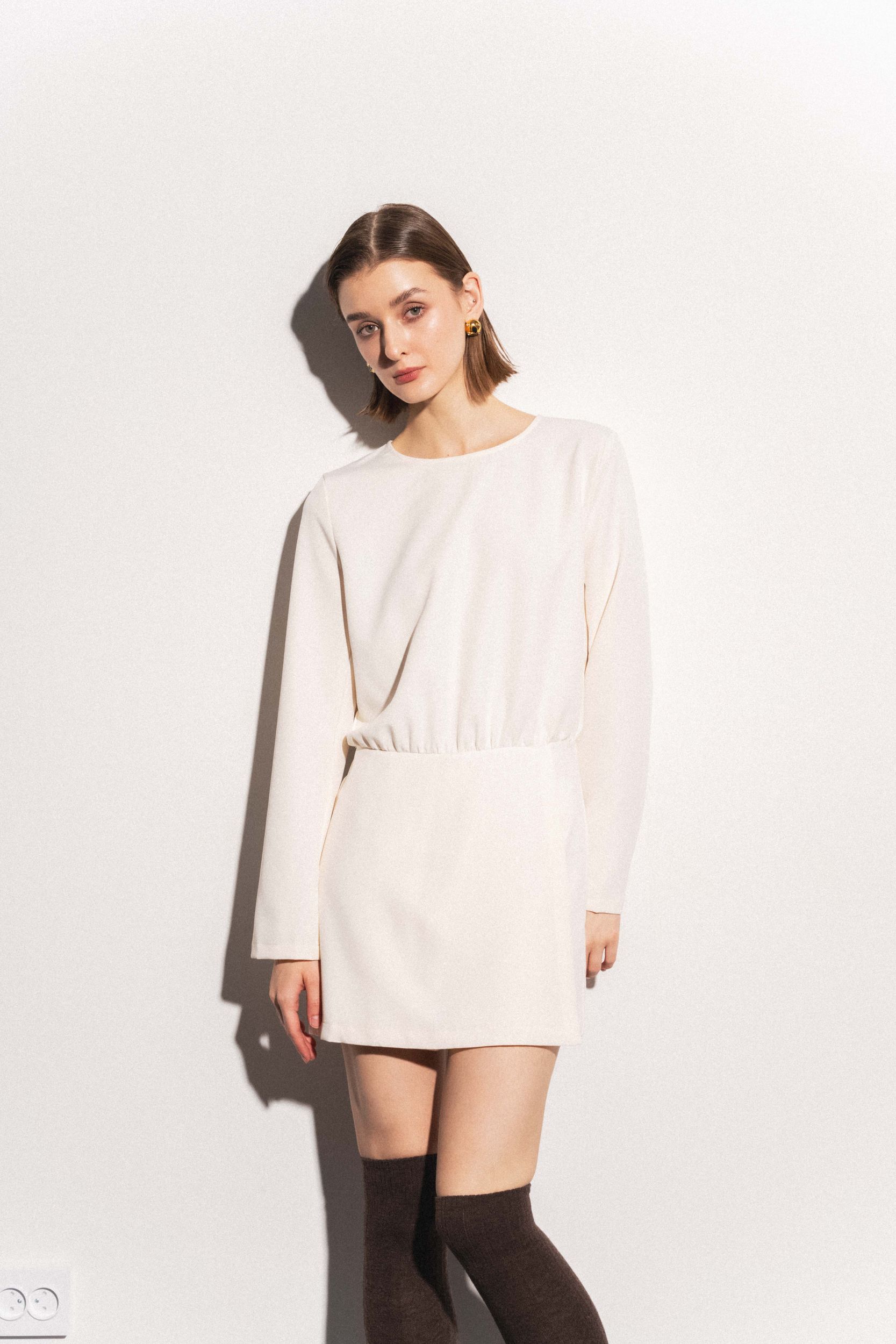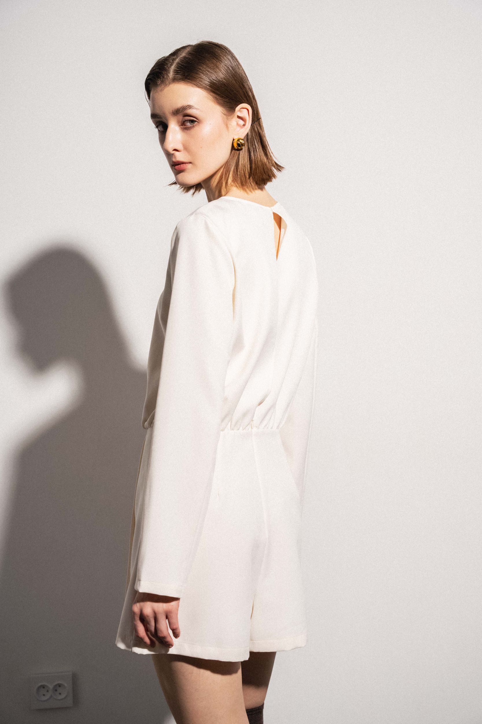 Короткое платье с круглым вырезом горловины и длинными рукавами. Перекрещивающаяся передняя часть. Застежка на потайную молнию сзади с отверстием и потайной пуговицей.