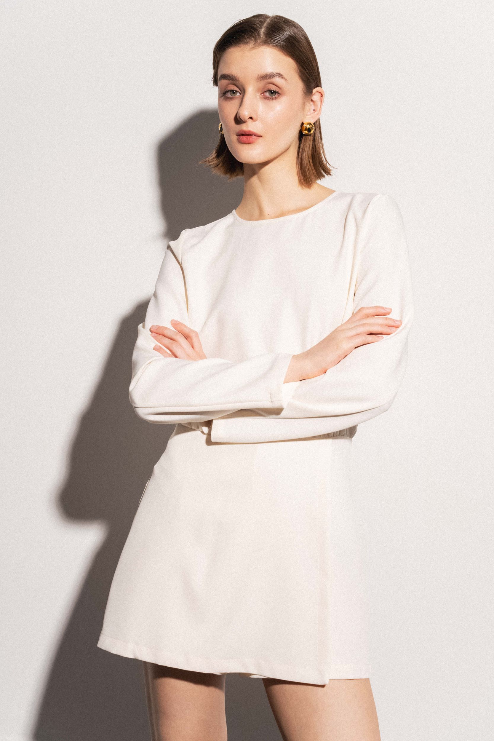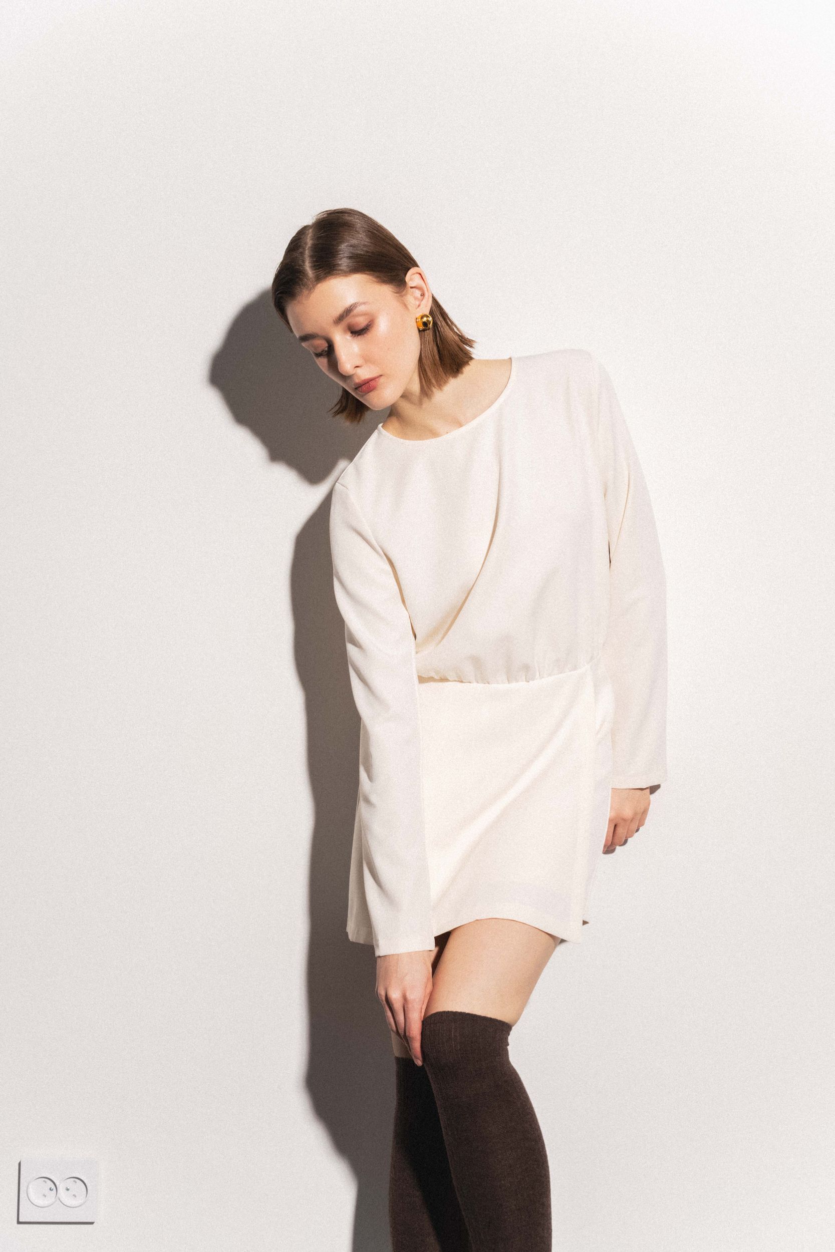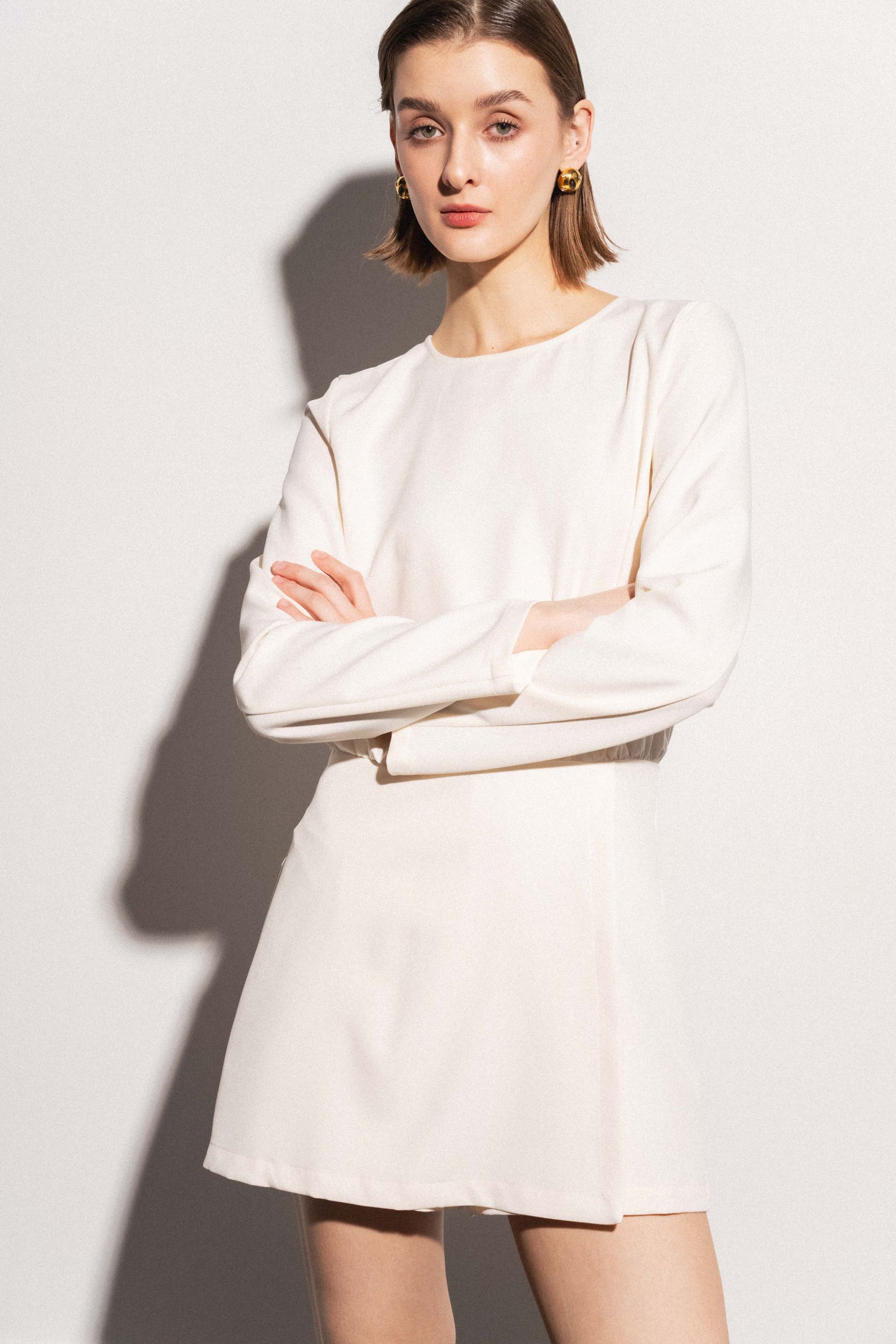 Короткое платье с круглым вырезом горловины и длинными рукавами. Перекрещивающаяся передняя часть. Застежка на потайную молнию сзади с отверстием и потайной пуговицей.