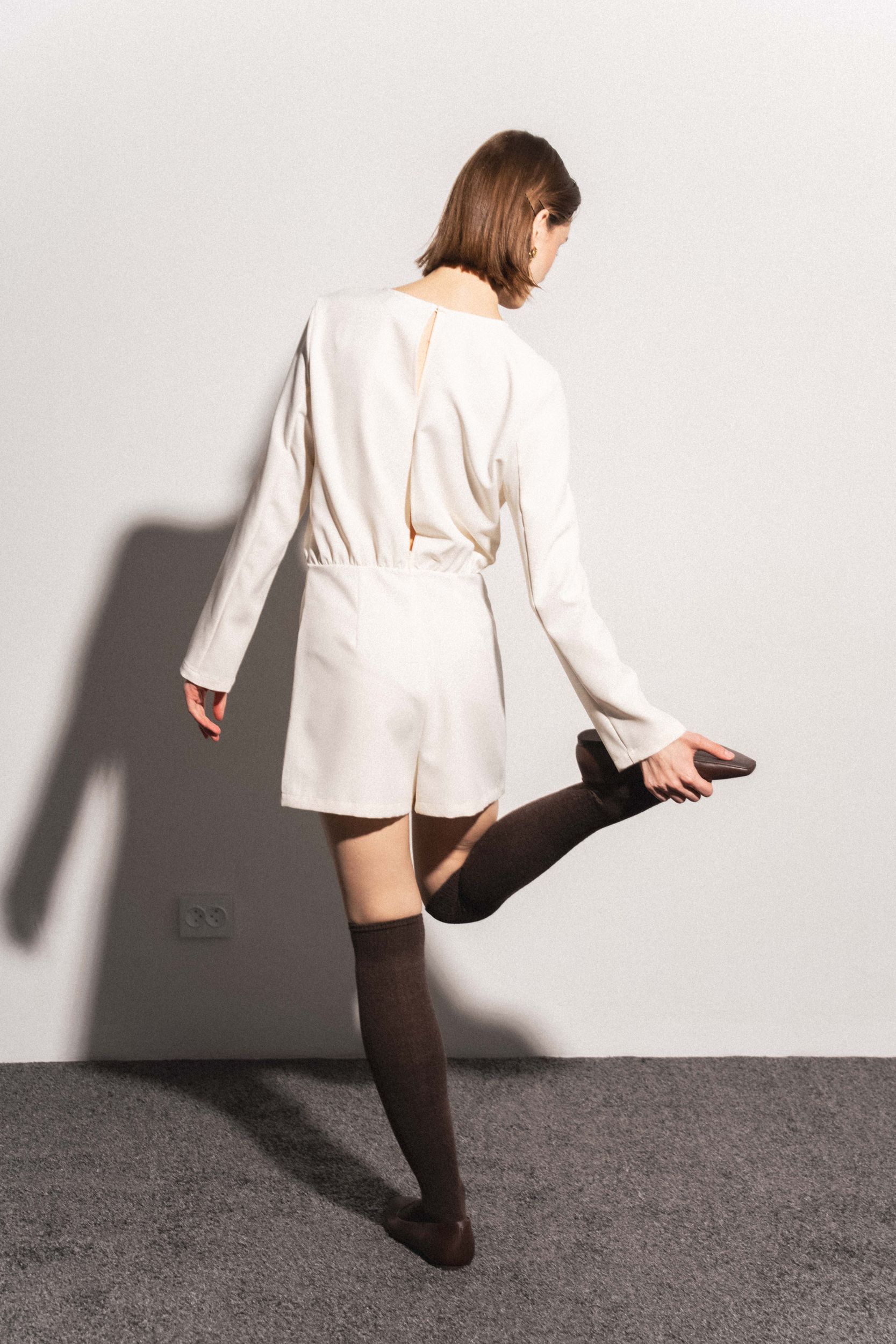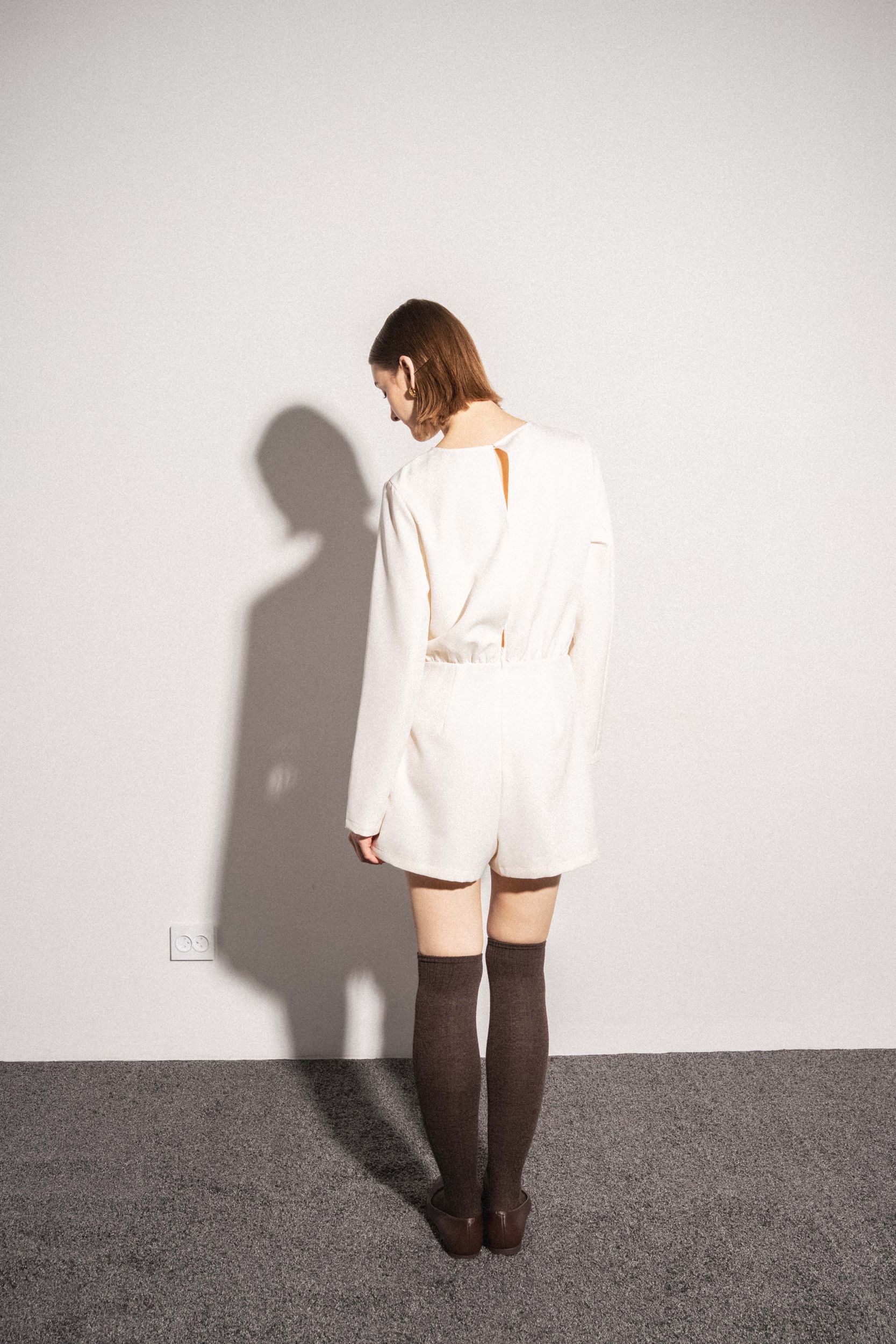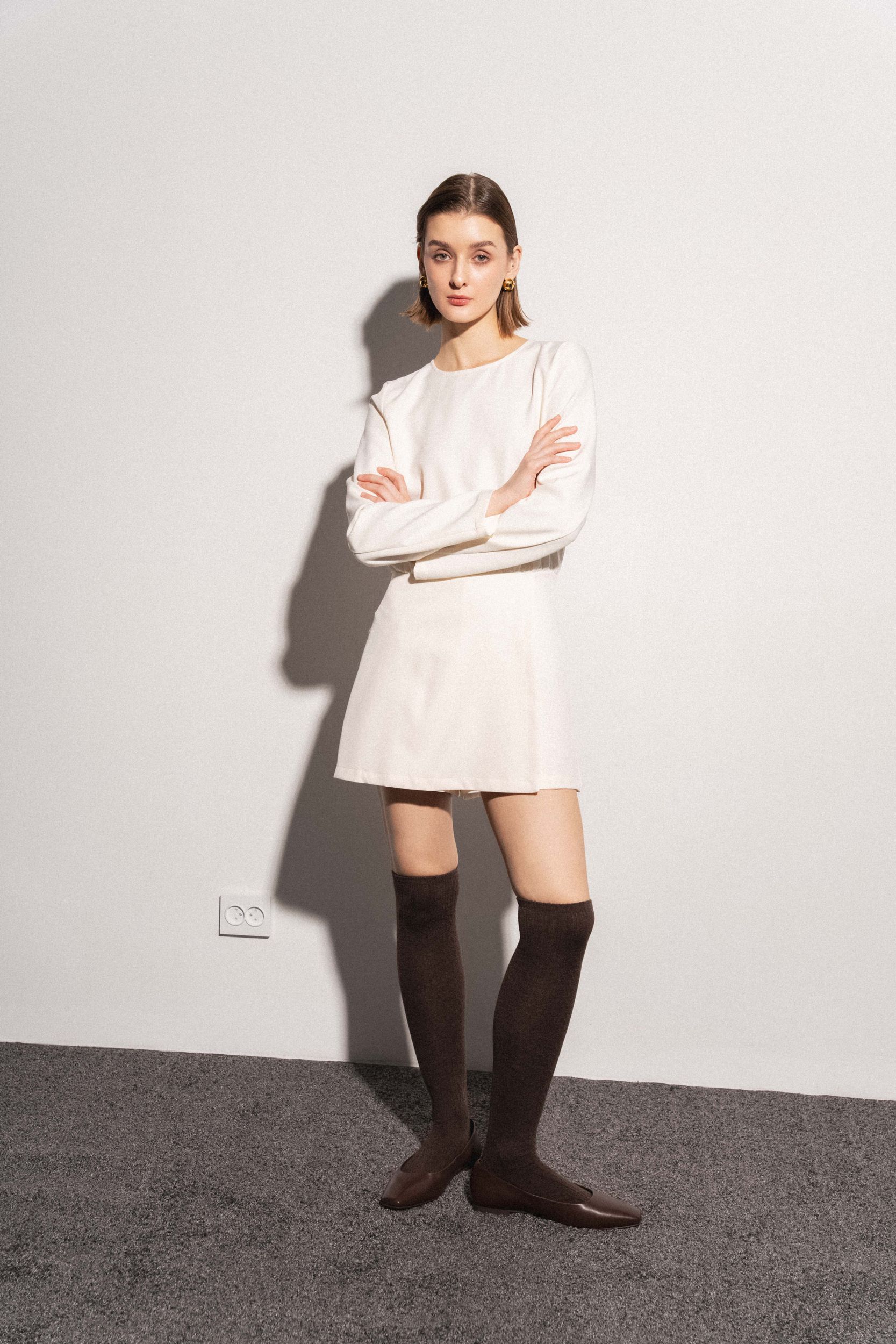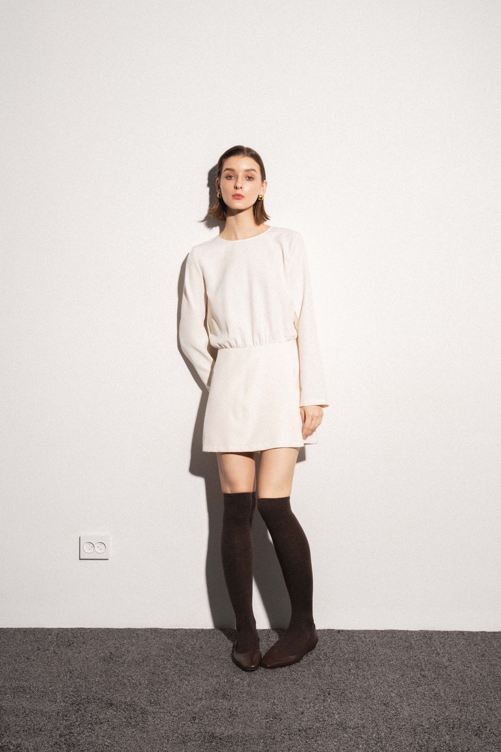 Короткое платье с круглым вырезом горловины и длинными рукавами. Перекрещивающаяся передняя часть. Застежка на потайную молнию сзади с отверстием и потайной пуговицей.