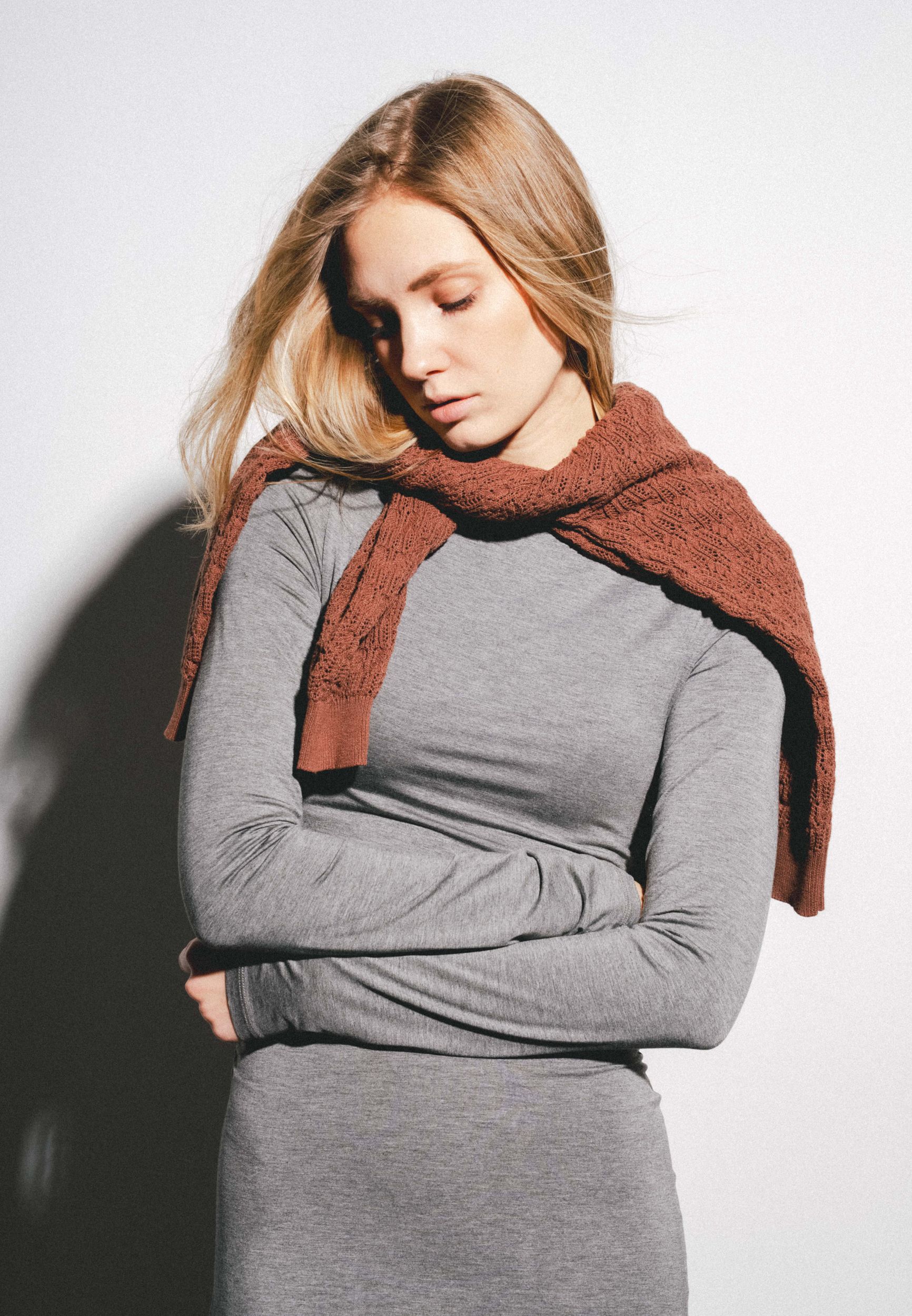 Приталенное платье длиной до икр из вискозного трикотажа с вырезом лодочкой и длинными рукавами. Сборки по бокам на талии создают эффект легкой драпировки.