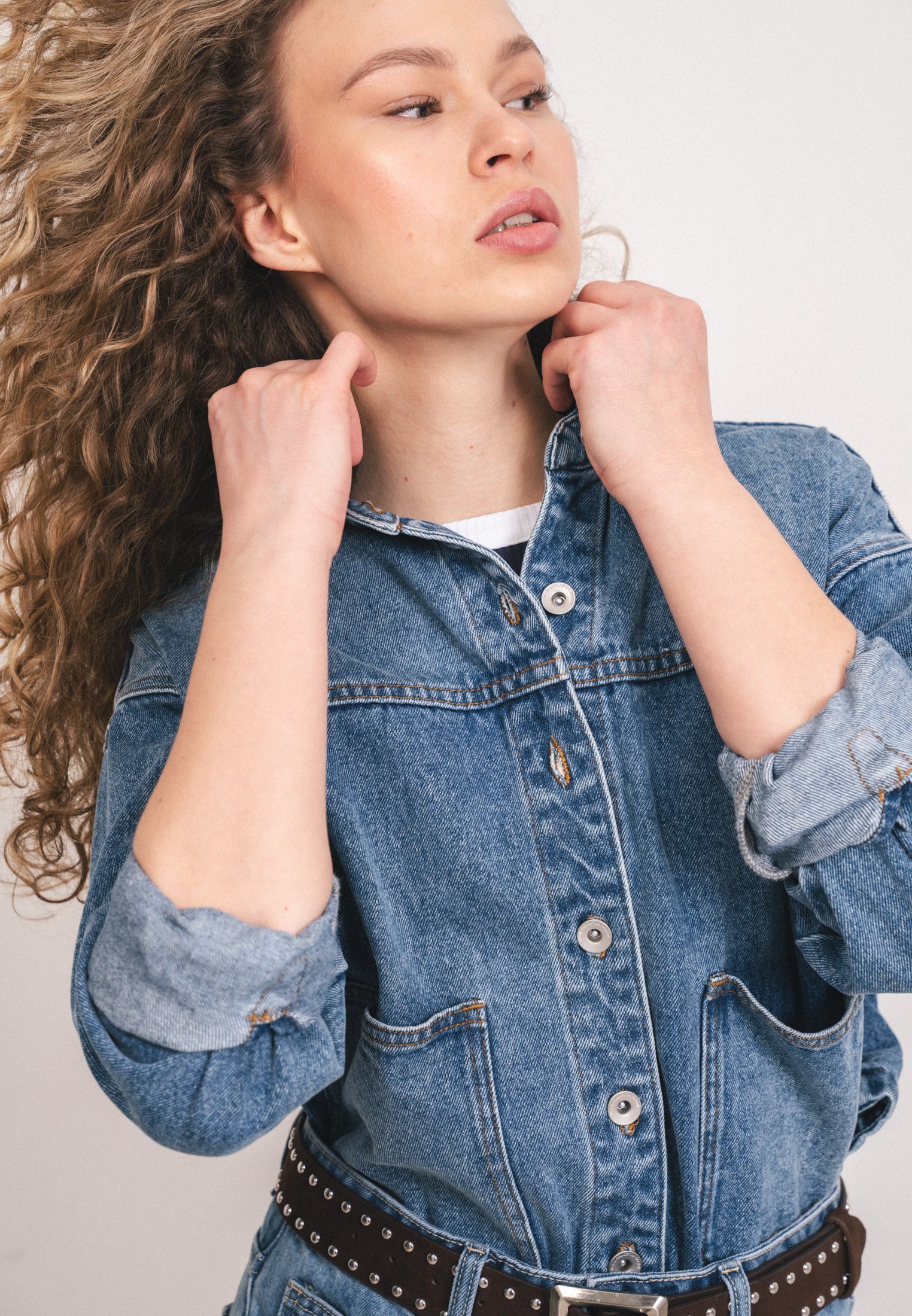 Куртка с отложным воротником, длинными рукавами. Накладные карманы спереди. Застёжка на металлические пуговицы спереди.