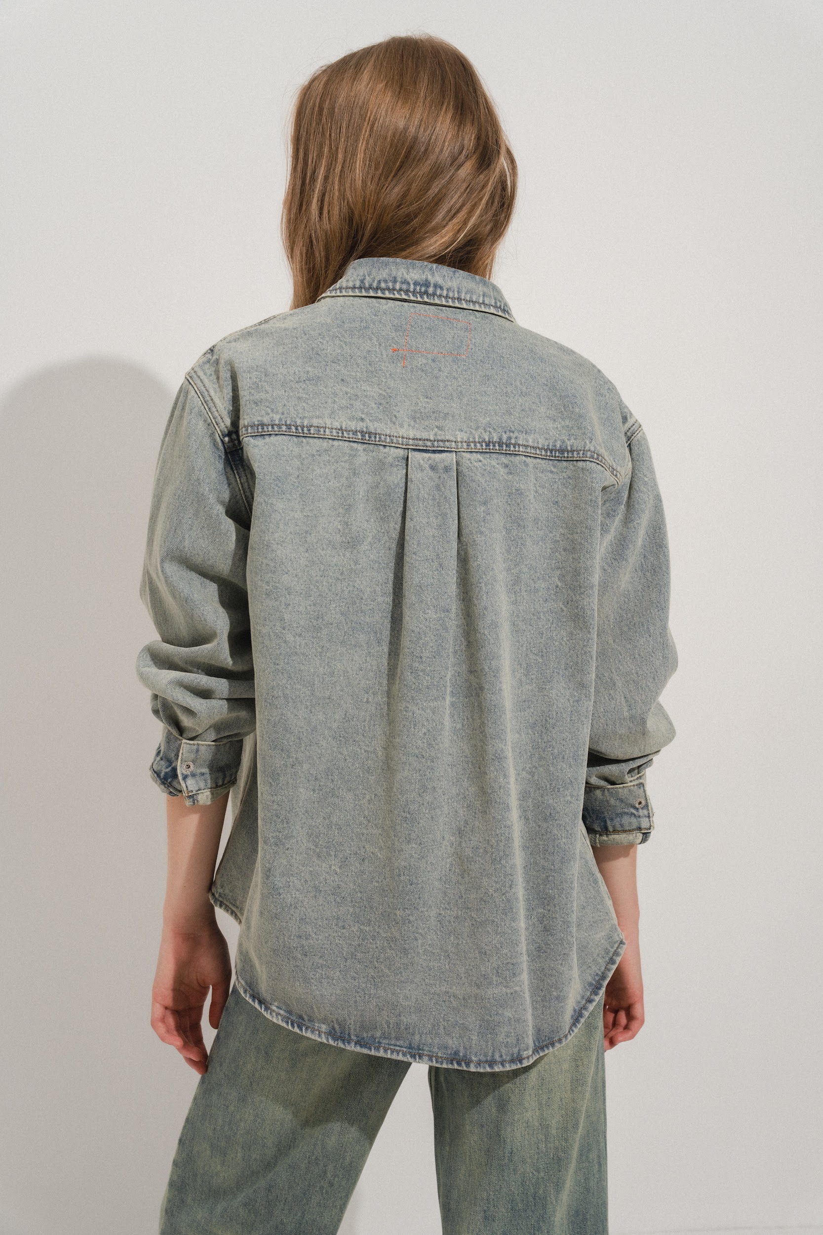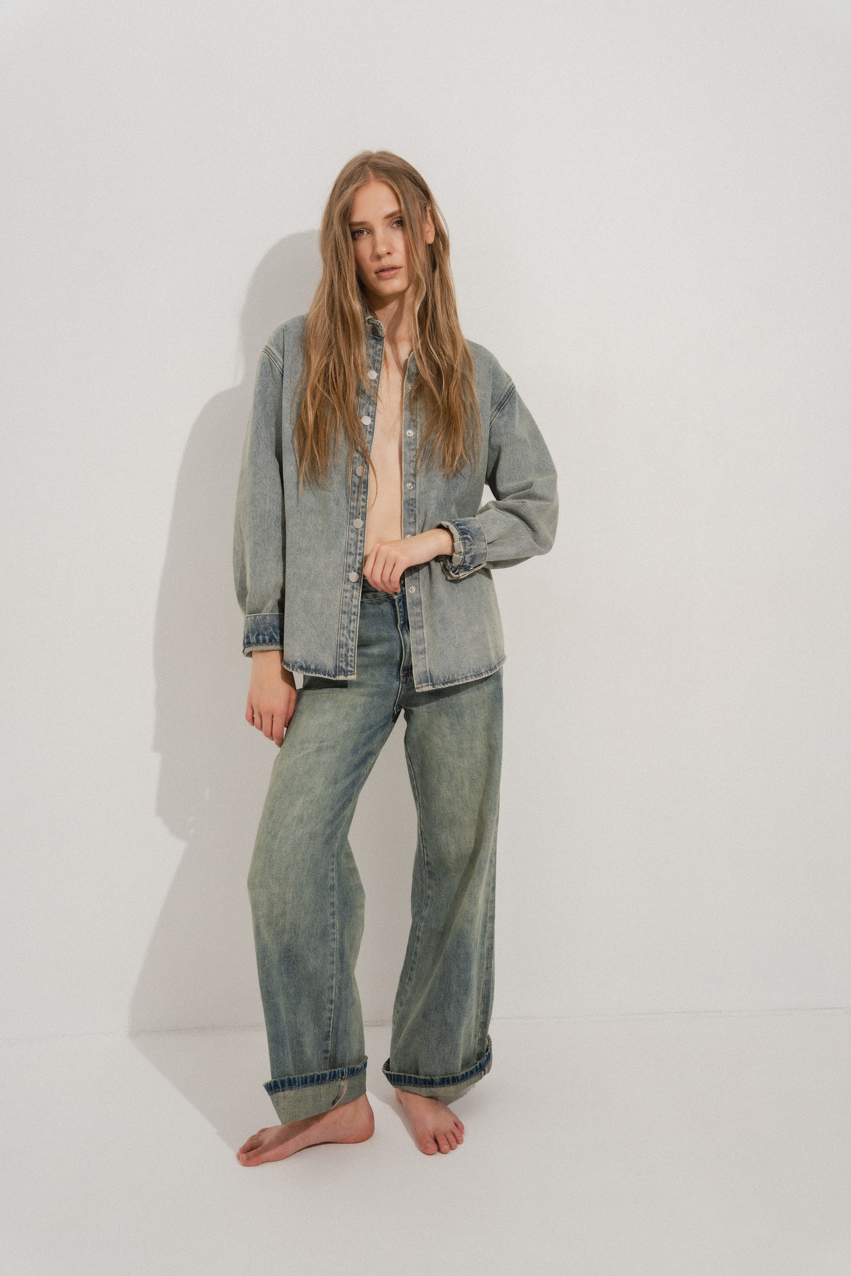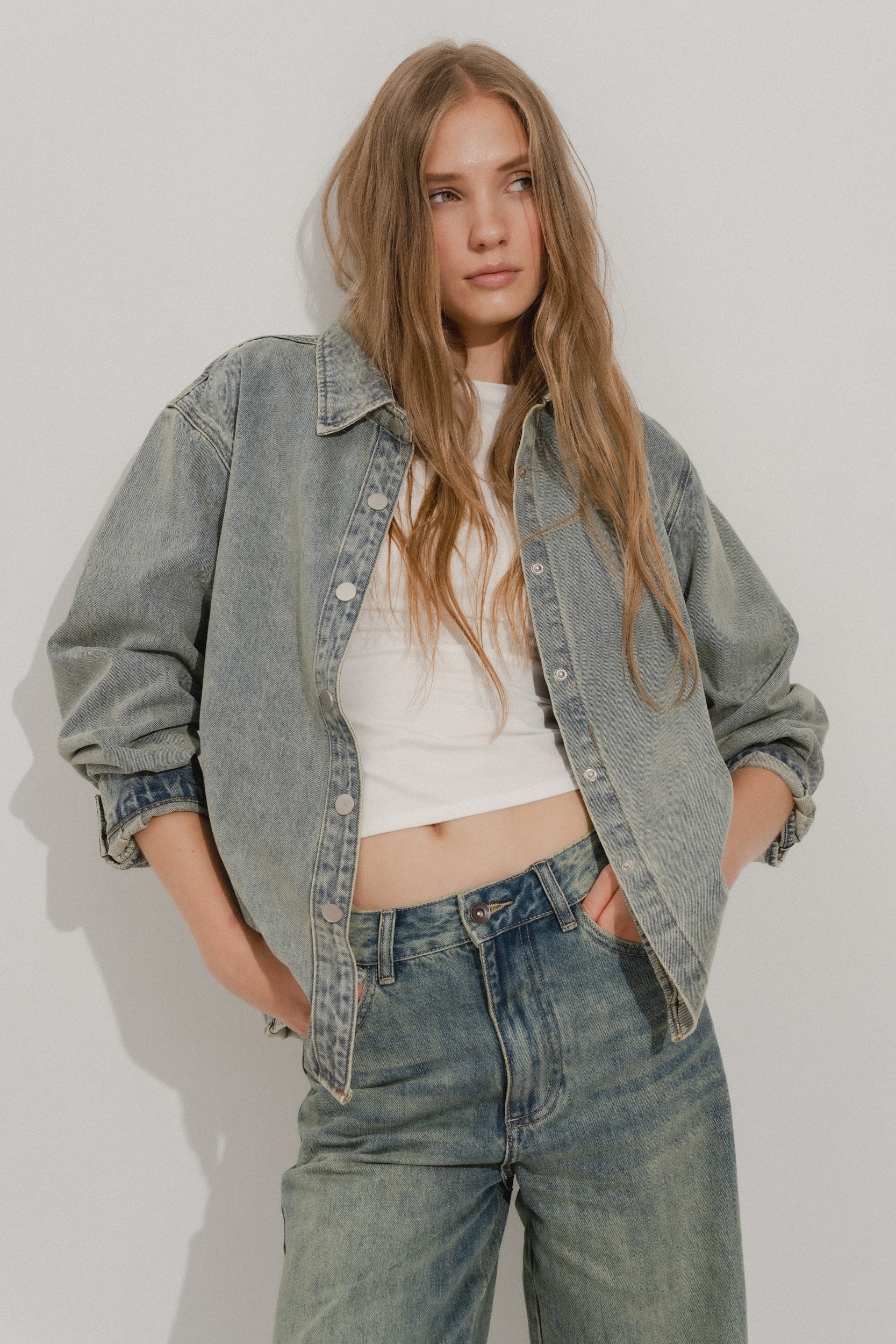 Рубашка свободного кроя из хлопкового денима. Отложной воротник. Эффект потертости. Застежка на металлические заклепки.