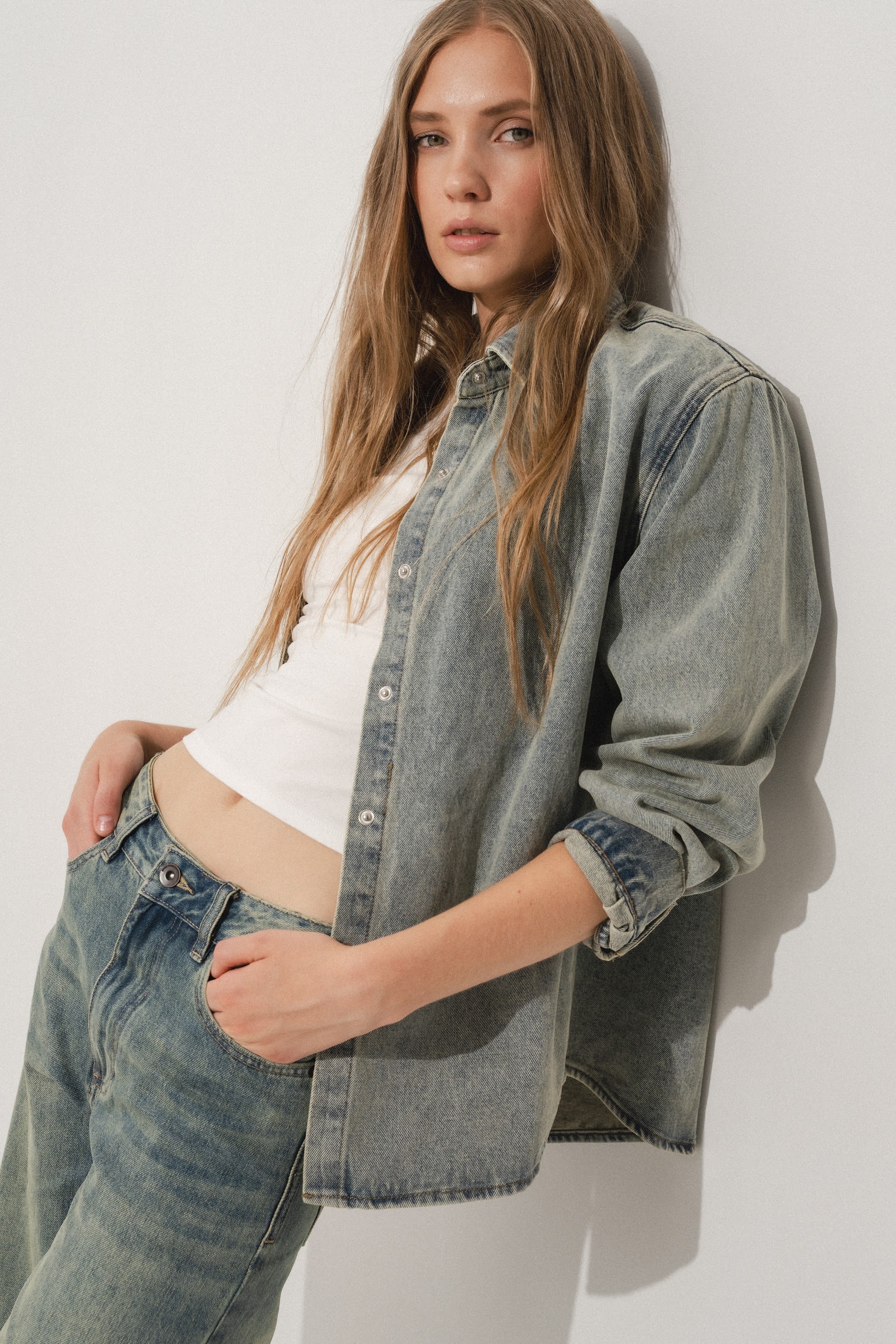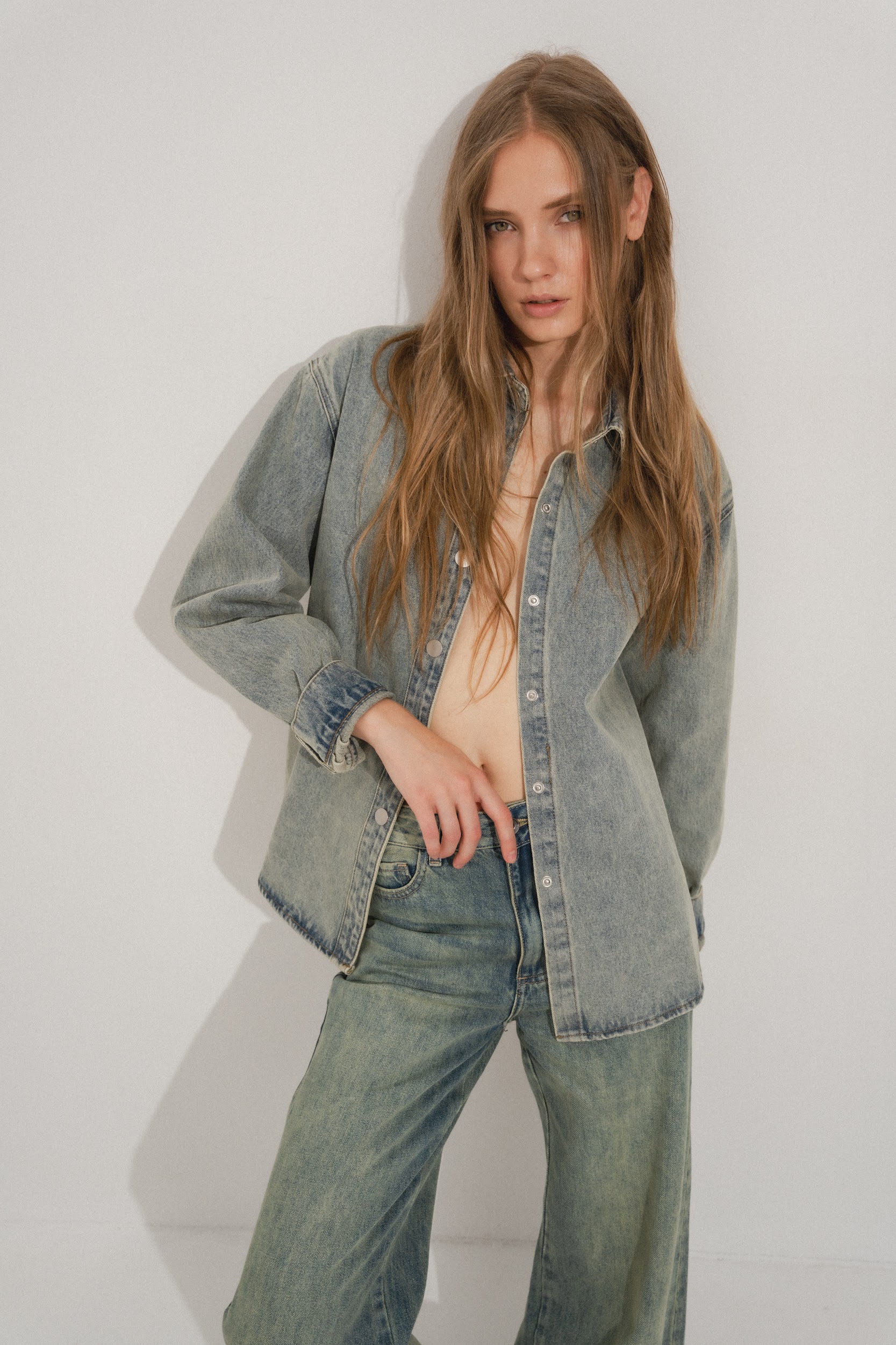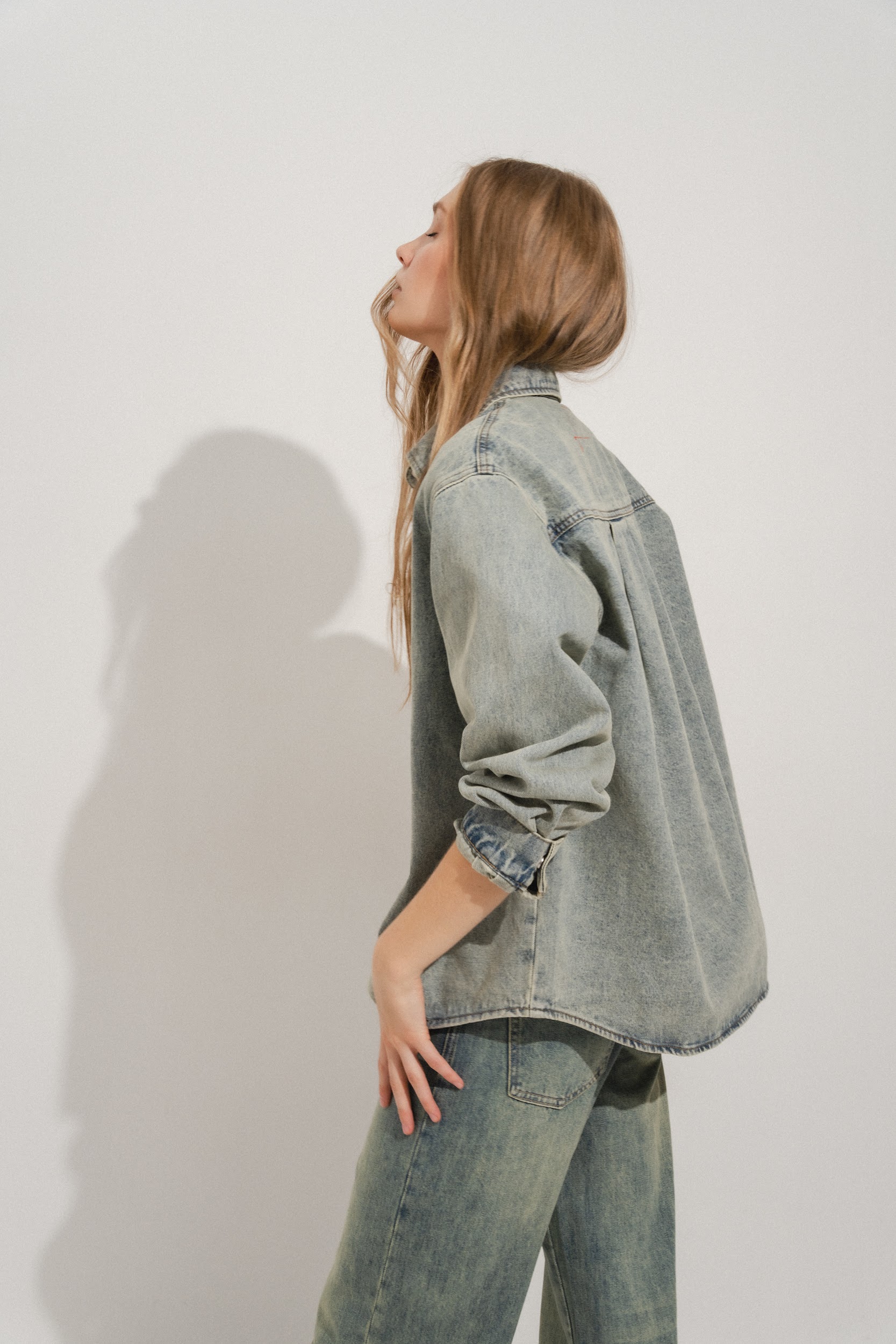 Рубашка свободного кроя из хлопкового денима. Отложной воротник. Эффект потертости. Застежка на металлические заклепки.