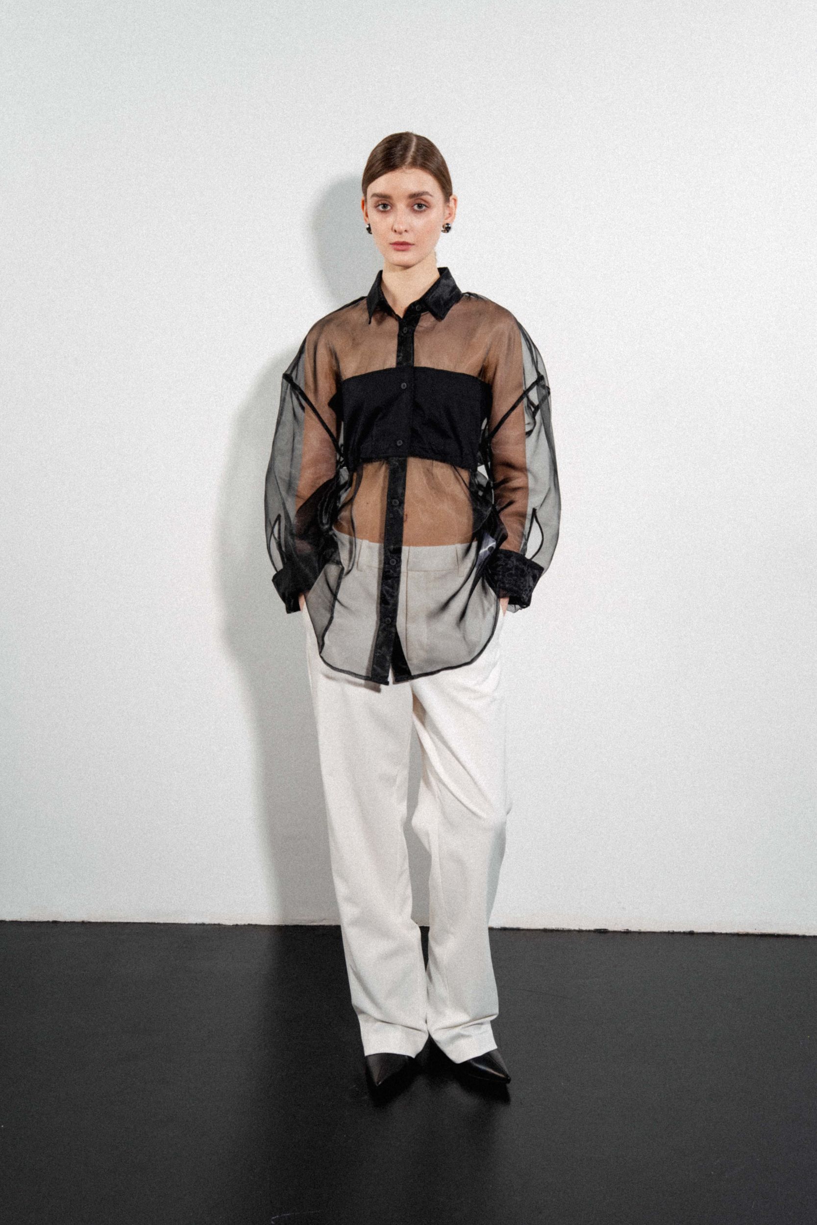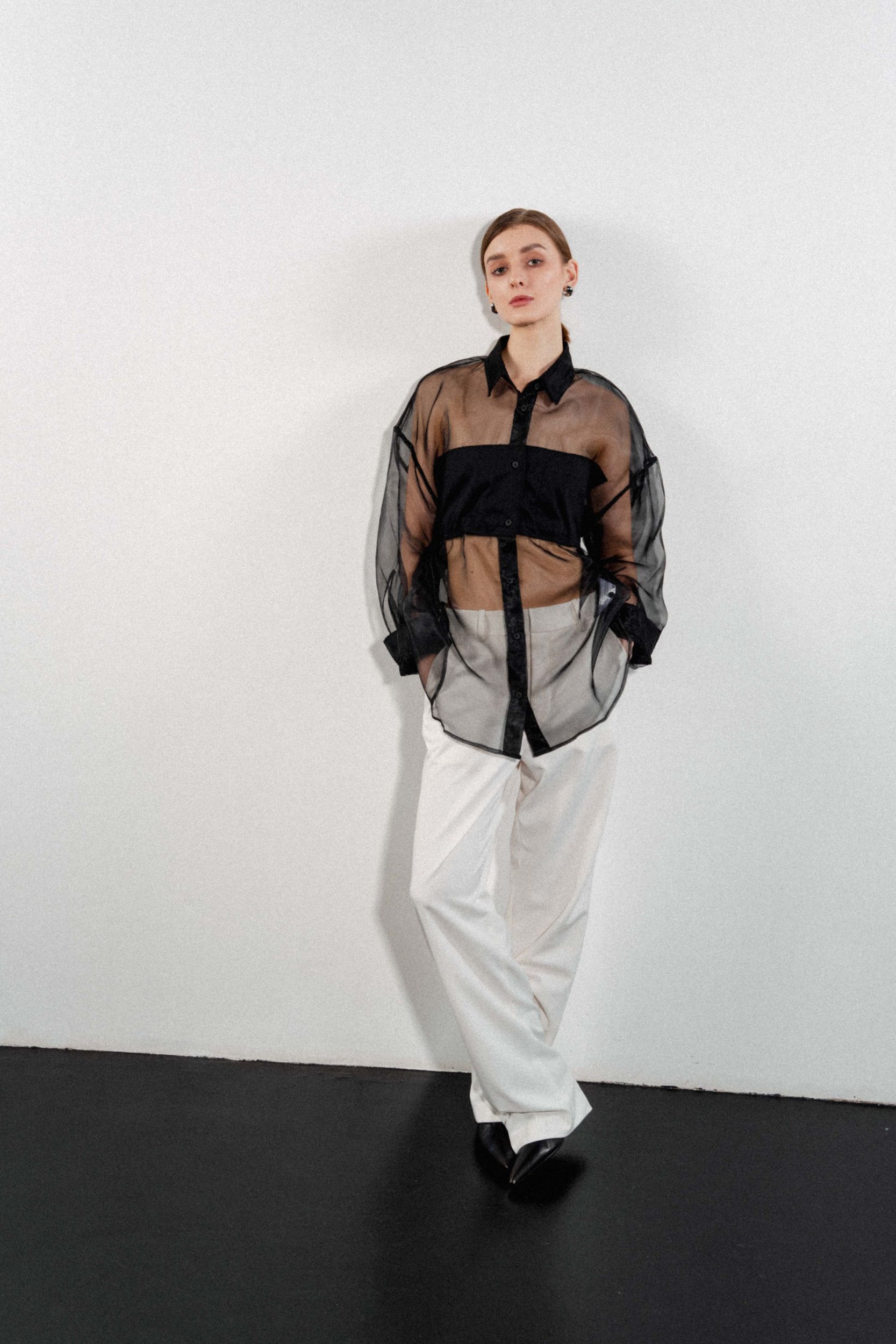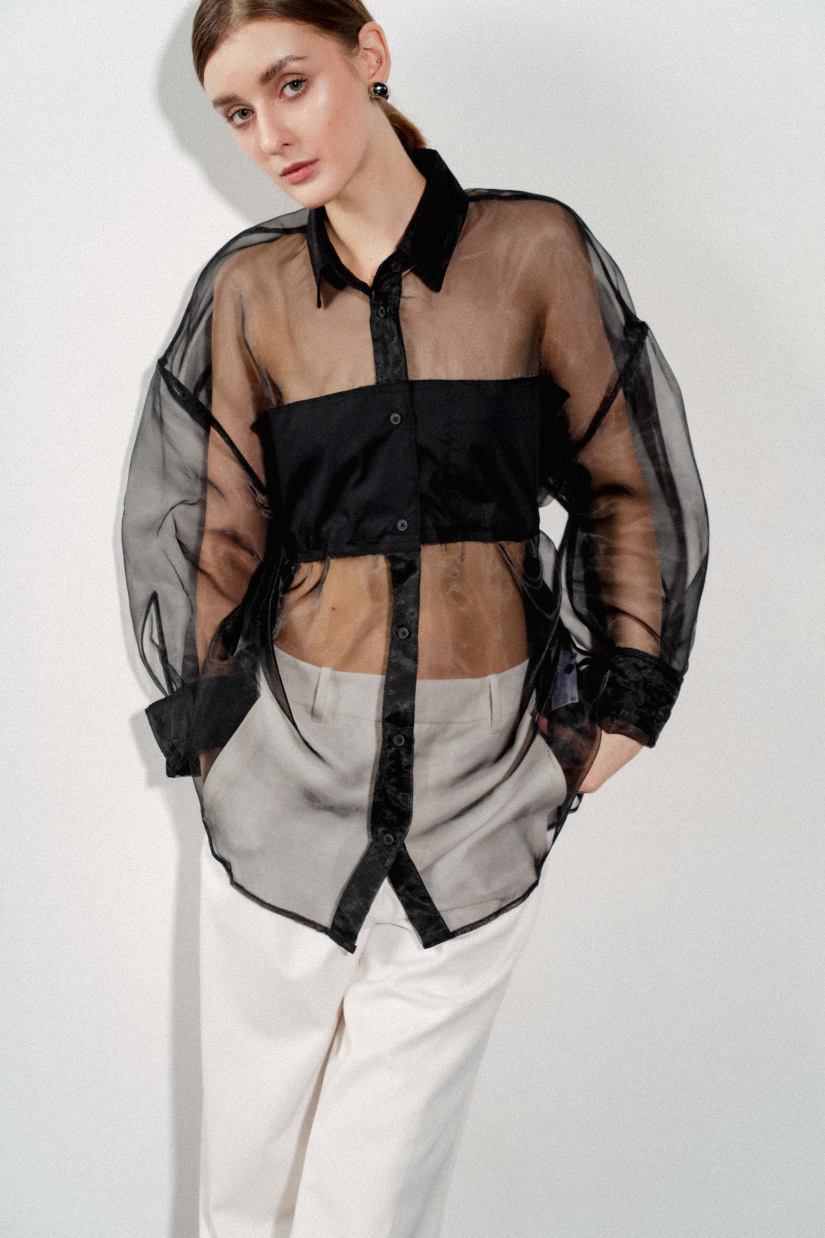 Прозрачная рубашка из органзы с длинным рукавом. Прямой силуэт. Нагрудные карманы. Отложной воротник