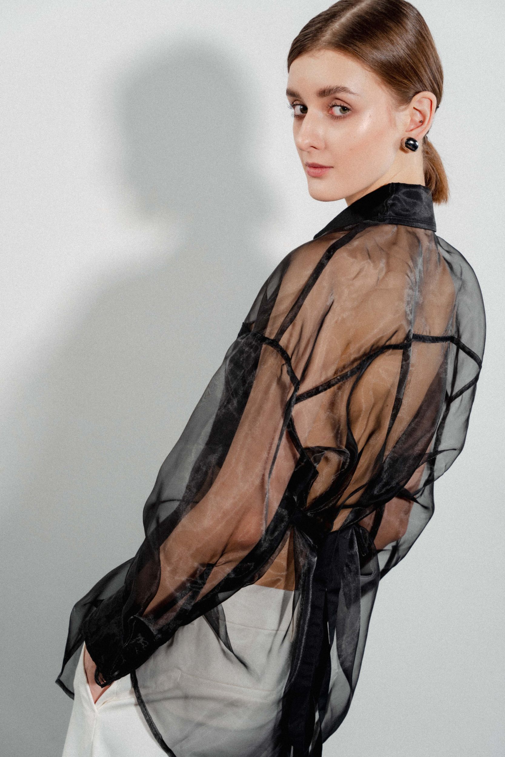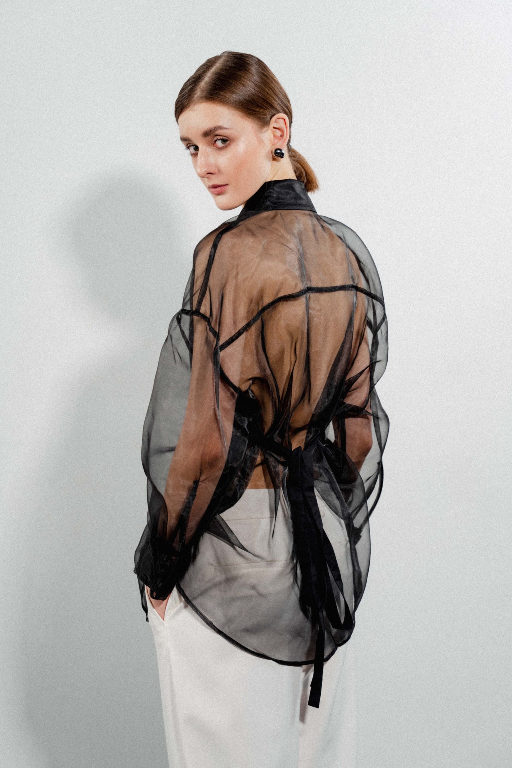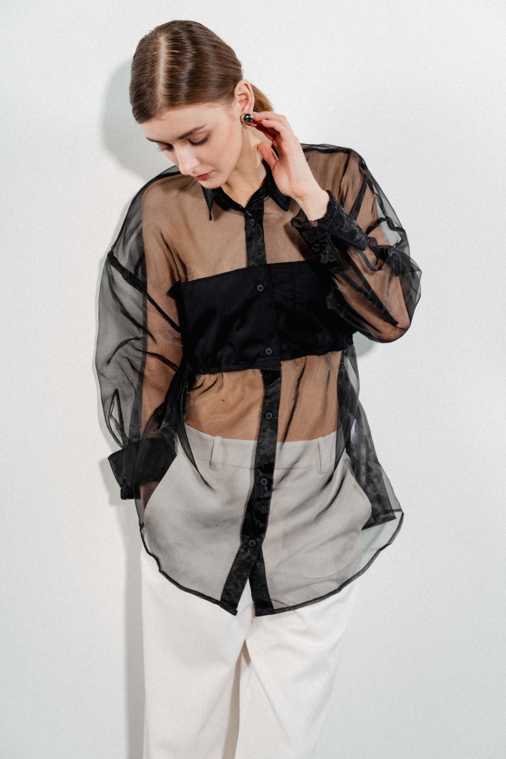Прозрачная рубашка из органзы с длинным рукавом. Прямой силуэт. Нагрудные карманы. Отложной воротник