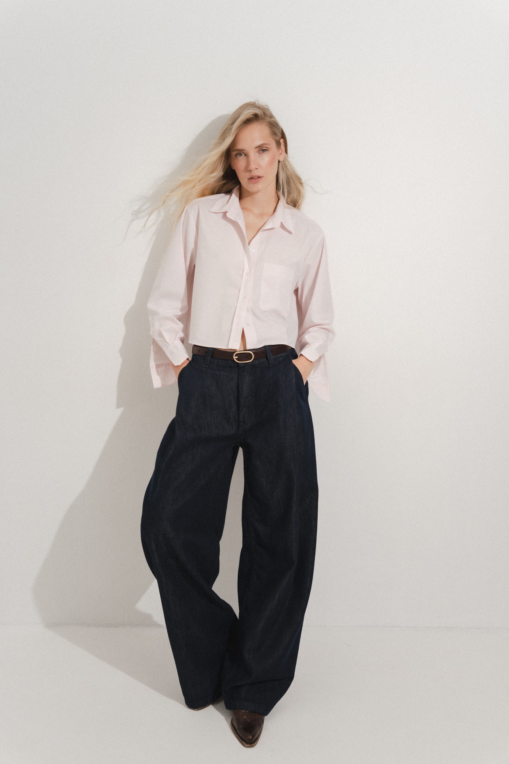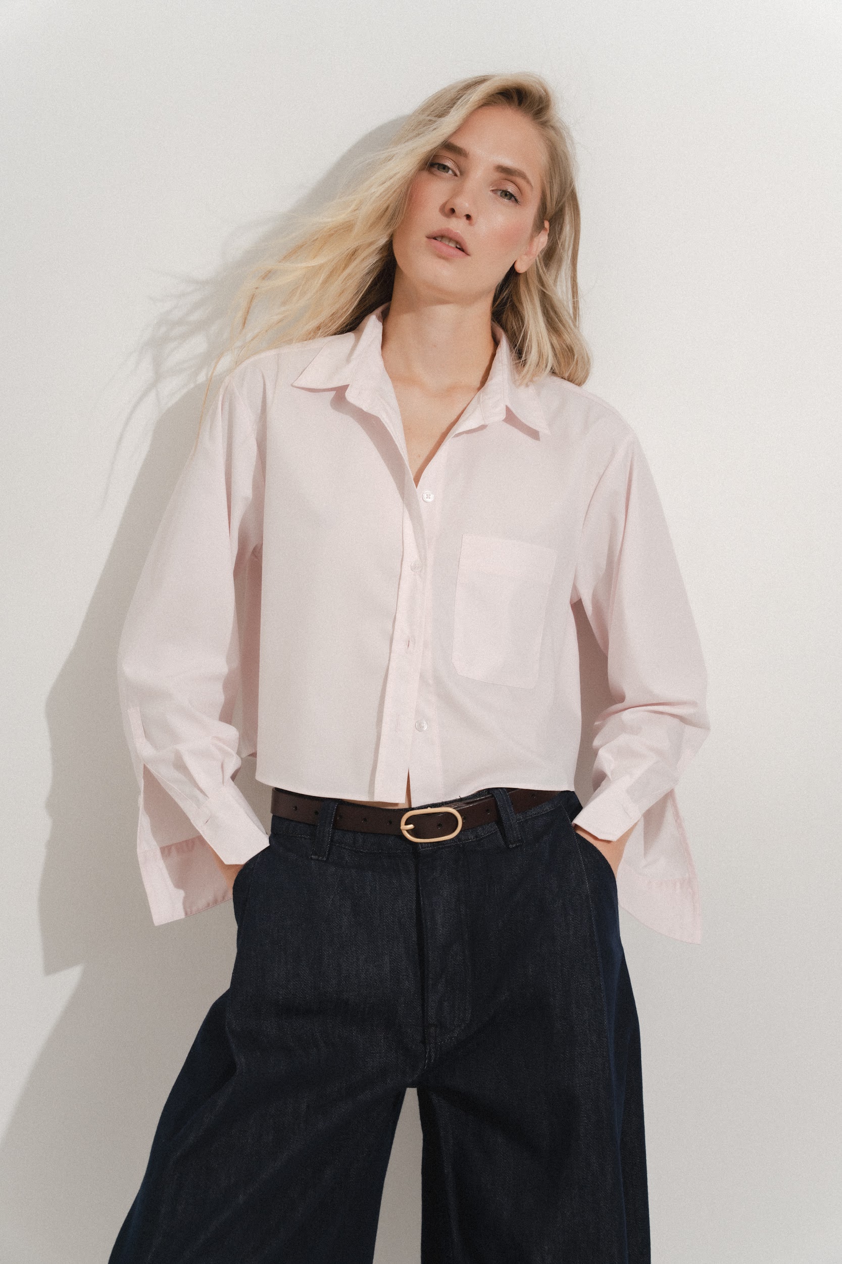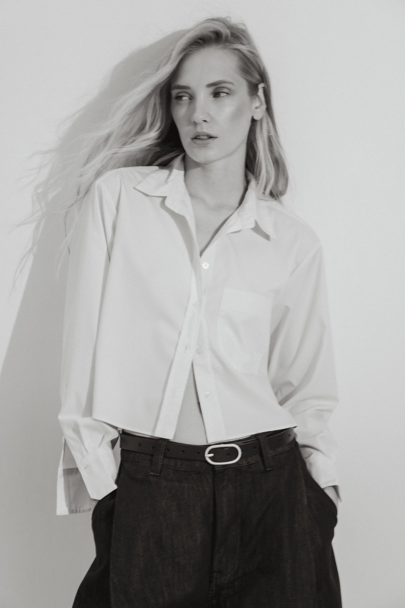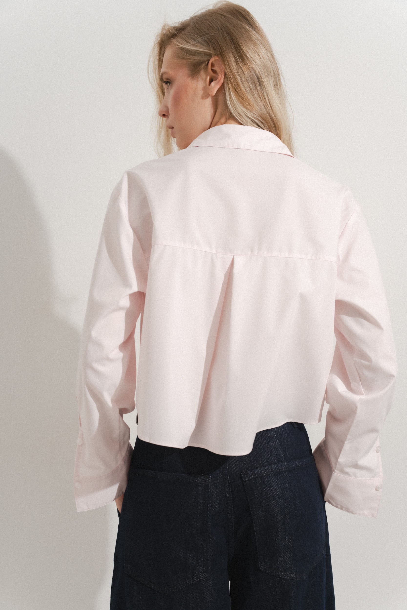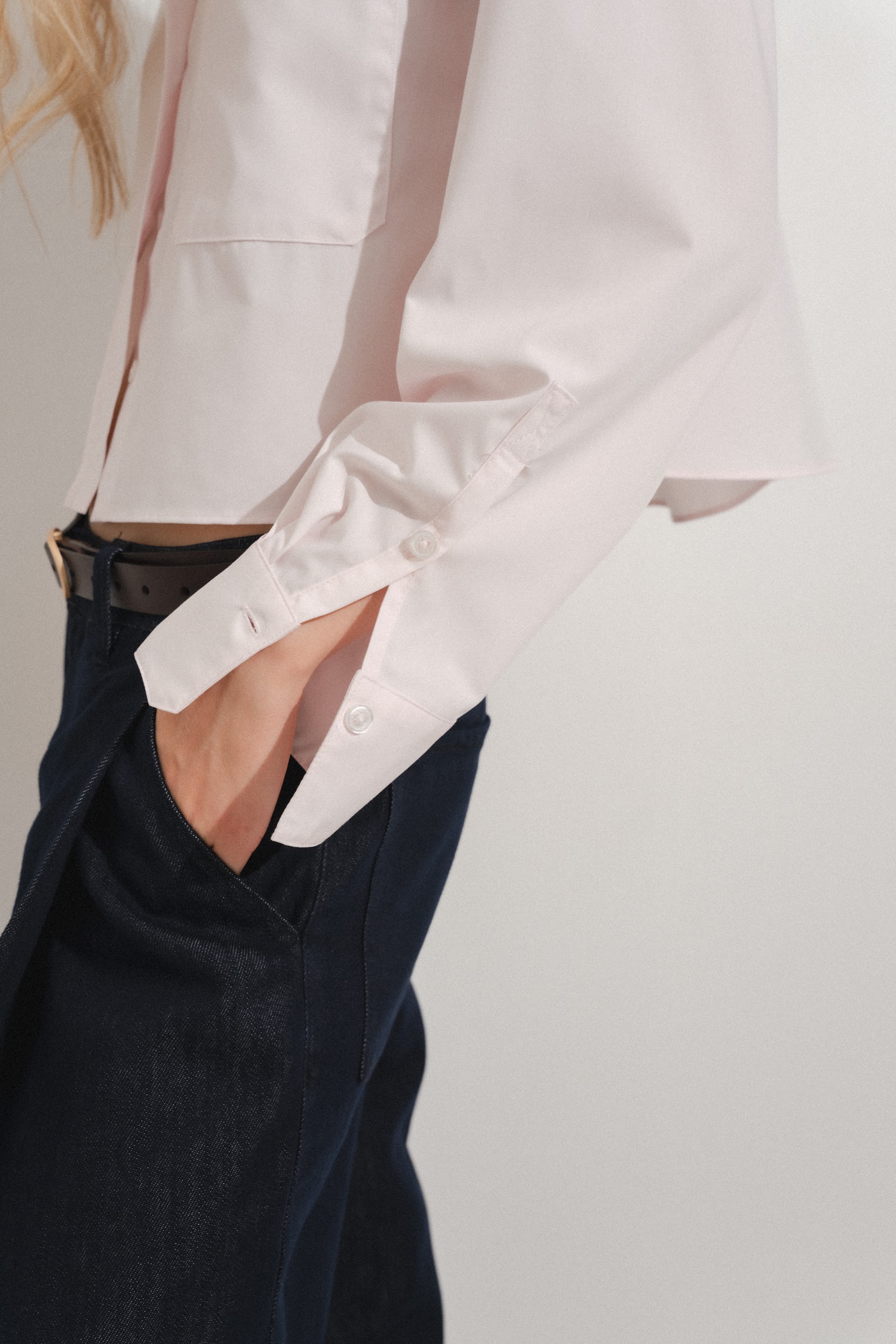 Рубашка укороченная из ткани ультраволокно. Отложной воротник. Длинные рукава с манжетами. Накладной нагрудный карман. Застежка на пуговицы.