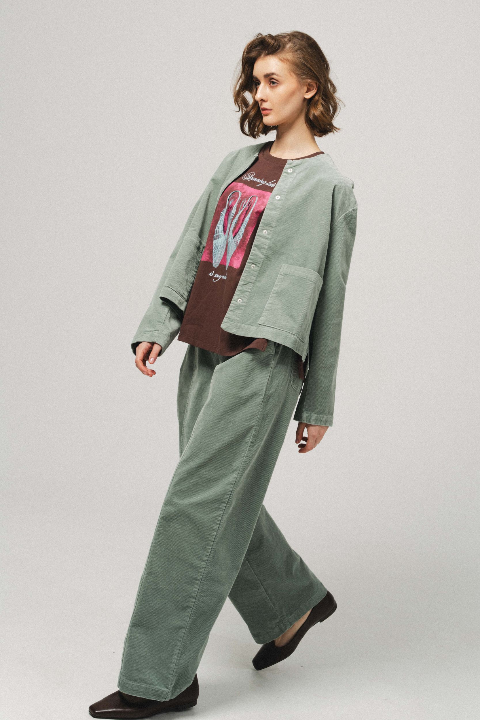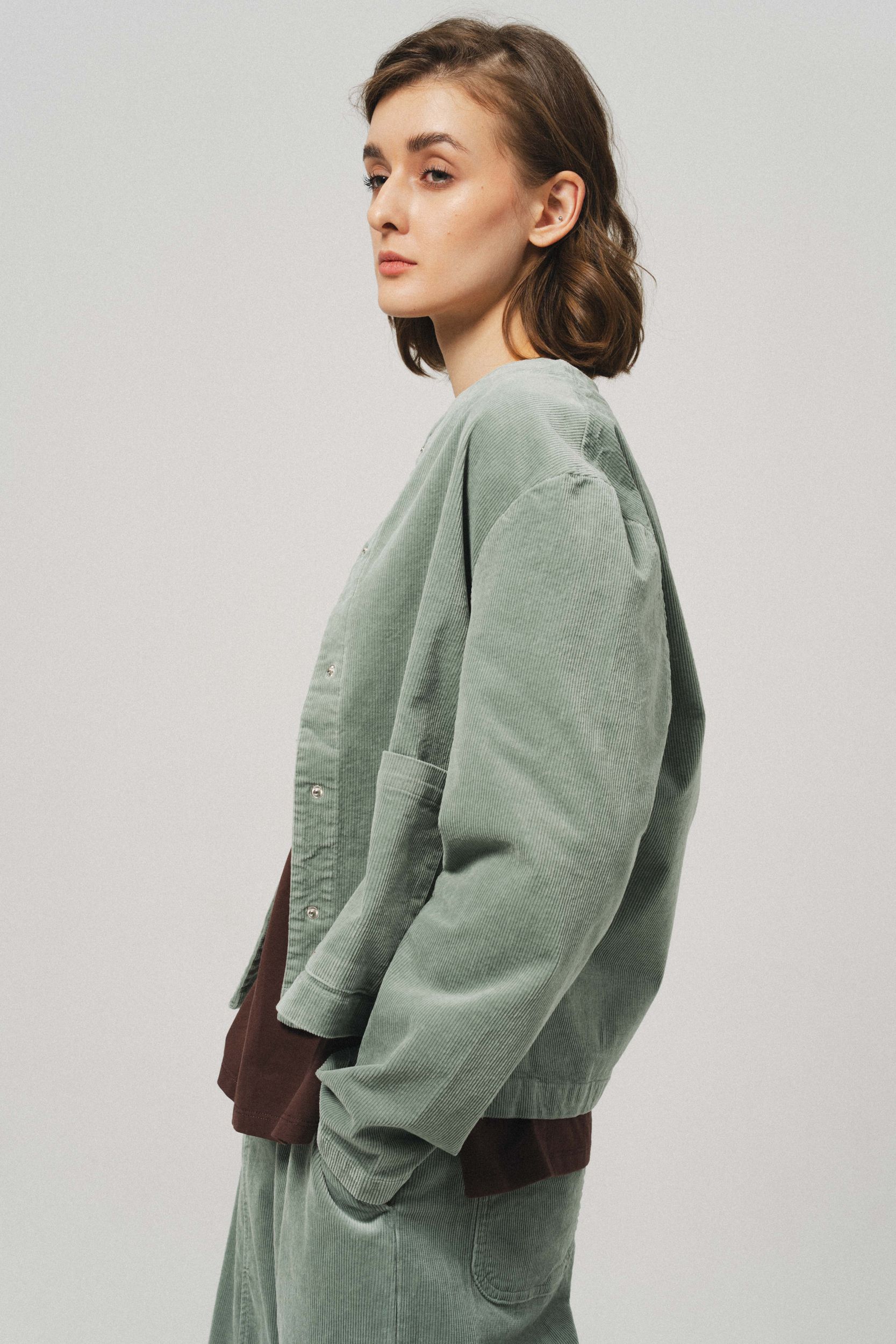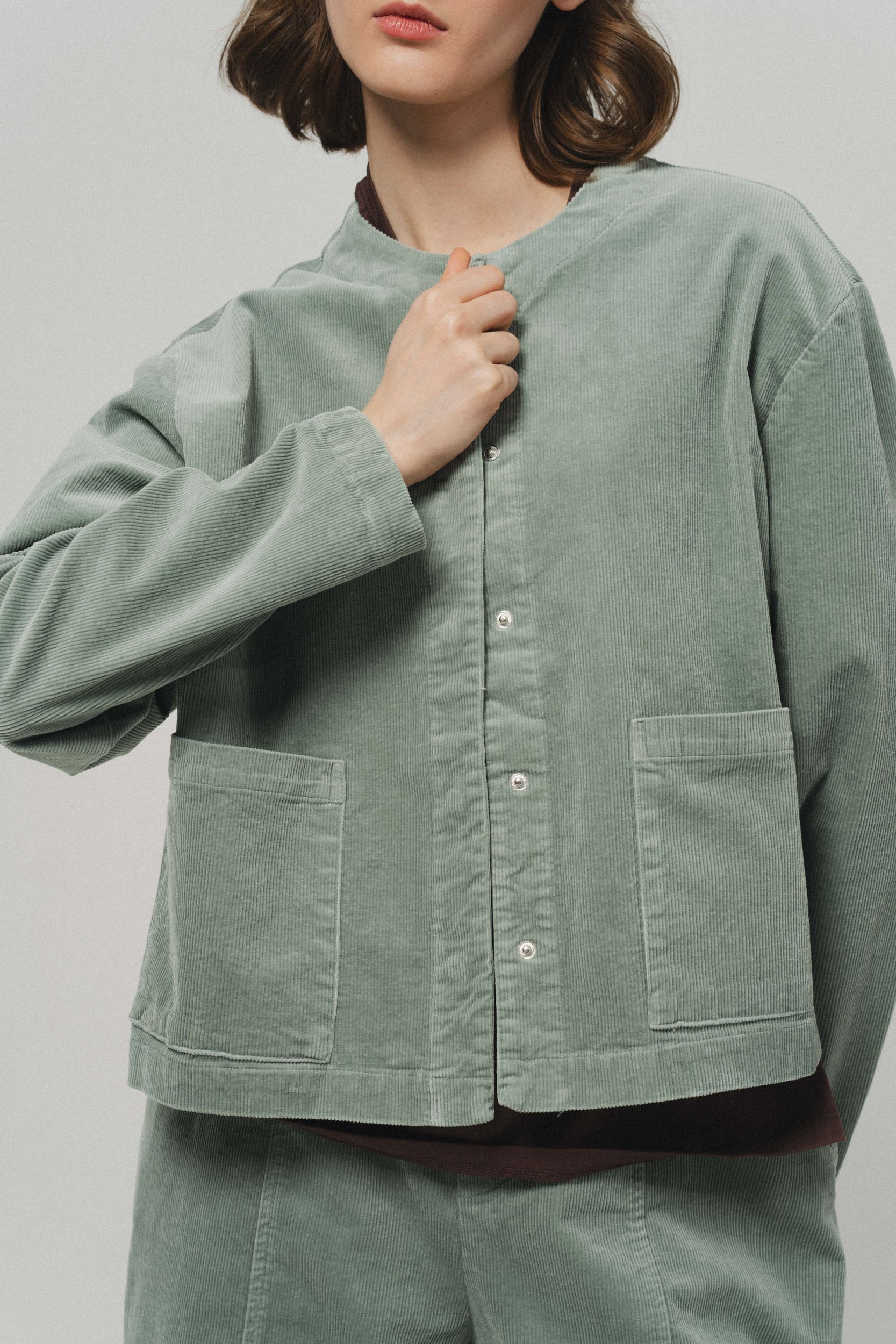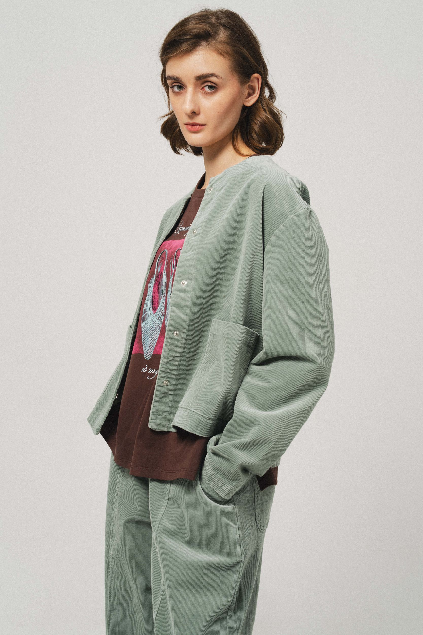 Рубашка из вельвета без воротника. Длинный рукав, круглая горловина. Свободный силуэт. Накладные карманы и застежка на потайные кнопки.