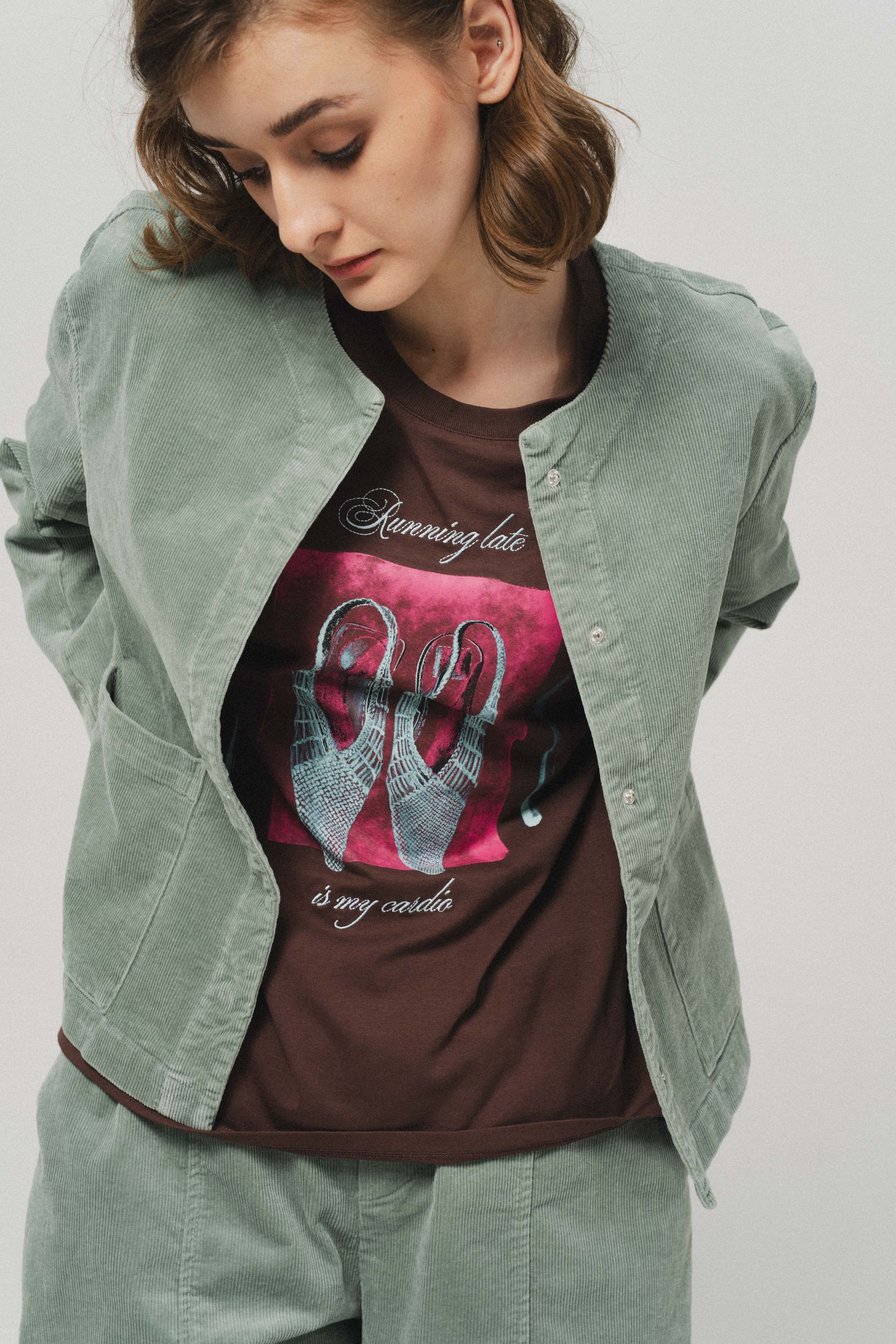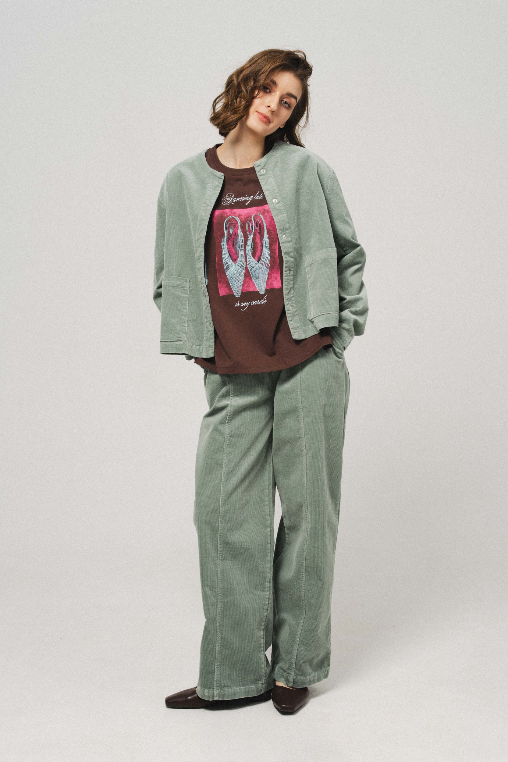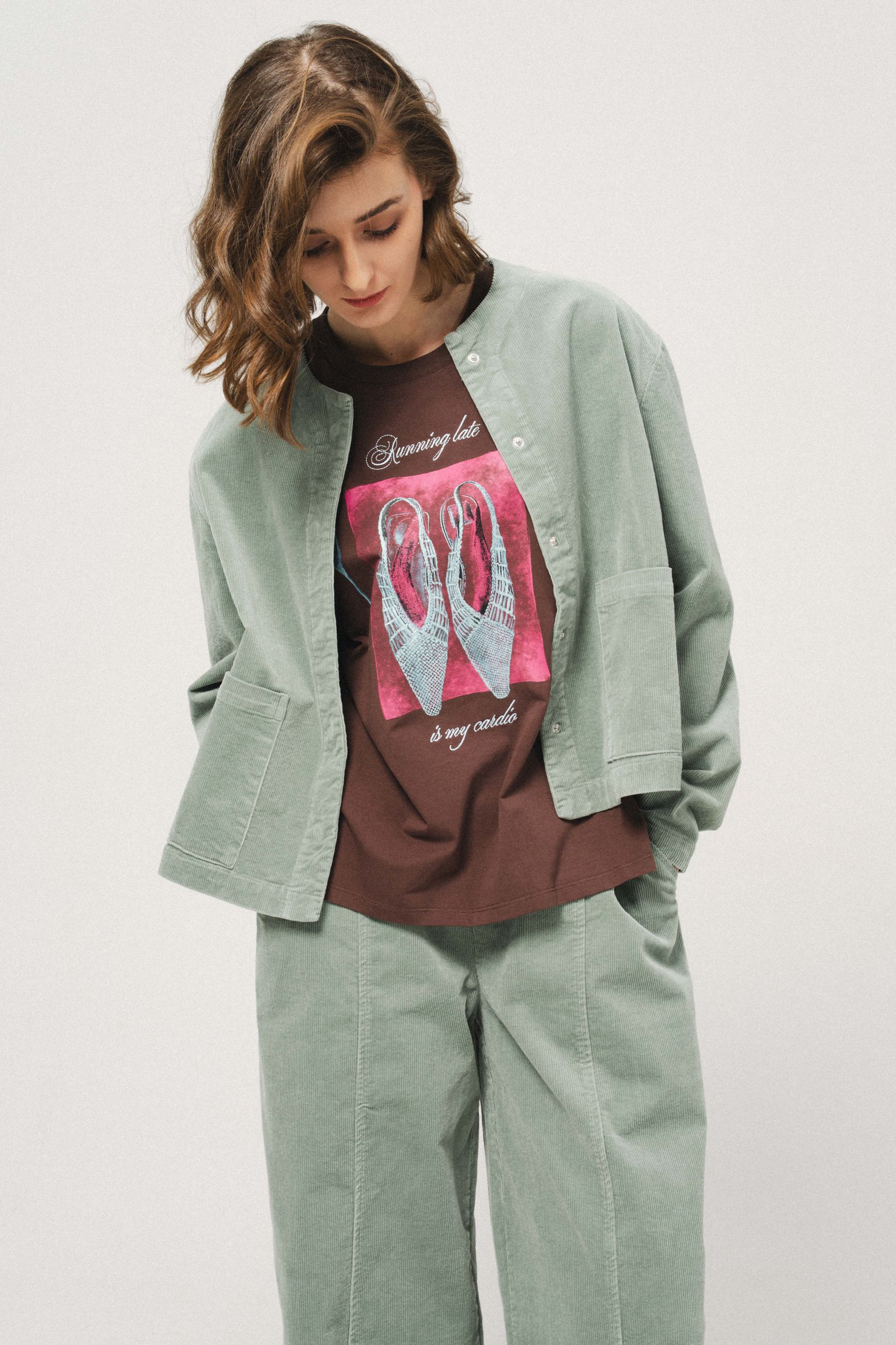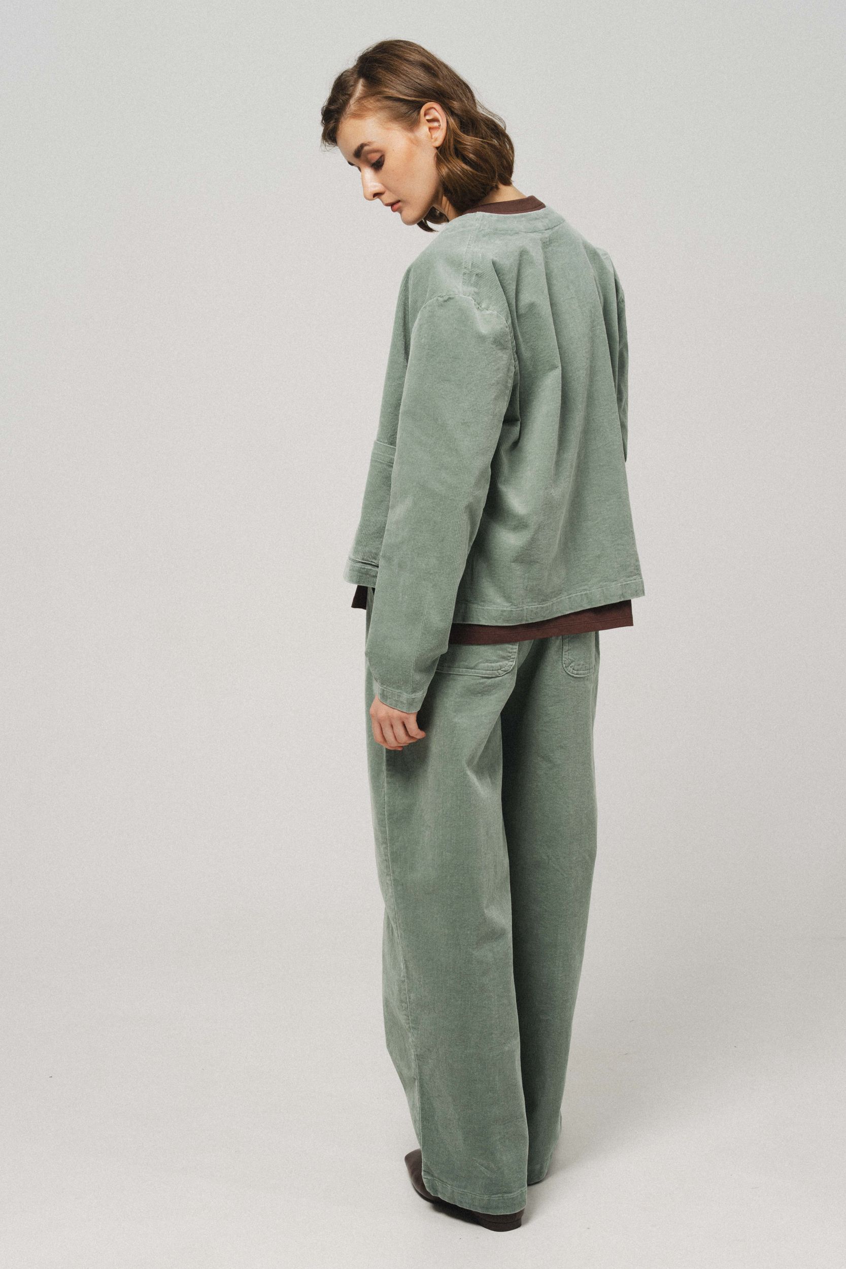 Рубашка из вельвета без воротника. Длинный рукав, круглая горловина. Свободный силуэт. Накладные карманы и застежка на потайные кнопки.