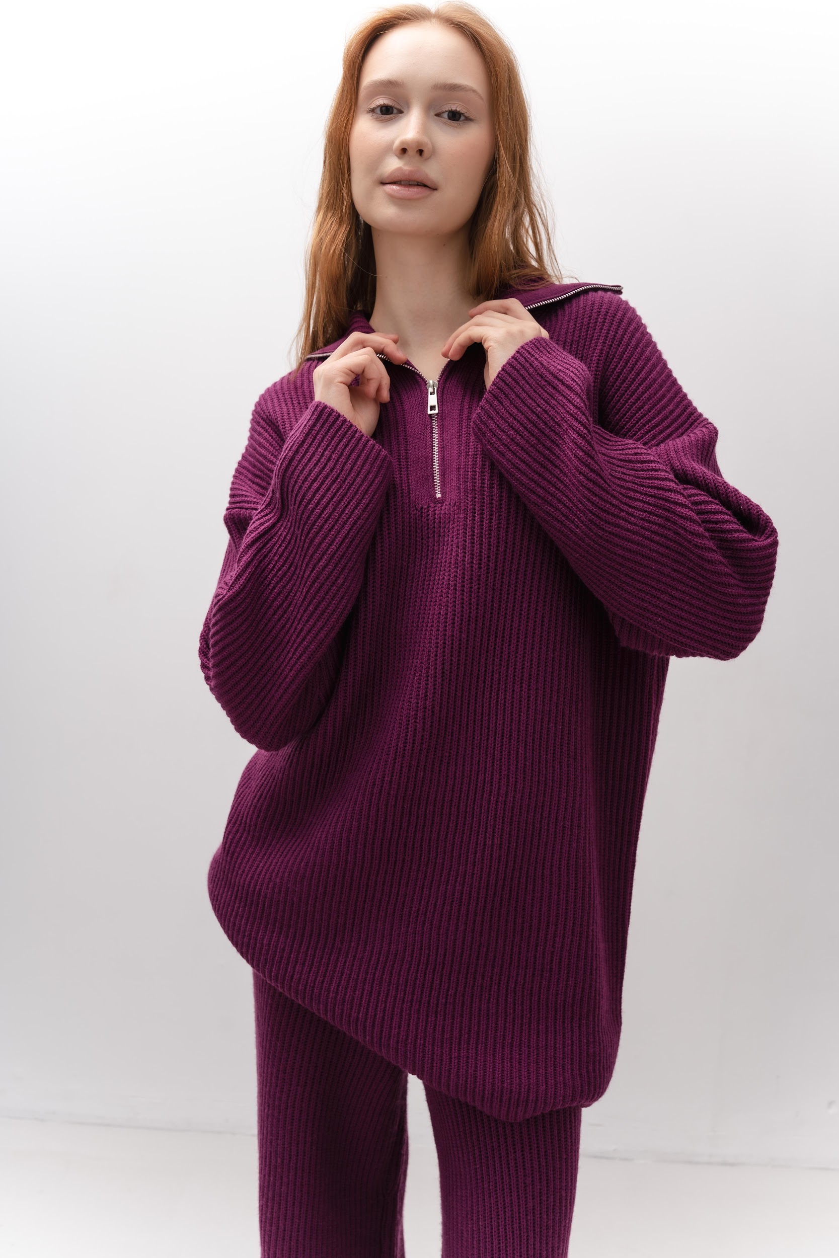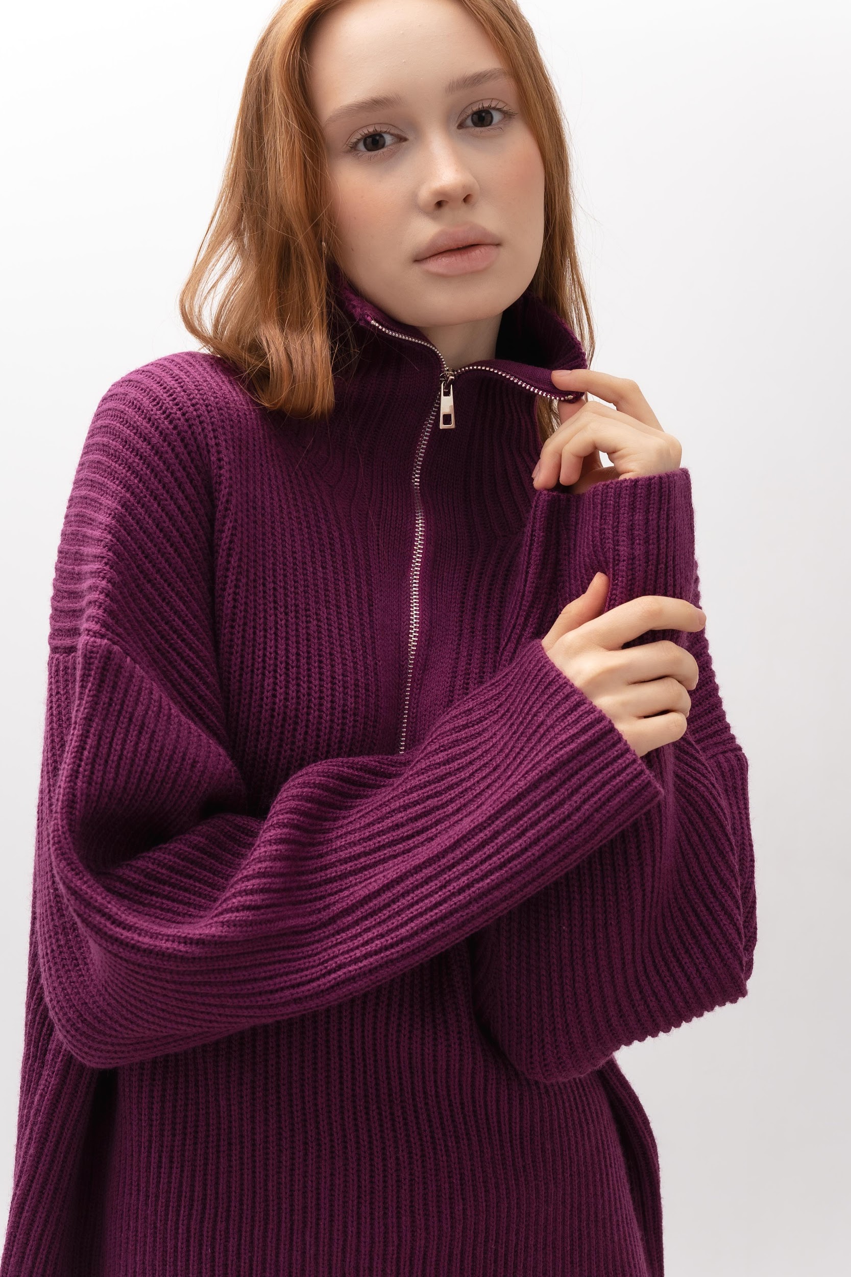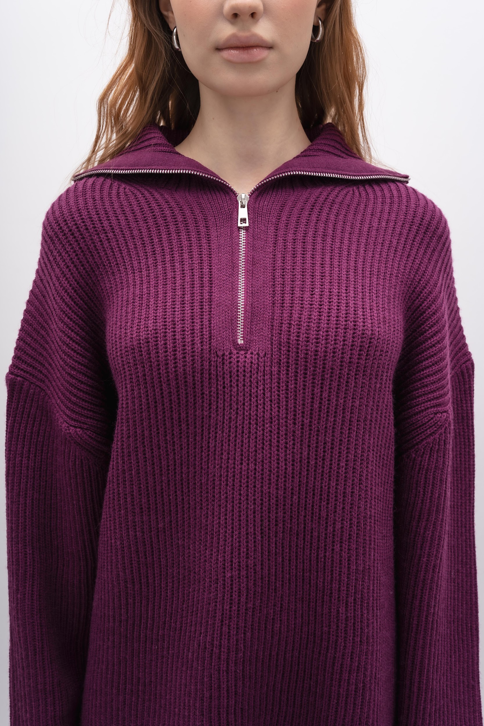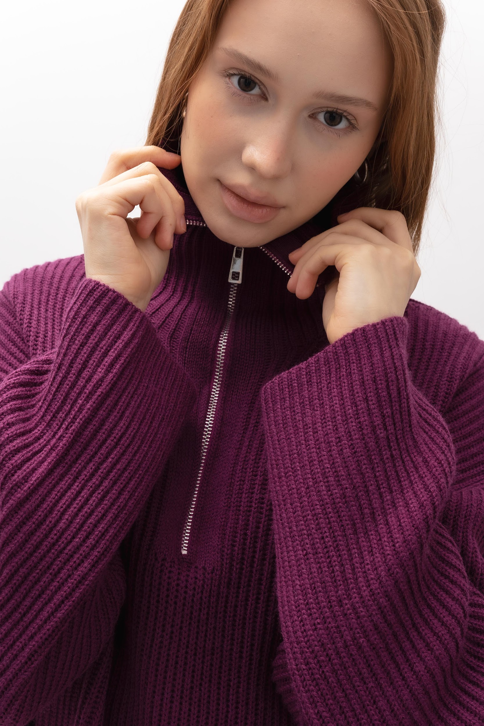 Свитер oversize из смесового трикотажа с добавлением шерсти мериноса и акрила с антипиллинг эффектом. Воротник стойка. Длинные рукава. Застежка на короткую молнию.