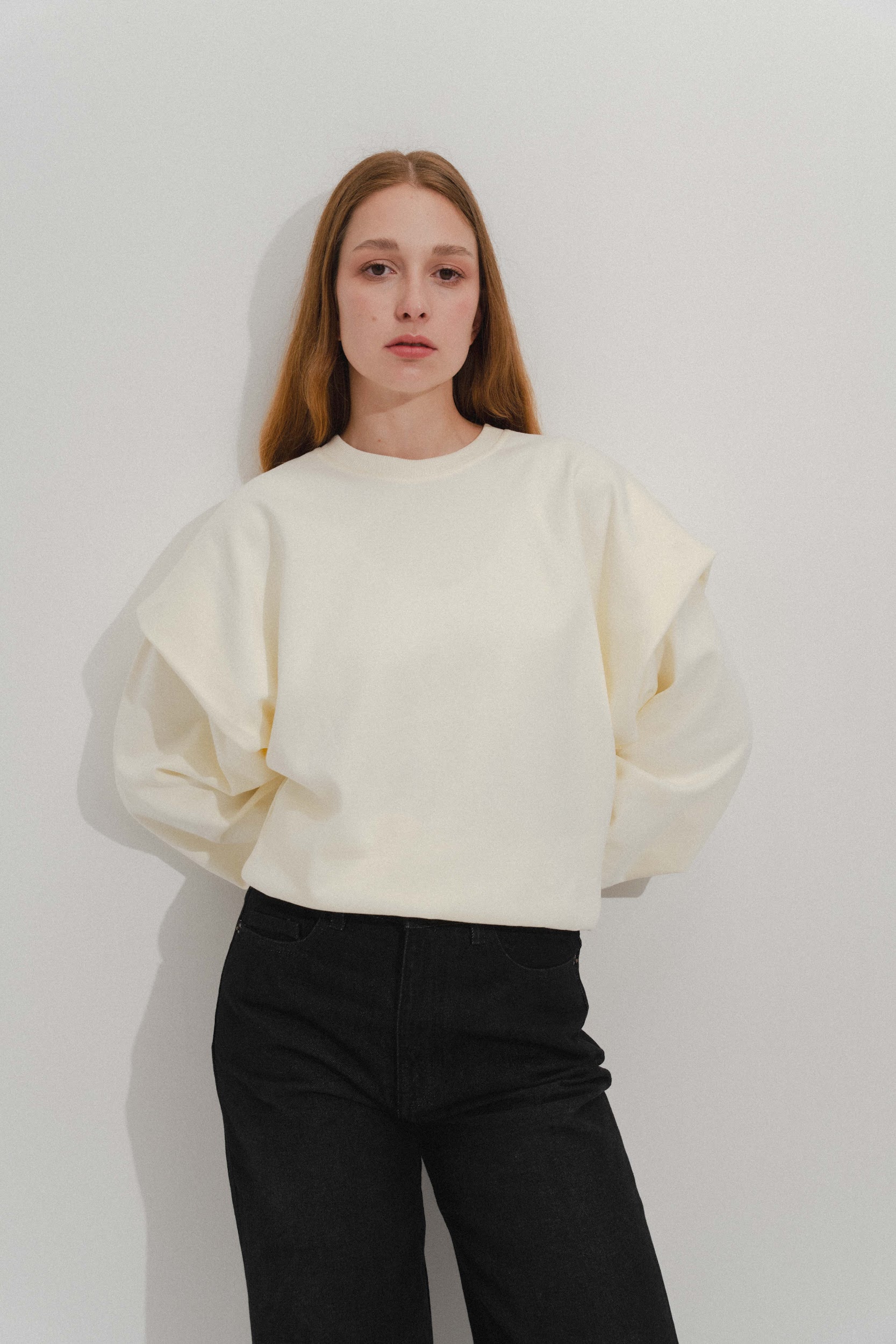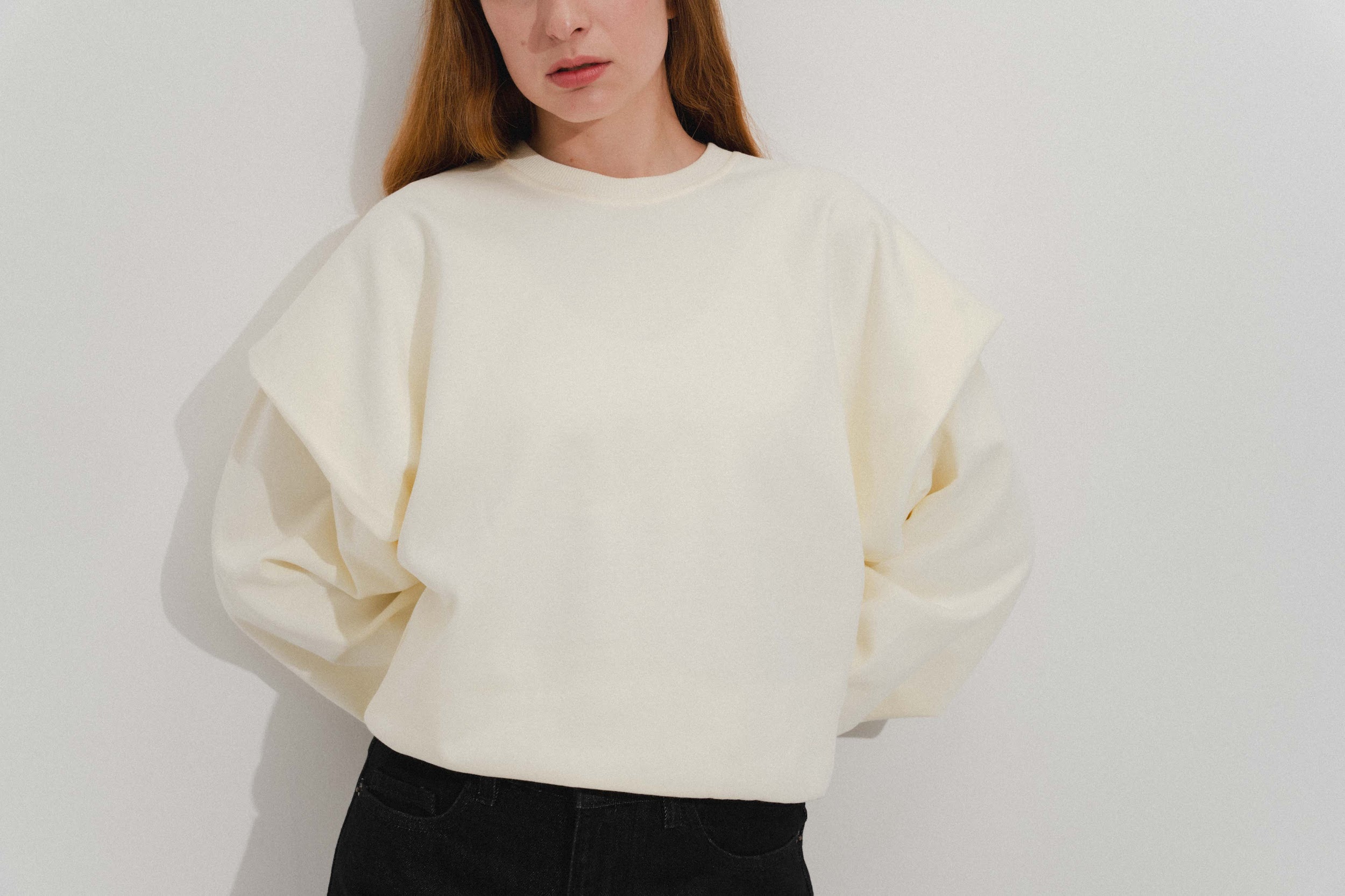 Толстовка из смесового хлопка. Объемные плечи с двойным эффектом. Круглый вырез. Длинные рукава. Эластичные манжеты.