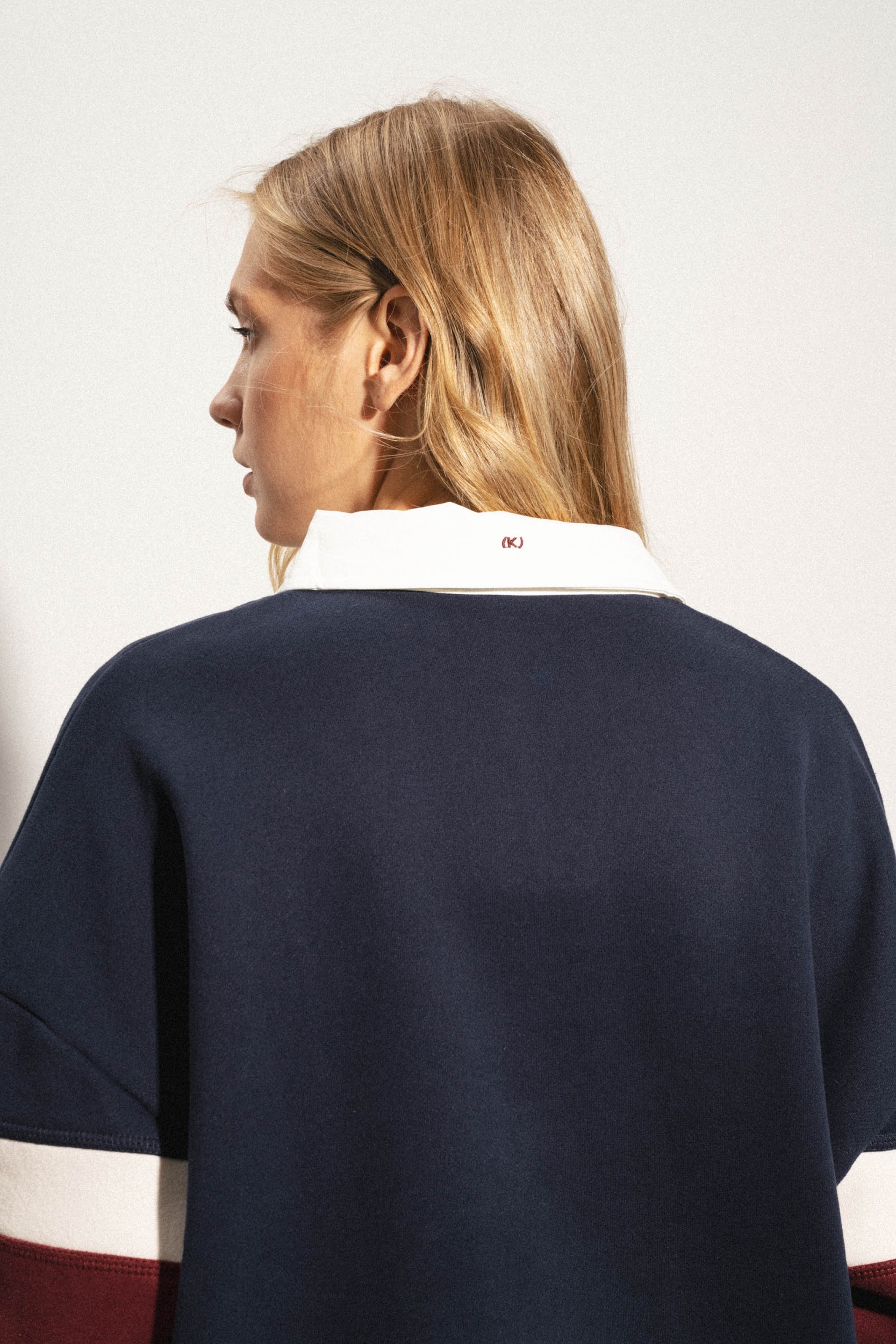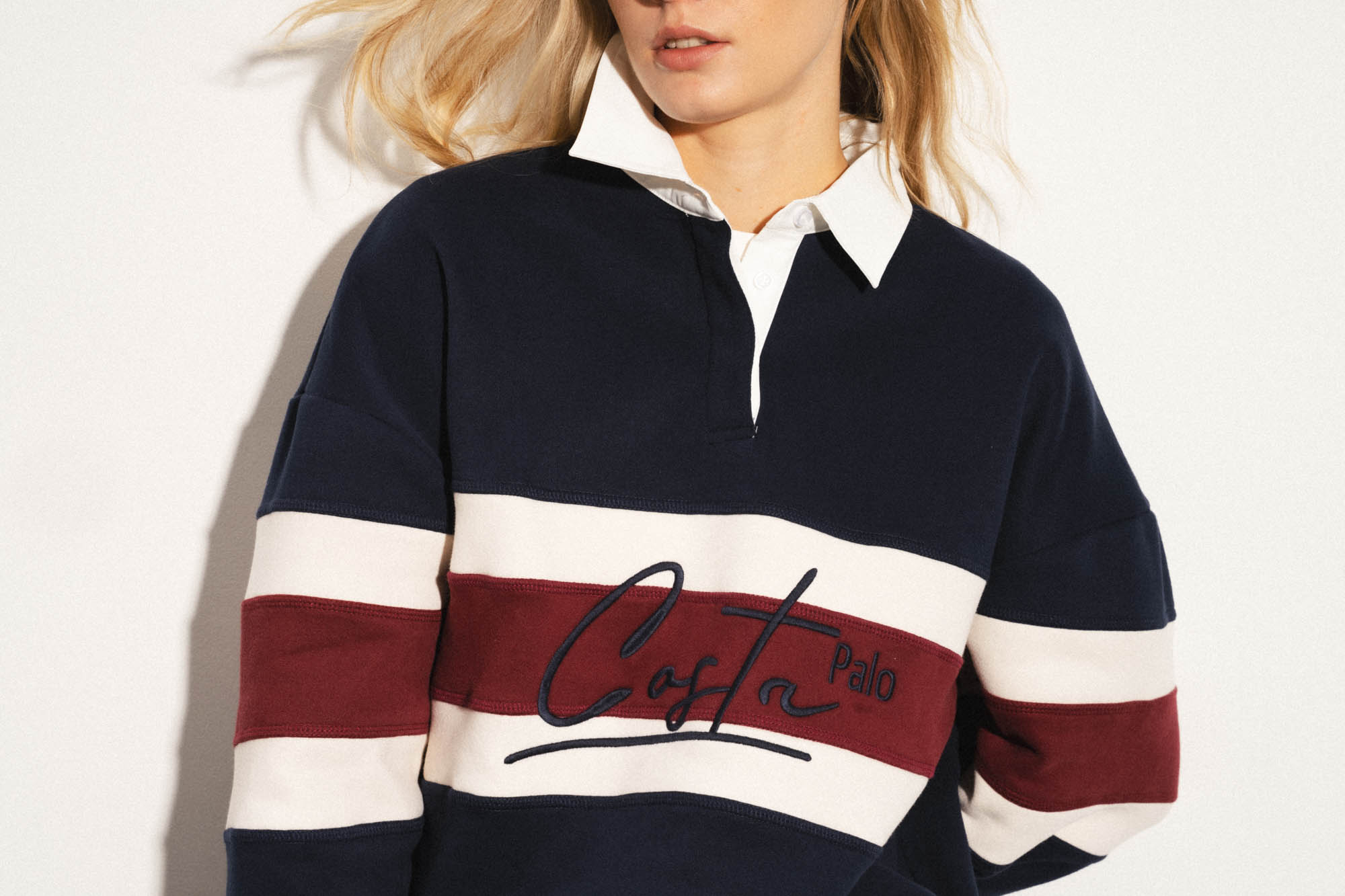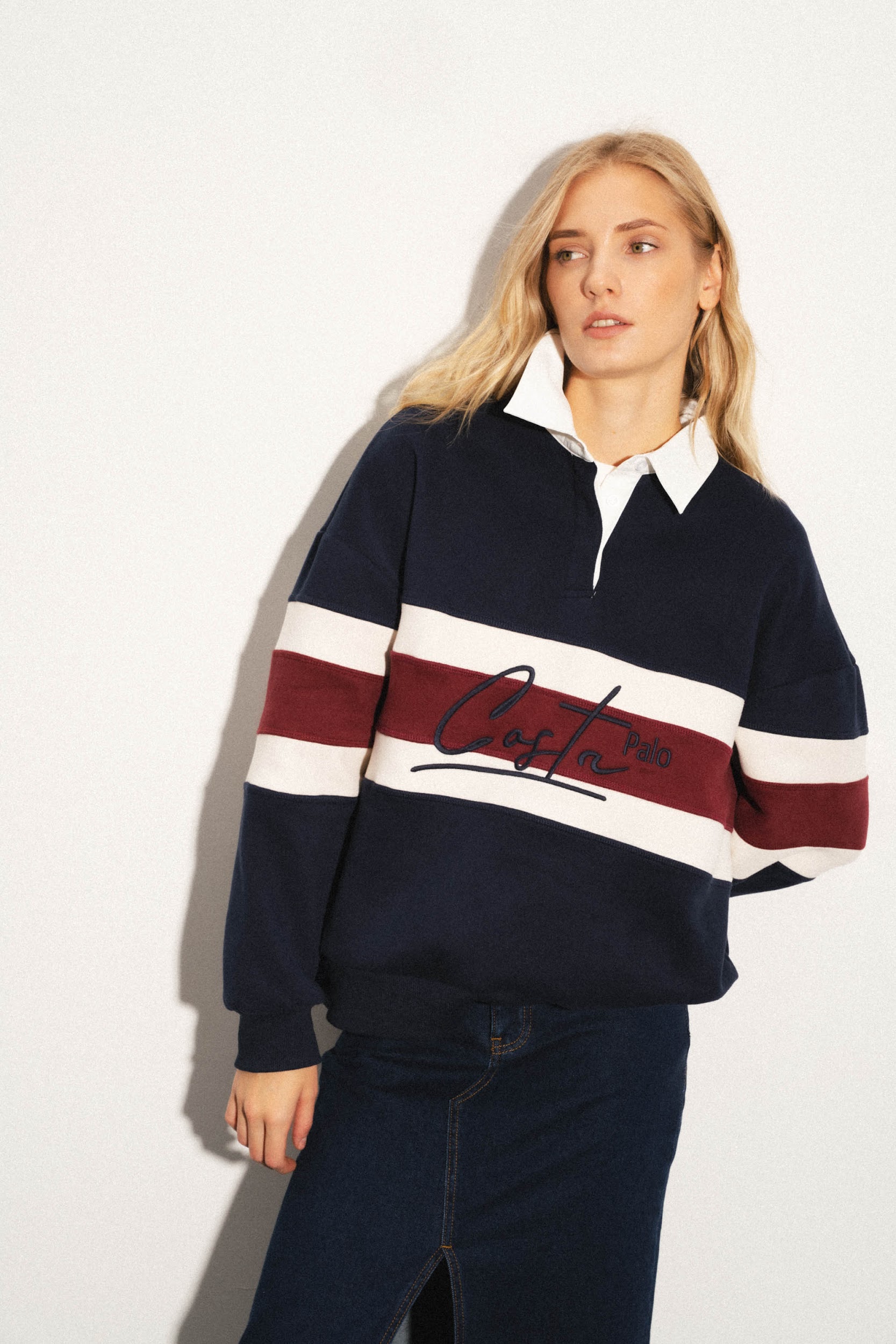 Толстовка из смесового хлопка с воротником поло. Длинные рукава с заниженными плечами. Эластичные манжеты. Декоративная контрастная вставка с вышивкой.
