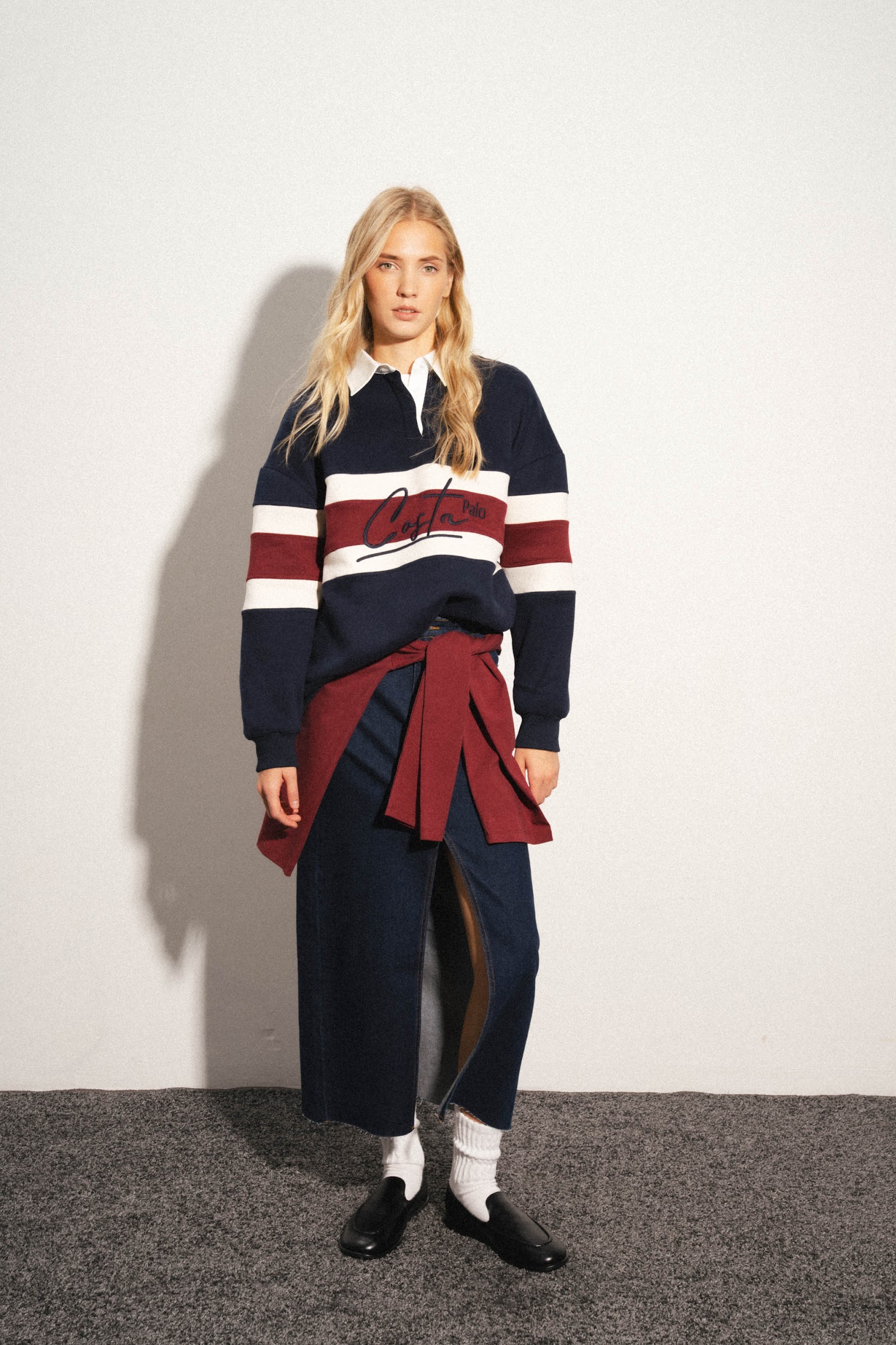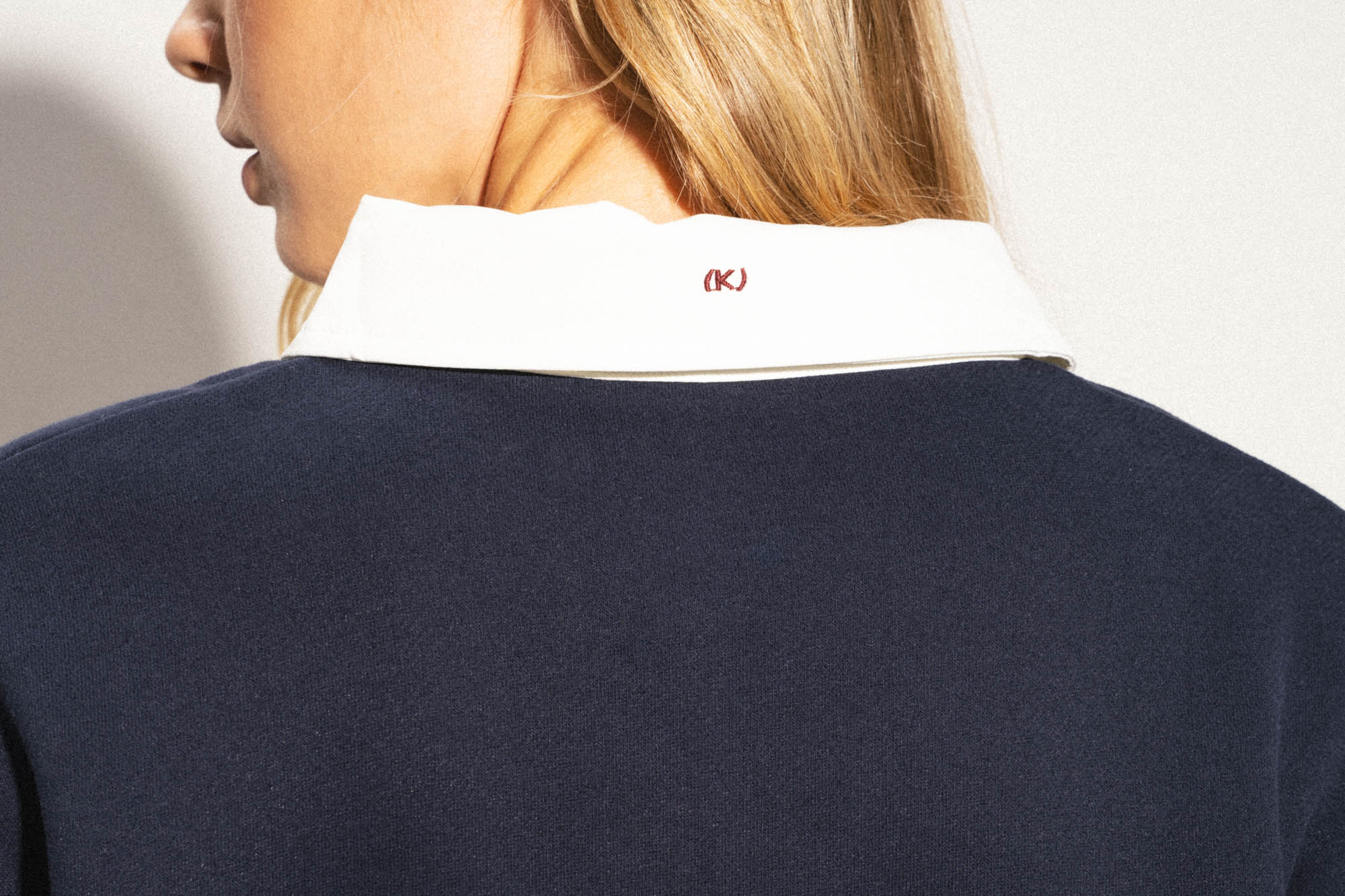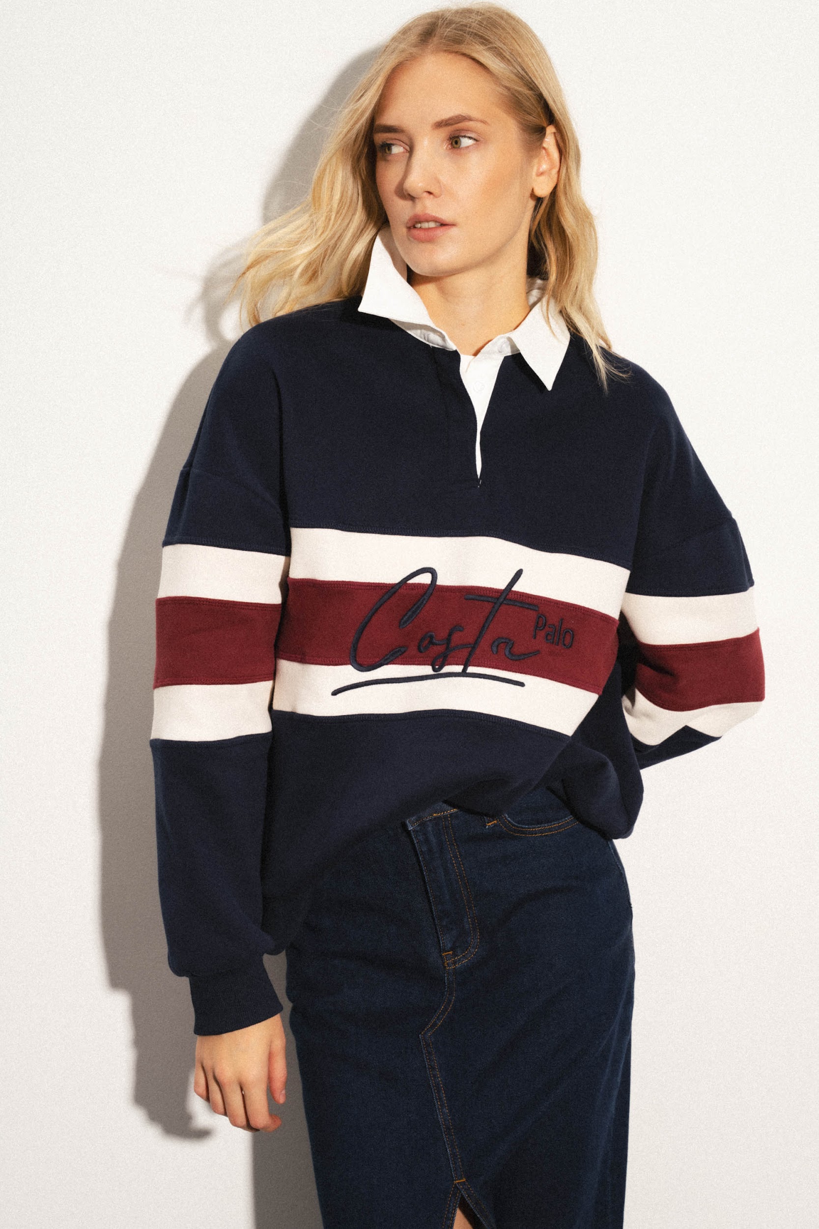 Толстовка из смесового хлопка с воротником поло. Длинные рукава с заниженными плечами. Эластичные манжеты. Декоративная контрастная вставка с вышивкой.
