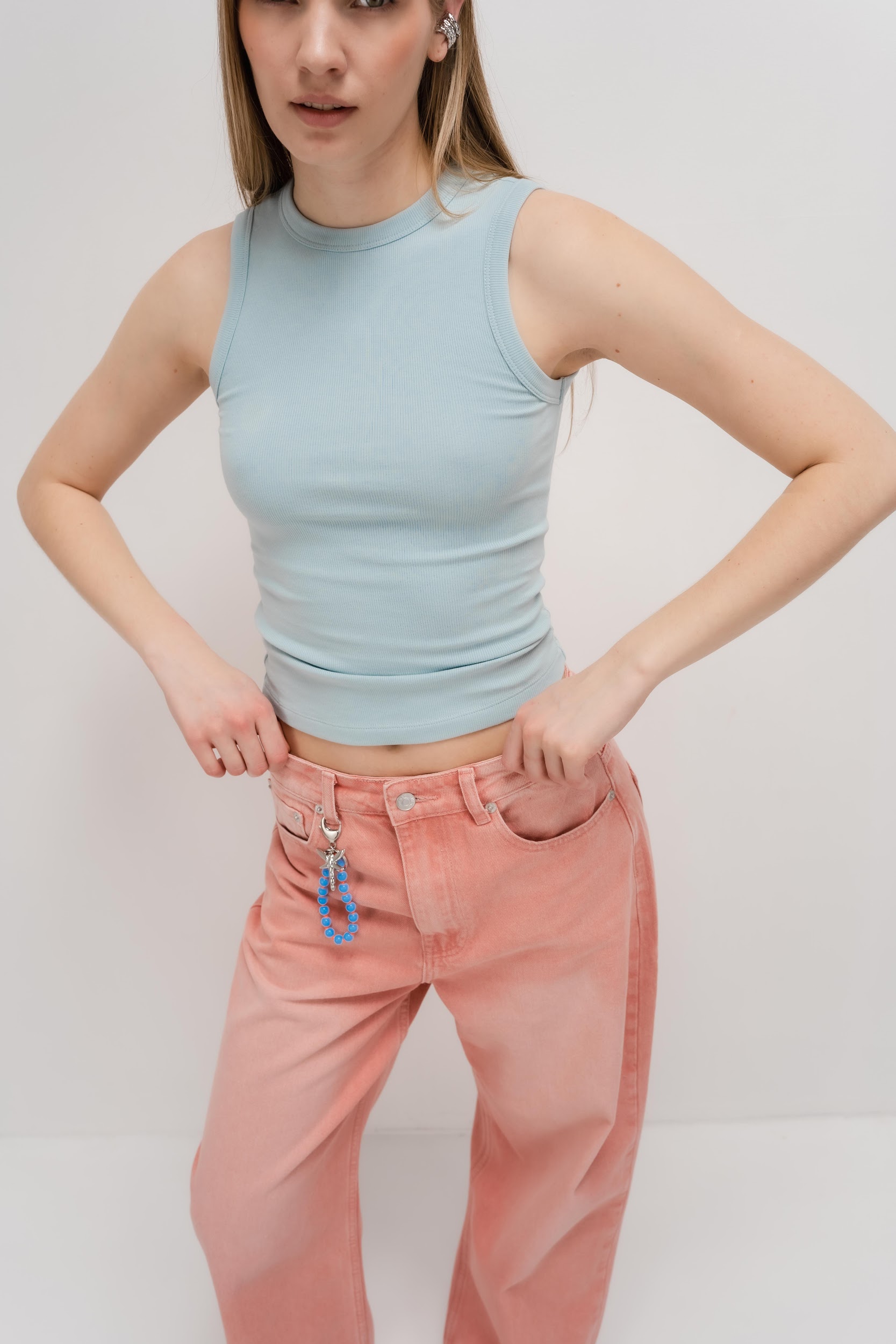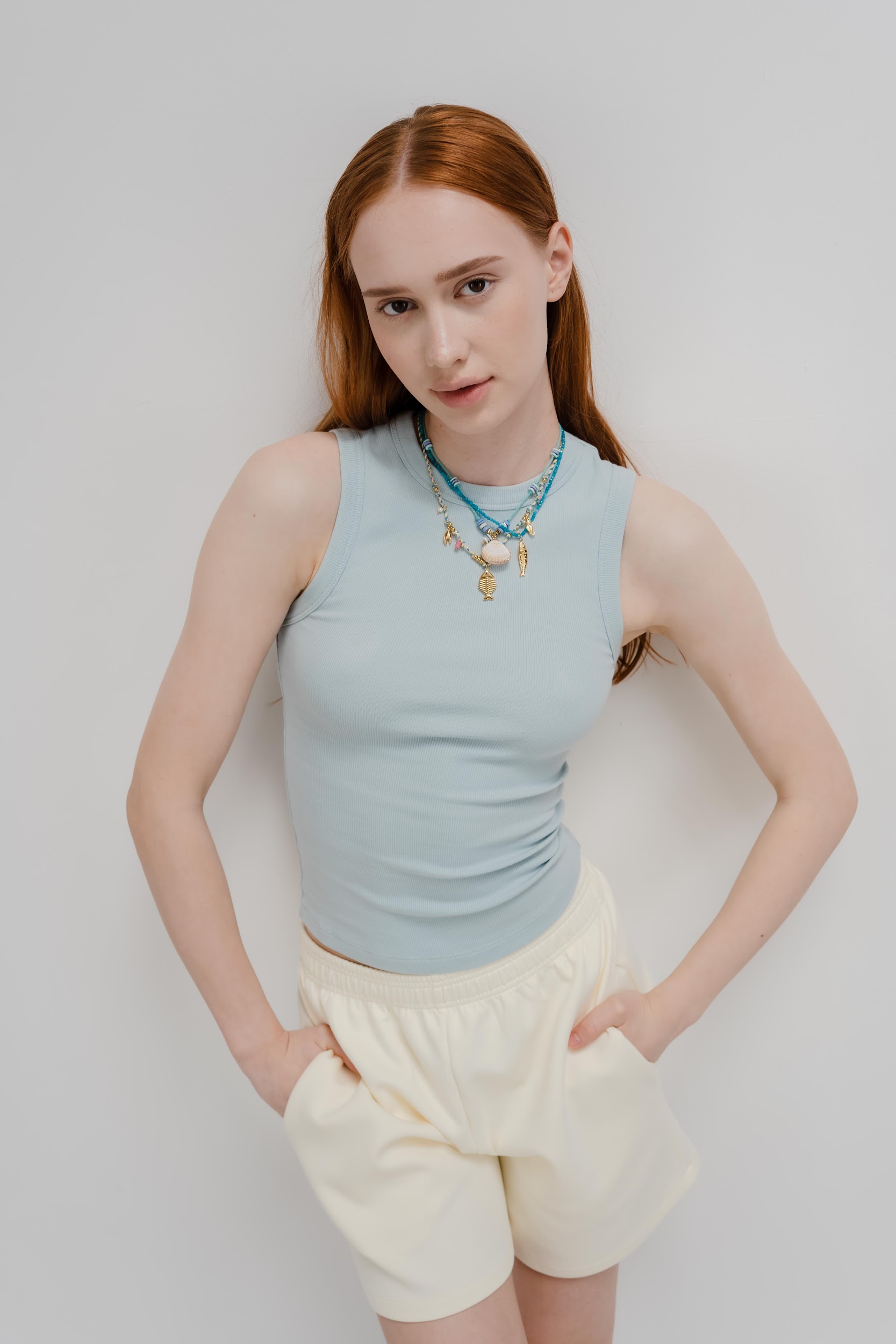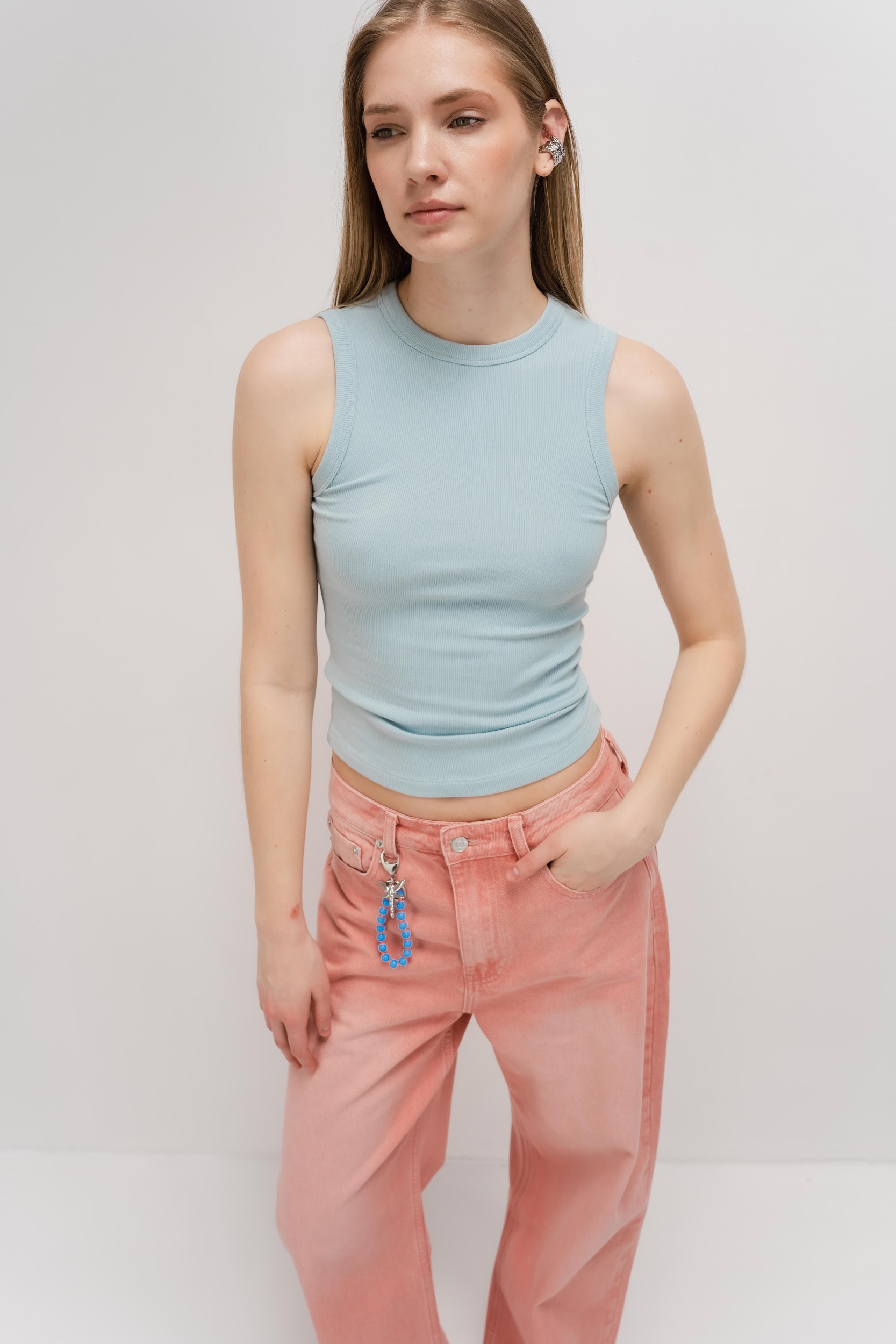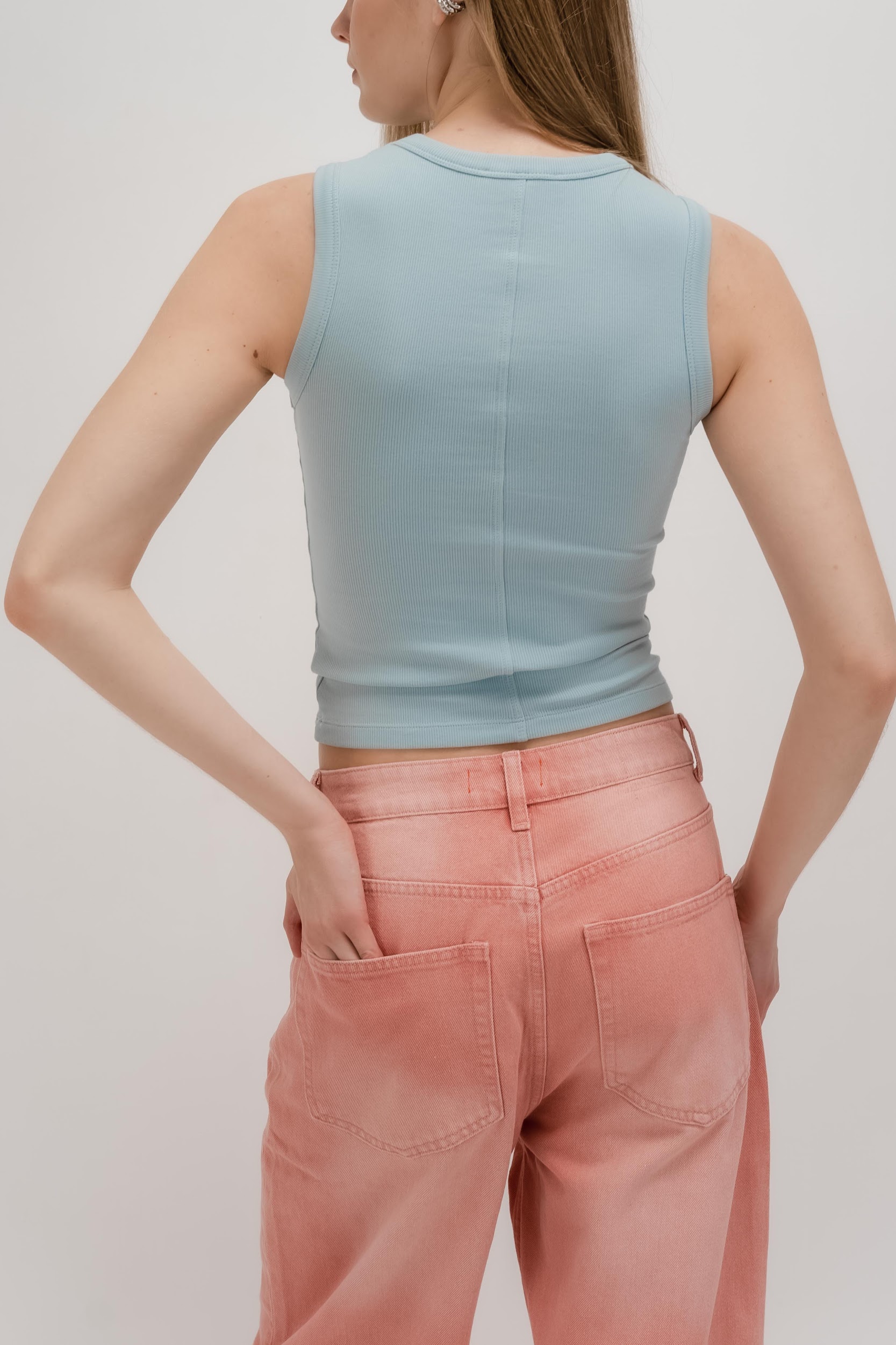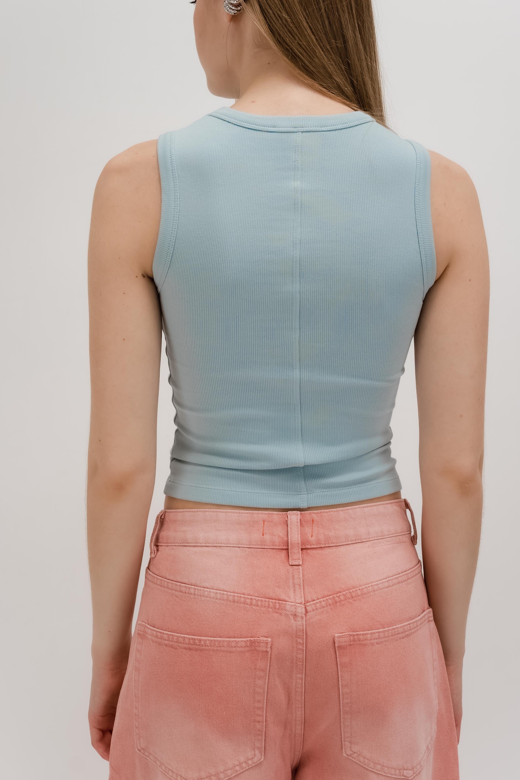 Приталенный топ из эластичного хлопка в рубчик. Круглый вырез.