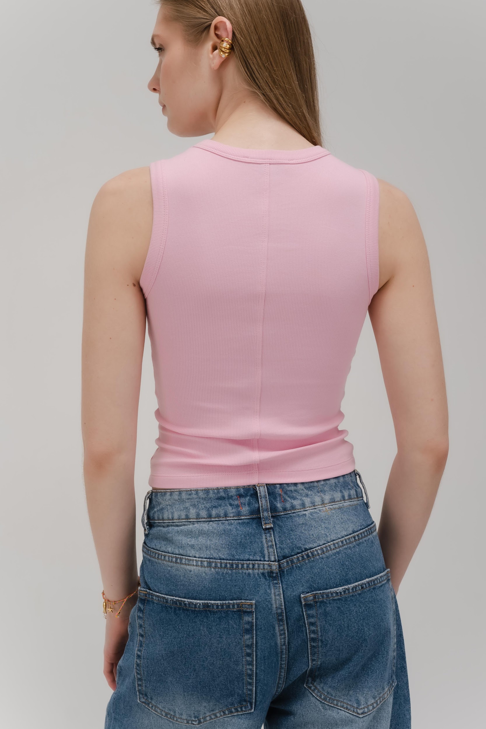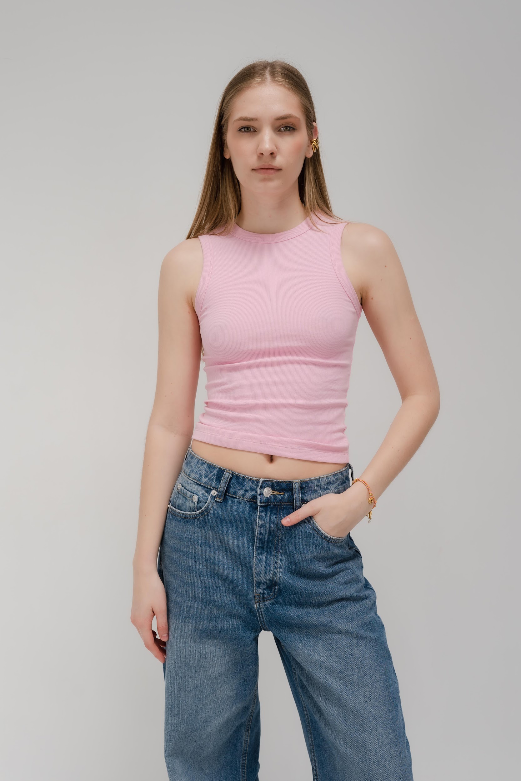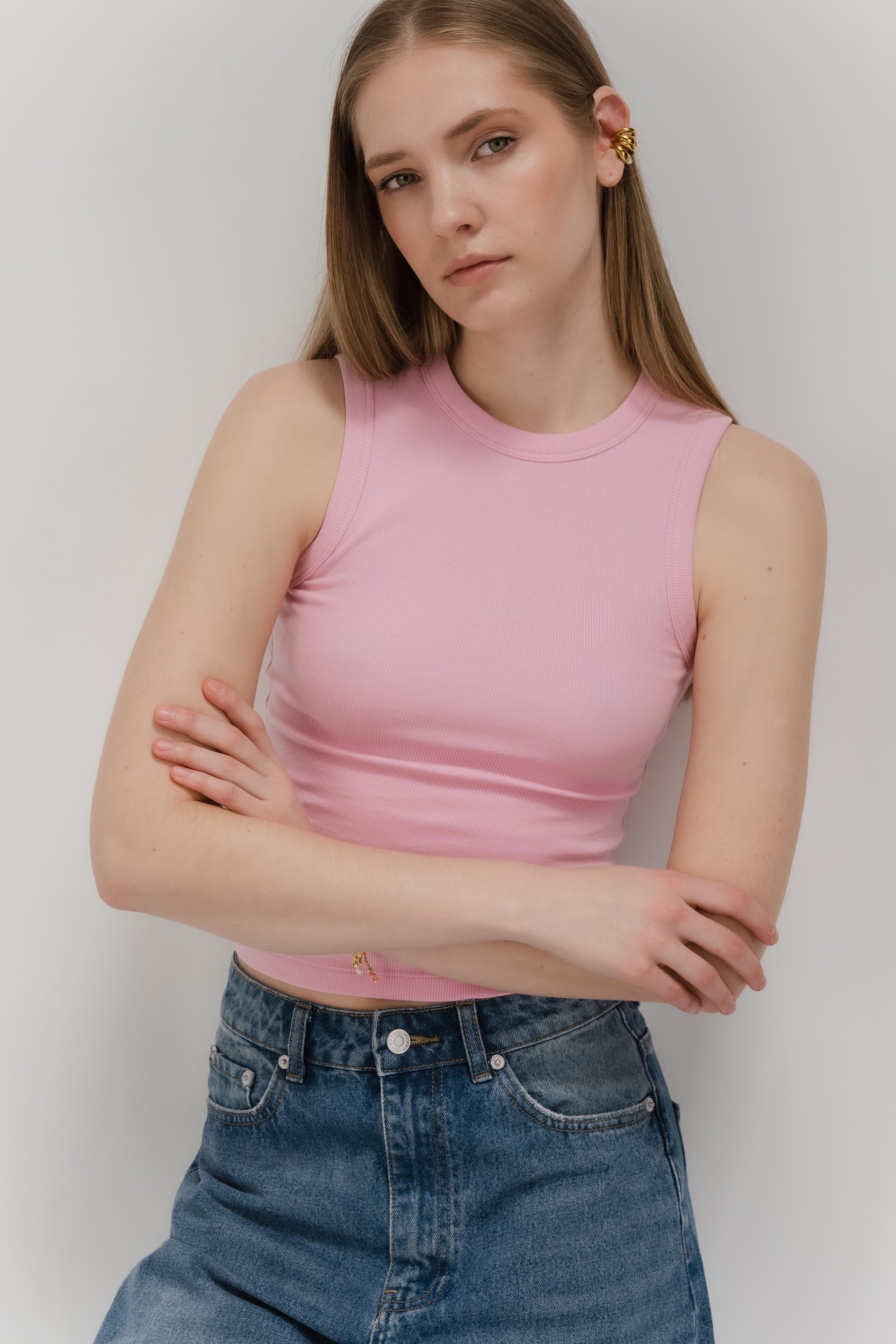 Приталенный топ из эластичного хлопка в рубчик. Круглый вырез.