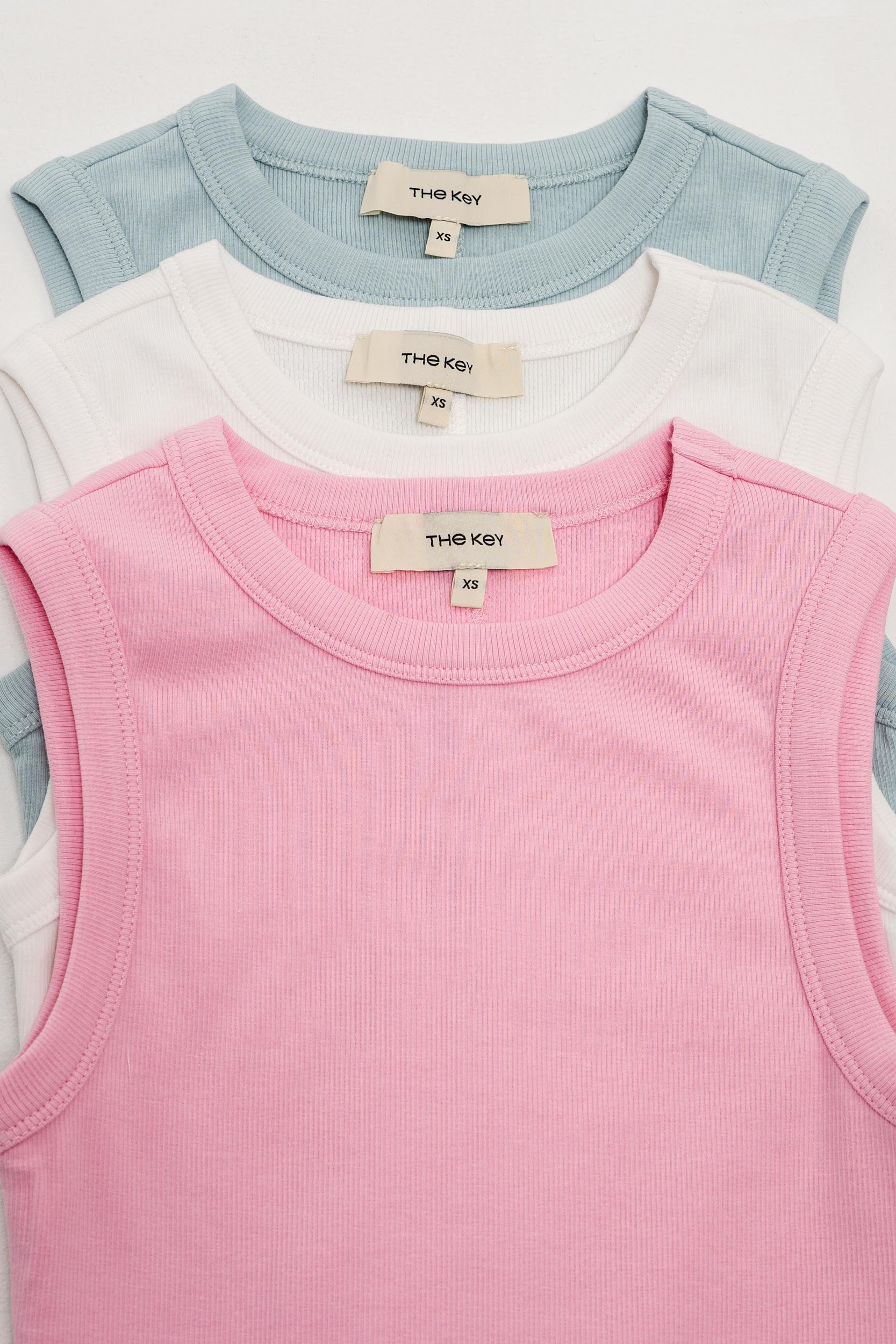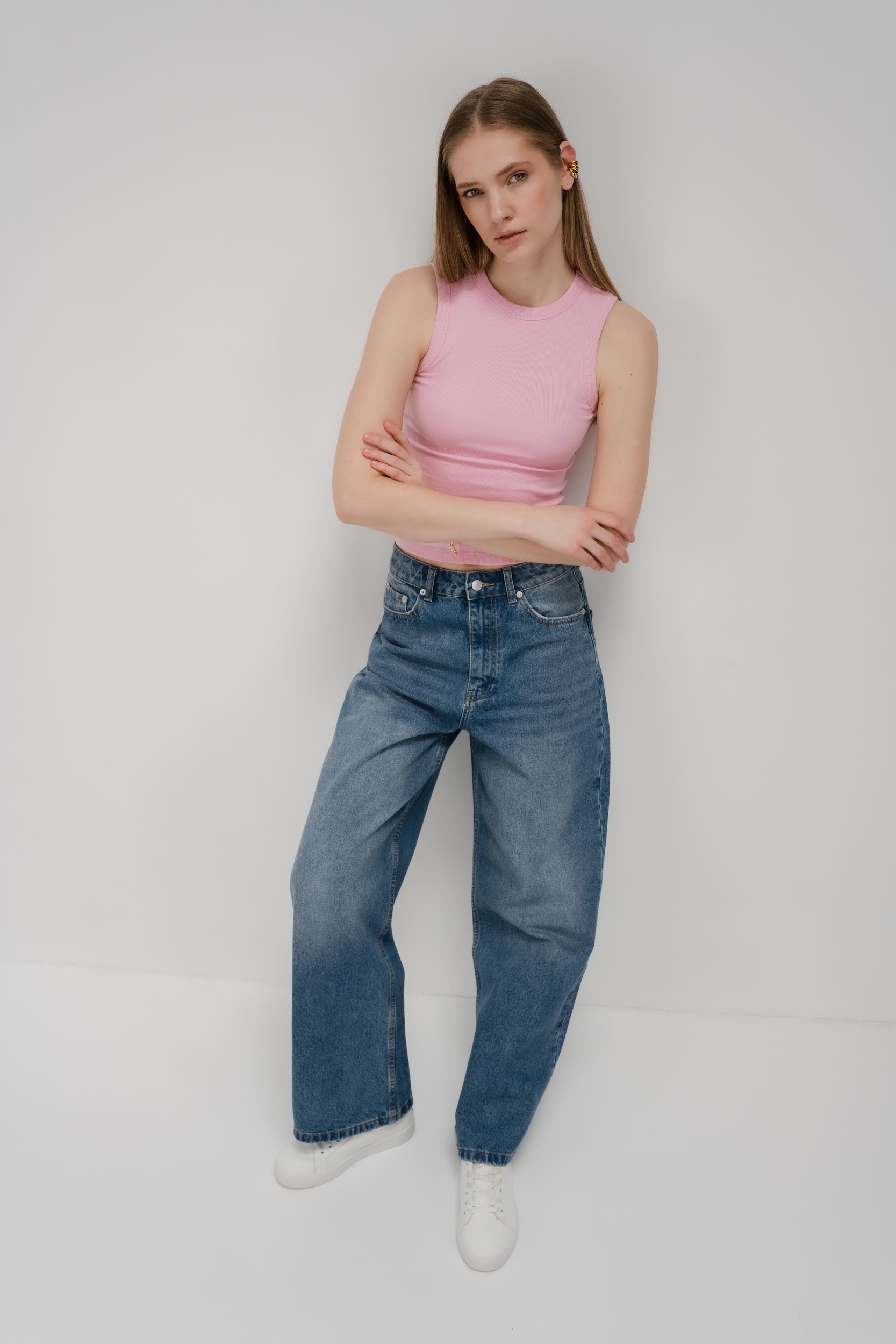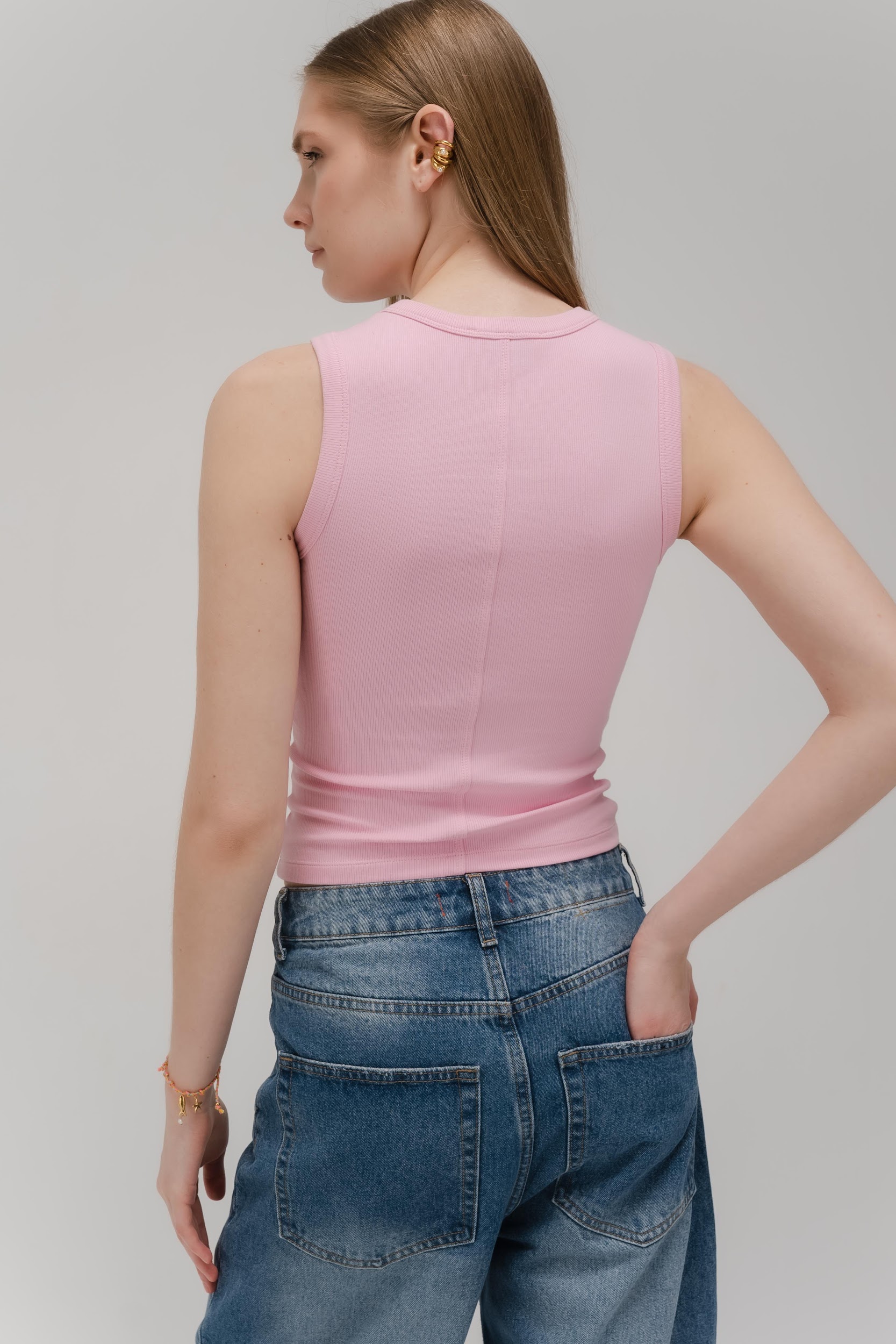 Приталенный топ из эластичного хлопка в рубчик. Круглый вырез.