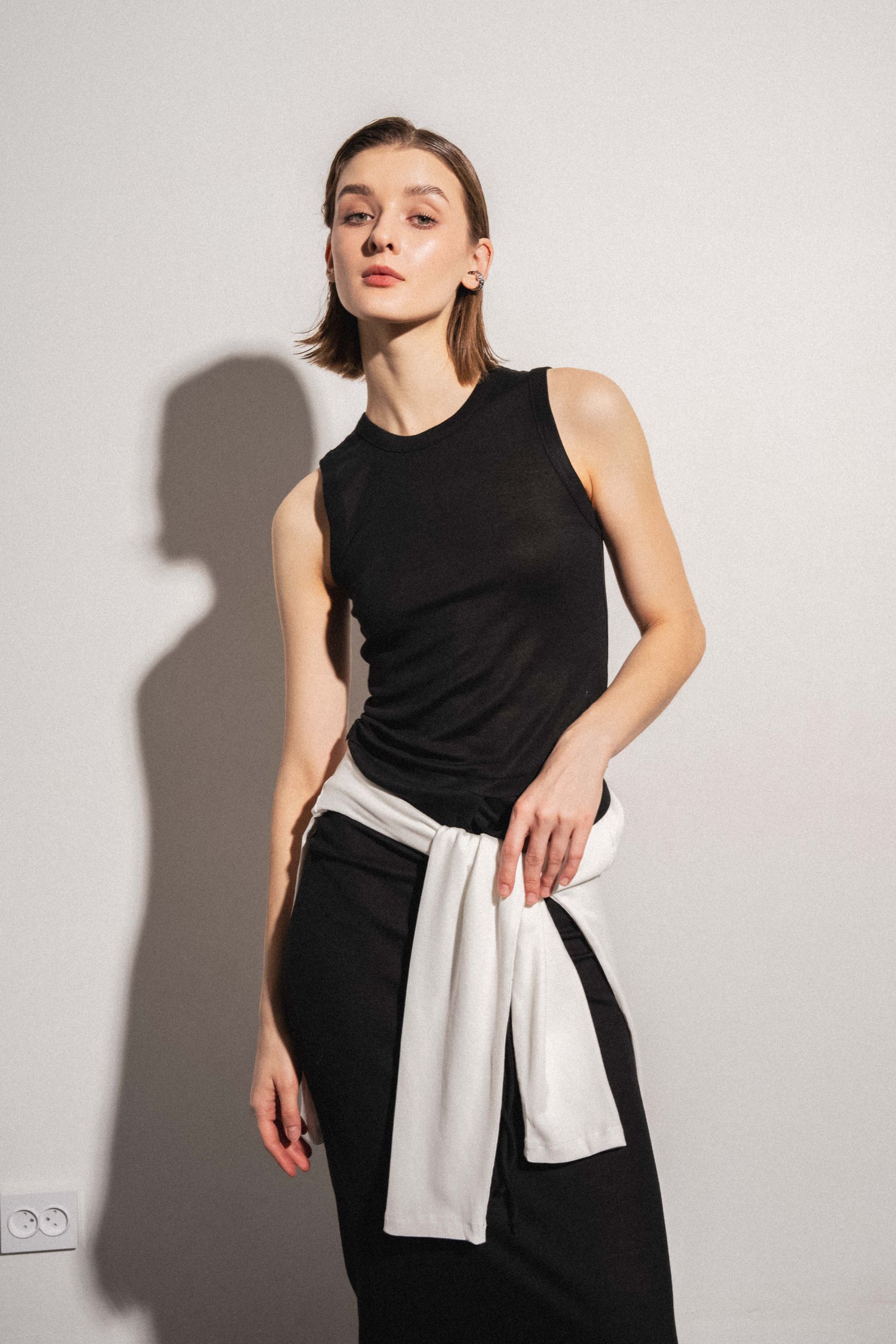 Топ из вязанного трикотажа. Круглый вырез горловины. Приталенный силуэт. Декоративный двойной низ. Декоративная пуговица.
