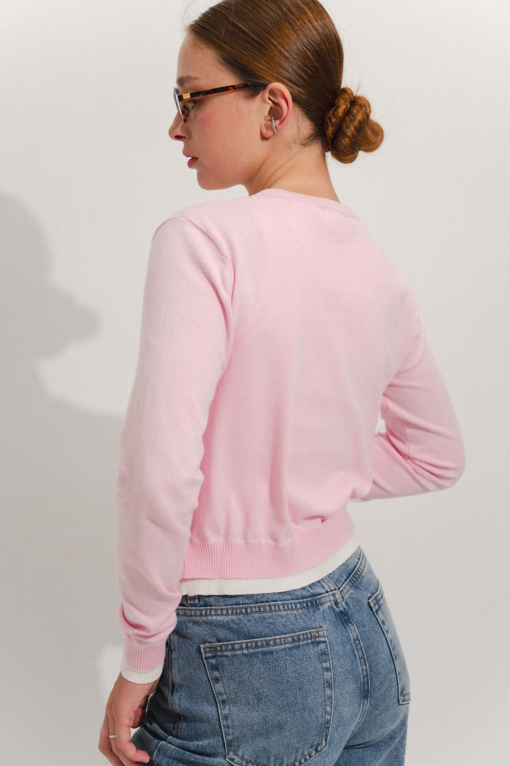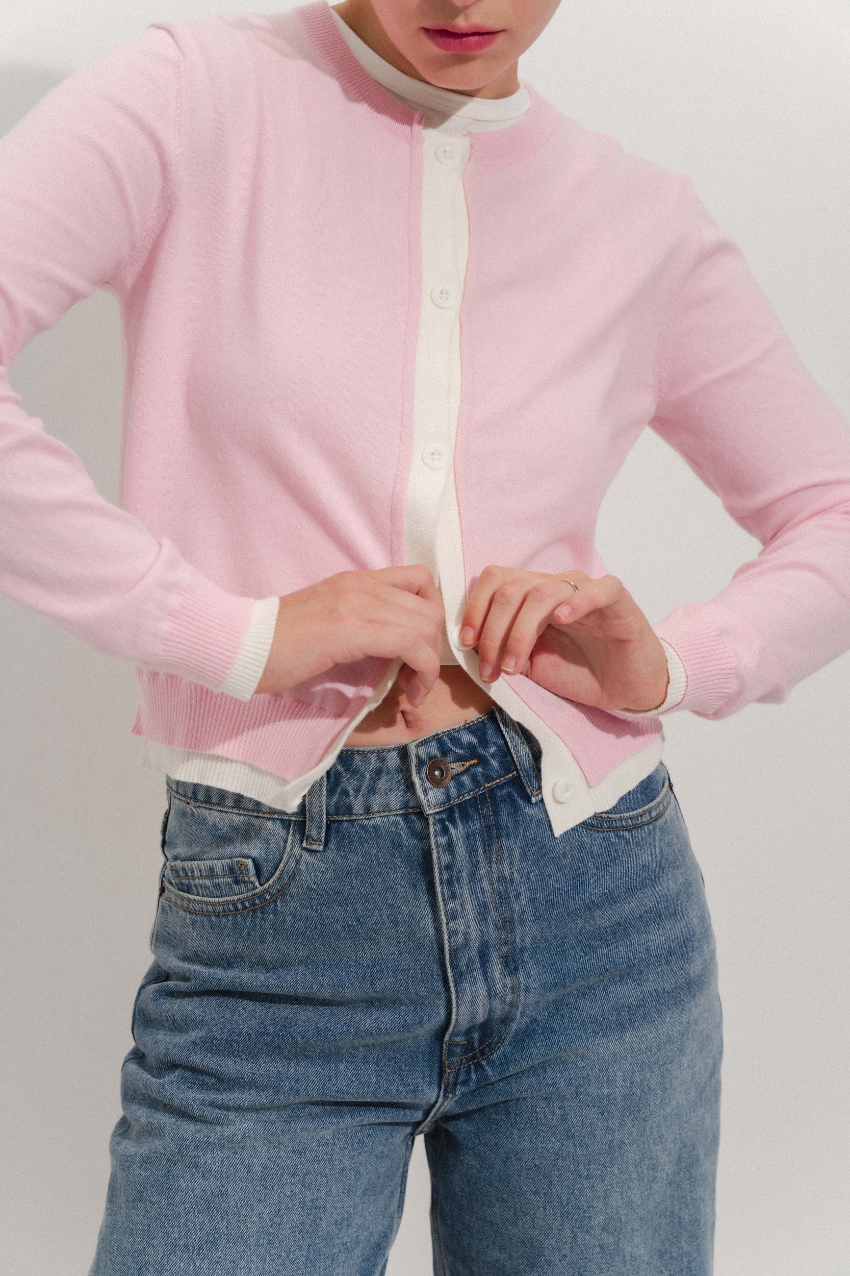 Кардиган прямого кроя из хлопкового трикотажа. Контрастная декоративная вставка. Круглый вырез. Длинные рукава. Застежка на пуговицы.