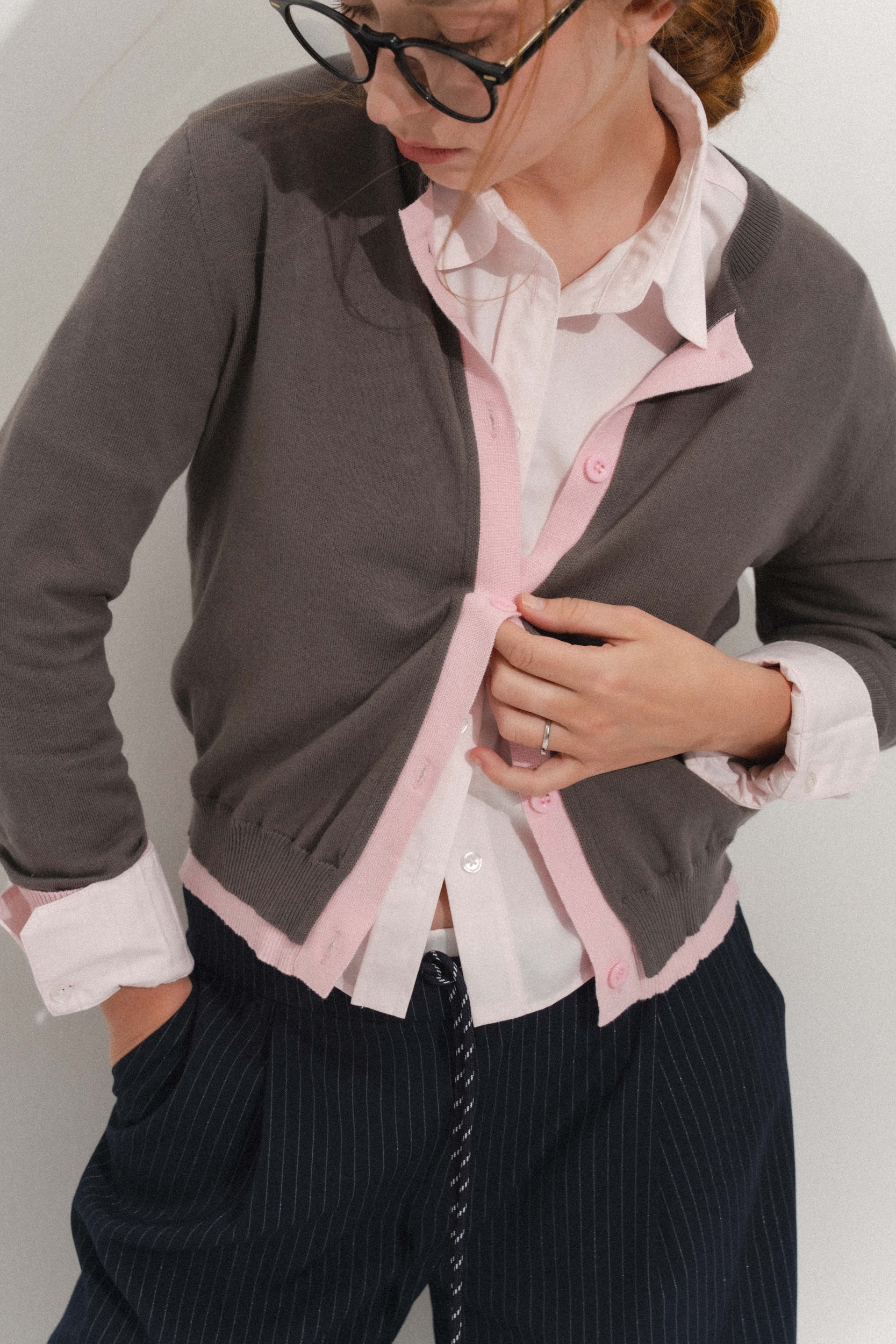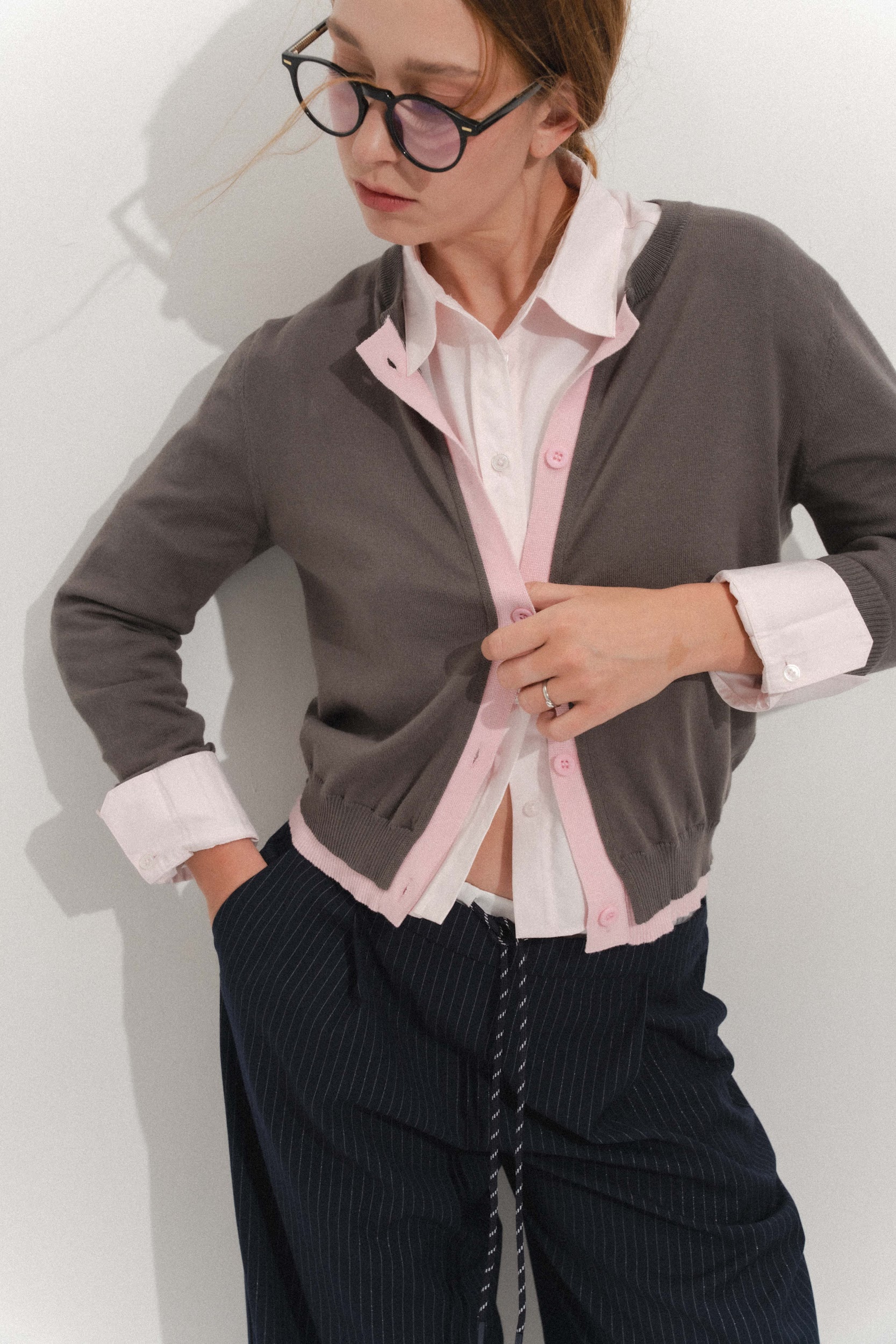 Кардиган прямого кроя из хлопкового трикотажа. Контрастная декоративная вставка. Круглый вырез. Длинные рукава. Застежка на пуговицы.