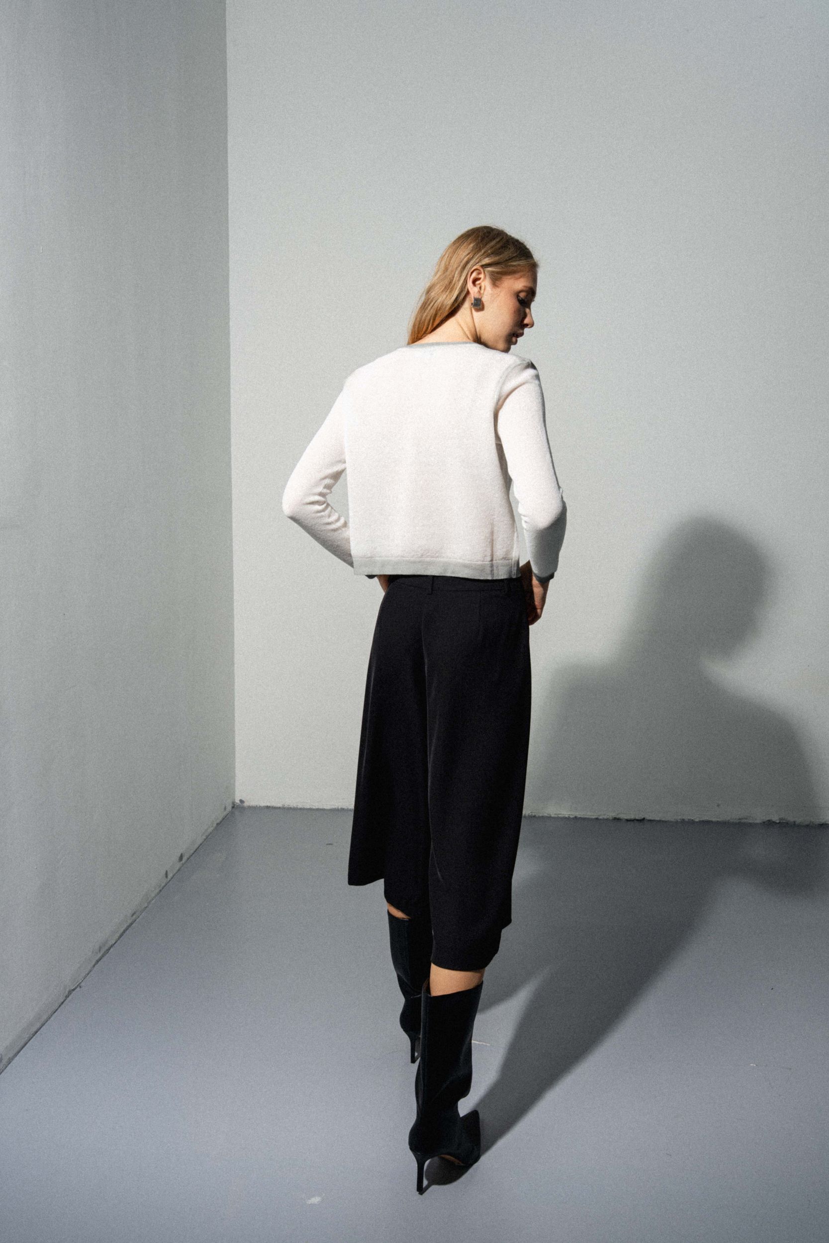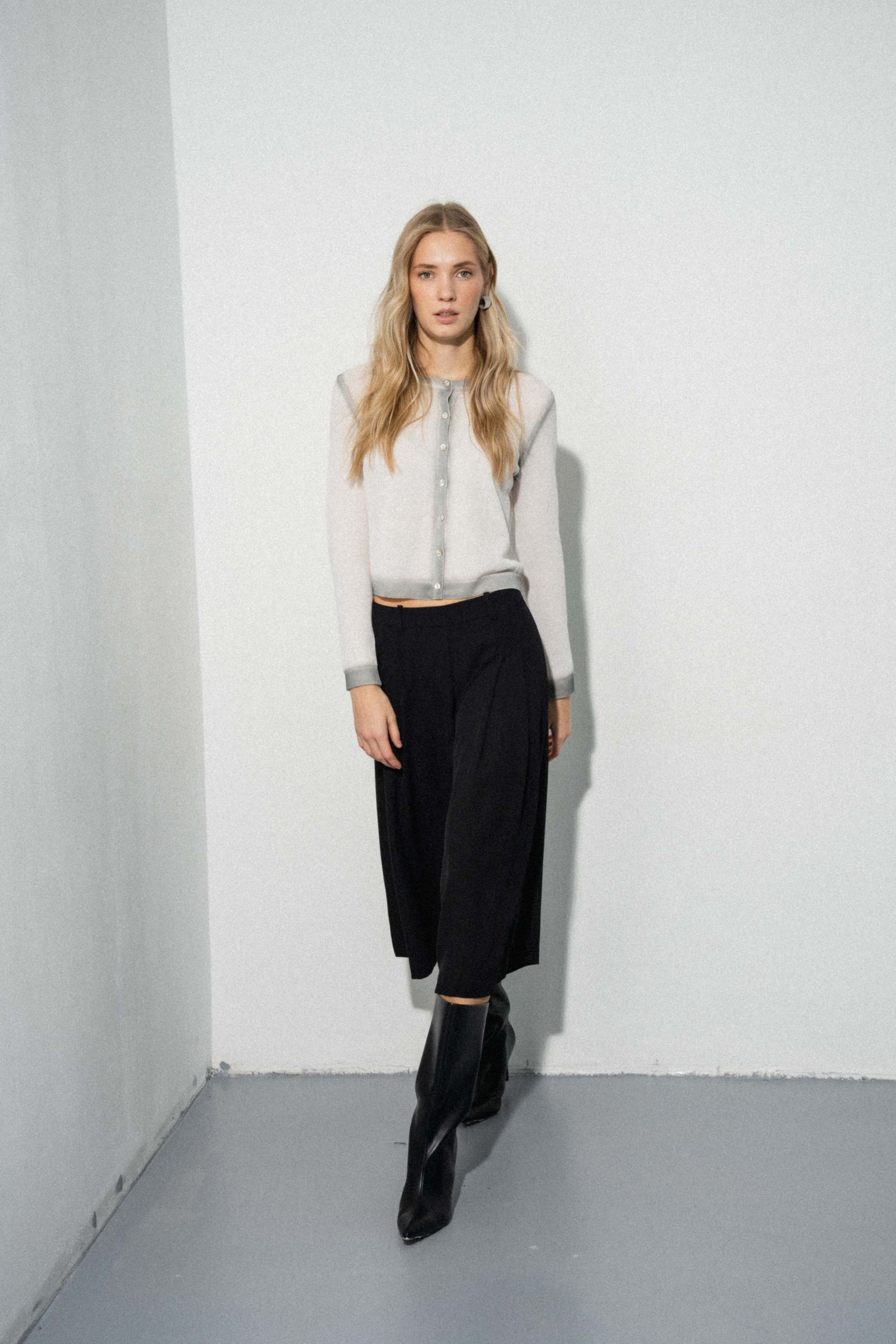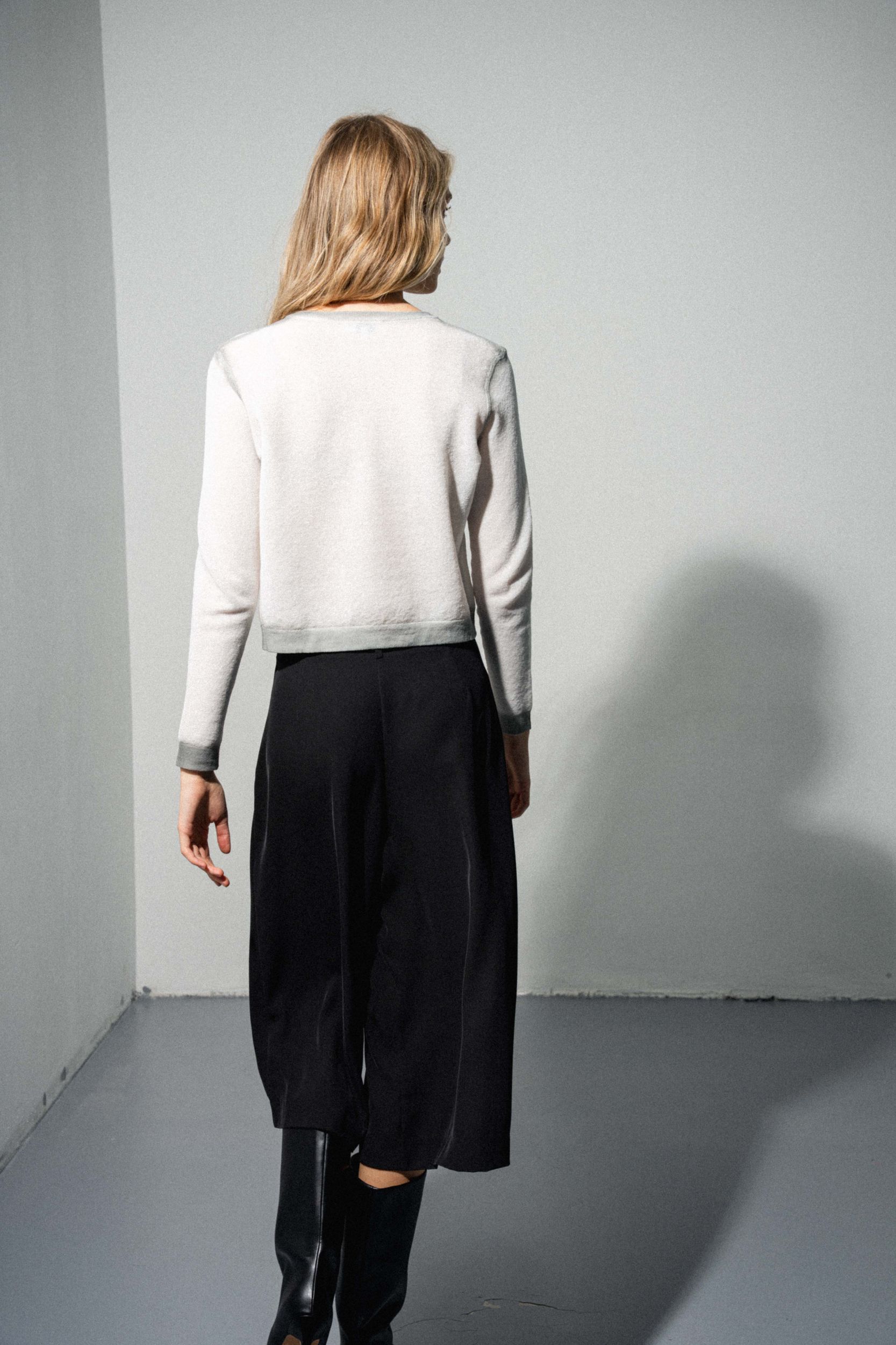 Кардиган с круглым вырезом и длинным рукавом. Градиент на планке, вороте и рукаве