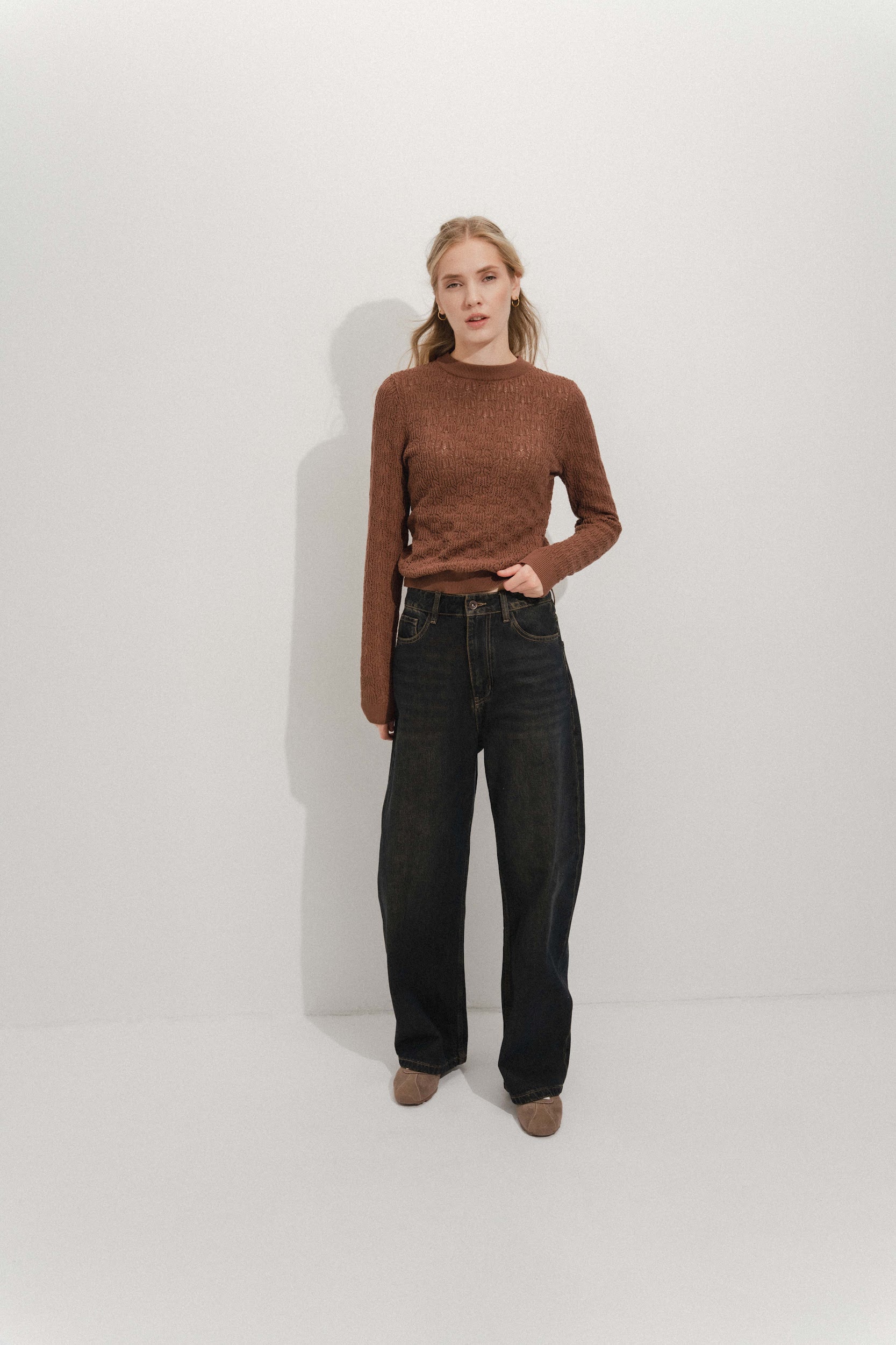 Джемпер из хлопка с добавлением эластичных волокон. Ажурная вязка с узором. Круглый вырез. Длинные рукава.