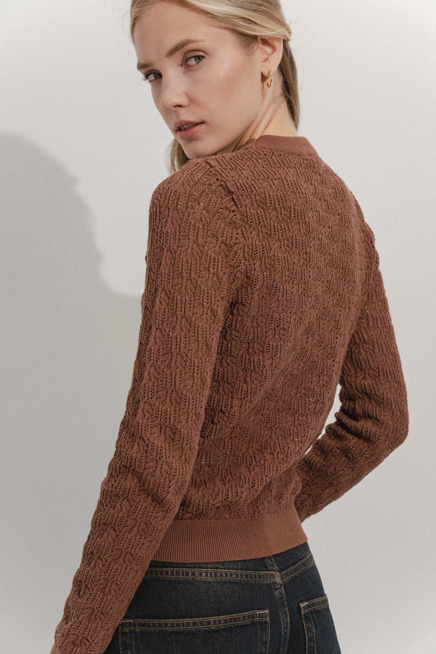 Джемпер из хлопка с добавлением эластичных волокон. Ажурная вязка с  узором. Круглый вырез. Длинные рукава.