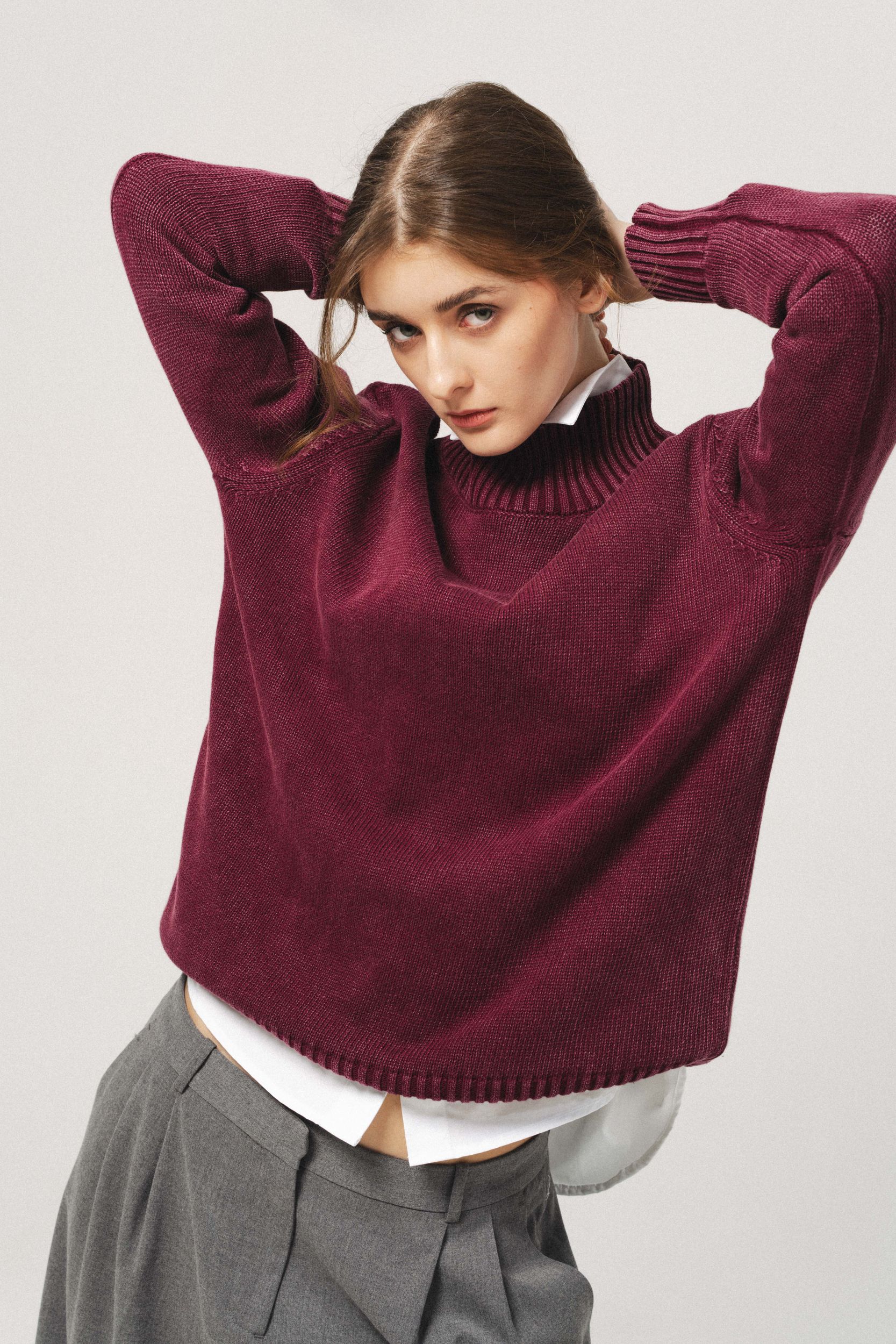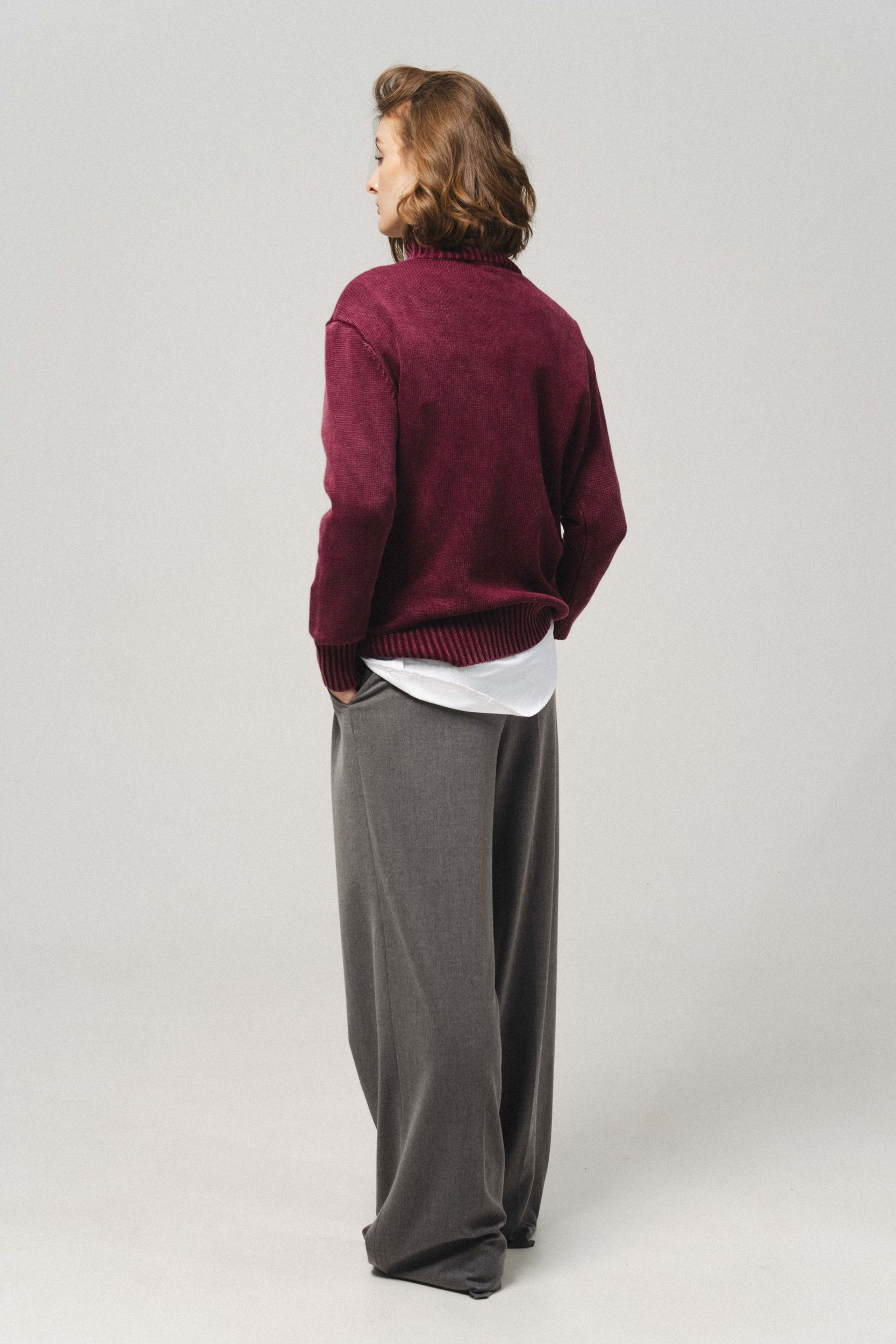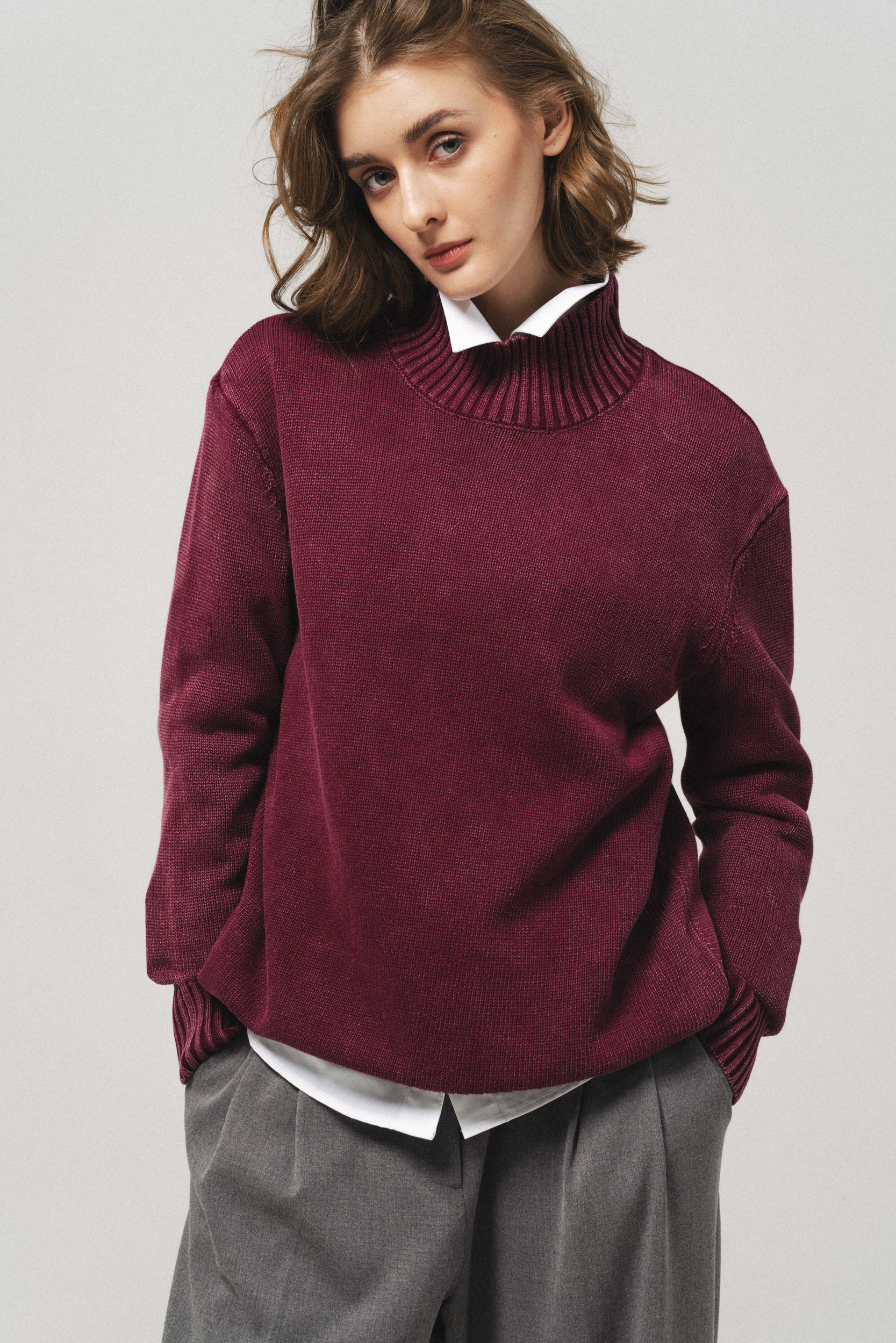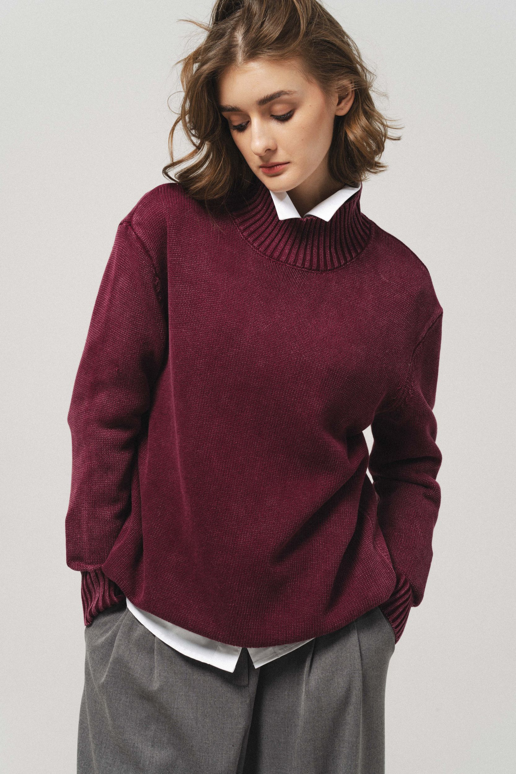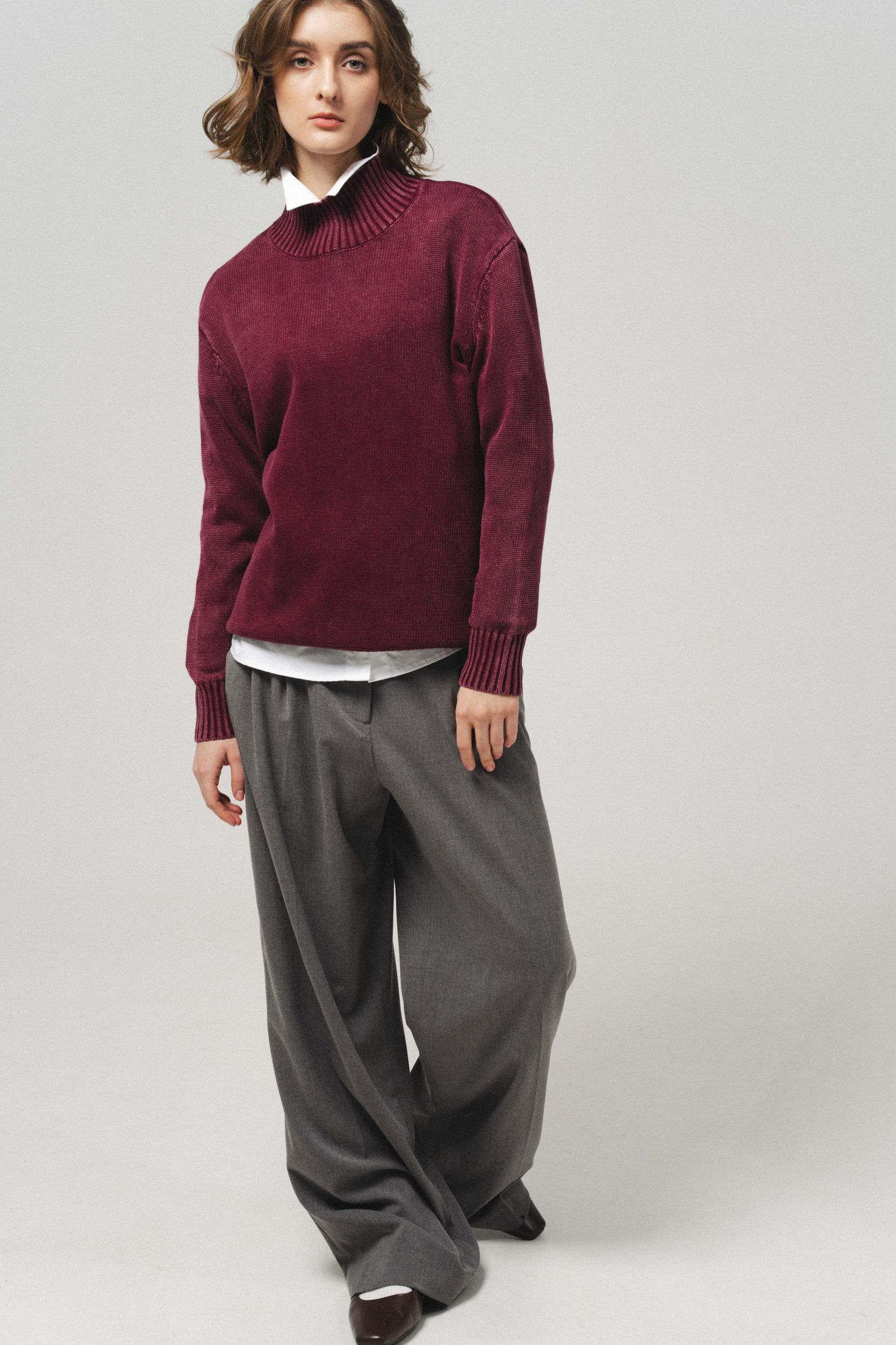 Джемпер оверсайз из хлопка, с воротником стойкой, цвет эффектом кислотной стирки. Длинный рукав.