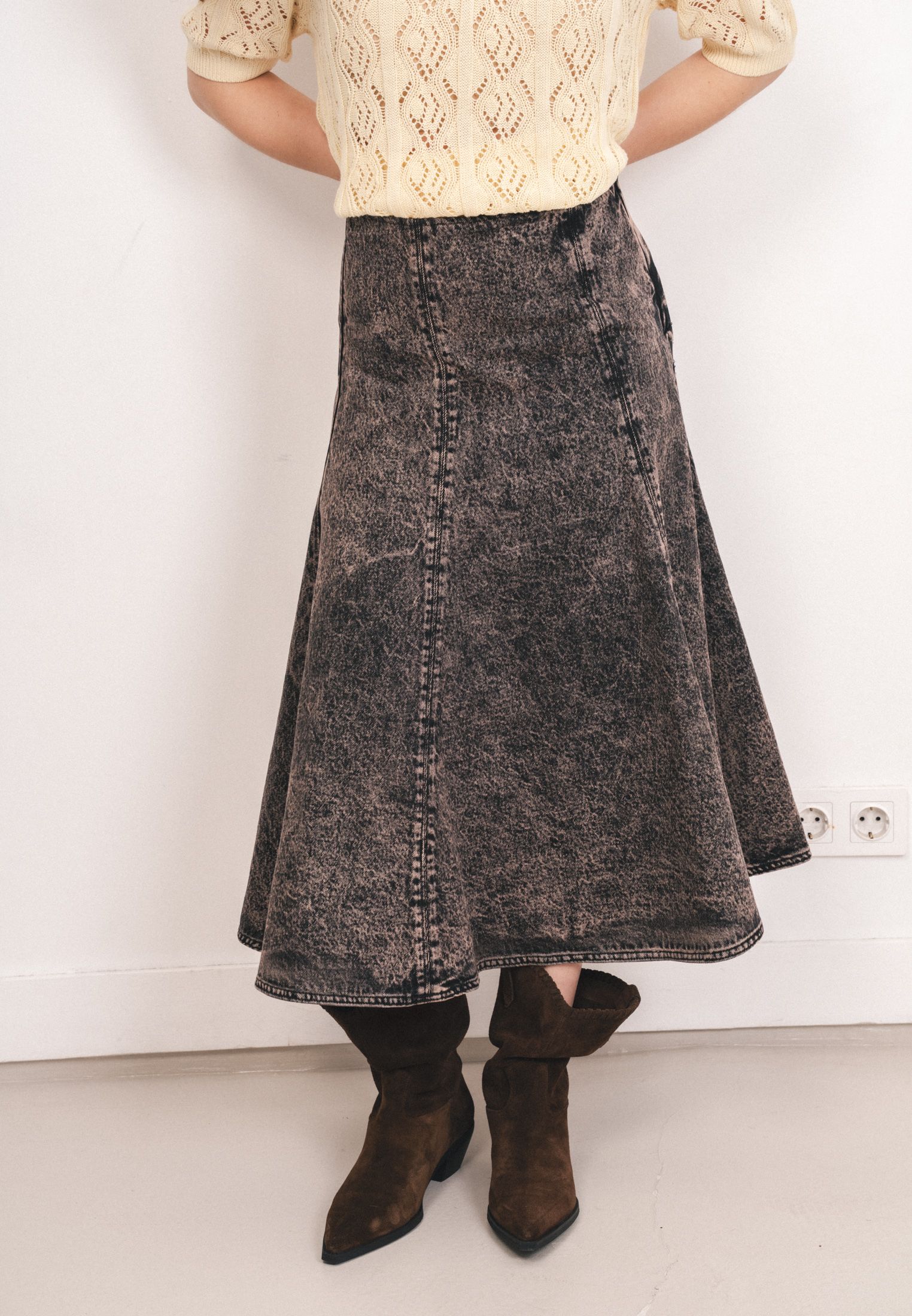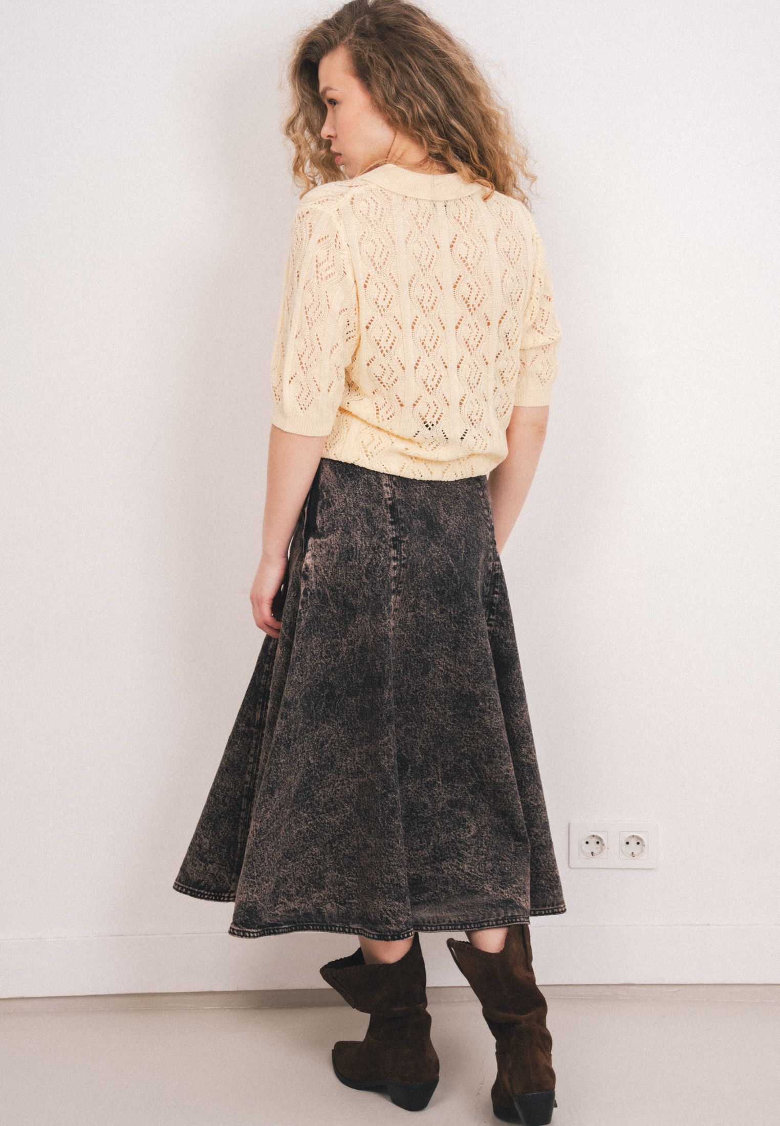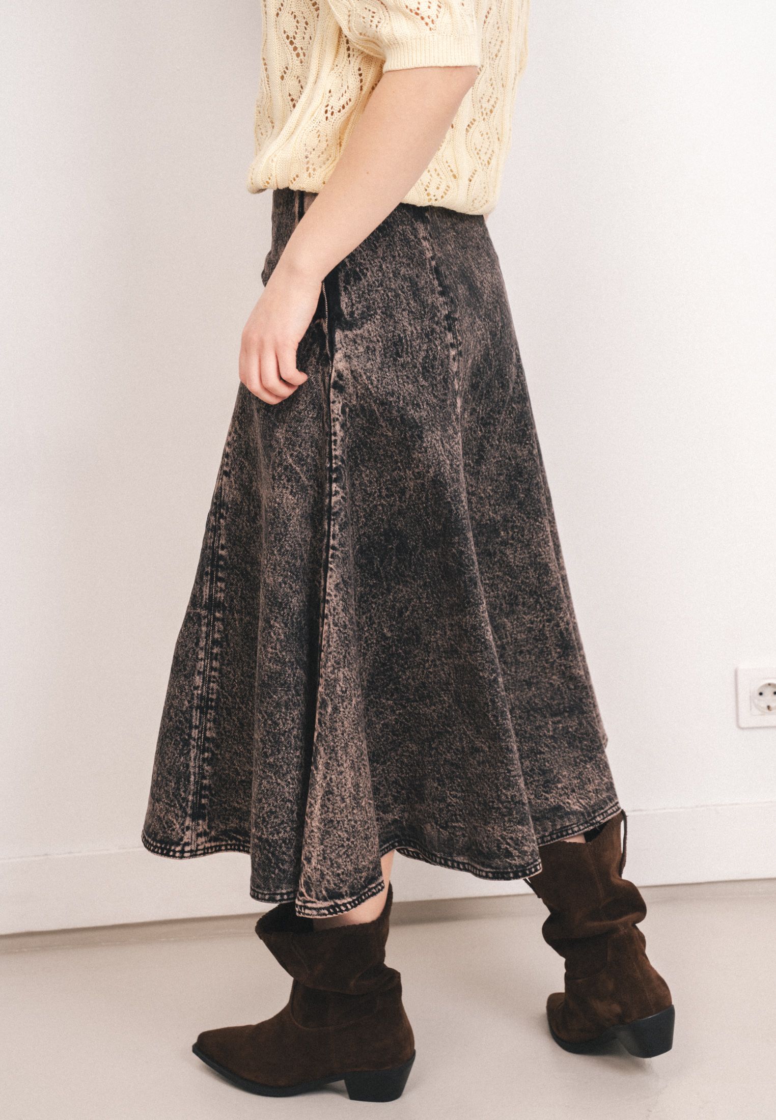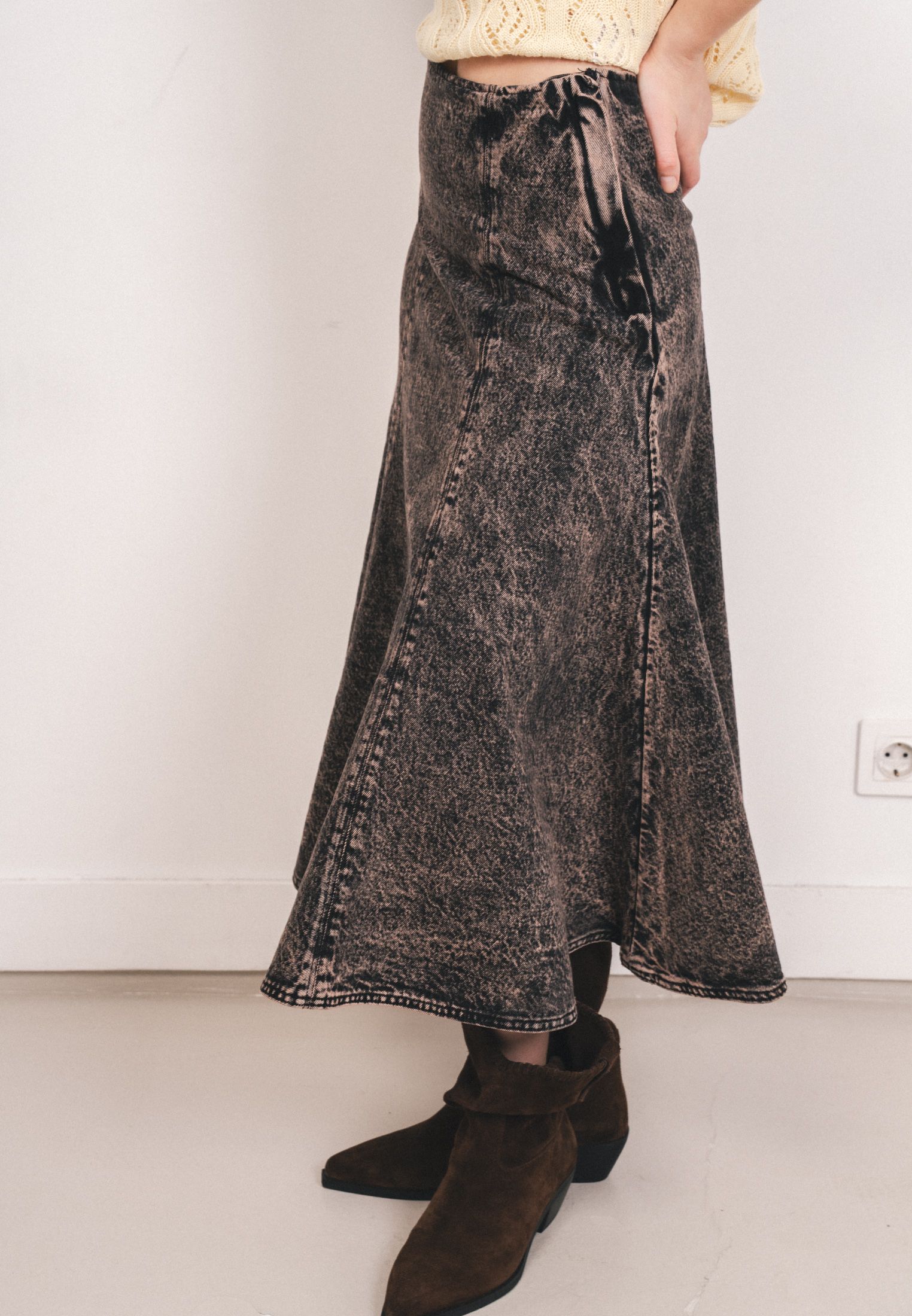 Юбка длиной до щиколотки из плотного хлопкового денима, расклешенного силуэта. Талия стандартной высоты, потайная молния сбоку.