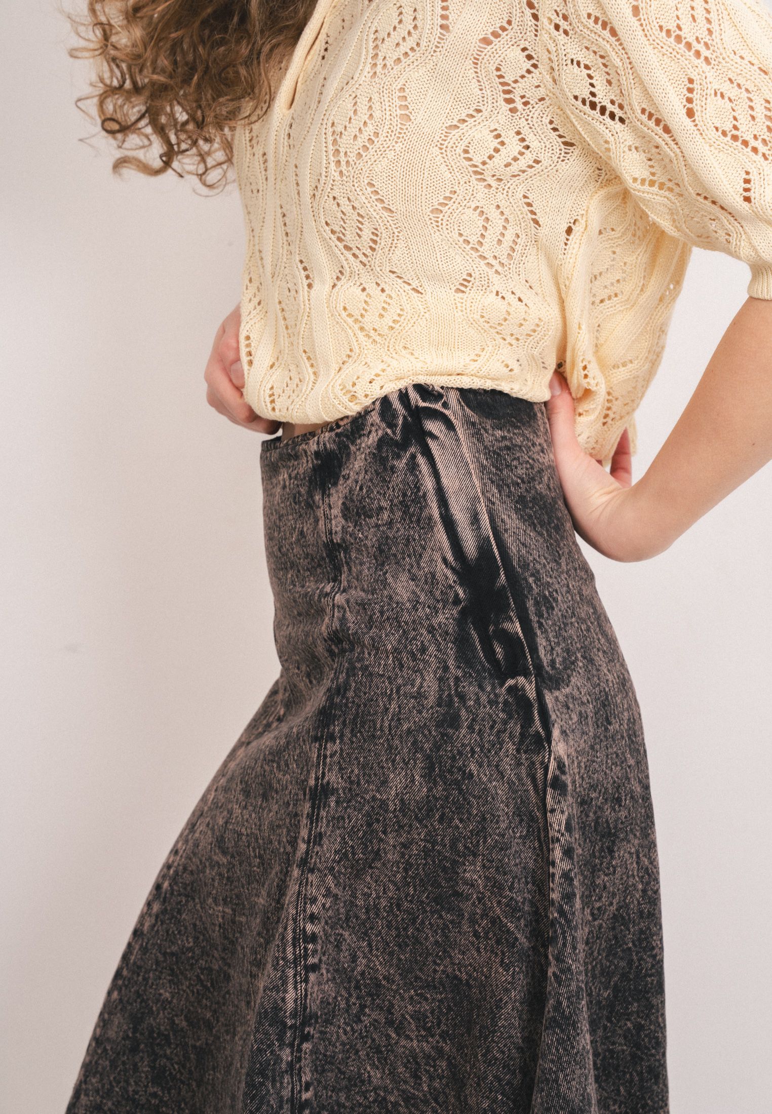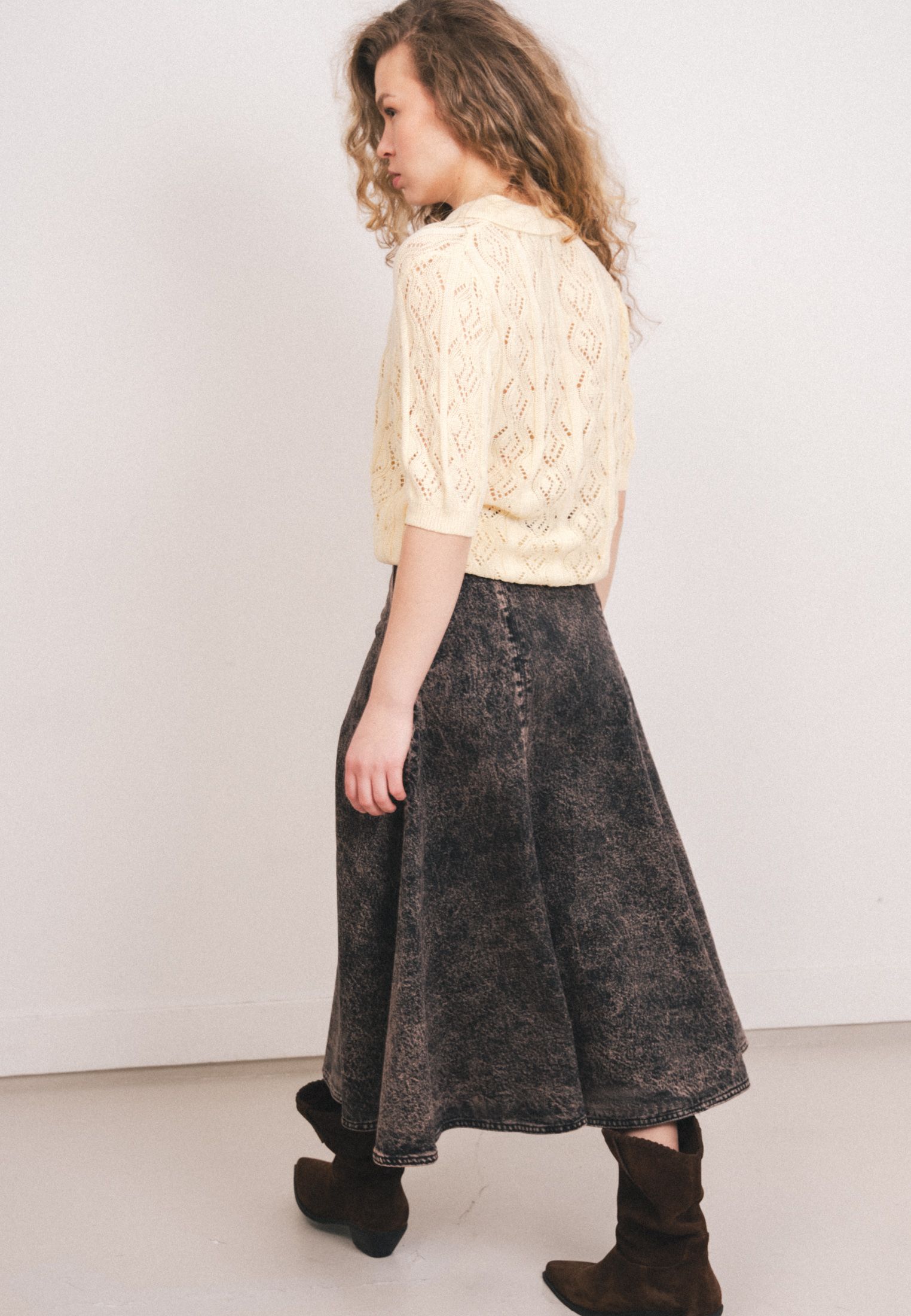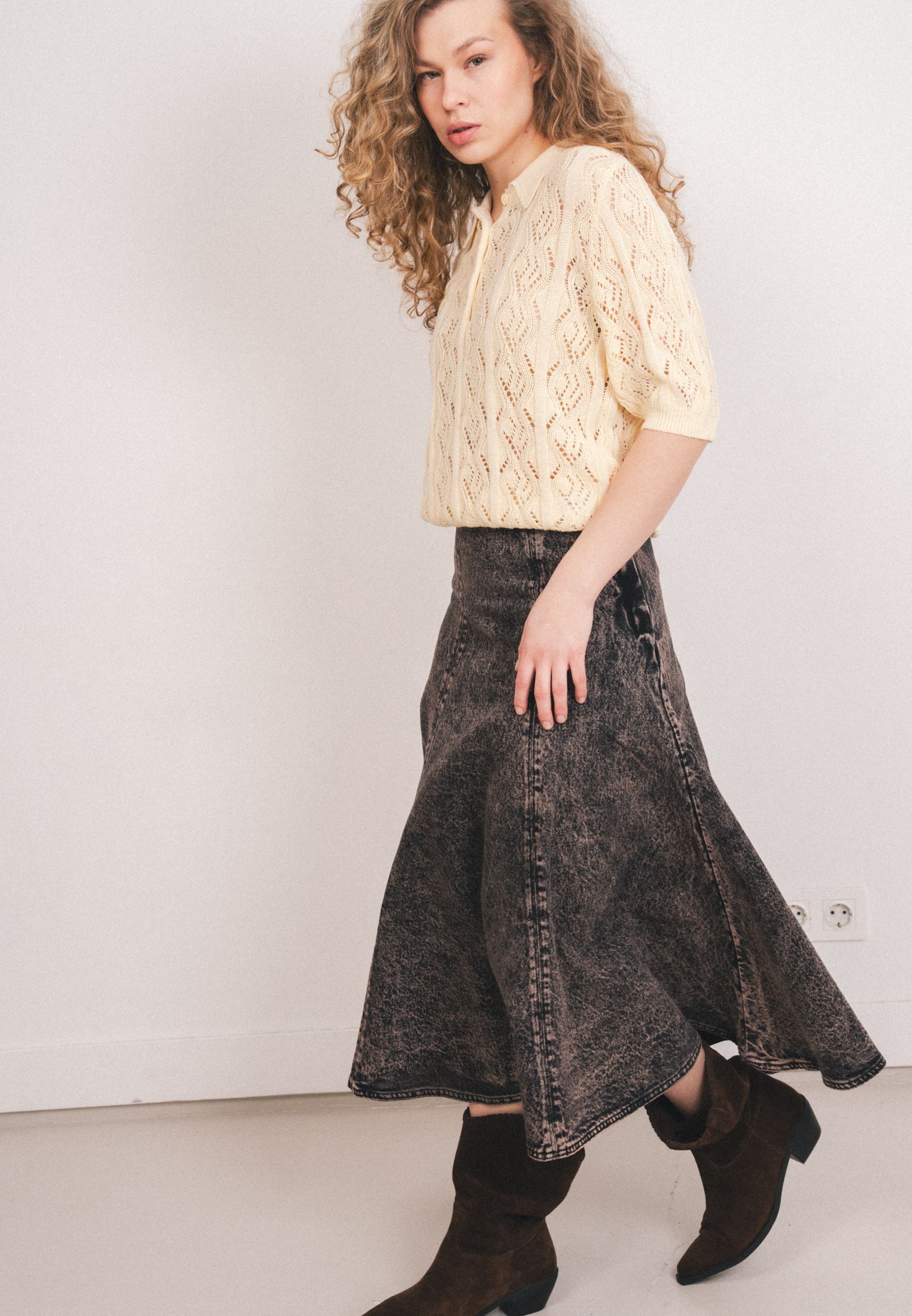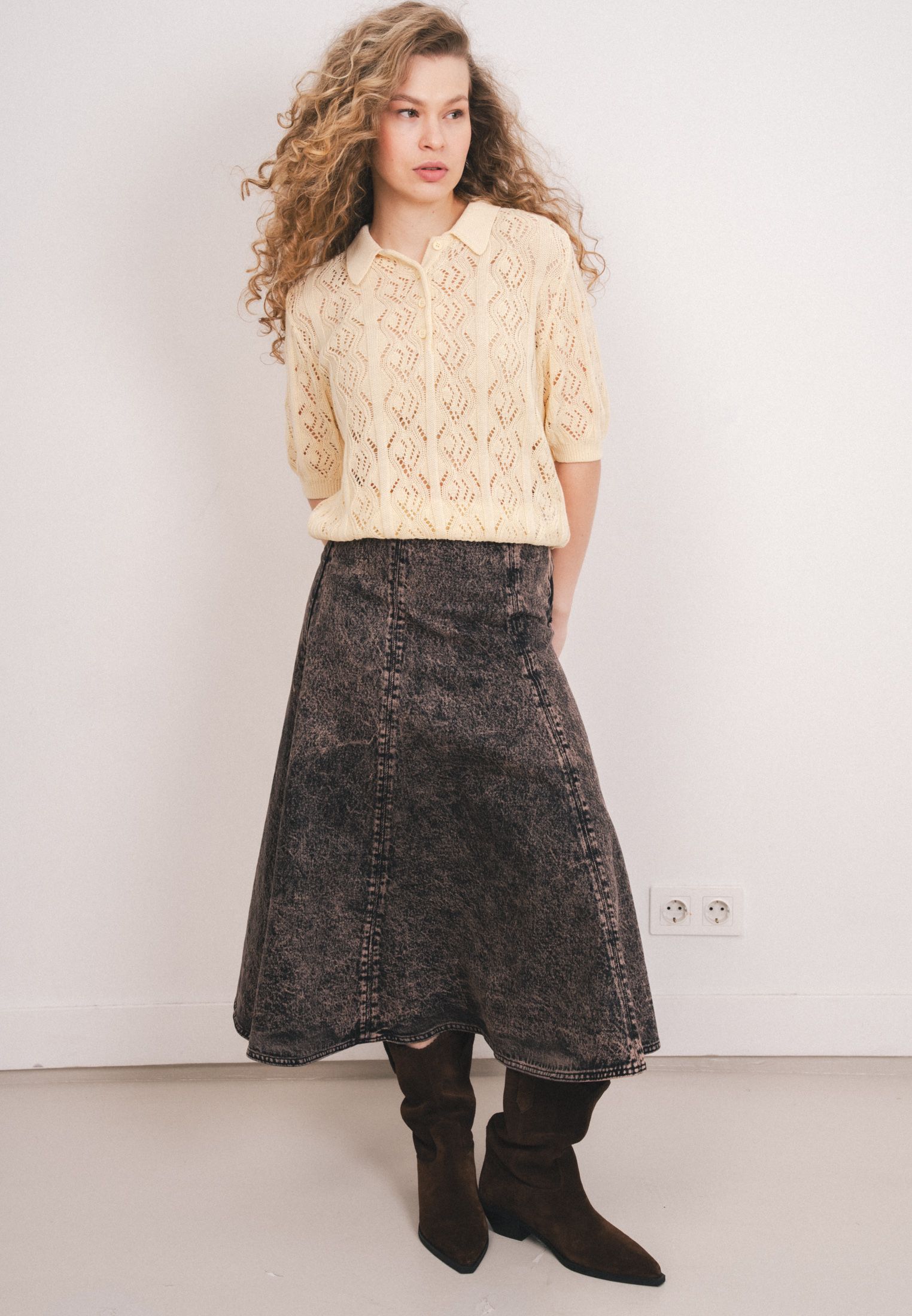 Юбка длиной до щиколотки из плотного хлопкового денима, расклешенного силуэта. Талия стандартной высоты, потайная молния сбоку.