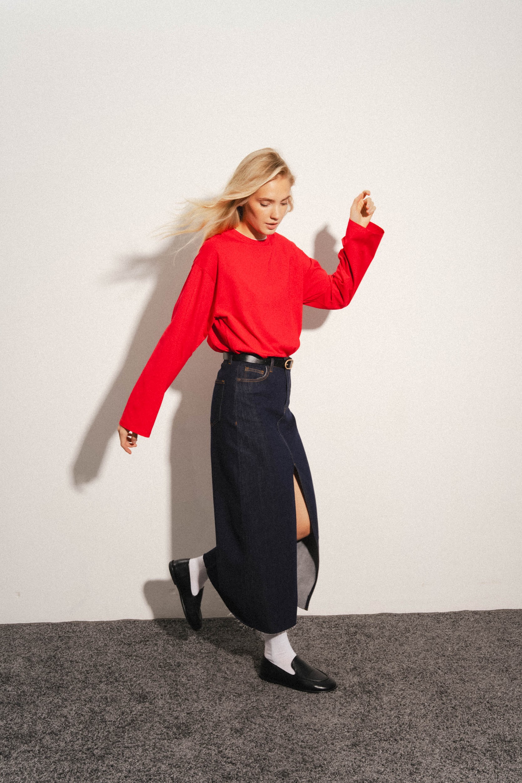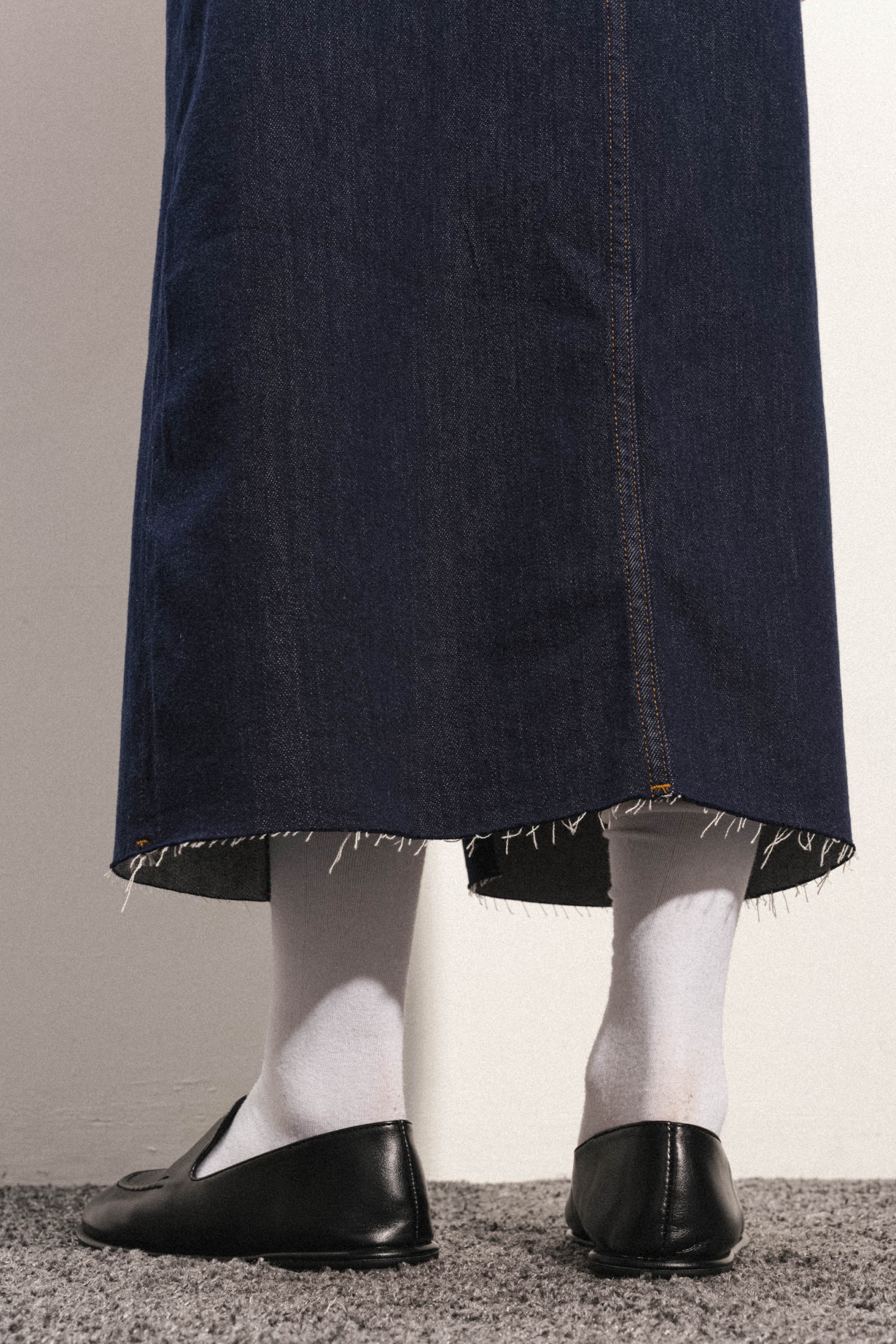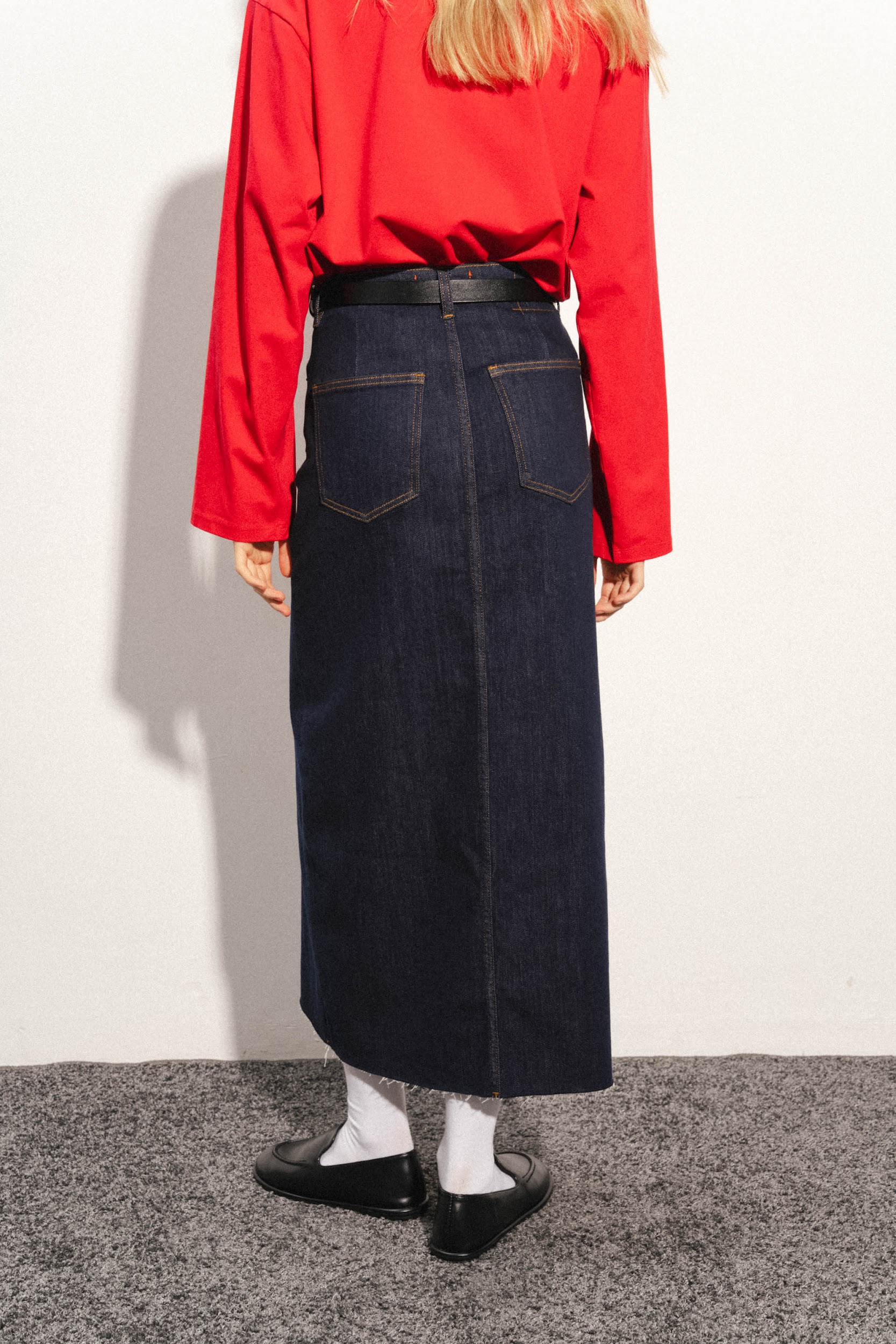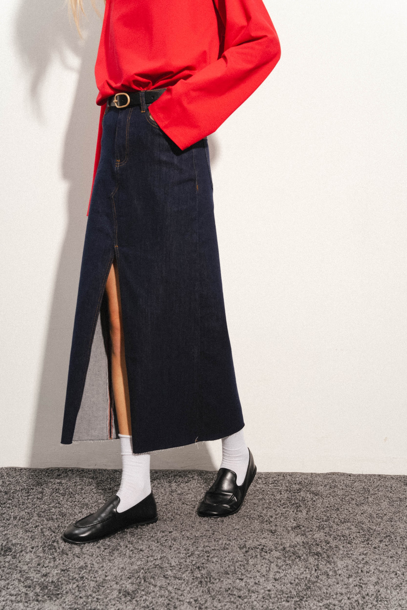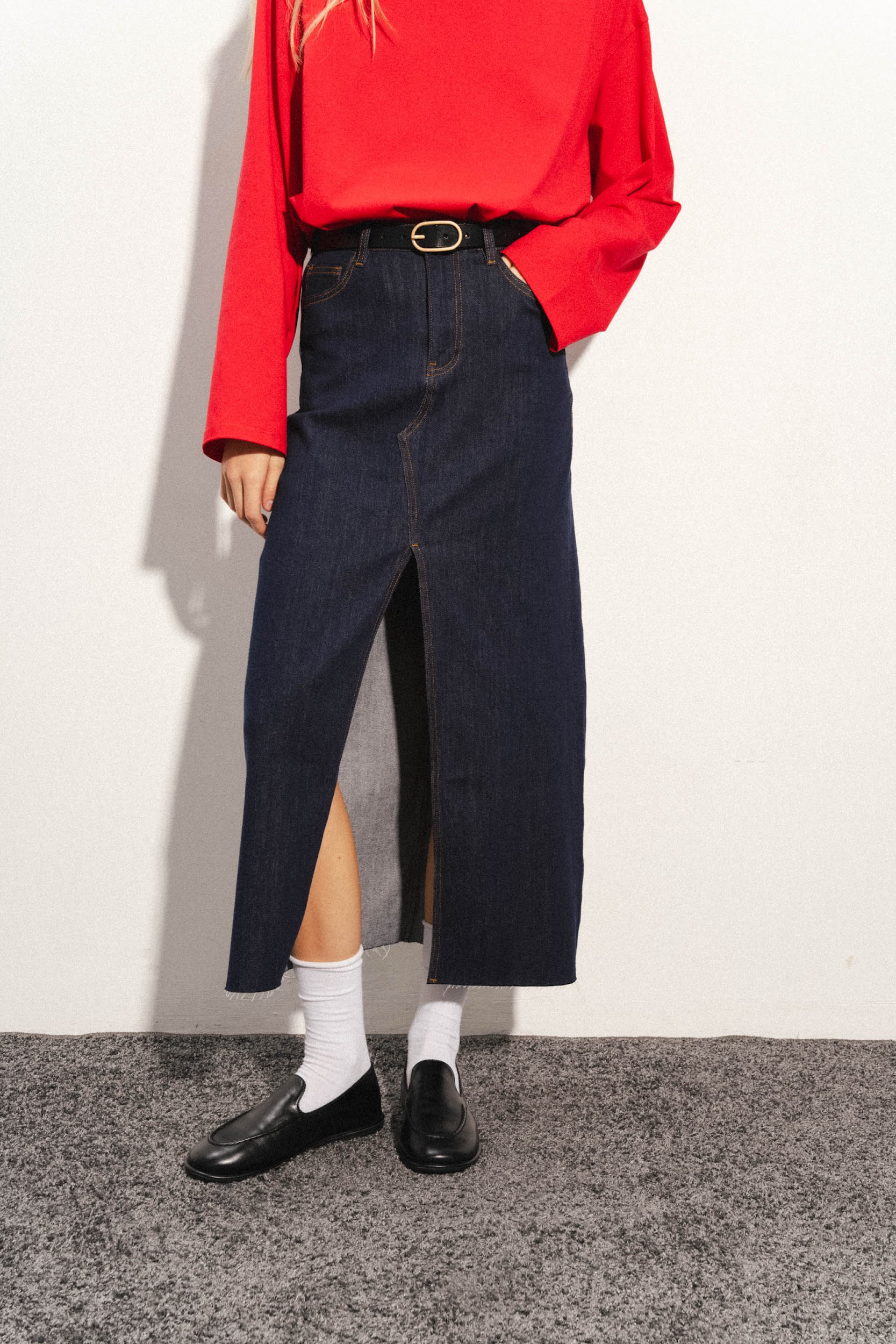 Юбка миди с завышенной талией. Разрез спереди. Необработанный низ. Пять карманов. Застежка спереди на молнию и пуговицы.