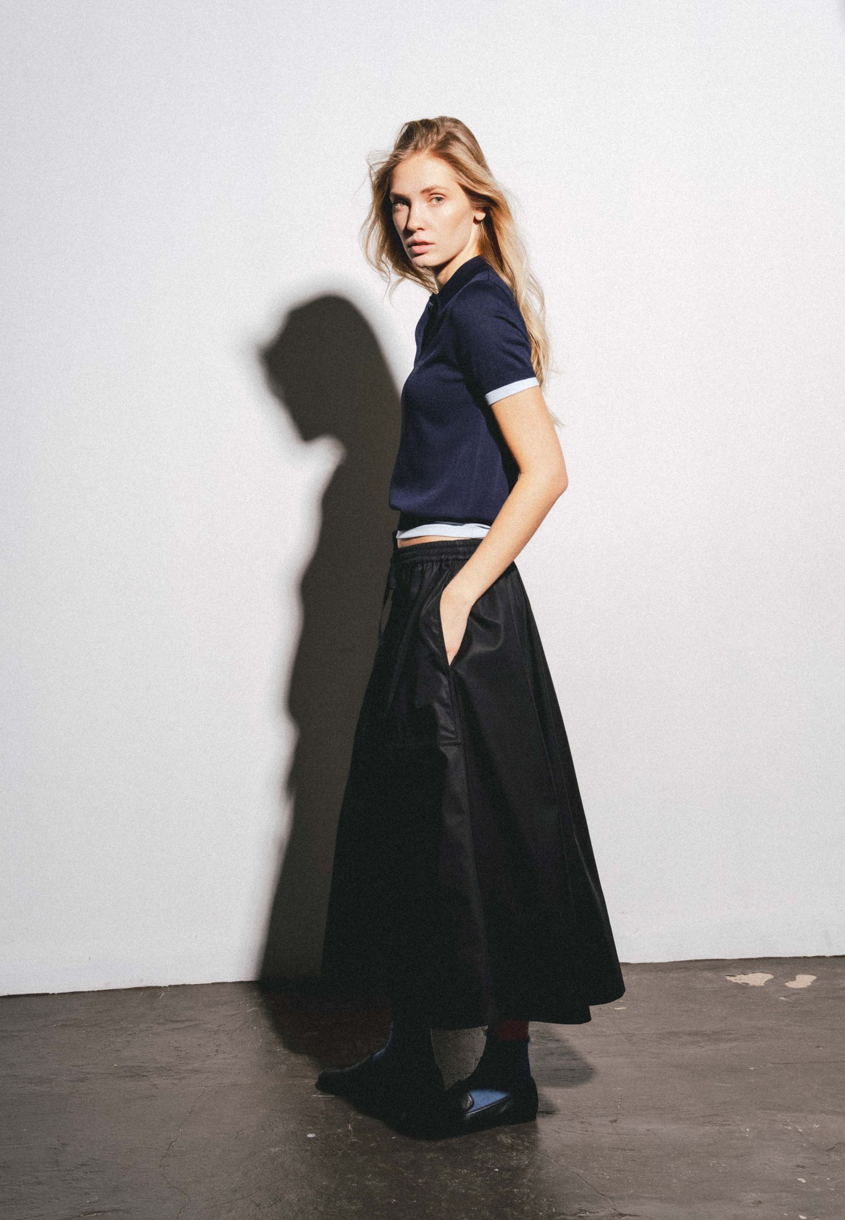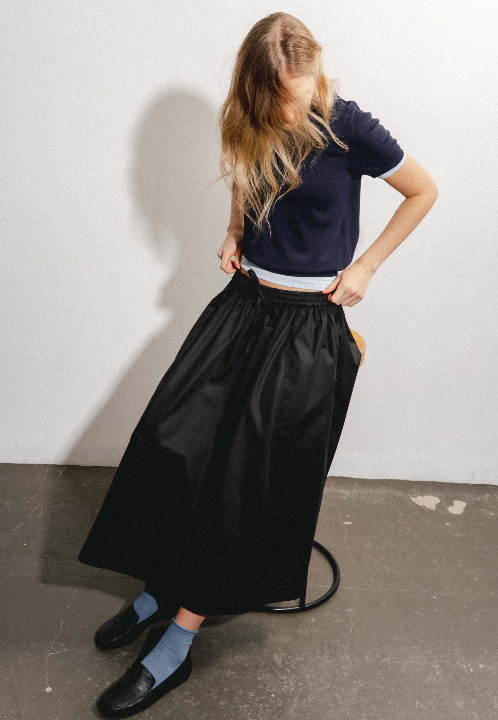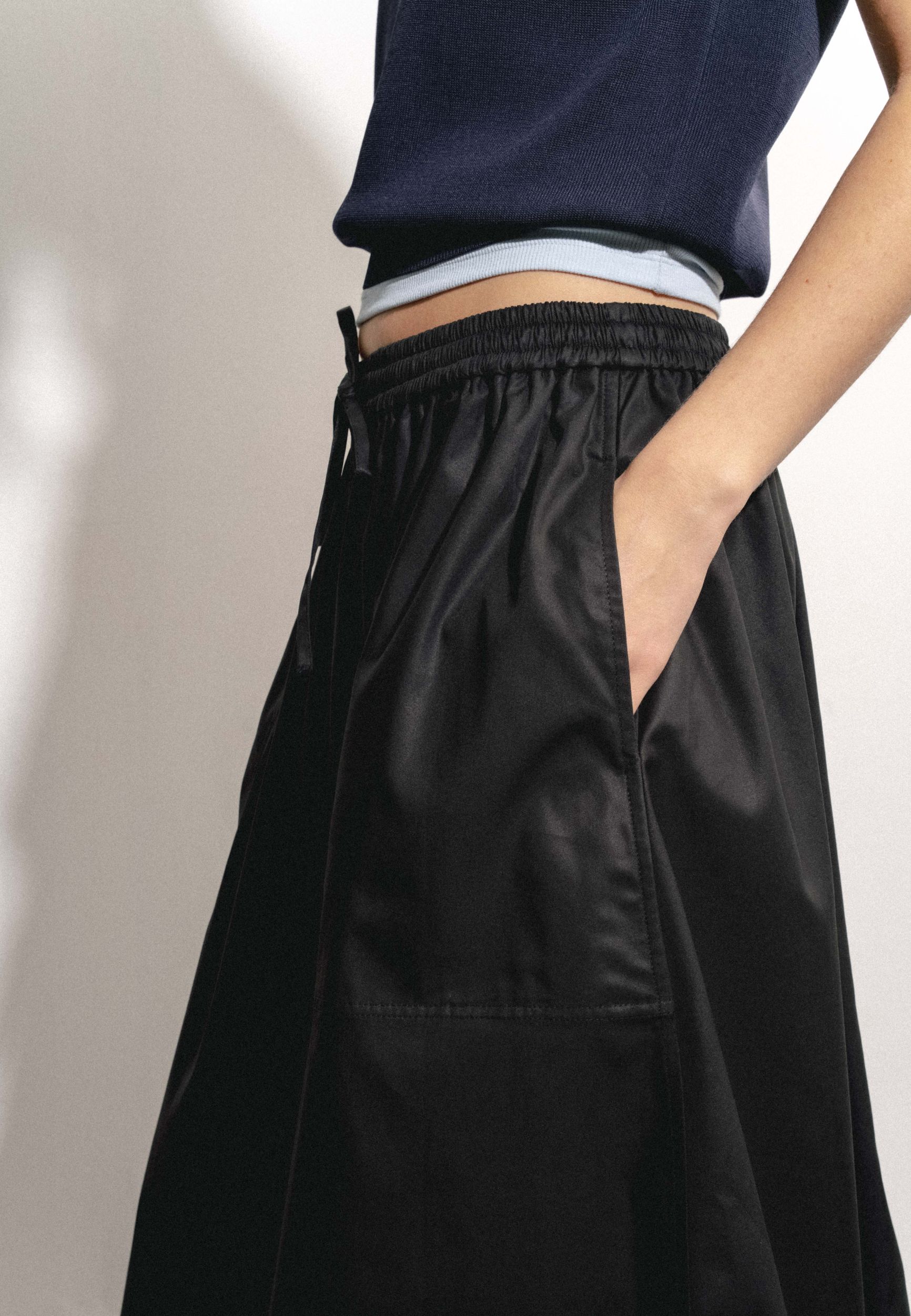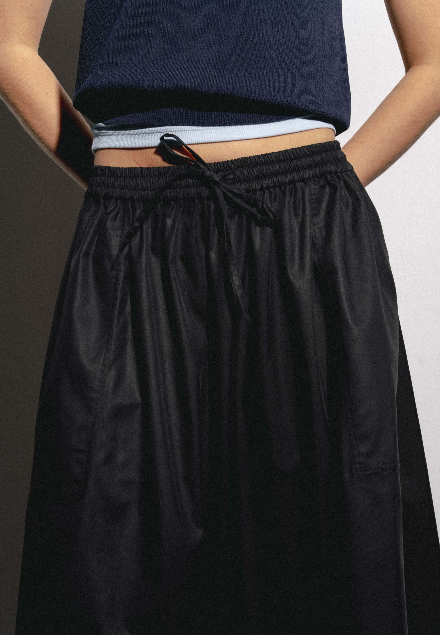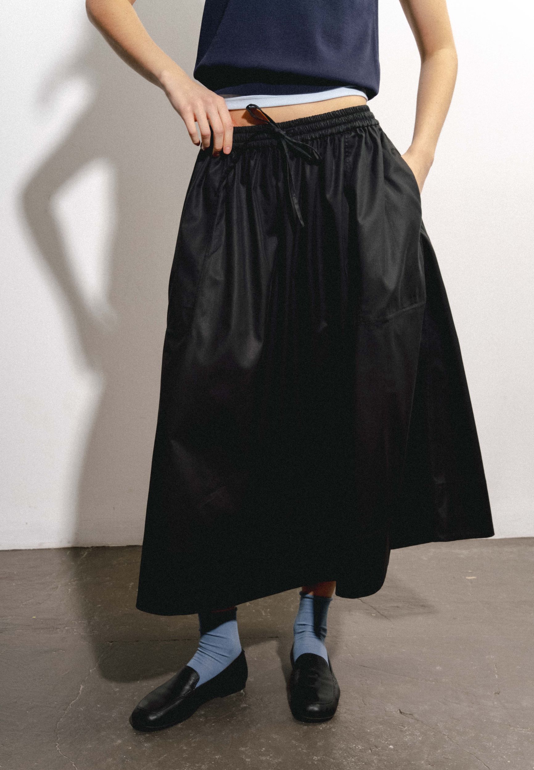 Юбка объёмного силуэта с завязками на талии и прорезными карманами по бокам. Свободный крой, застежка на шнурок.