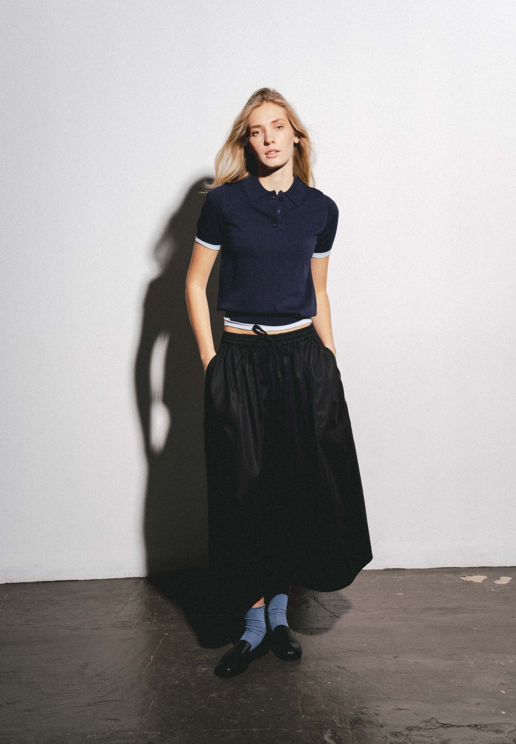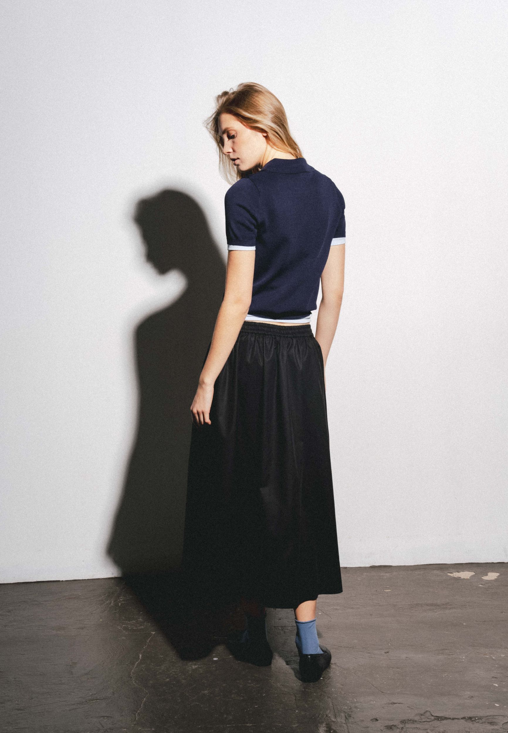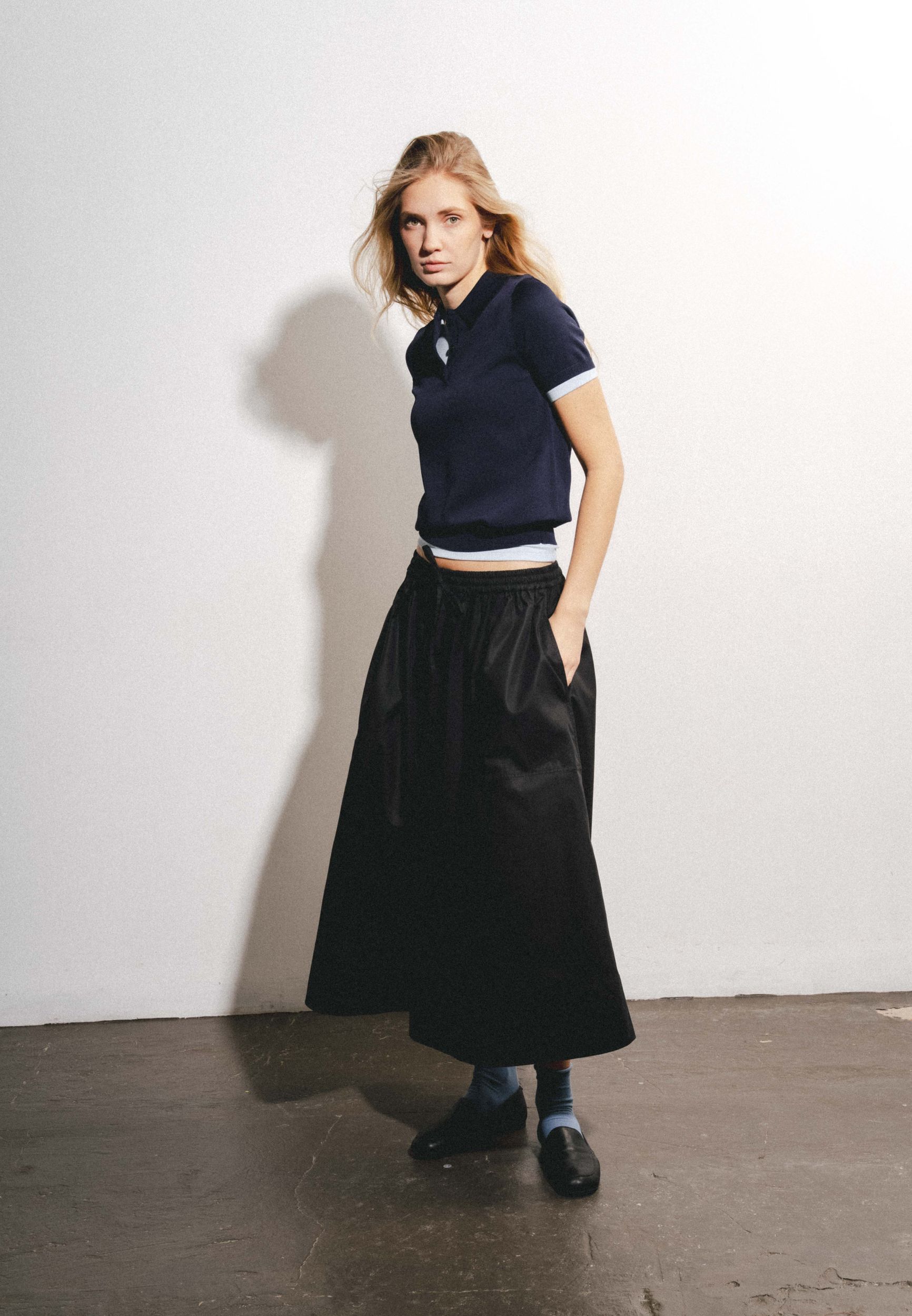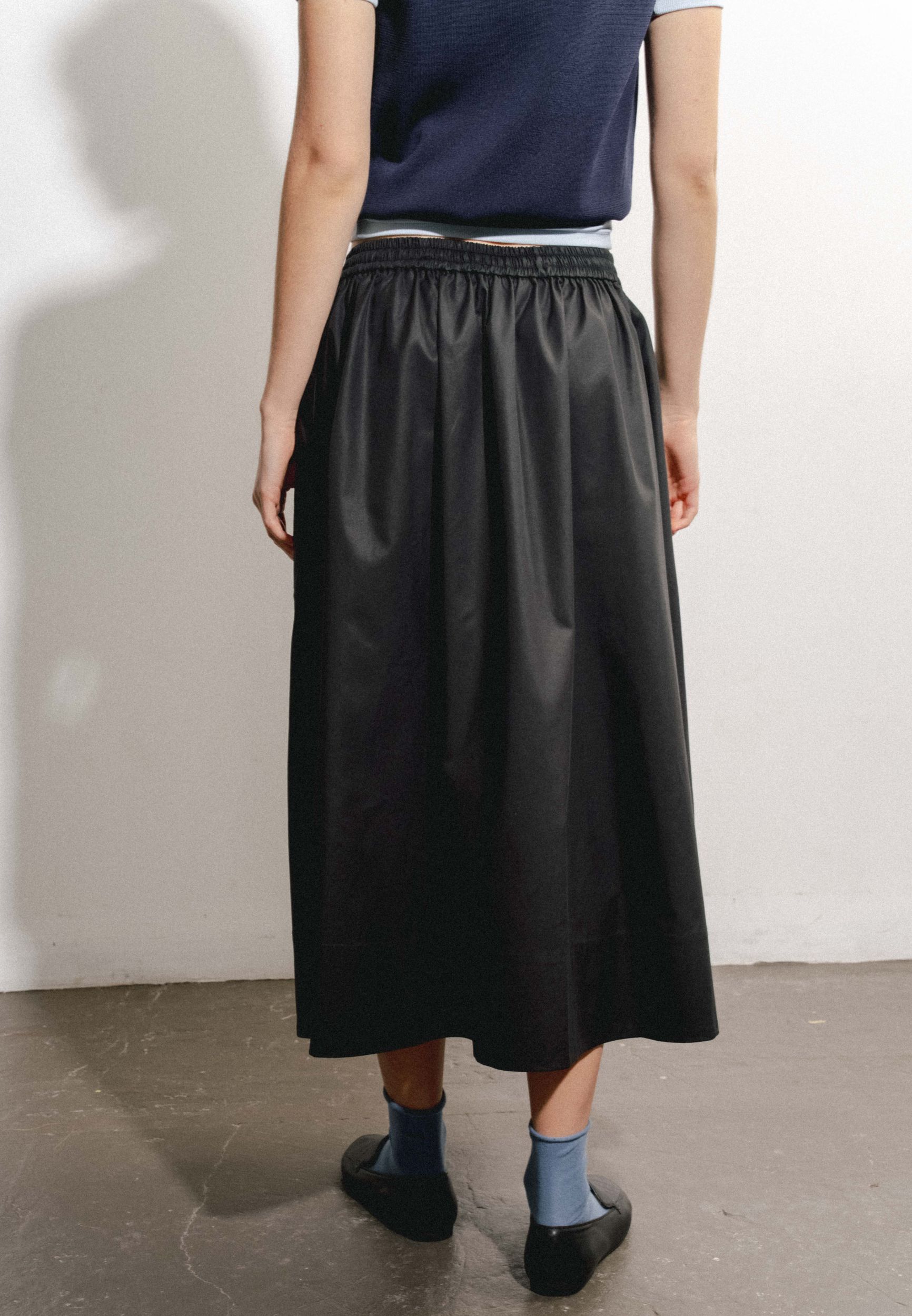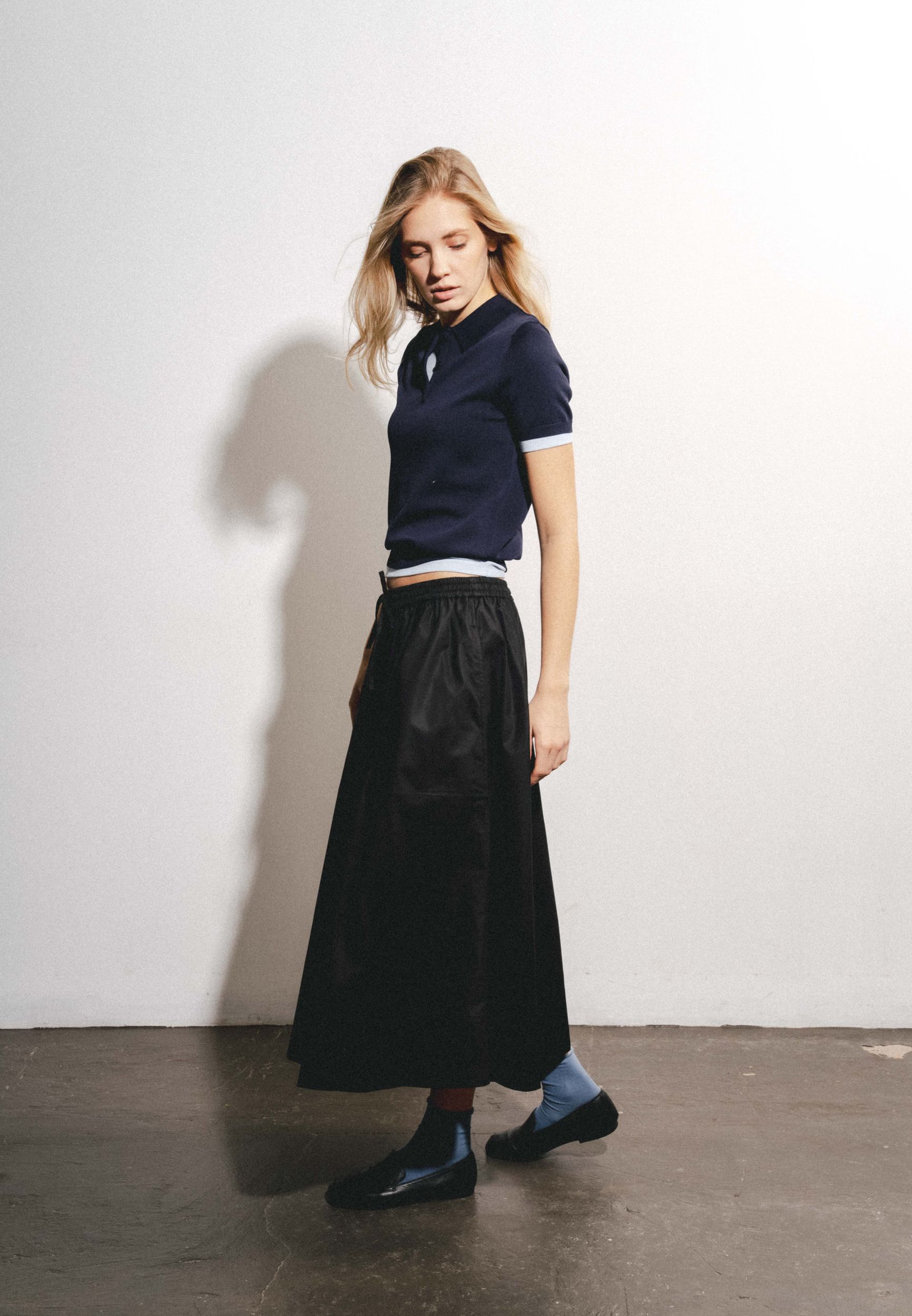 Юбка объёмного силуэта с завязками на талии и прорезными карманами по бокам. Свободный крой, застежка на шнурок.