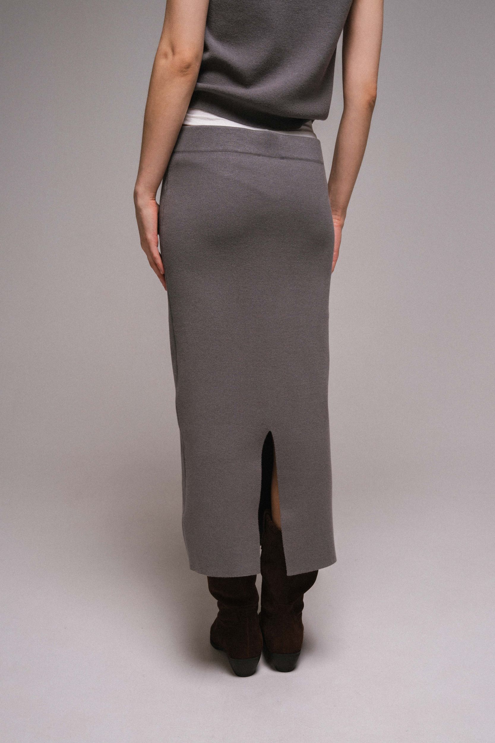Юбка миди однотонная, с высокой талией, эластичным поясом и шлицей сзади по подолу.