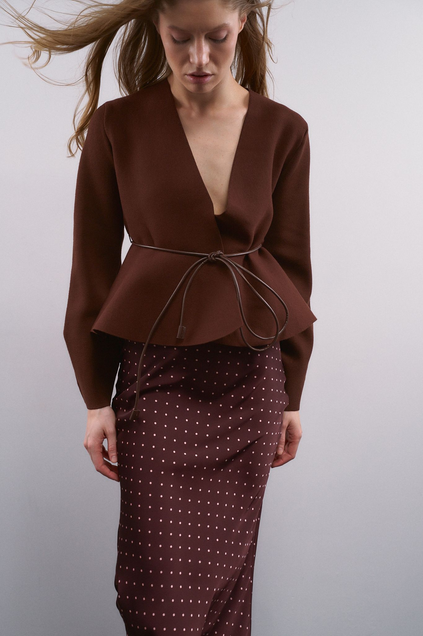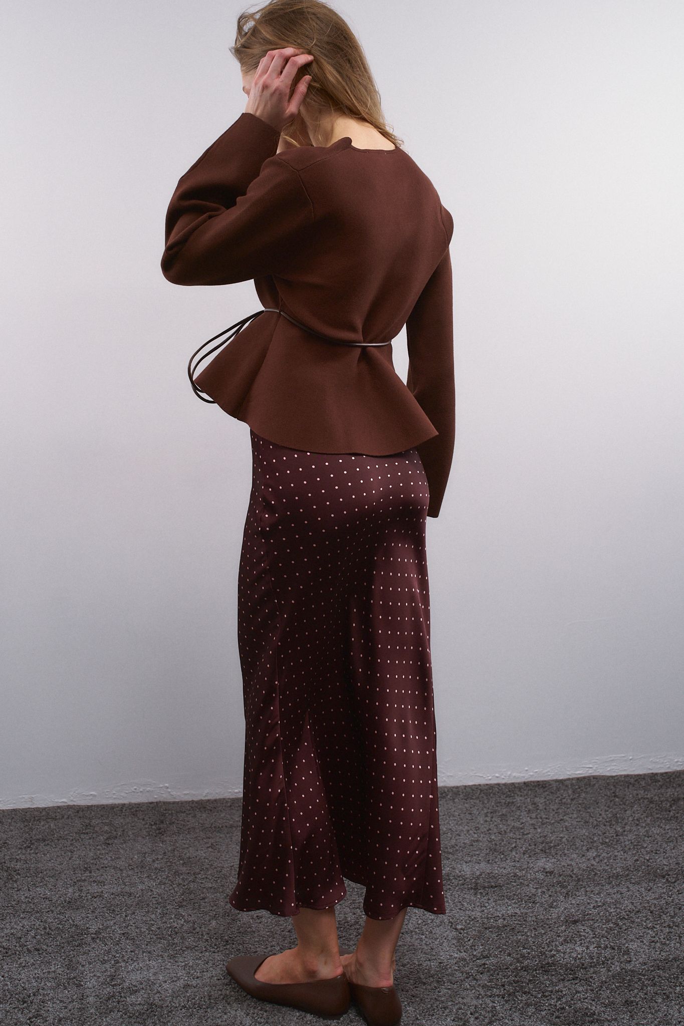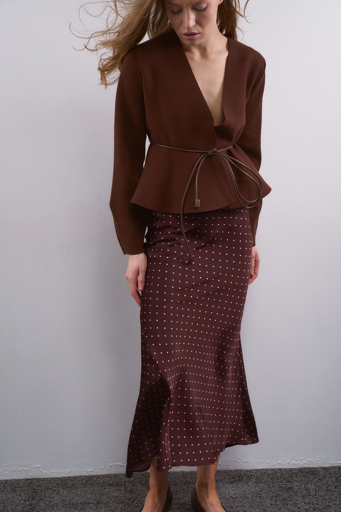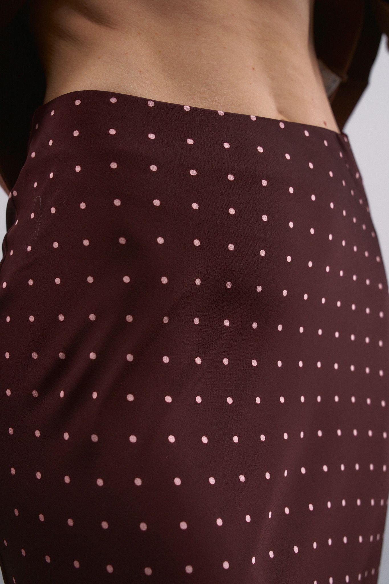 Длинная юбка средней посадки с принтом в горох. Асимметричный подол с А-образным силуэтом. Потайная застежка-молния сбоку.