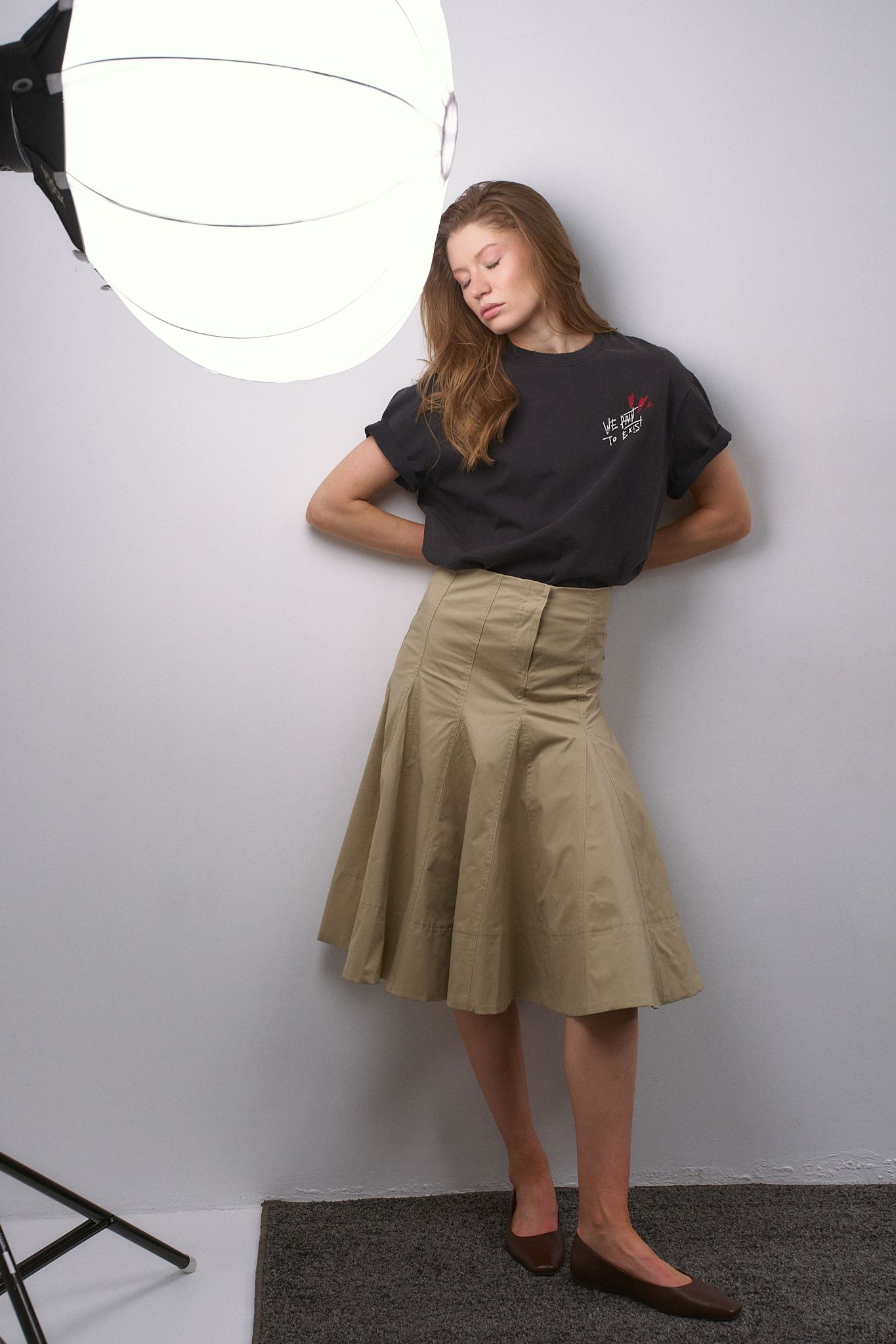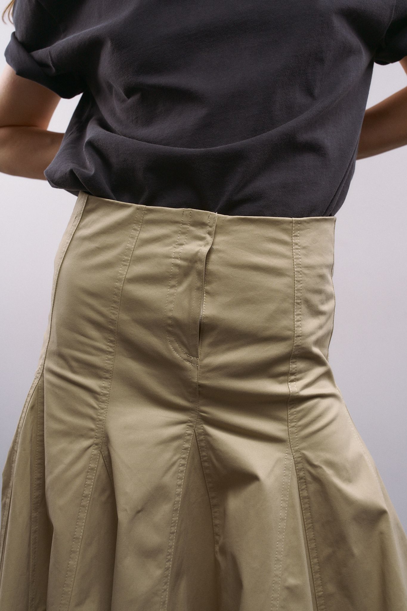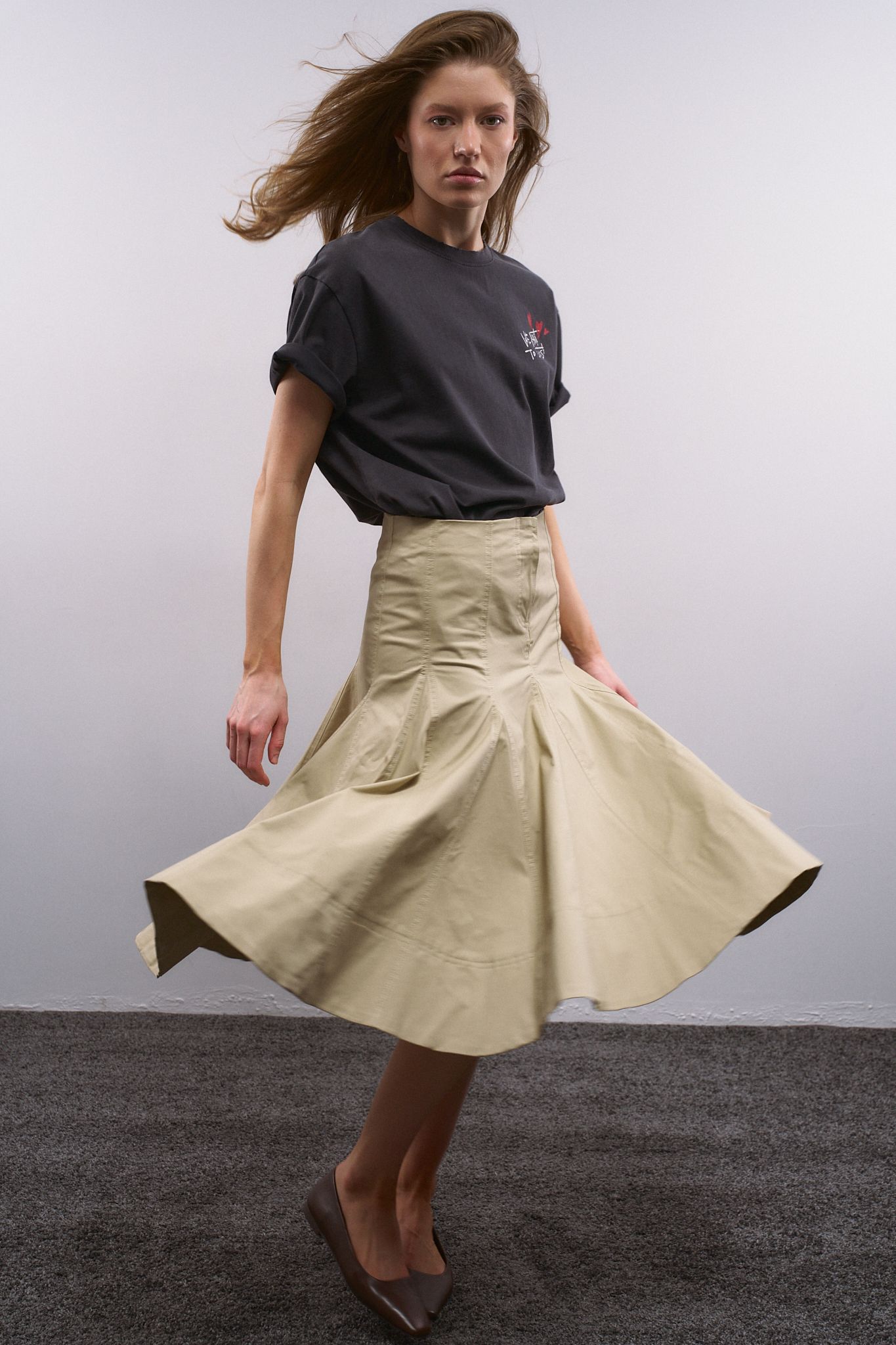 Юбка миди с завышенной талией из плотного хлопка. Низ со складками. Застежка на потайную молнию в шве.
